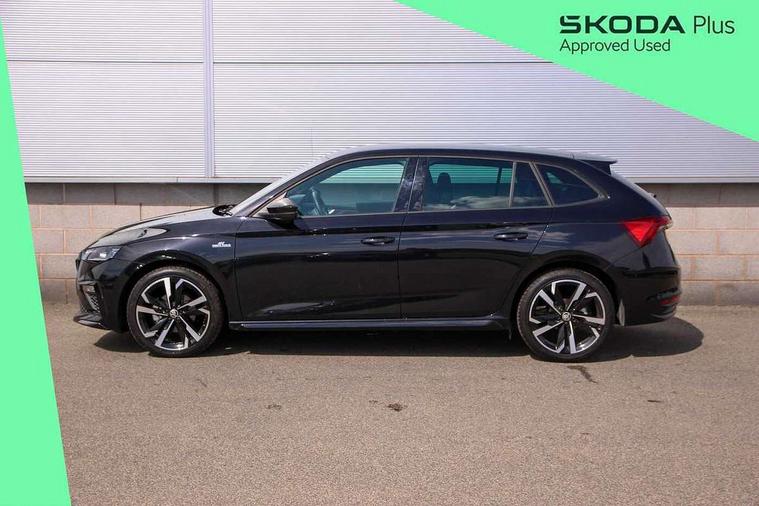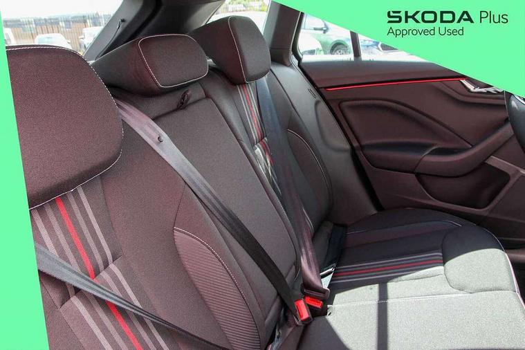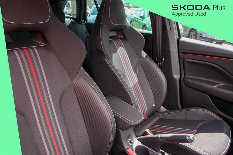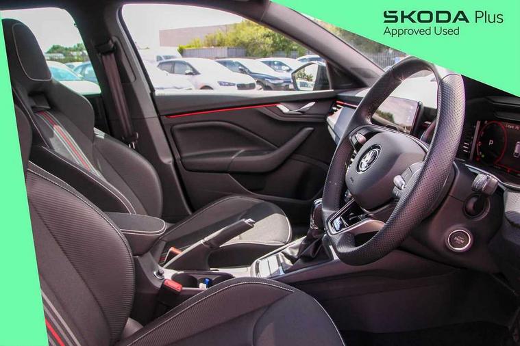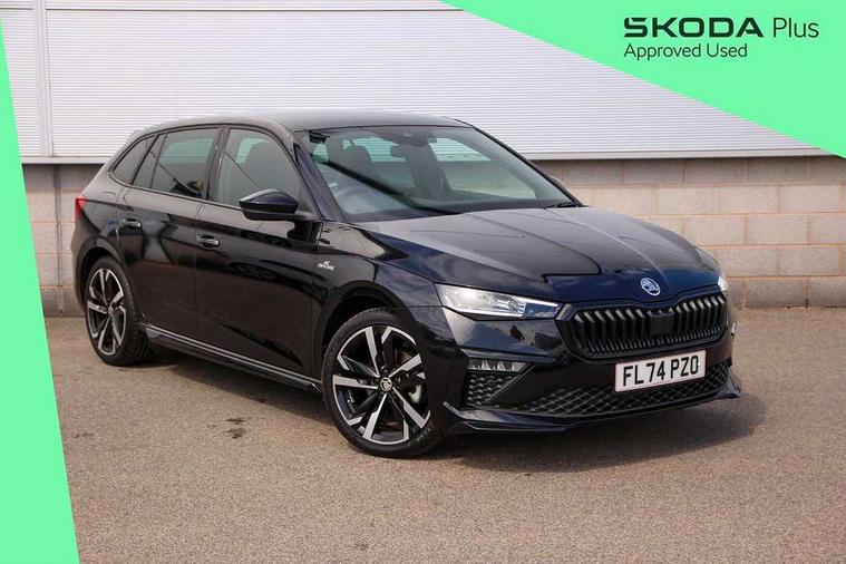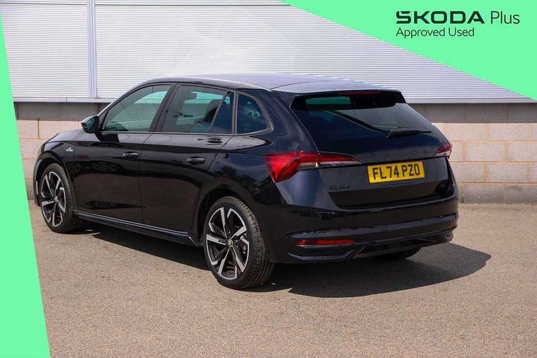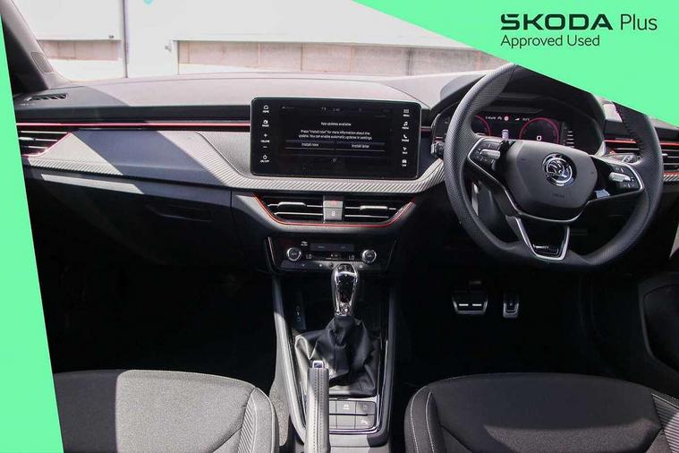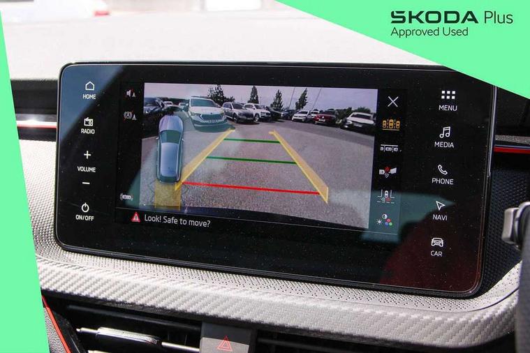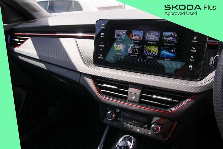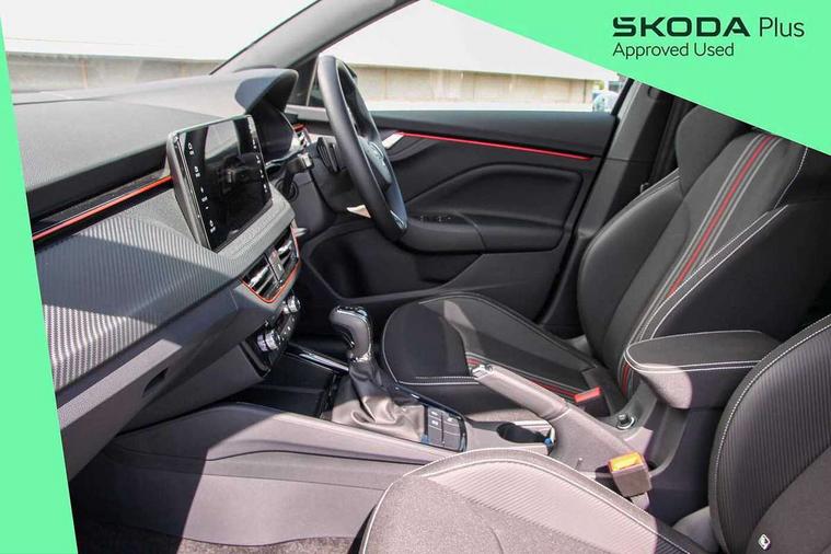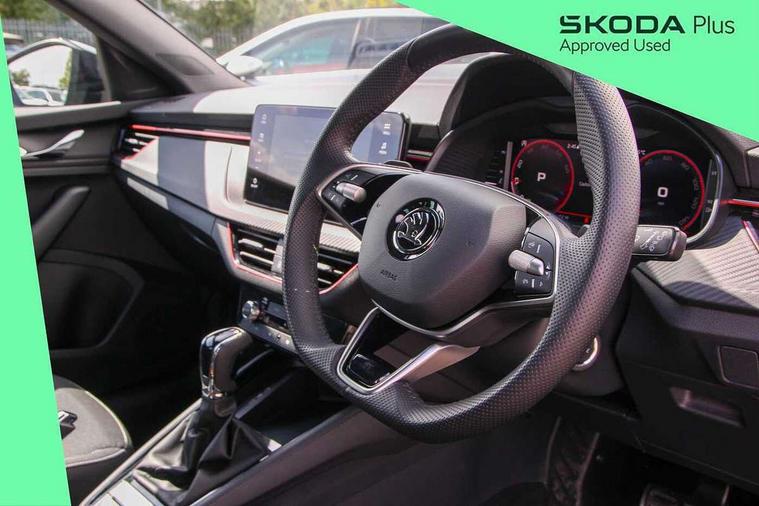 Advanced driver attention and drowsiness monitor, Bluetooth, e-Call (emergency call), Front assist system, PAS, Rear parking sensors, Speed limiter, Tailgate, Traffic sign recognition, Virtual Cockpit - 10.25" digital display, Voice control system, Wireless smartlink, 4 USB C ports, 8 Speakers, 9.2" Skoda navigation display, DAB radio, Auto dimming rear view mirror, Automatic headlamp activation with Coming home and Leaving home feature, Automatic high/low beam, Automatic intermittent wipers, Black door mirrors, Black lettering on boot lid, Black radiator grille, Black rear diffuser, Black roof spoiler, Body colour bumpers, Body colour door handles, Chrome moulding around grille, Extended tailgate glass, Front and rear electric windows, Heated rear window, LED 3rd brake light, LED brake lights, LED daytime running lights, LED high beam, LED low beam, Light sensors, Monte carlo plaque, Panoramic glass roof, Privacy glass, Rear LED fog light, Rear side wing doors, Rear wiper, Tinted windows, 12V socket in luggage compartment, 3 seat bench in 2nd row, Aluminium pedals, Ambient lighting in white/red, Black / White armrest stitching, Black ceiling, Black roof headlining, Cargo elements, Chrome inner door handles, Door inserts in art.leather carbon, Driver and passenger sun visors with vanity mirror, Dual zone climate control, Front and rear roof lights, Front centre armrest, Front head restraints, Height adjustable driver seat, Height adjustable passenger seat, Ice scraper, Illuminated glove compartment, Inner circulation control with pollen filter, ISOFIX for front passenger seat, Isofix preparation for back seats, Leather gearknob and handbrake lever, Luggage net under rear parcel shelf, Manual lumbar support for front seats, Monte carlo cloth upholstery, Net package and top tether hooks in boot space, Pocket on the back of both front seats, incl. mobile phone pockets, Rear centre armrest, Red hotstamping, Single front passenger seat, Sport seats, Textile floor mats, Third rear headrest, Ticket holder, Top tether for front passenger seat, Umbrella in driver's door, Light and view plus pack - Scala, 3x3 point rear seatbelts, ABS, Child locks, Curtain airbags and front side airbags, Disc brakes, Driver and front passenger airbags, ESP, Hill hold control, Manual leather parking brake, One tone horn, Passenger airbag switch off function, Seatbelt reminder for driver and front passenger, Tyre pressure monitoring system, Anti theft alarm system with interior monitoring, backup horn and towing protection, Anti-theft wheel bolts, Remote central locking with 2 remote folding keys, SAFE function for remote central locking, Carbon effect decorative inserts, 18" Ursa black diamond cut alloy wheels,