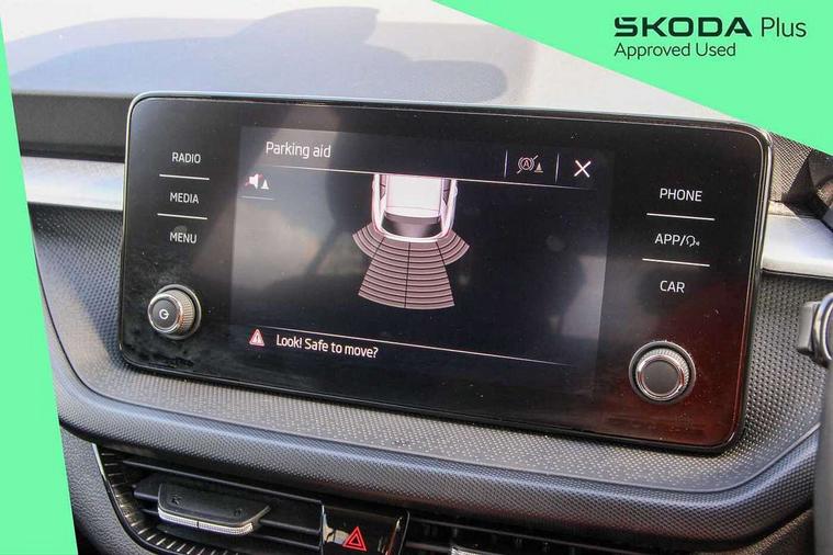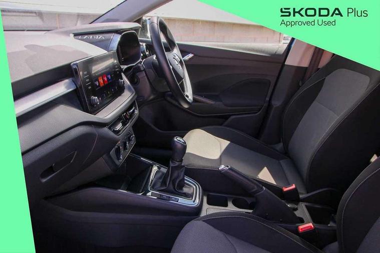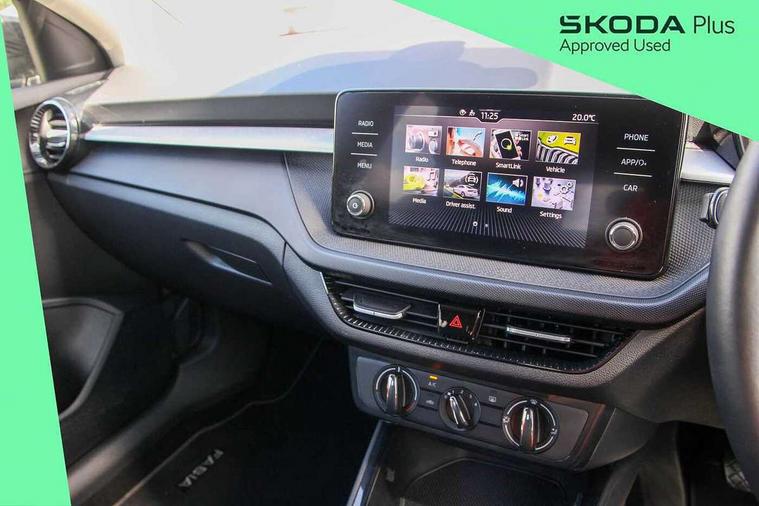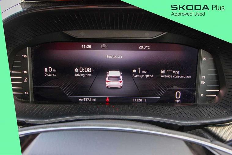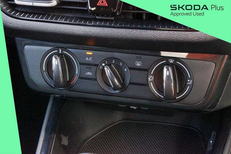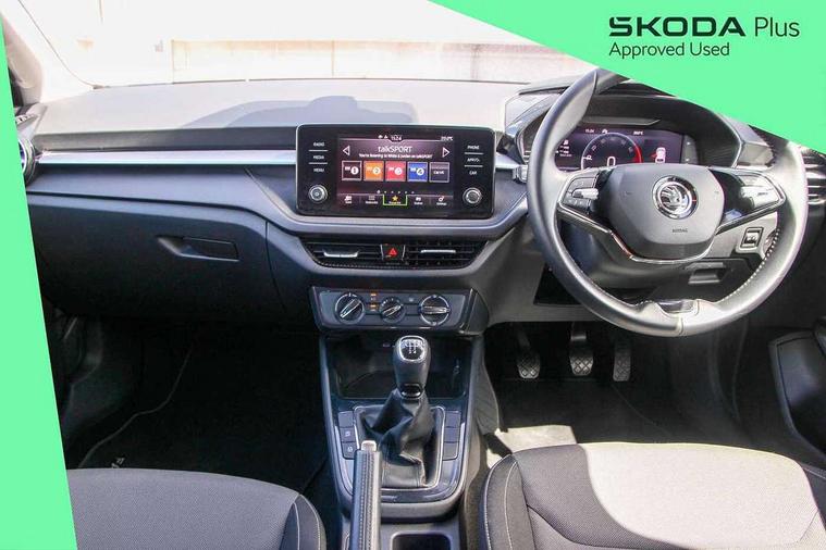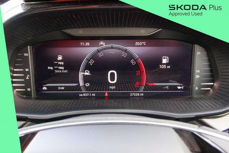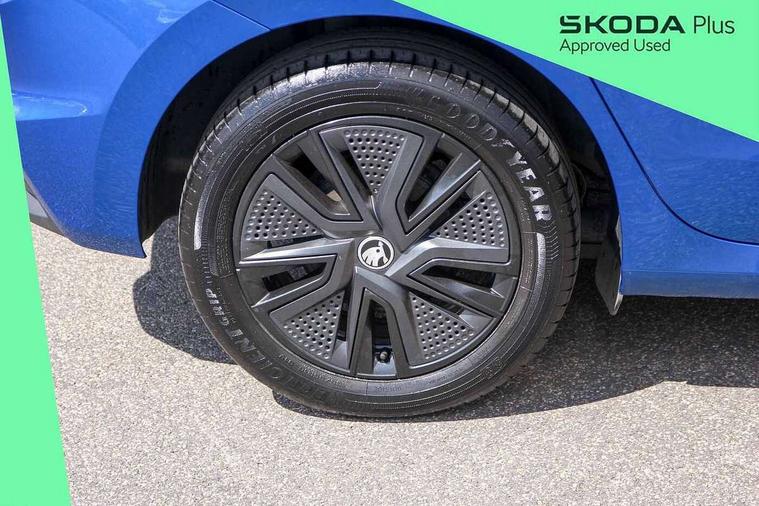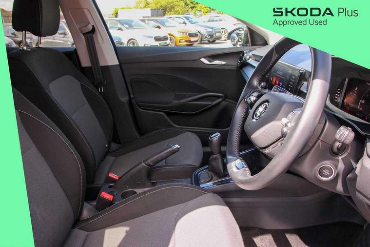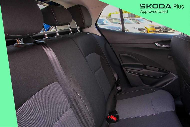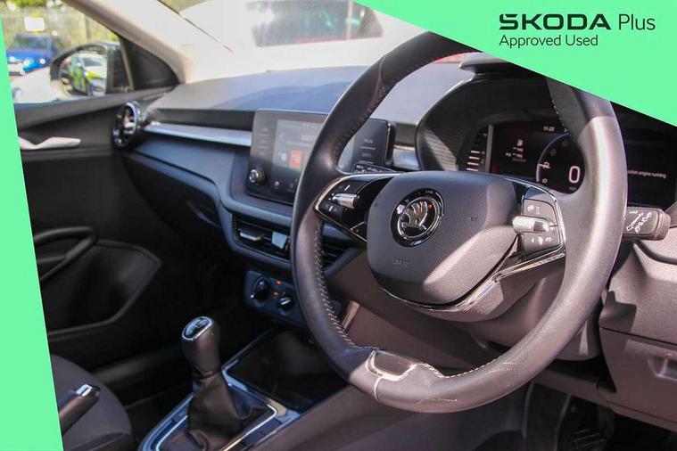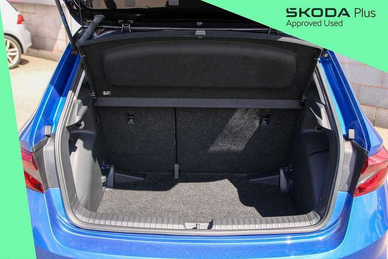 Bluetooth connection, Driver alert system - DAS, Electromechanical power steering, Exterior temperature gauge, Lane assist including road edge detection, Service interval indicator, Virtual cockpit with 10.25" colour display, 2x USB-C in the front (for data transmission and charging), 6 Speakers (4 in front and 2 in rear), Auxiliary socket for external MP3 player, Bolero radio with 8" colour display, DAB digital radio reception, Basic rear lights, Body coloured bumpers, Dimming rear view mirror with black frame, Door mirror integrated indicators, Electrically adjustable and heated door mirrors, Electrically adjustable front windows with function auto up/down, Front window wiper intermittent control, Headlight range control - Automatic, Ice scraper in fuel cap, LED daytime running lights with coming and leaving home feature, Mechanical adjustable rear windows, Privacy glass, Rear LED fog light, Rear side wing doors, Rear window wiper with washing nozzles, Roof mounted spoiler, SKODA tailgate lettering in chrome, Third brake light, 3 rear headrests, Backrest split and folding, Central console with fixed cup holder and storage box, Chrome handbrake release button, Fabric upholstery, Gearshift knob/handle in leather, Grain satin black interior door handles, Hand brake lever handle in leather, Height adjustable front headrests, Height adjustable steering wheel, ISOFIX and TopTether anchorage points to the outer rear seats, ISOFIX and TopTether on the front passenger seat, Luggage compartment lighting, Pollen filter, Rear seat bench unsplit, Single front passenger seat, Storm grey headlining, Sun visors with mirror and airbag label on passenger side, Ticket holder, Umbrella in drivers door, 3-point height adjustable front seats belts with pretensioner and force limiter, Automatic warning lights in case of crash, Driver and passengers airbag with switch off function, e-Call+, ESC including ABS, MSR, ASR, EDS, HBA and XDS, Front and rear seat belt warning, FRONT ASSIST (AEB City and AEB Inter Urban), Front side airbags, Head airbags, One tone horn, Pedestrian protection, Three rear 3-points safety seat belts with pretensioner and force limiter including stop function for outer rear seat belts, Tyre pressure monitoring system, Anti-theft alarm system including immobiliser, interior monitoring, backup horn, and towing protection, Anodized cross line upper decorative trim, Colour Edition air vents, Grain satin black central console cover, Grain satin black lower decorative trim, Satin black door and side trim panel in front, Anti-theft wheel bolts protection, Super-low rolling resistance tyres,