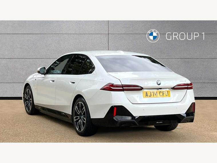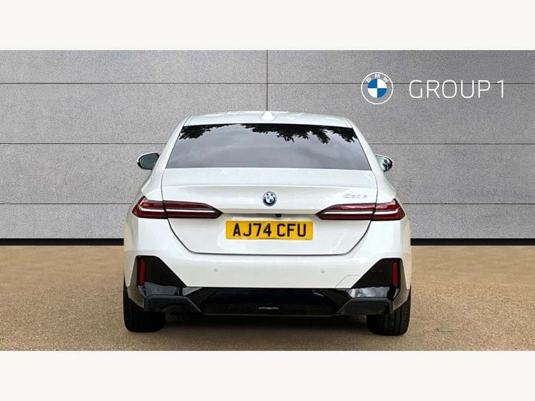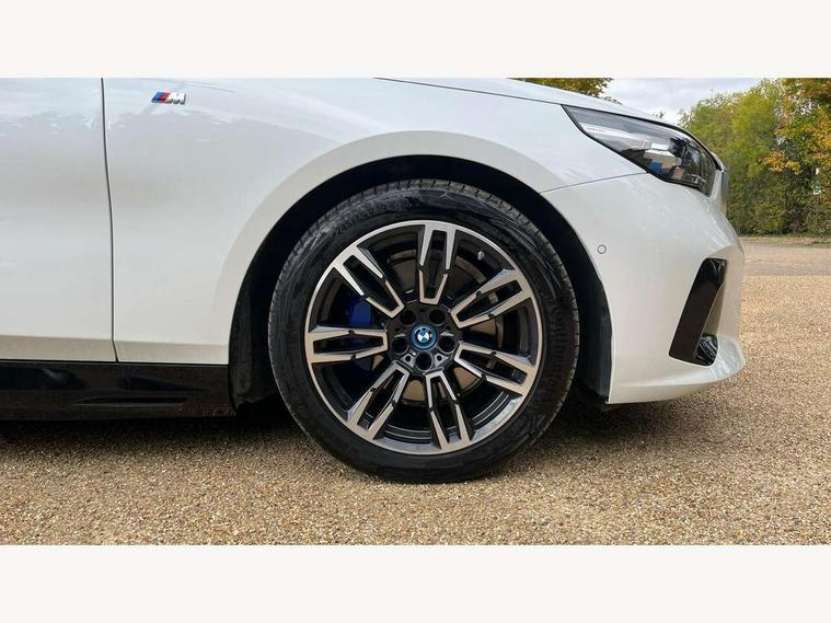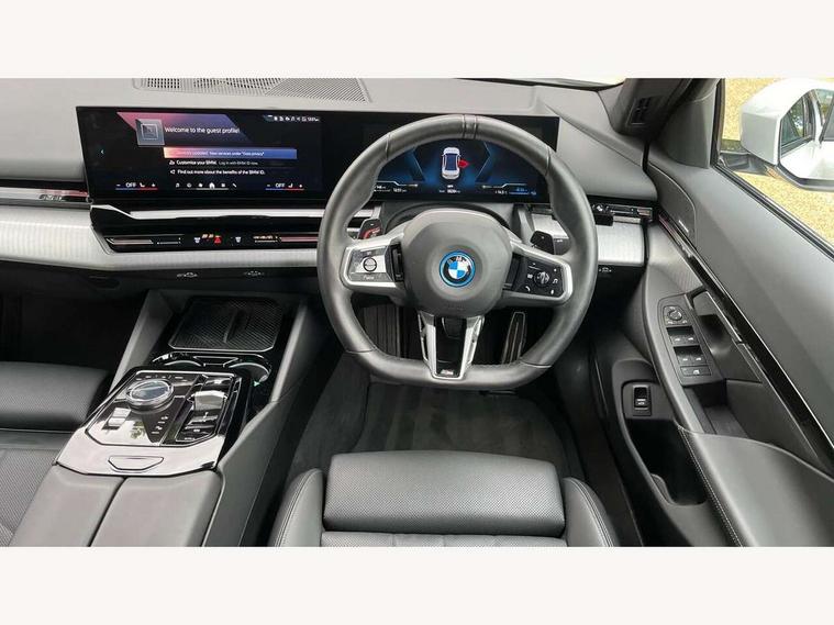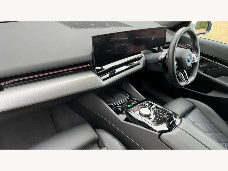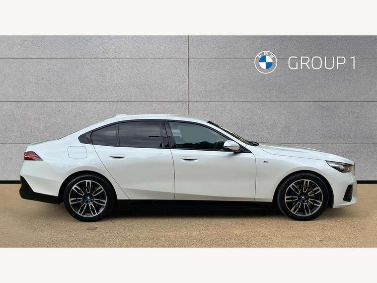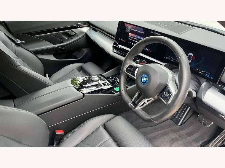 BMW ConnectedDrive online services, BMW Iconic sounds electric, BMW legal emergency call, BMW Teleservices, Brake pad wear indicator, Cruise control with brake assist, Driving Assistant Plus Preparation, Front collision warning with brake intervention, Lane departure warning with active return, Left turn warning with brake function, Multifunctional instrument panel, Oil sensor for level and grade, On board computer inc. average speed, fuel consumption, liquid crystal Info display, journey computer, outside temperature display, personal profile, On-board diagnosis - OBD, PAS, Powered by Operating System 7.0, Run flat indicator, Service interval indicator, Speed limit Info with manual speed limit assist, Stop/start button, 8 speed automatic steptronic transmission with gearshift paddles, AC charging cable professional (mode 3) for public charging, DAB tuner, Acoustic glazing, Adaptive LED Headlights, Automatic cornering lights, Automatic windscreen wipers and automatic headlight, BMW selective beam, Body colour door handles, Body coloured bumpers, Dynamic brake lights with LED technology, Electric adjustable door mirrors, Electric front and rear windows with fingertip open/close + anti-trap facility and comfort closing function, Follow me home headlight function, Headlight elements in blue, Heated windscreen washer jets, LED daytime running lights, LED third brake light, Light colour close to that of ordinary daylight, Optimum, homogeneous illumination of the road, Rear boot, Rear side wing doors, 2 zone automatic air conditioning, 3 seat bench in 2nd row, 3 spoke leather M steering wheel in BMW M specific design with M badge, Armrest - front and rear integrated door trim, centre console includes storage compartment, rear centre includes 2 cupholders, Child seat ISOFIX attachment with rear outer seats includes top tether, Electric adjustable front sports seats, Electric adjustable steering column, Electrically adjustable lumbar support for driver and front passenger, Heated driver and front passenger seats, M Anthracite headlining, M Sport pedal covers in stainless steel, Rear headrests, Single front passenger seat, Through loading system with 40/20/40 rear seat backrest split, Velour floormats, Wireless charging tray, Ambient lighting pack - 5 Series/I5, Connected package professional - 5 Series/I5, Driving assistance pack - 5 Series/I5, Expanded exterior mirror package - 5 series/I5, M high gloss shadow line pack - 5 Series/ I5, M Sport exterior styling pack - 5 Series/I5, 3 rear three point seatbelts, Active protection, Airbag deployment is controlled with respect to the intensity and scope, Anti-lock braking system (ABS), Brake assist, Brake energy regeneration, Cornering brake control (CBC), Crash sensor activating central locking release, hazard warning lights, fuel cut off and interior lighting, Driver and front passenger airbags, Driver central airbag, Driver/front passenger side airbags, DSC - Dynamic Stability Control, Dynamic brake control, Dynamic Traction Control - DTC, Electromechanical parking brake with automatic drive away release and auto hold function, Electronic brake force distribution, Engine drag torque control, Front and rear brake discs with interior ventilation, Front and rear curtain airbags, Front head restraints with anti-whiplash, Head airbags for first and second row seats, Hill start assist, Locking of doors after driving off, M Sport brakes in dark blue metallic painted brake callipers with M designation, Mechanical child proof lock on rear doors, PC iBrake PostCrash approach control warning with light braking function, Side impact protection, Trailer stability control, Two tone horn, Tyre pressure monitoring system, Warning triangle and first aid kit, Alarm system, Locking wheel bolts including wheel bolt adapter, Tyre repair kit,