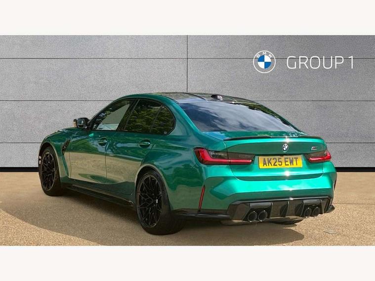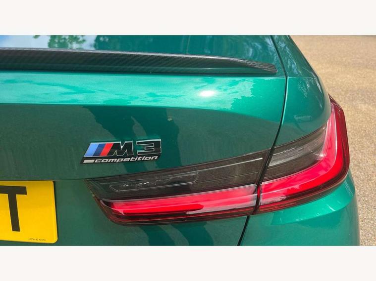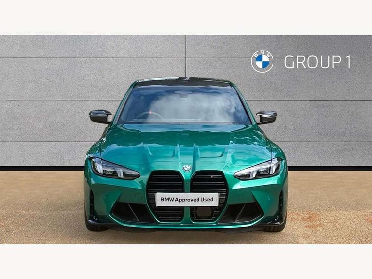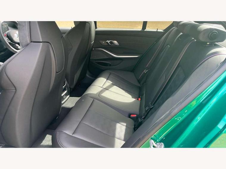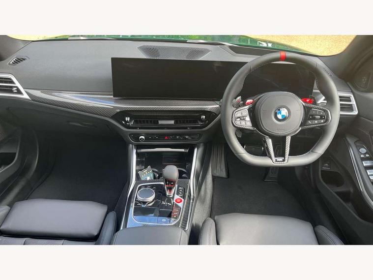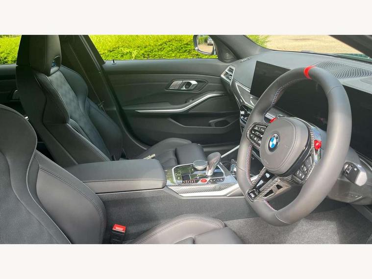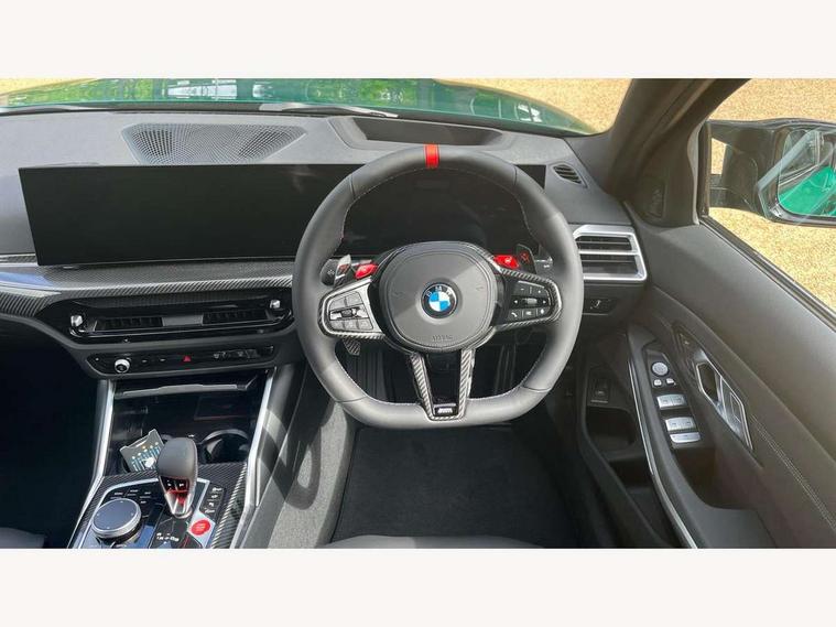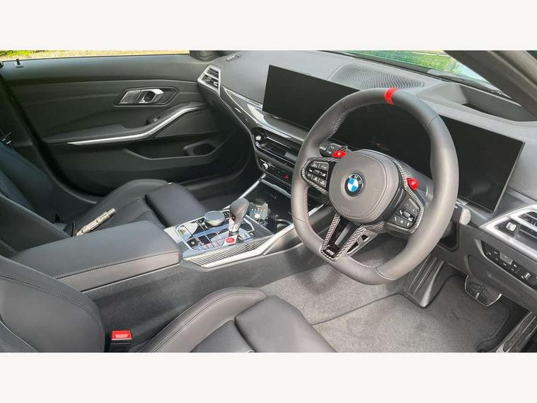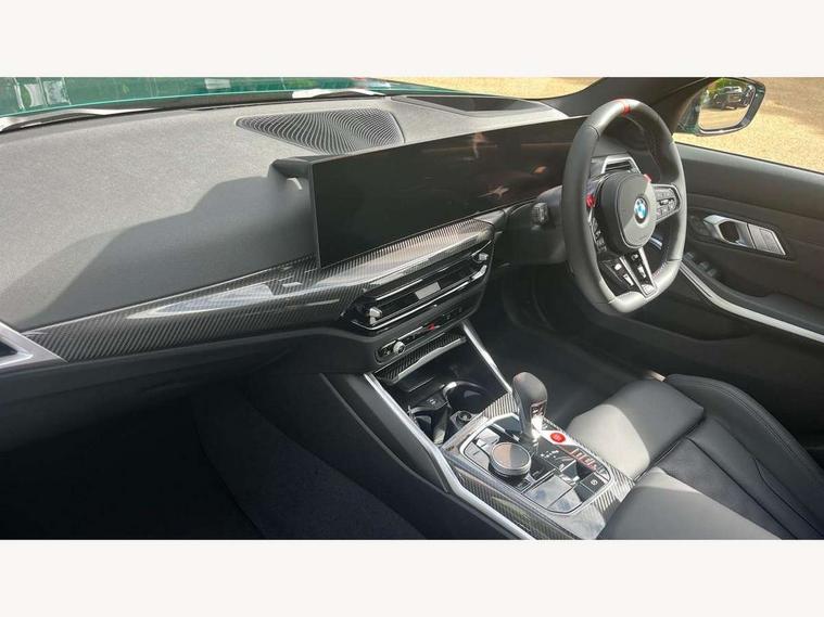 Active Guard, Automatic start/stop system, BMW ConnectedDrive online services, BMW legal emergency call, BMW Live Cockpit Pro with Head up display including 12.3" instrument display and 14.9" high resolution control display with navigation function, BMW Teleservices, Brake pad wear indicator warning light, Condition based service, Cruise control with braking function, Door/boot open warning light, Electric Power Steering (EPS) with Servotronic, Language version English, Lights on warning, M drive buttons, Oil sensor for level and grade, warning by check control system, Oil temperature gauge, On board computer, On board diagnostics, Optimum shift indicator, Outside temperature display, Park distance control, Pull away assistant, Run flat indicator, Service interval indicator, Shifting point display, Smartphone integration, Speed limiter, Start/stop button in red, Variable sport steering, Double joint spring strut front axle, M Adaptive suspension, M Drive Professional including track mode, laptimer, traction control & Drift analyser, M Sport differential, Safety battery terminal clamp, Sport automatic transmission with gearshift paddles, Auxiliary point for auxiliary devices, DAB radio with bluetooth music capability, Harman kardon surround sound audio system, Personal eSim, Auto dimming driver's door mirror, Automatic headlights + automatic windscreen wipers, Automatic parking function on front passenger's exterior mirror, Black model designation badges, BMW high gloss shadow line with extended contents, BMW radiator grille, frameless, with horizontal double blind slats, black high-gloss, with model badge, Body colour bumpers, Bonnet and tailgate badge, Carbon fibre reinforced plastic (CFRP) roof, Day time running light, Door mirror integrated indicators, Door sill finishers with aluminium inserts, Dynamic brake lights, Electric adjustable heated door mirrors, Electric folding door mirrors, Electrochromic exterior driver side mirror, Electrochromic interior rear view mirror with automatic anti-dazzle function, Entry sills with aluminium inserts and model badge, Follow me home headlights, Front and rear bumper system, Front and rear plastic apron in vehicle colour, Front door sill strips in aluminium inlays with M3 inscription, Front electric windows with open and close fingertip control, anti trap facility and comfort closing, Headlight beam throw control, Heat protection, sun protection glazing, Heated washer jets, High gloss black lower bumper edges, side sills and diffuser edge binding, LED tail lights with 3D L-shaped LED light design, M designation, Mirror glass aspheric on driver's side, convex on passenger side, Rain sensor, Rear boot, Rear fog lights, Rear reflectors, Rear side wing doors, Reversing light, Roof fin and roof trim strips in Black high-gloss, Shark fin roof aerial, Strakes in front side panel, black matt/high-gloss black, with model badge, Third brake light, Visible VIN plate, Welcome lighting, 2 cupholders in front centre console, 2 cupholders in rear armrest, 2 rear head restraints, 2 x 12 V Power sockets (luggage compartment and front centre console), 2 x USB Type C ports for charging and data transmission in front centre console, 3 seat bench in 2nd row, 40:20:40 split folding rear seat with loading system, Ambient inside door handle light, Ambient lighting for storage compartment, Ambient lighting front and rear, Anthracite headlining, Battery in luggage compartment, Centre console armrest with storage compartment, Contour lighting for door trim, Driver/passenger sunvisors with ticket holders + illuminated vanity mirrors, Driving experience mode switch, Dual zone automatic air conditioning, Dynamic ambient interior lighting, Electric front seats + driver memory, English handbook, Floor mats in velour, Front and rear door exit lights, Front door storage bins with bottle holder, Front footwell ambient lighting, Front interior light, Front isofix attachment + airbag deactivation, Front reading light, Front seat backrest width adjustment, Front/rear door armrests, Heated front seats, Height adjustable front headrests, Illuminated bow-type door handles in vehicle colour, driver's side with door lock, Interior mirror lighting, Isofix on 2nd row outer seats, Lockable/illuminated glovebox, Luggage compartment lighting, M Sport seats with with illuminated model designation, Multifunction steering wheel, Rake/reach adjustable steering wheel, Single front passenger seat, Storage compartment in rear doors, Storage tray and compartment with cover in centre console, Through loading system, Toolkit located in luggage compartment, Waterfall lighting for central air vent, Wireless charging tray, Connected package professional - M3, Extended storage pack - M3/M4, High gloss shadowline exterior trim pack - M3, 3 point seatbelts on all seats, ABS/EBD, Automatic Stability Control (ASC), Brake energy regeneration, Brake fade compensation, Compound structure brake discs, Cornering brake control (CBC), Crash sensor, Curtain airbags, Driver/Front Passenger airbags, Dry braking, Dynamic brake control, Dynamic stability control + (DSC+), Dynamic Traction Control - DTC, Electromechanical parking brake, Electronic differential lock control (EDLC), Front and rear head airbags, Front seat side impact airbags, Front seatbelt pretensioners + load limiters, Hill start assist, M Sport seat belts, Rear child proof door locks, Seat occupancy detection for driver and passenger side, Seatbelt warning, Side impact protection, Two tone horn, Tyre pressure sensor, Warning triangle and first aid kit, Centre lock switch, Closing system with central locking, Electronic immobiliser, Locking wheel bolts, Remote central locking, Thatcham cat 1 remote alarm, Vehicle Key with 4 buttons including the integrated key, Galvanic embellisher for controls, Tyre repair kit,