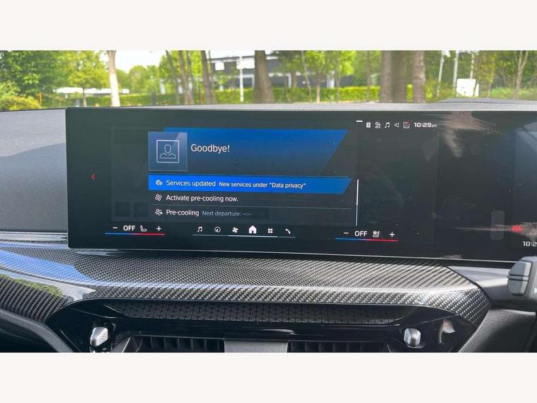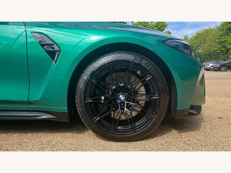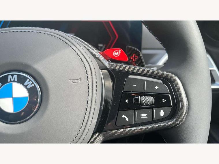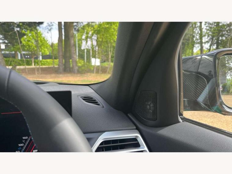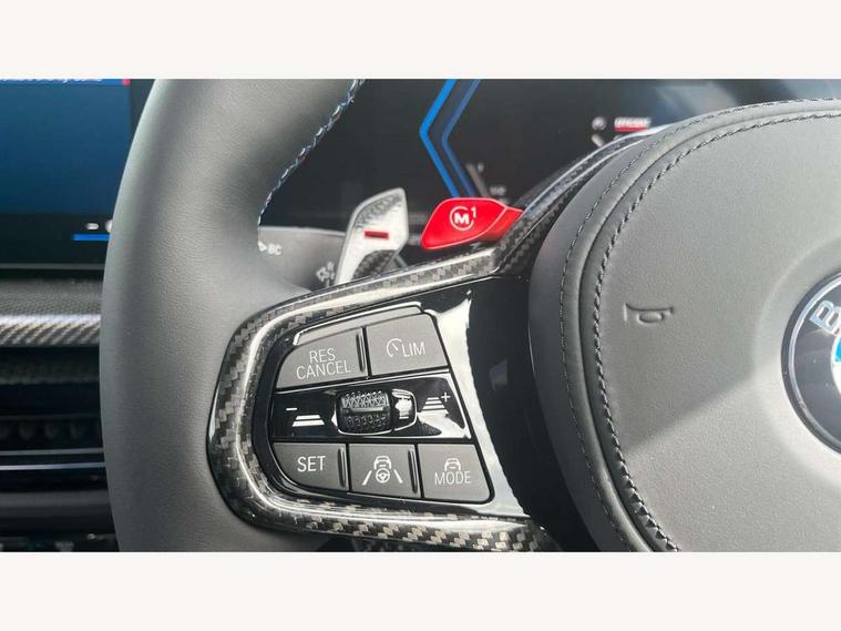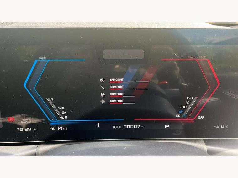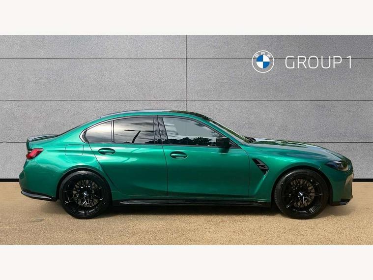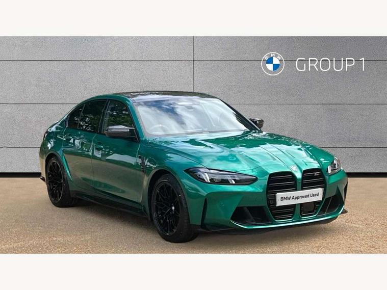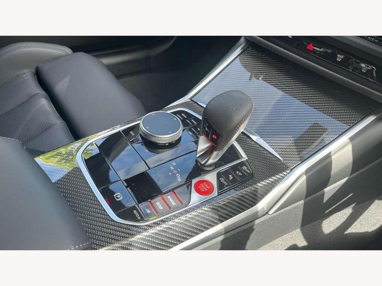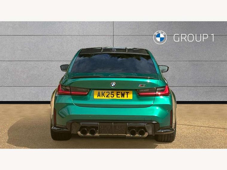 Active Guard, Automatic start/stop system, BMW ConnectedDrive online services, BMW legal emergency call, BMW Live Cockpit Pro with Head up display including 12.3" instrument display and 14.9" high resolution control display with navigation function, BMW Teleservices, Brake pad wear indicator warning light, Condition based service, Cruise control with braking function, Door/boot open warning light, Electric Power Steering (EPS) with Servotronic, Language version English, Lights on warning, M drive buttons, Oil sensor for level and grade, warning by check control system, Oil temperature gauge, On board computer, On board diagnostics, Optimum shift indicator, Outside temperature display, Park distance control, Pull away assistant, Run flat indicator, Service interval indicator, Shifting point display, Smartphone integration, Speed limiter, Start/stop button in red, Variable sport steering, Double joint spring strut front axle, M Adaptive suspension, M Drive Professional including track mode, laptimer, traction control & Drift analyser, M Sport differential, Safety battery terminal clamp, Sport automatic transmission with gearshift paddles, Auxiliary point for auxiliary devices, DAB radio with bluetooth music capability, Harman kardon surround sound audio system, Personal eSim, Auto dimming driver's door mirror, Automatic headlights + automatic windscreen wipers, Automatic parking function on front passenger's exterior mirror, Black model designation badges, BMW high gloss shadow line with extended contents, BMW radiator grille, frameless, with horizontal double blind slats, black high-gloss, with model badge, Body colour bumpers, Bonnet and tailgate badge, Carbon fibre reinforced plastic (CFRP) roof, Day time running light, Door mirror integrated indicators, Door sill finishers with aluminium inserts, Dynamic brake lights, Electric adjustable heated door mirrors, Electric folding door mirrors, Electrochromic exterior driver side mirror, Electrochromic interior rear view mirror with automatic anti-dazzle function, Entry sills with aluminium inserts and model badge, Follow me home headlights, Front and rear bumper system, Front and rear plastic apron in vehicle colour, Front door sill strips in aluminium inlays with M3 inscription, Front electric windows with open and close fingertip control, anti trap facility and comfort closing, Headlight beam throw control, Heat protection, sun protection glazing, Heated washer jets, High gloss black lower bumper edges, side sills and diffuser edge binding, LED tail lights with 3D L-shaped LED light design, M designation, Mirror glass aspheric on driver's side, convex on passenger side, Rain sensor, Rear boot, Rear fog lights, Rear reflectors, Rear side wing doors, Reversing light, Roof fin and roof trim strips in Black high-gloss, Shark fin roof aerial, Strakes in front side panel, black matt/high-gloss black, with model badge, Third brake light, Visible VIN plate, Welcome lighting, 2 cupholders in front centre console, 2 cupholders in rear armrest, 2 rear head restraints, 2 x 12 V Power sockets (luggage compartment and front centre console), 2 x USB Type C ports for charging and data transmission in front centre console, 3 seat bench in 2nd row, 40:20:40 split folding rear seat with loading system, Ambient inside door handle light, Ambient lighting for storage compartment, Ambient lighting front and rear, Anthracite headlining, Battery in luggage compartment, Centre console armrest with storage compartment, Contour lighting for door trim, Driver/passenger sunvisors with ticket holders + illuminated vanity mirrors, Driving experience mode switch, Dual zone automatic air conditioning, Dynamic ambient interior lighting, Electric front seats + driver memory, English handbook, Floor mats in velour, Front and rear door exit lights, Front door storage bins with bottle holder, Front footwell ambient lighting, Front interior light, Front isofix attachment + airbag deactivation, Front reading light, Front seat backrest width adjustment, Front/rear door armrests, Heated front seats, Height adjustable front headrests, Illuminated bow-type door handles in vehicle colour, driver's side with door lock, Interior mirror lighting, Isofix on 2nd row outer seats, Lockable/illuminated glovebox, Luggage compartment lighting, M Sport seats with with illuminated model designation, Multifunction steering wheel, Rake/reach adjustable steering wheel, Single front passenger seat, Storage compartment in rear doors, Storage tray and compartment with cover in centre console, Through loading system, Toolkit located in luggage compartment, Waterfall lighting for central air vent, Wireless charging tray, Connected package professional - M3, Extended storage pack - M3/M4, High gloss shadowline exterior trim pack - M3, 3 point seatbelts on all seats, ABS/EBD, Automatic Stability Control (ASC), Brake energy regeneration, Brake fade compensation, Compound structure brake discs, Cornering brake control (CBC), Crash sensor, Curtain airbags, Driver/Front Passenger airbags, Dry braking, Dynamic brake control, Dynamic stability control + (DSC+), Dynamic Traction Control - DTC, Electromechanical parking brake, Electronic differential lock control (EDLC), Front and rear head airbags, Front seat side impact airbags, Front seatbelt pretensioners + load limiters, Hill start assist, M Sport seat belts, Rear child proof door locks, Seat occupancy detection for driver and passenger side, Seatbelt warning, Side impact protection, Two tone horn, Tyre pressure sensor, Warning triangle and first aid kit, Centre lock switch, Closing system with central locking, Electronic immobiliser, Locking wheel bolts, Remote central locking, Thatcham cat 1 remote alarm, Vehicle Key with 4 buttons including the integrated key, Galvanic embellisher for controls, Tyre repair kit,