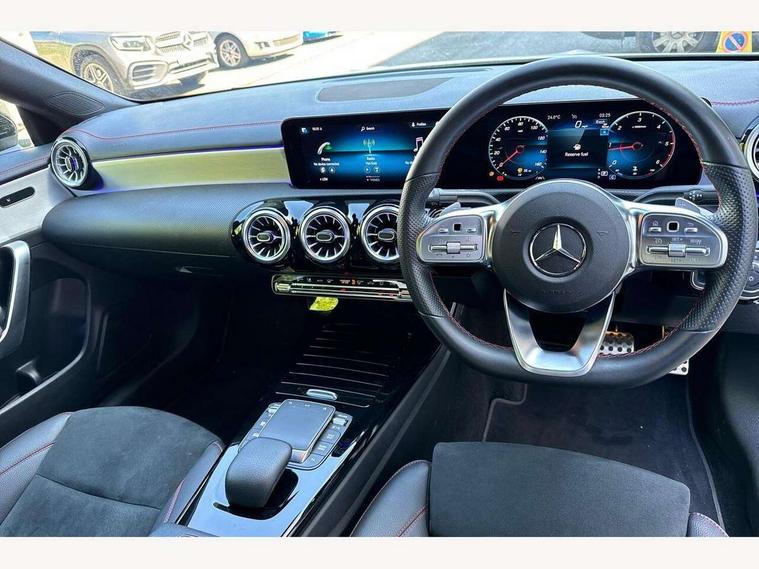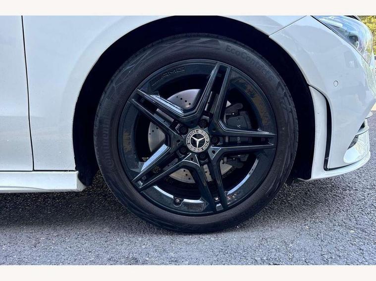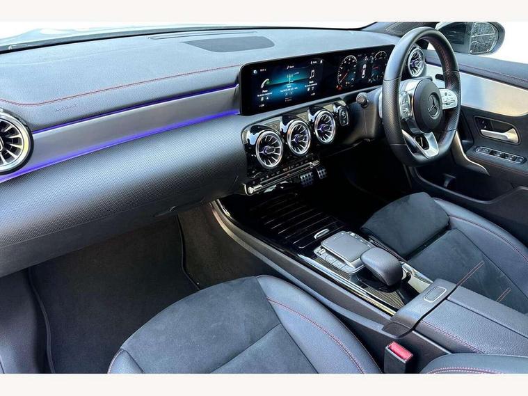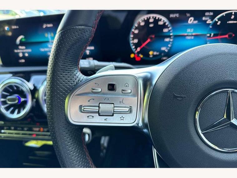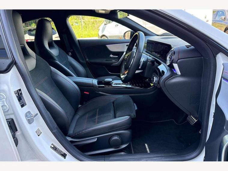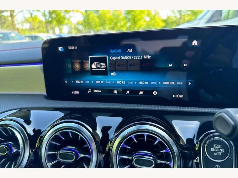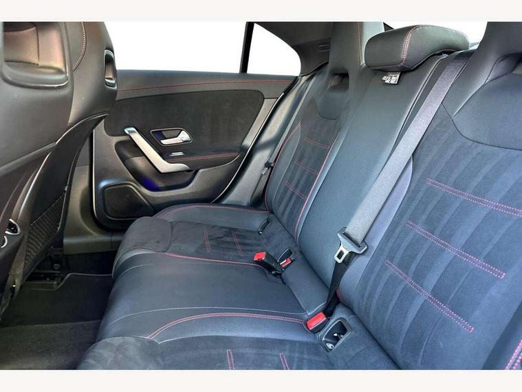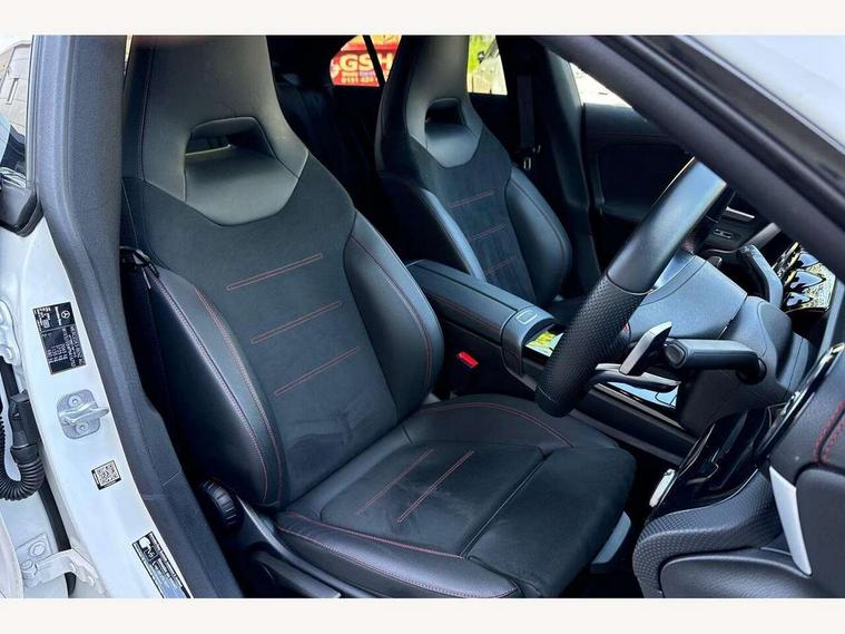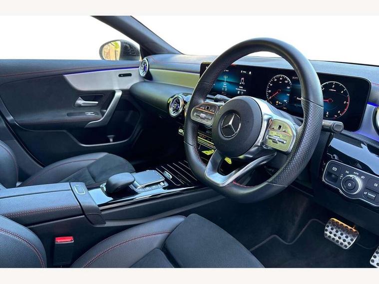 10.25 inch Instrument display with digital cockpit, 10.25 inch touchscreen central media display, Active lane keeping assist, Attention assist - Monitors steering behaviour and long journey fatigue, Bluetooth connection, Car wash mode, Cruise control with limiter, Direct steer system with speed sensitive power steering, DYNAMIC SELECT with a choice of driving modes (ECO, Comfort, Sport and Individual), ECO start/stop function, Fluid level warning indicator for fuel, oil, coolant and washer fluid, Hard-disk navigation, Hey Mercedes Voice activation, Lamp failure indicator, Mercedes me connect including emergency call system, accident recovery, breakdown management and maintenance, Mercedes me remote services, Outside temperature gauge, Owners manual and service booklet in English, Pre-installation of private car share, Preinstallation for Mercedes Benz link, Radio aerial integrated into front and rear windshields, Service indicator (ASSYST), Smartphone integration with Apple CarPlay and Android auto, Speed limit assist, Trip computer in multifunction display with current consumption indicator, Lowered comfort suspension, Rear axle multi-link, DAB digital radio tuner, MBUX multimedia system, Mercedes Benz sound system (100 W) with 6 speakers, USB (type C) ports (2) in stowage compartment and 1 in front of centre console, Adaptive brake lights, AMG body styling with AMG front apron and rear apron and visible exhaust tailpipe in chrome trim elements, AMG bodystyling side skirts, Body colour bumpers, Body colour door handles, Chrome beltline strips, Diamond radiator grille pins in chrome, Electric windows, Electrically adjustable and heated door mirrors with integrated LED indicators, Exhaust system with 2 Visible tailpipe trim elements and rear apron with trim in chrome, Headlamp assist automatic headlamp activation, Heated glass rear windscreen + timer control, High level LED third brake light, Interior mirror with black reading lamps and frameless, LED high performance headlamps with integrated LED daytime running lights, LED tail lamp, Privacy glass with dark tinting on rear side windows and rear window, Rain sensing windscreen wipers with two sensitivity settings, Rear boot, Rear fog lamp, Rear side wing doors, Variable front intermittent wipers, Window line trim strip in chrome, 3 seat bench in 2nd row, 3 spoke flattened bottom nappa leather multifunction steering wheel with perforated leather in grip area, 40:20:40 split folding rear seats with backrest, Air conditioning - Two zone thermotronic luxury automatic climate control with display, Air vents with surround in silver chrome, Artico man-made leather upholstery, Automatic child seat recognition sensor, Black roof lining, Brushed stainless steel sports pedals with rubber studs, Floor mats with stitched AMG lettering, Front centre armrest with stowage, Front door sills with Mercedes Benz lettering, Galvanished gear shift paddles on steering wheel, Heated front seats, Illuminated glove compartment stowage, Interior lighting - 64 colour Ambient lighting, Luggage net on driver/front passenger seat backrest, Manually adjustable front seats, Manually height and reach adjustable steering column, Rear head restraints, Single front passenger seat, Sport seats with fixed head restraints, Stowage compartment in centre console with retractable cover, Sunvisors with illuminated vanity mirrors, Touchpad on center console, Twin front cupholders, Two outer rear seat isofix and top tether child seat fixing points, Light and sight pack - CLA, Mirror pack - CLA, Night package - CLA, Parking package - CLA, Seat comfort pack - CLA, Active bonnet pedestrain safety measure which detects an impact and raises bonnet by 65mm, Active brake assist includes forward collision warning system with autonomous braking, Adaptive brake assist with hold function and hill start assist, Anti lock braking system (ABS) with brake assist, Black seat belts, Bonnet with power domes, Brake pad wear warning indicator, Childproof locks manually operated for rear doors and electrically operated for rear power windows, Crash responsive emergency lighting, Driver and front passenger head and sidebags, Driver and front passenger windowbags, Drivers knee airbag, Dual stage driver and front passenger airbags, Electric parking brake, Electronic stability programme with acceleration skid control, ESP curve dynamic assist, Front and rear seatbelt reminder, Front passenger seat occupancy sensor, Three point rear seat belts, Tyre pressure monitoring system, Warning triangle and first aid kit, Guard 360 degree guard vehicle protection system with immobiliser and interior protection, Keyless Go starting function, Remote central locking and crash sensor with emergency opening function, Light aluminium with longitudinal grain interior trim, 18" AMG 5 twin spoke light alloy wheels painted in black with high sheen finish, Summer tyres, Tirefit tyre sealant kit,