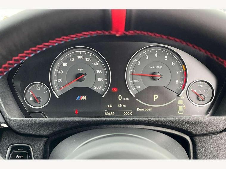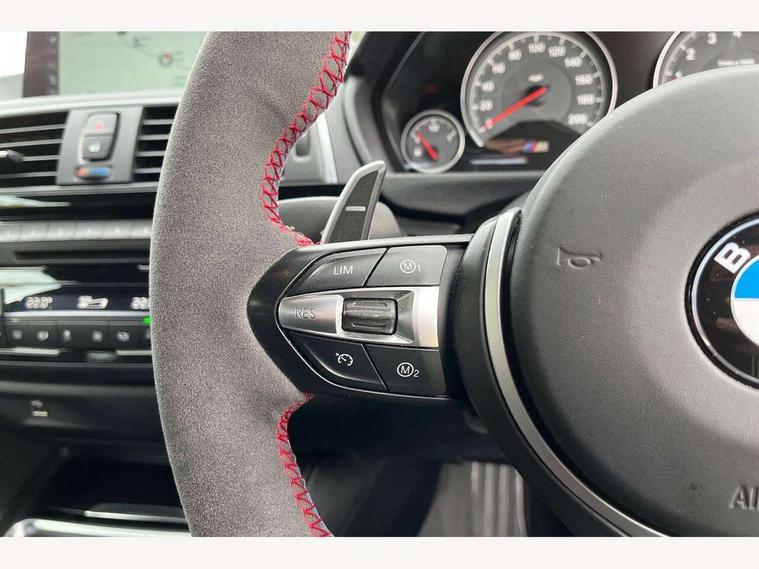 Brake pad wear indicator warning light, Cruise control with brake assist, Door/boot open warning, Electric Power Steering (EPS) with Servotronic, Enhanced bluetooth with wireless charging, Lights on warning, Oil temperature gauge, On board computer, Outside temperature display, Service interval indicator, Stop/start button, Adaptive M Sport suspension, Drive Performance Control, M differential lock, Auxiliary point for auxiliary devices, Bluetooth audio streaming, BMW professional radio/CD/MP3, DAB Digital radio, Wi-Fi hot spot, 2 speed adjustable intermittent wipers with wash/wipe function, Auto dimming rear view mirror, Body colour bumpers, Body colour door handles, Body colour door mirrors, Boot lid spoiler, Chrome exhaust tailpipe, Chrome kidney grille with black vertical slats, Daytime running lights, Door sill finishers, Dynamic brake lights, Electric adjustable heated door mirrors, Electric front windows/one touch facility, Exterior mirrors - electrically folding with anti-dazzle, Follow me home headlights, Headlight washers, Heat insulating tinted glass, Heated windscreen washer jets, High gloss shadow line, M aerodynamic bodystyling, Rain sensor including auto headlights activation, Windscreen with grey shadeband, 12V sockets in front centre console and passenger footwell, 3 spoke leather M sport multifunction sports steering wheel, 4 grab handles, Anthracite headlining, Anthracite Velour floor mats, Driver + passenger electric lumbar support, Driver/passenger sunvisors with illuminated vanity mirrors + covers, Dual zone climate control, Electrically adjustable front seats - driver seat with memory, Front centre armrest with storage compartment, Front cupholders x 2, Front head restraints, Front sliding armrest, Front sports seats with electric side bolster adjustment, Glovebox with lid, Heated front seats, Integrated rear head restraints, ISOFIX child seat preparation+airbag deactivation, Lashing eyelets in boot, Leather gearknob, Leather handbrake grip, Reach + rake adjustable steering column, Storage compartment in rear centre console, Toolkit located in luggage compartment, Extended lights package - M Series, Media pack - Professional - M4, 3 point seatbelts on all seats, ABS/EBD, Automatic Stability Control (ASC), Cornering brake control (CBC), Crash Sensor - activates hazard/interior lighting + unlocks doors, Driver seatbelt warning indicator, Driver/Front Passenger airbags, DSC+, Dynamic brake control, Dynamic Traction Control - DTC, Front seatbelt force limiters, Front seatbelt pretensioner, Front side airbags, Hill start assist, ITS head airbags for front/rear, Tyre pressure monitor, Warning triangle and first aid kit, Drive away door locking, Electronic immobiliser, Remote central locking, Remote control Thatcham category 1 alarm, M mobility system (flat-tyre repair system),