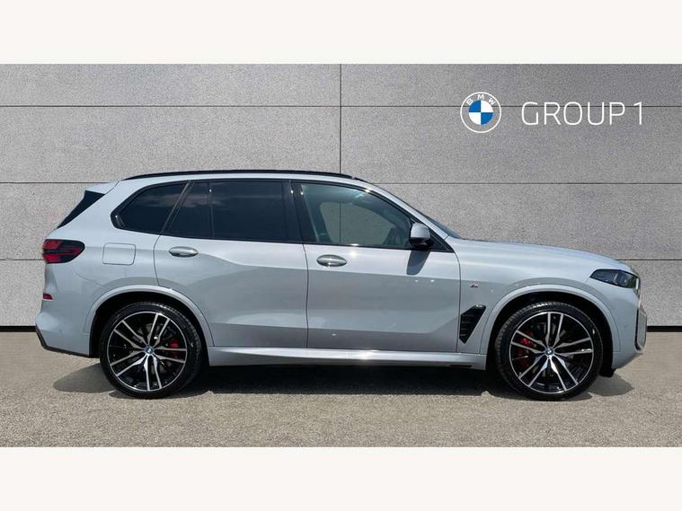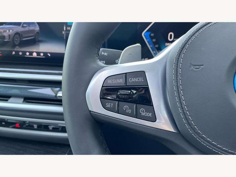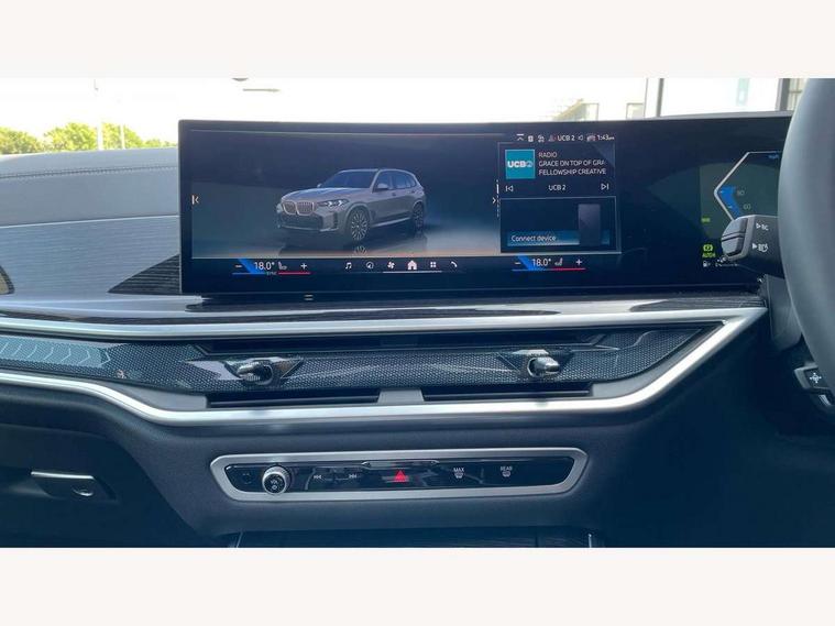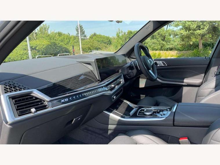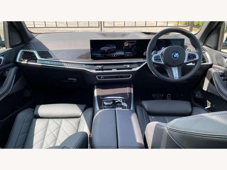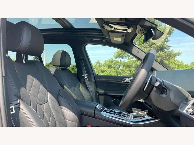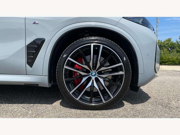 Attentiveness assist, Automatic tailgate operation, BMW ConnectedDrive online services, BMW live cockpit + with curved 12.3 instrument cluster/14.9 central display, nav/Tuner with diversity reception, RDS/4GLTE/remote software upgrade, BMW Teleservices, Condition based service, Cruise control with brake assist, eCall emergency call system, Enhanced bluetooth with wireless charging, Integrated owner's handbook, PAS, Speed limiter, Wi-Fi hotspot, AC Fast charging preparation (Maximum charging power 11kW), Adaptive 2-axle Front and rear air suspension, Drive performance control with ECO PRO comfort + sport mode, Eight speed steptronic sport automatic transmission and gearshift paddles on the steering wheel, Adaptive LED Headlights, Front and rear electric windows, High beam assistant, High gloss black shadow line roof rails, LED daytime running lights, Rain sensor, Rear side wing doors, Third brake light in rear spoiler, Variable intermittent rear wash/wipe, 12V - Power sockets with 2x centre console and 1x luggage compartment, 3 seat bench in 2nd row, Foldable rear centre armrest with 2 cupholders and storage compartment, Front and rear side armrest integrated into door trim, Headrests for all seats, Luggage compartment separating net, Lumbar support with height and depth adjustment in backrest, Single front passenger seat, Three spoke sport M leather steering wheel, Velour floormats, Ambient light interior pack - X5, Driving assistant pack with radar based driver assistance system - X5, Expanded exterior mirror pack - X5/X5 M, M aerodynamics pack - X5, Parking assistant pack - X5, 3 rear seatbelts, Acoustic protection for pedestrians, Active protection, Airbags - driver/front passenger, rear and side, first and second row seats head airbags, front passenger seat airbag deactivation + knee airbag, Anti-lock braking system (ABS), Automatic Stability Control (ASC), Brake energy regeneration, Cornering brake control (CBC), Crash sensor activating central locking release, hazard warning lights, fuel cut off, interior lighting + activation of safety battery terminal clamp, DSC - Dynamic Stability Control, Dynamic Traction Control - DTC, Electromechanical parking brake with automatic drive away release and auto hold function, Electronic brake force distribution, Hill start assistant, M Sport blue painted brake calipers with 'M' designation, Mechanical child proof lock on rear doors, Tyre pressure monitoring system, Tyre pressure sensors, Ventilated front and rear disc brakes, Warning triangle and first aid kit, Alarm system, Closing system with central locking, Comfort access system, Locking wheel bolts,