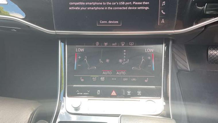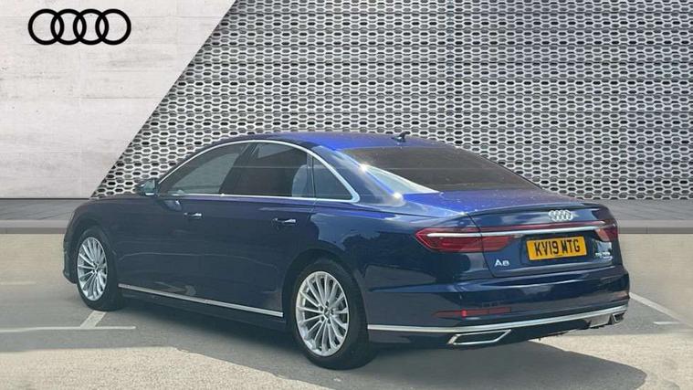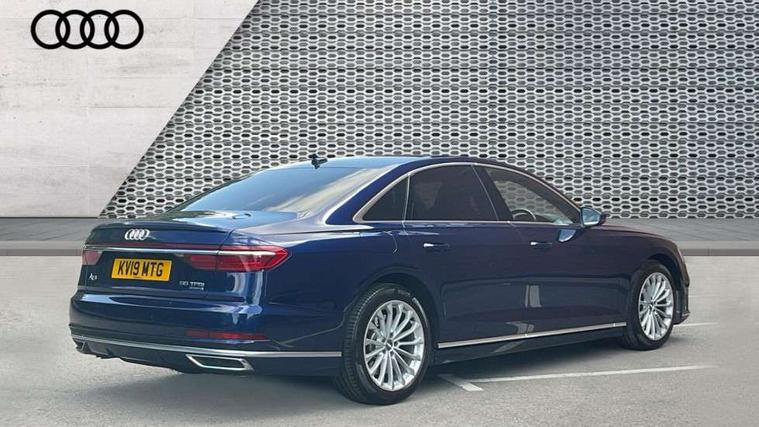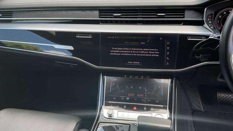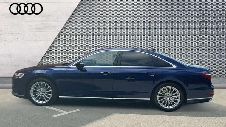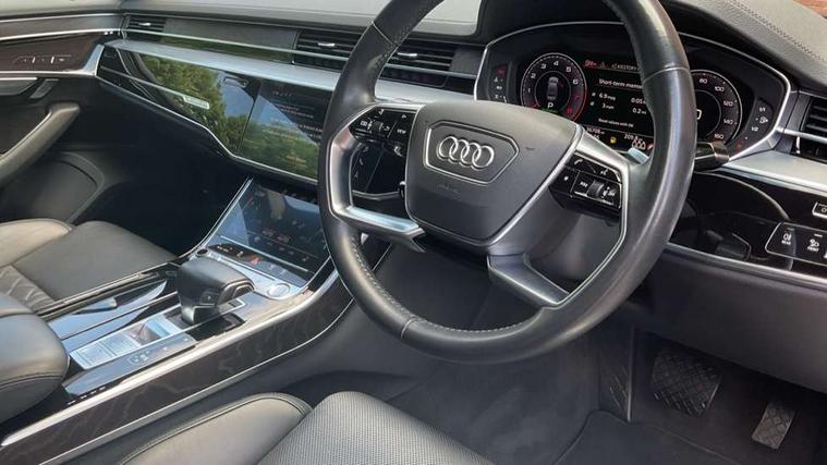 'Lights On' Reminder warning buzzer, Adaptive cruise assist with Stop and Go, Audi connect safety and service (e-call), Audi drive select, Audi phone box with wireless charging, Audi virtual cockpit, Audi wireless smartphone interface, Camera based traffic sign recognition, Colour driver's information system display, Electro - mechanical power assisted steering, Head up Display, Lane departure warning including emergency assist, MMI navigation plus with MMI touch, Operating buttons in black, glass with extended aluminium, Parking system plus - front + rear sensors, Power door closure, Power operated tailgate, Rear view camera, Remote fuel filler release, Service interval indicator, 8 speed transmission with hill hold assist, Adaptive air suspension, Quattro all wheel drive with self locking centre differential, Audi music interface, Audi sound system, DAB digital radio module, DVD System, MMI radio plus, USB connection, Acoustic double glazing, Audi space frame, Auto dimming rear view mirror, Automatic headlight control system, Body colour bumpers, Body colour door handles, Body colour exterior mirror housings, Body colour side protection with aluminium trim strips, Electric front windows, Electric rear windows with isolation switch, Electrically adjustable heated folding + automatically dimming exterior mirrors with memory function and integrated LED indicators, HD matrix healights with LED rear lights + dynamic rear indicators, Heat insulating darkened glass in side and rear windows, Heated rear window, Heated windscreen washer jets, High beam assist, LED brake lights, LED daytime running lights, Privacy glass, Reverse activated kerb-view adjustment on passenger's door mirror, Side skirts, Sport exterior styling, Sports bumpers, Windscreen with acoustic glazing, 2 zone automatic air conditioning, 230V socket, 3 seater rear seat system, 4 way electric lumbar support for driver and front passenger, Centre console with cupholders, Climate controlled seats, Comfort centre armrest, Door armrest with storage, Door pockets with bottle holder, Driver and front passenger side sunvisors with illuminated vanity mirrors, Dust/pollen filters, Electric adj front seatbelt height + memory, Electric front seats with memory function, Front centre armrest, Front/rear floor mats, Glove compartment cooling, Heated front seats, Height/reach electric steering column with easy exit function, Isofix child seat mounting points on outer rear seats, Jack and tool kit, Leather gearknob, Passenger footwell storage net, Reading lights, Rear centre armrest, Rear headrests, Roof mounted sunglasses holder, Twin spoke leather multifunction steering wheel with gearshift paddles, Valcona leather upholstery with front sports seats in diamond quilted with S embossed logo, LED ambient interior lighting pack - A8, 3 point seatbelts on all rear seats, ABS/EBD, Active front headrest system, ASR traction control, Audi pre sense basic, Audi pre sense front, EDL traction control, Electromechanical parking brake, ESP, Extended pedestrian protection measures, Front and rear side airbags with head airbag system, Front passenger airbag deactivation, Rear child proof door locks, Seatbelt reminder + electric contact in buckle + advanced safety equipment, Tyre pressure warning light, Warning triangle and first aid kit, Advanced key, Anti theft alarm tow away protection, Anti-theft wheel bolts and wheel loosening detection, Locking wheel bolts, Remote central locking, Dark matt brushed aluminium lower inlays, 19" 15 spoke design cast alloy wheels,