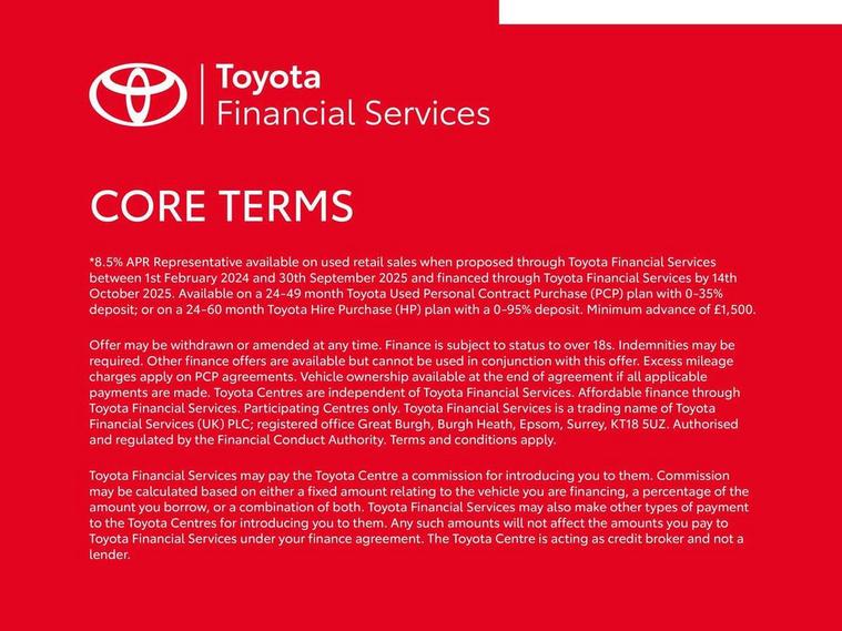 7" touch screen, Bluetooth system, DCM - Data Communication modules, Digital clock, Electric power steering, Fuel indicator with low level warning, Lane departure warning system, Lights on warning, Rear view camera, Smartphone integration powered by pioneer compatible with Apple CarPlay and Android Auto, Speed limiter, Tachometer, Vehicle Stability Control (VSC), 4 speakers, Auxiliary input socket, DAB Digital radio, iPod connection, MP3 connection, Multimedia System, Stereo radio, USB connection, 2 speed wipers/variable intermittent/mist function, Auto headlight levelling, Automatic headlights, Body colour bumpers, Body colour door handles, Body colour door mirrors, Carbon rear diffuser, Electric adjustable door mirrors, Electric front windows, Electric headlamp adjustment, Front fog lights, Green tinted glass, Heated door mirrors, Heated rear windscreen, LED daytime running lights, LED rear lights, Manually dimming rear view mirror, Projector headlamps, Rear privacy glass, Rear spoiler, Rear window demister, Rear wiper, Red roof decal, Roof mounted aerial, 12V Accessory socket, 3 spoke leather steering wheel, 50/50 split folding rear seat, Air recirculation system, Auto air conditioning, Body colour instrument panel, Centre console storage, Chrome insert to gearknob, Chrome interior door handles, Cloth upholstery, Driver and passenger sunvisors, Driver's seat height adjuster, Driver/passenger seat recline/slide adjust, Driver/passenger vanity mirrors with covers, Front and rear door pockets, Front cupholder, Front map reading lights, Glovebox, Height adjustable front head restraints, Isofix system on outer rear seats, Leather gear knob, Pollen filter, Rear cupholders, Rear headrests, Steering wheel mounted radio/phone controls, Stepless tilt adjustable steering column, Storage bins on all doors, Storage pockets in centre console, Tonneau cover, ABS, Collision mitigation braking system, Driver and passenger airbags, Emergency brake assist, ESP, Fasten seatbelt reminder, Force limiting rear seatbelts, Front side airbags, Height adjustable front seatbelts with pre-tensioners and load limiters, Hill start assist, Passenger airbag deactivate switch, Rear child proof door locks, Side curtain airbags, Tyre pressure warning, Engine immobiliser, Lockable fuel cap, Remote central locking, Air vent surround in body colour, 15" 8 spoke alloy wheels, Space saver spare wheel,