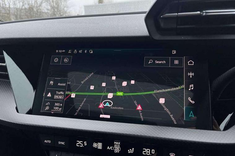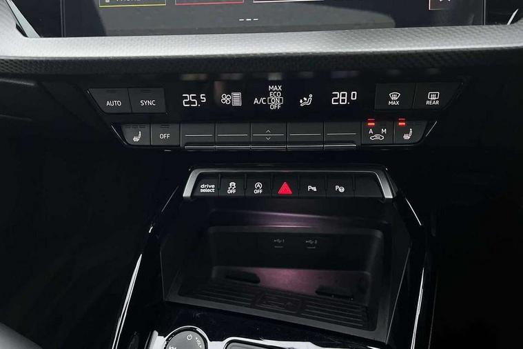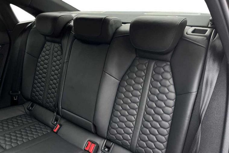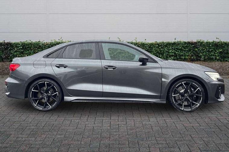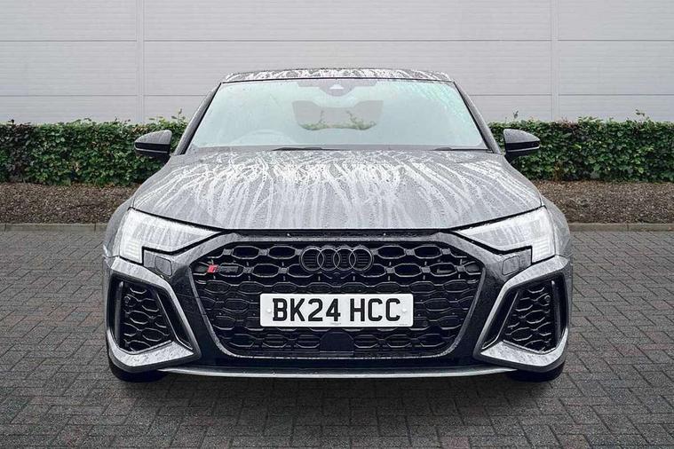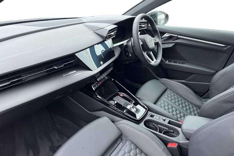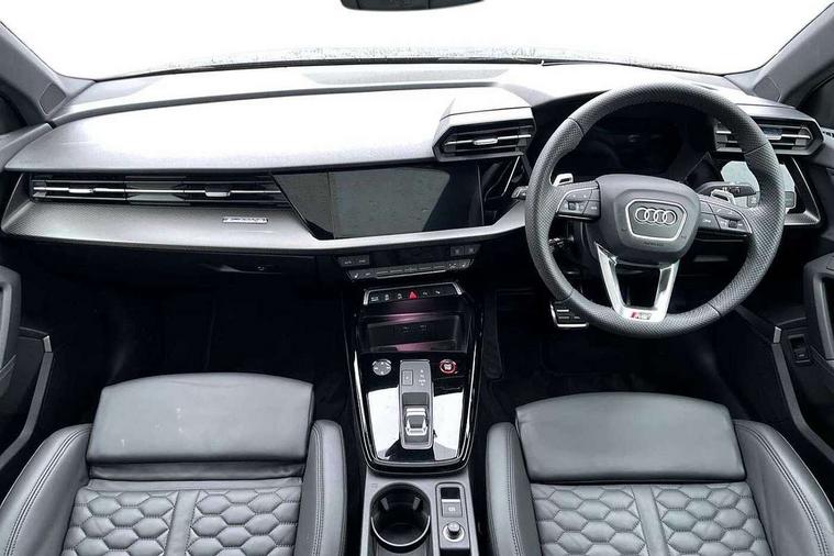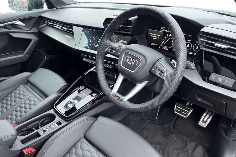 Audi smartphone interface, Audi virtual cockpit with RS specific display 12.3" full colour digital instrument cluster, Automatic start/stop system with recuperation, Bluetooth interface, Collision avoidance assistant, Emergency e-call, Head up Display, Lane departure warning system, Legal emergency call, Parking assist with parking system plus, Power operated tailgate - Luggage compartment lid opens electrically, Progressive power assisted steering, Reversing camera, Quattro permanent four wheel drive, Rear suspension, DAB Digital radio, 3rd brake light, Acoustic glass windscreen, Audi beam uses LEDs to project the Audi sport logo onto the ground as you exit your RS 3, Audi matrix LED headlights, LED rear lights, dynamic front and rear indicators and headlight cleaning system, Auto dimming rear view mirror, Black side skirts, Body colour roof, Carbon fibre engine cover, Electric adj heated/folding + auto dimming exterior mirrors with memory + LED indicator + auto kerb side function for passenger side exterior mirror, Front spoiler in high gloss black, Heat insulating glass windscreen, LED daytime running lights, Light and rain sensors, Panoramic glass sunroof, Privacy glass - dark tinted rear and rear side windows from B-pillar backwards, Rear boot, Rear side wing doors, RS exterior features in gloss black, RS sports exhaust system, 3 seat bench in 2nd row, 3 spoke leather multifunction steering wheel with gear shift paddles, 4 way lumbar support for front seats, 40/20/40 split folding rear seat bench, Black cloth headlining, Dual zone electronic climate control, Electrically adjustable front seats with memory function for driver's side, Front and rear headrests, Front centre armrest, Front sports seats RS embossed logo, Front/rear floor mats, Heated front seats, Honeycomb stitching and RS embossing, Illuminated door sill trims inlays in aluminium with RS 3 logo, RS emblems, Single front passenger seat, Stainless steel pedals and front footrest in black, Aluminium interior elements pack - RS3, Ambient lighting pack - RS3, Comfort and sound pack - RS3, Driver assistance pack with 3 spoke leather multi function steering wheel - RS3, MMI navigation plus with MMI touch - RS3, RS bodystyling - RS3, Storage Pack - RS3, 3x3 point rear seat belts, ABS/EBD, ASR, Audi pre sense front, Driver/Front Passenger airbags, EDL, ESC - Electronic Stability Control + traction control, Front passenger airbag deactivation, Front side airbags with head airbags and interaction airbag, Hill hold assist, Seat belt reminder with passenger presence detection in rear, Tyre pressure loss indicator, Warning triangle and first aid kit, Anti theft alarm, Anti-theft wheel bolts, Electronically operated child lock, Remote control central locking, Full decorative carbon trim, 19" 5 Y spoke black with graphic print alloy wheels, Tool kit, Tyre repair kit,