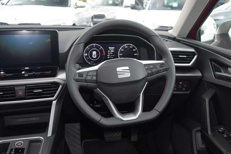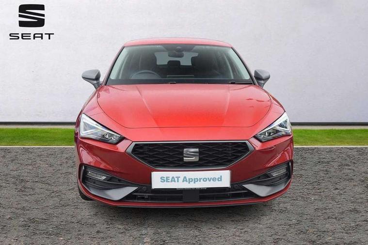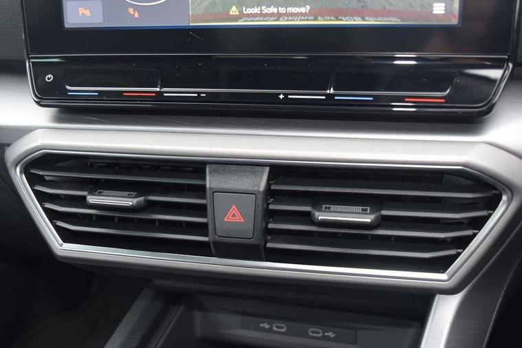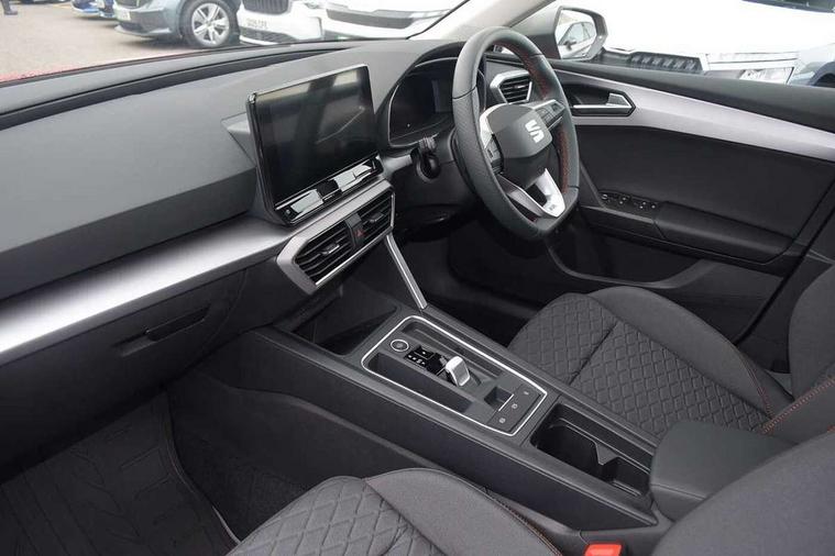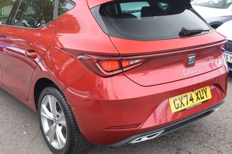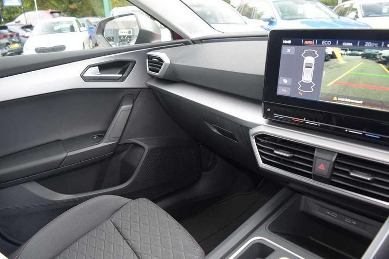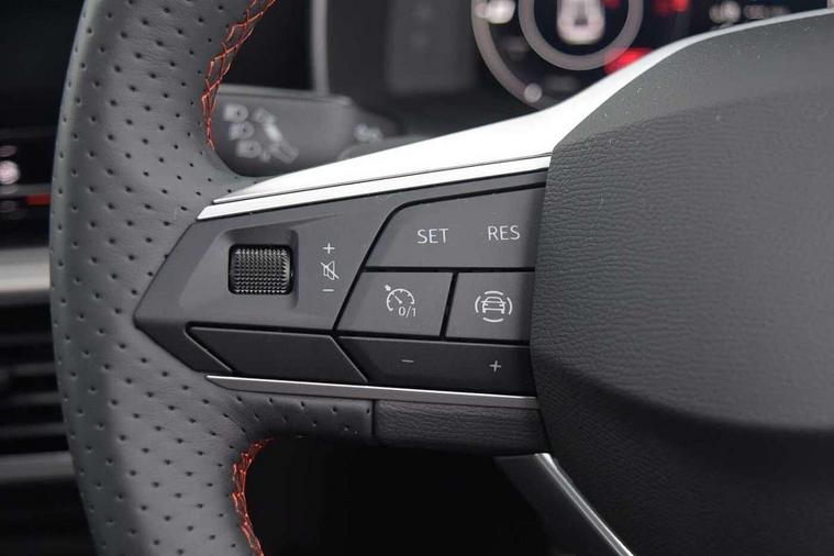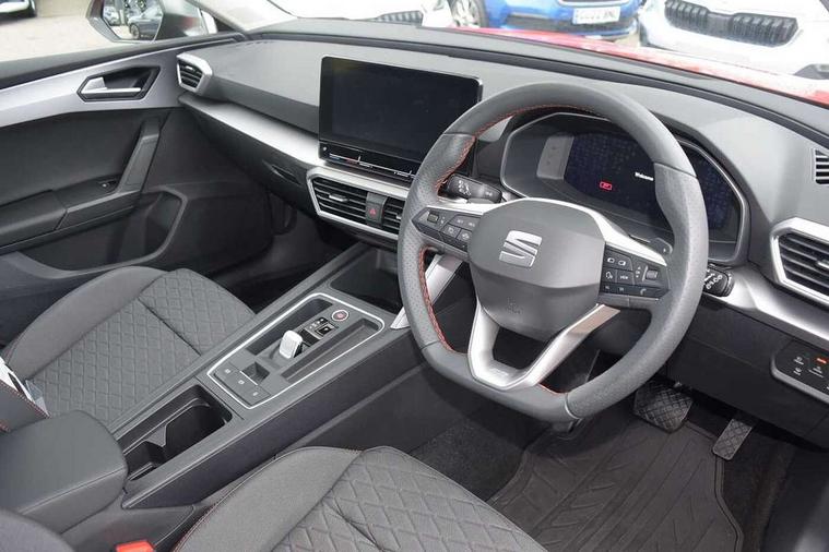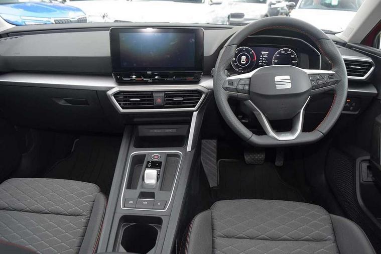 Digital cockpit, E-call, Four x USB Type C ports, Front assist with forward collision warning braking reaction to vehicles, pedestrians and cyclists, Full link smartphone integration with Mirror Link, wireless Apple CarPlay and wired Google Android Auto, Lane assist, Lockable tailgate, Park assist (inc front/rear parking sensors), Power assisted speed sensitive electro-mechanical steering, Rear view camera, RPM, trip computer, outside temp gauge, instrument light brightness, low fuel warning light, lights on reminder, gearshift indicator, SEAT drive profile with 4 modes (Eco/Normal/Sport/Individual), throttle response and gearshift mode, Service interval indicator, Start/stop system with regenerative braking, 10 amp mode 2 charging cable, 16 amp mode 3 charging cable, Sports suspension, XDS electronic differential lock and dynamic traction support, 7 speakers, Auxiliary input socket, Auto dimming rear view mirror, Body colour door handles, Body coloured bumpers, Cosmo grey exterior mirrors with integrated LED indicators, Dark tinted rear windows, Dynamic headlight range control, Electric front/rear windows, Electrically adjustable, heated and folding door mirrors, FR sports bumper, Illuminated front door sill, LED front fog lamps, LED Headlights with dynamic turn signals, LED tail lights and rear fog lights with rear coast to coast lighting, Rear side wing doors, Rear wash/wipe, Separate daytime running light with automatic headlight control and coming home feature, Third brake light, Welcome light silhouette from exterior mirrors, Windshield wiper intermittent control with light/rain sensor, 12v power point in centre console, 3 seat bench in 2nd row, 60/40 split rear bench seat with armrest, Ambient lighting with glovebox, footwell and single monocolour, Cloth upholstery, Driver/passenger manual seat height adjustment, Dust/pollen filter, Folding boot cover, Front and rear height adjustable headrests, Front and rear reading lights X 4, Front centre armrest, Front seatback storage pockets, Grey headlining, Height/reach adjust steering wheel, ISOFIX points in outer rear seats with top tether anchorage points, Luggage tie-down hooks, Lumbar adjustment for front seats, Single front passenger seat, Sunvisors with covered illuminated mirror, Three zone climate control, Media system plus with navigation - Leon, 3 point seatbelts on all rear seats, ABS, Brake control system - ESC and brake booster, Child proof door locks, Driver and front passenger airbags with front passenger airbag de-activation, front side and curtain airbags, Electronic parking brake, Extended safety system - seat belt tensioner, window closure and hazard lights, Hill hold control, Rear disc brakes, Seat belt reminder for front and rear seats, Tiredness recognition system, driver alert system, Tyre pressure monitoring system, Anti theft alarm system with interior monitoring in cab, backup horn and towing protection, KESSY Go (Keyless start), Locking wheel bolts, Wireless phone charging, Chrome interior detailing, 17" Dynamic Bi-spoke alloy wheels with 91W tyres, Emergency tyre repair kit, Tool kit,