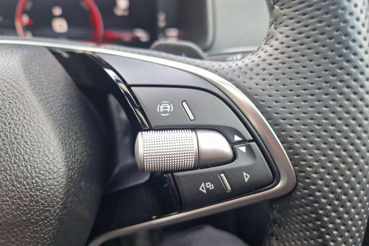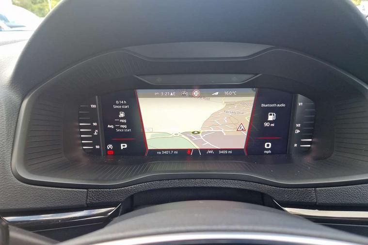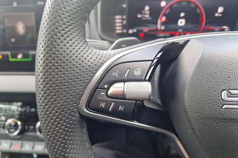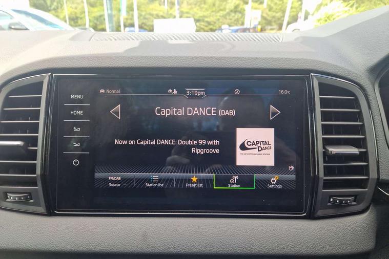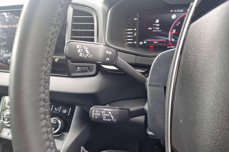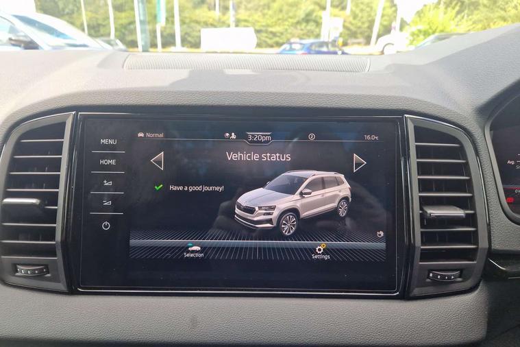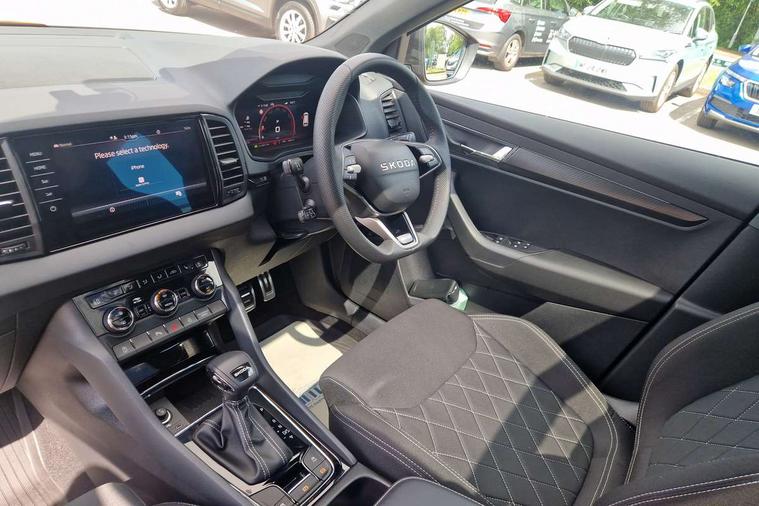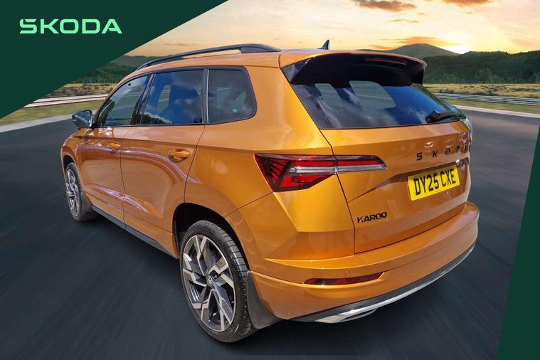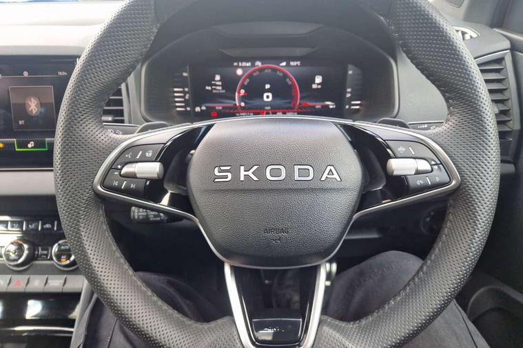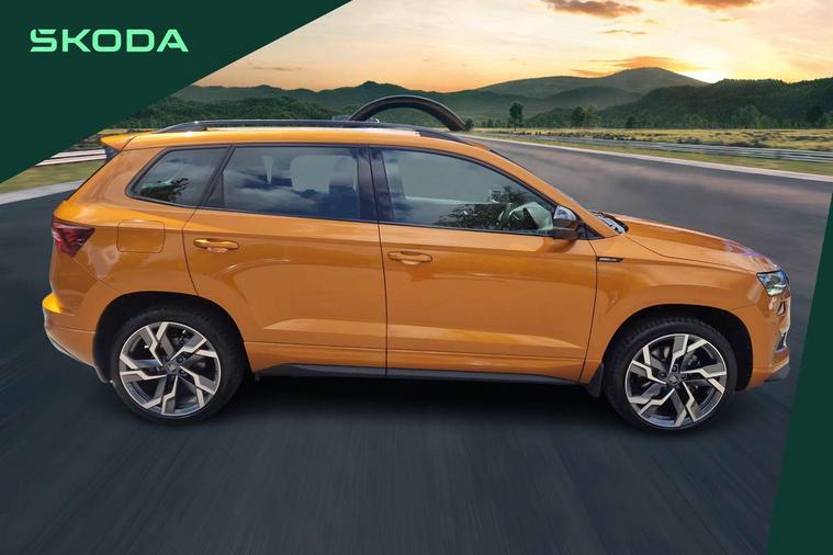 Advanced driver attention and drowsiness monitor, Emergency services call system, Outside temperature gauge, Sensor for driver assistance systems, Service interval indicator, SmartLink wireless for Apple and wired for Android, Start/stop system with regenerative braking, Traffic sign recognition, USB C Port x 2 in front centre console, Virtual Cockpit - 10.25" digital display, Virtual pedal with electrically operated boot door, Wireless smartphone charging, DAB radio with Bluetooth, USB connection, Acoustic glass, Aero front windscreen wipers with intermittent function, Auto dimming rear view mirror with light and rain sensors, Black door mirrors, Black electric window control buttons, Black radiator grille, Black roof rails, Body colour door handles, Electric front and rear windows with child proof lock, Extended rear roof spoiler, Front door steps with SportLine logo, Heated rear windscreen, LED daytime running lights, LED rear lights with high functionality welcome effect and dynamic indicators, Light assistant (coming/leaving home/tunnel light), Panoramic sliding sunroof, Plastic scuff plates in door apertures, Privacy glass, Protective door side sills in body colour, Rear diffuser, Rear side wing doors, Rear window wiper with washer system and intermittent control, Safety reflectors on front doors, Skoda lettering on tailgate in black, Sportline badge on front fender, Sports front and rear bumpers, Third brake light, Unique dark chrome design logo on alloy wheels, 1.5 litre bottle holders in driver and front passenger door panels, 12V socket in boot, 12v socket in front centre armrest with storage compartment and rear air vents, 2 x Tablet holder, 3 rear height adjustable headrests, 3 seat bench in 2nd row, 3 spoke sports leather heated multifunction steering wheel with DSG paddles, 4 foldable roof handles with rear coat hooks, Black floor carpet, Cargo elements in boot, Chrome inner door handles, Foldable hooks in the boot, Front head restraints, Height adjustable front three point seats belts with tensioners, Height/reach adjust steering wheel, Ice scraper, Illuminated glovebox, Illuminated luggage compartment, Isofix child seat preparation for front passenger seat, Isofix child seat preparation outer rear, Manual lumbar support for front seats, Pen holder, Pollen filter, Rear backrest release from boot, Rear boot cover, Rear package tray, Rear reading lights, Rear seats fixed folding and divided 60:40, Rubbish bin door, Safety vest holder, Single front passenger seat, Skoda lettering on steering wheel, Sportline decorative inserts, Storage box in upper central dashboard closed, Sunvisors with illuminated vanity mirrors, Textile floor mats, Ticket holder, Titan black interior ceiling, Umbrella under passenger seat, Under passenger seat storage compartment, Columbus pack - Karoq, LED Interior lighting pack with Skoda welcome logo - Karoq, Light Pack - Karoq, Non Smokers pack, Performance pack - Karoq, Winter plus pack with heated front and rear seats - Karoq, Automatic door unlocking in case of crash, Automatic fuel cut off in case of crash, Driver airbag, Electronic parking brake with auto hold function, Emergency rear braking signal, ESC (incl. ABS+MSR+ASR+EDS+HBA+DSR+RBS+MKB), Front side airbags, Head airbags, Hill hold control, Knee airbags, Passenger airbag with switch-off function, Pedestrian monitor, Seatbelt reminder signalisation and pretensioner for all seats, Three point seatbelts rear, Two tone horn, Tyre pressure monitor, Alarm with interior monitoring, back up horn and tilt sensor with safe function, Electronic engine immobiliser, Keyless entry and start/stop, Remote central locking with 2 remote folding keys, Black air vent surround, Black centre console, carbon door decor, Satin black dashboard, Satin black door trim, 19" Sagittarius anthracite alloy wheels, Anti-theft wheel bolts protection, Breakdown and tool kit,