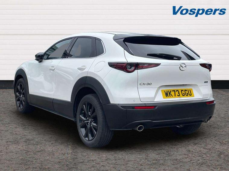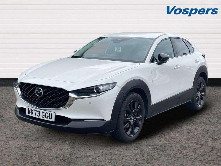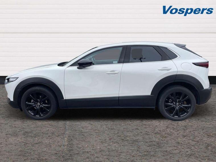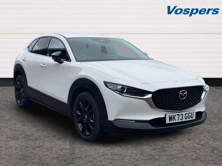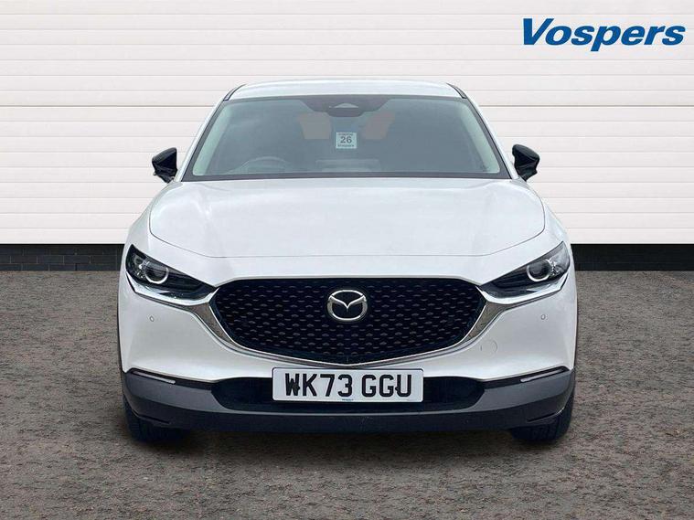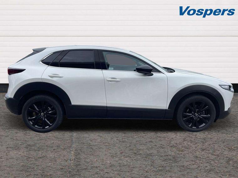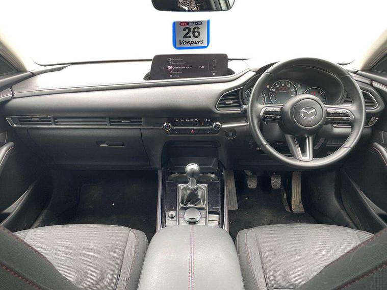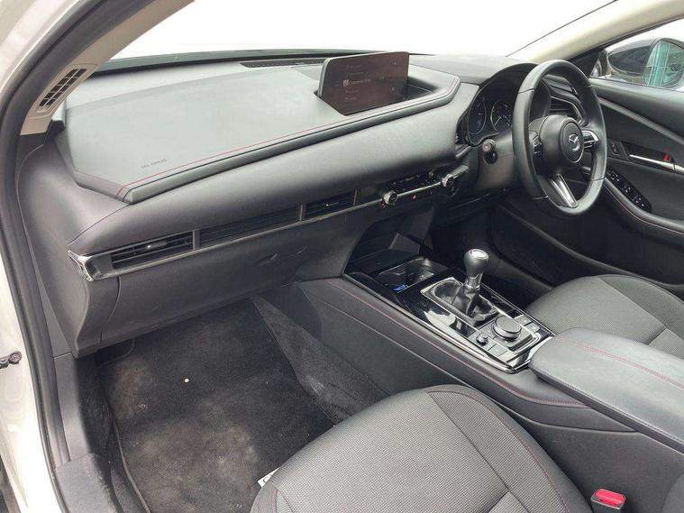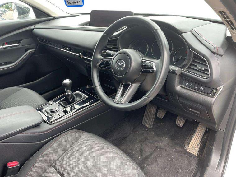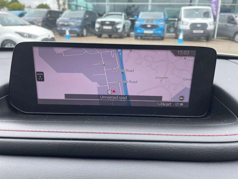 10.25" display with Mazda Connect infotainment, 7" TFT Colour driver instrument panel display, Adaptive cruise control (Mazda radar cruise control), Blind spot monitoring with rear cross traffic alert, Driver attention alert system, E-call with GPS, Emergency stop signalling system, Engine start/stop button, Front and rear parking sensors, Integrated bluetooth, Integrated Mazda navigation system, Intelligent speed assist, Lane keep assist system (LAS) with Lane departure warning system (LDWS), Mazda connected services, PAS, Power lift gate, Qi wireless charging, Reversing camera, Service indicator, Tailgate, Traffic sign recognition, Trip computer, Windscreen projected colour active driving display (HUD), Wireless Apple CarPlay/Android Auto, Cylinder Deactivation, i-stop, 2 USB charging ports in front inner central armrest, AM / FM / DAB radio with 8 speakers, Multimedia Commander including separate volume dial, Steering wheel mounted audio/bluetooth controls, Auto dimming rear view mirror, Auto headlight levelling, B-pillar and C-pillar garnishes in piano black finish, Black electrically adjustable, heated auto power folding door mirrors with integrated indicators, Chrome finish signature wing in front grille, Coming/leaving home lighting function, Dual chrome exhaust, Dusk sensing headlights, Electric front/rear windows with one touch auto up/down, Front kodo turn signal, Gloss black front grille, Gloss black rear roof spoiler, LED headlights with halogen daytime running lights and high beam control, LED rear combination lights, Privacy glass (rear side windows and rear screen), Rain sensing front wipers with adjustable speed and intermittent wipe, Rear fog lights, Rear side wing doors, Rear wiper, Third brake light, 12V power outlet in centre console, 3 seat bench in 2nd row, 60/40 split fold down rear seats, Chrome interior trim accents with steering wheel centre bezel, surround of engine start / stop button and glove box handle, Cloth upholstery with red stitching and interior accents, Dark cloth door panel inserts, Dashboard, door cards and front centre armrest in black cloth with red stitching, Driver and front passenger visors with covered vanity mirror and driver ticket holder, Driver seat manual slide, recline, height and seat tilt adjust, Driver, front passenger and two rear door storage, Driver, Front passenger and two rear grab handles with coathooks, Dual zone climate control air conditioning with rear air vents, Folding rear centre armrest with two cup holders, Front and rear (x3) head restraints, Front and rear LED lighting, Front armrest, Front centre storage with two cupholders, Front passenger seatback pockets, Front passengers seat manual slide, recline and height adjustment, Gear shift indicator, Glovebox illumination, Heated front seats with 3 stage setting, ISOFIX child seat anchorage points attached on outer rear seats, Leather wrapped gear shift knob, Leather wrapped steering wheel with telescopic and tilt adjustment, LED luggage compartment lighting, Light roof headlining and pillars, Roof mounted sunglasses holder, Single front passenger seat, 3 point ELR front seat belts x2 with pretensioners, 3 point ELR rear seat belts, Anti-lock braking system (ABS), Drivers knee airbag, DSC - Dynamic Stability Control, Electronic parking brake with auto disengage function and auto hold function, Front and rear curtain airbags, Front dual stage driver and single stage front passenger airbags, Front passenger airbag cut-off switch, Front side airbags, Front smart city brake support, G-Vectoring control plus, Hill launch assist, Manual child lock in rear doors, Mild Hybrid system with regenerative braking, Seatbelt reminder for driver/front passenger and rear seats, Traction control system (TCS), Tyre pressure monitoring system (TPMS), Remote central locking with deadlocking and automatic door lock when driving, Smart keyless entry, Thatcham accredited alarm and immobiliser, 18" Black metallic alloy wheels, Emergency tyre repair kit,