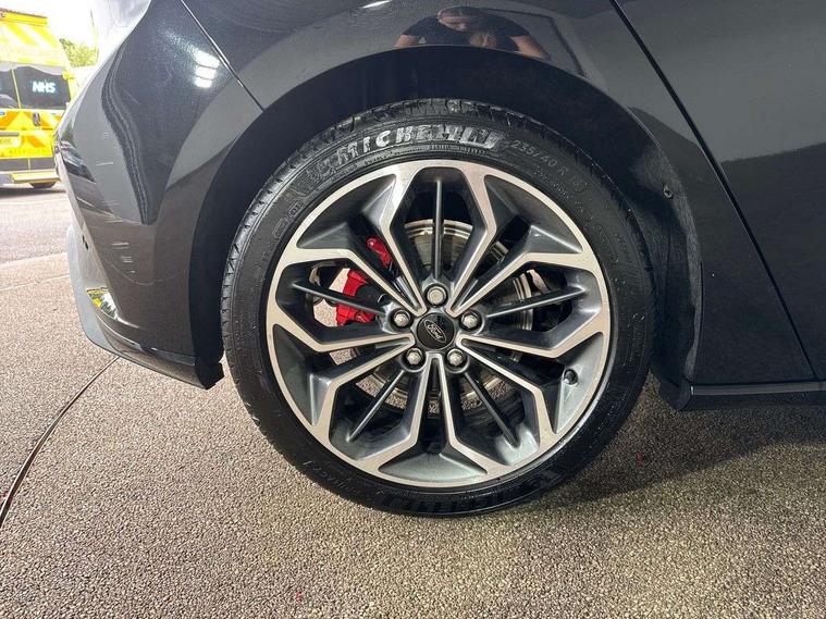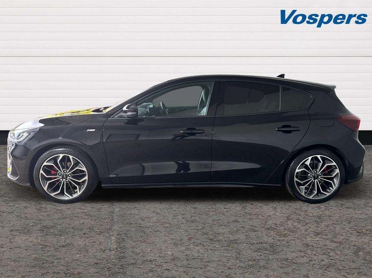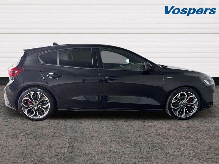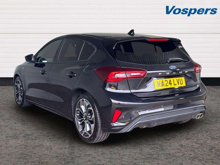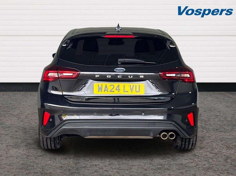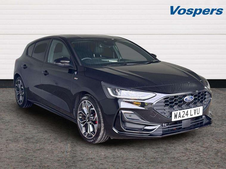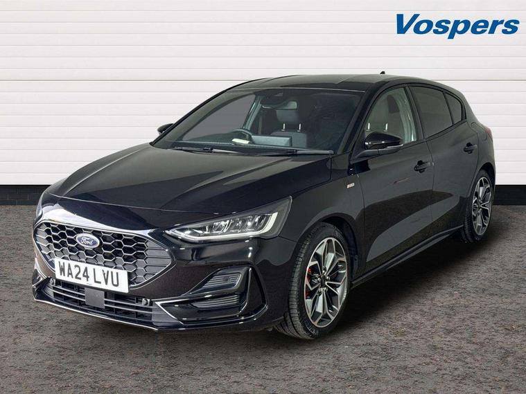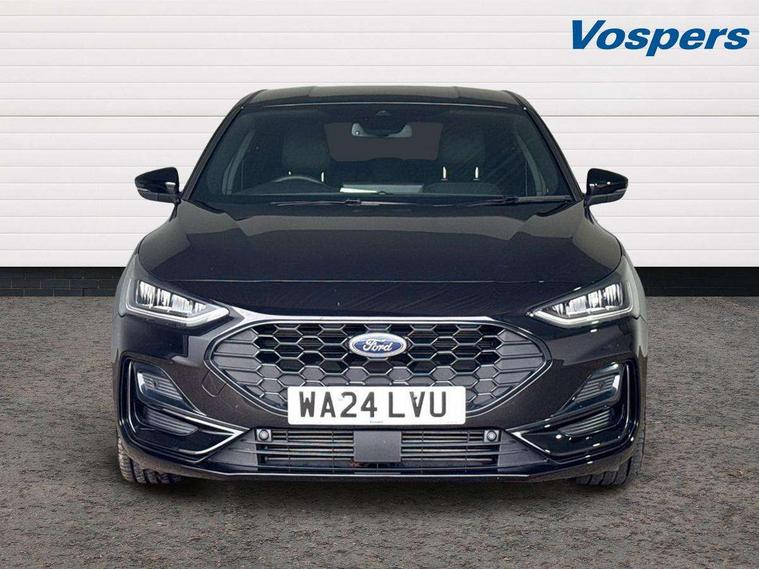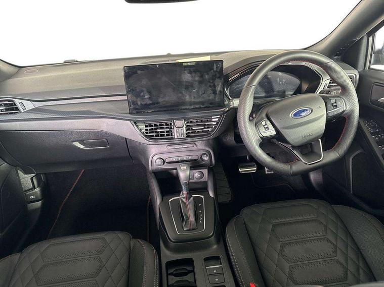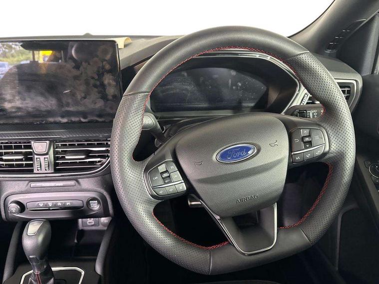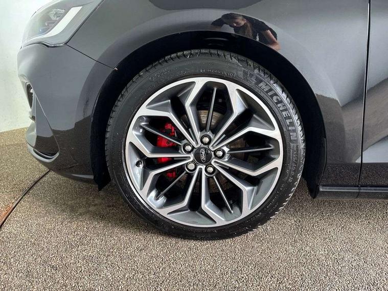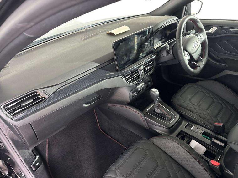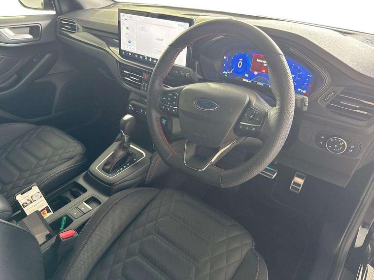 12.3" Digital instrument cluster, Bluetooth system, Digital clock, Easy fuel capless refuelling system, Eco mode, Ford SYNC4 Nav with 13.2'' touchscreen, DAB, Emergency Assistance, Apple Carplay & Android Auto, B&O Premium Audio with 10 speakers, FordPass Connect, Lane keeping system - lane keeping alert and lane keeping aid, PAS, Rev counter, Selectable drive mode, Service interval indicator, Trip computer, Wireless charging pad, Sports tuned suspension, 2 USB ports, Auto headlamps (on/off), Body coloured door handles, Electrically operated front and rear windows with one touch opening and closing, Electrically operated heated power fold door mirrors with puddle lamp with side indicators, Front variable intermittent wipers with electric wash, Heated rear window, LED daytime running lamp, LED rear lamps, LED third brake light, Polished twin tailpipe, Privacy glass, Quickclear heated windscreen, Rain sensor, Rear side wing doors, Tailgate wash/wipe, Unique ST-Line grille, full bodystyling kit, and large body coloured rear roof spoiler, 3 rear headrests, 3 seat bench in 2nd row, Dual zone electronic air temperature control, Full sensico premium upholstery, Height adjustable front headrests, Isofix child seat preparation, Load through ski hatch, Manual 2-way passenger seat adjust, Power 4-way driver seat adjust, with power lumbar adjust, Reach + rake adjustable steering column, Single front passenger seat, ST-Line Design pack - Focus, Winter pack - Focus, 3x3 point rear seatbelts, ABS+Electronic Brake force Distribution, Auto hold function, Driver airbag, EDL traction control, Electronic parking brake, Electronic stability control, Front and rear seatbelt reminder, Front inertia reel height adjustable seatbelts with pre-tensioners, Front passenger airbag, Front side airbags, Passenger airbag deactivate switch, Post collision braking, Pre collision assist with autonomous emergency braking and pedestrian/cyclist detection, Remote/power child rear door locks, Side curtain airbags, Three rear inertia reel lap/diagonal seatbelts, Tyre pressure monitoring system, Keyless entry and keyless start, MyKey system, Remote central locking & engine immobiliser, Thatcham alarm with power door dead locks, 18" 5x3 spoke pearl grey high gloss machined finish alloy wheels with mini spare wheel,