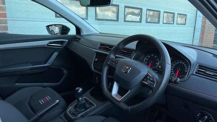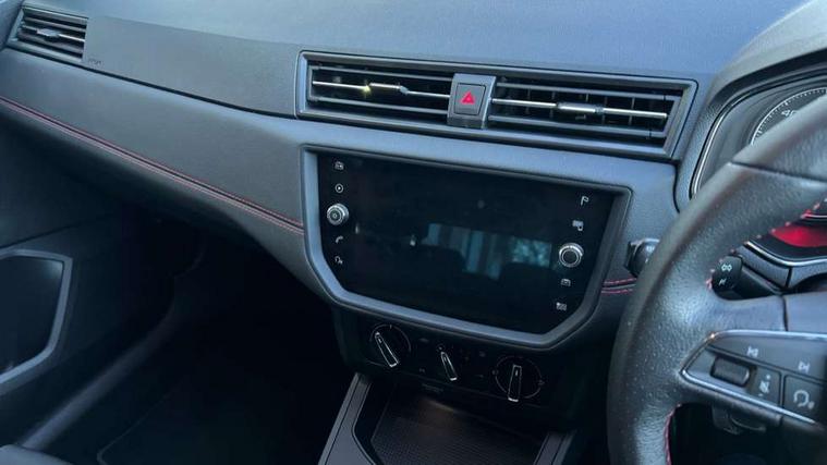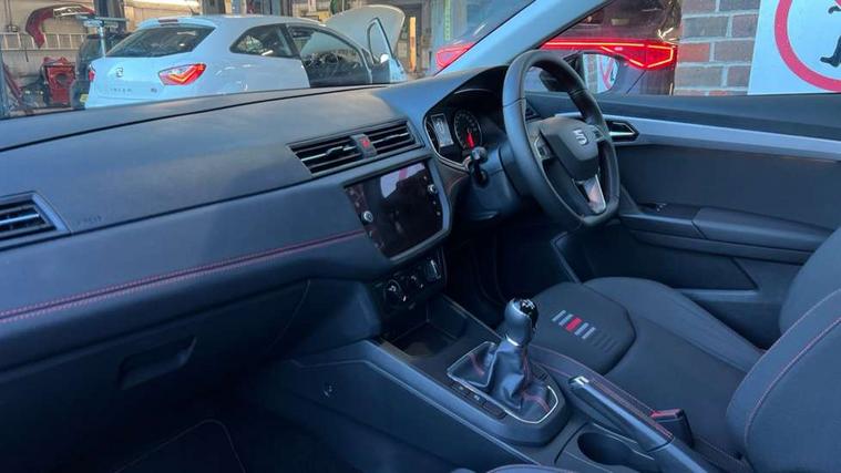 'Lights On' Reminder warning buzzer, Bluetooth Handsfree Phone Connection, Cruise control, Digital clock, Full Link Smartphone Integration with Mirror Link, Apple Car Play, Google Android Auto, Low fuel warning light, Outside temperature gauge, Power Steering, Satellite navigation system with 3D mapping, 8" touch screen, voice control and additional USB port, SEAT Drive profile, SEAT logo boot release, Trip computer, Sports suspension, 6 speakers, Auxiliary input socket, CD player, Digital Audio Broadcast (DAB) Tuner, Radio/MP3 player, SD card slot, SEAT USB media cable, Steering wheel mounted controls, USB port, Anti theft roof antenna, Auto dimming rear view mirror, Automatic headlights, Automatic rain sensing wipers, Body colour bumpers, Body colour door handles, Brilliant black door mirrors, Chrome front grille frame, Chrome grille, Coming/leaving home lighting function, Cornering front fog lights, Dark tinted rear windows, Electric folding door mirrors, Electric front windows, Electric headlight adjustment, Electrically adjustable and heated door mirrors, Exclusive FR rear bumper, Full LED headlights, LED daytime running lights, LED tail lights, Rear fog lights, Twin exhaust pipes, 3 rear headrests, 60/40 split folding rear seat, Air conditioning, Door and steering wheel ice metal decorative inserts, Driver's sunvisor with ticket holder/vanity mirror, Dust/pollen filter, Flat bottomed perforated leather steering wheel with red stitching and FR logo, Front courtesy lights, Front cupholders x 2, Front reading lights, Gear shift indicator, Glovebox, Height adjustable driver's seat, Height adjustable front/rear head restraints, Height adjustable passenger seat, Height/reach adjust steering wheel, Illuminated boot, Instrument lighting with brightness control, Leather dashboard, Leather handbrake, Multi-colour ambient interior lighting, Nora cloth upholstery, Passenger sunvisor, Rear top tether child seat ISOFIX attachment, Sports seats, Full LED headlight pack - Ibiza, 3 point seatbelts on all 3 rear seats, ABS, Active front headrests, Child locks on rear doors, Curtain airbags, Driver/Front Passenger airbags, ESP+EBA, Front assist (AEB), Front passenger airbag deactivation, Front side airbags, Hill hold control, Multi-Collision braking, Seatbelt warning, Tiredness recognition system, Tyre pressure monitoring system, Electronic engine immobiliser, Locking wheel bolts, Remote central locking + deadlocks, Volumetric alarm with back up horn, 17" Dynamic alloy wheels,