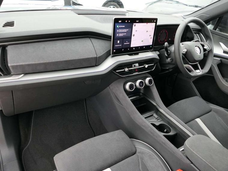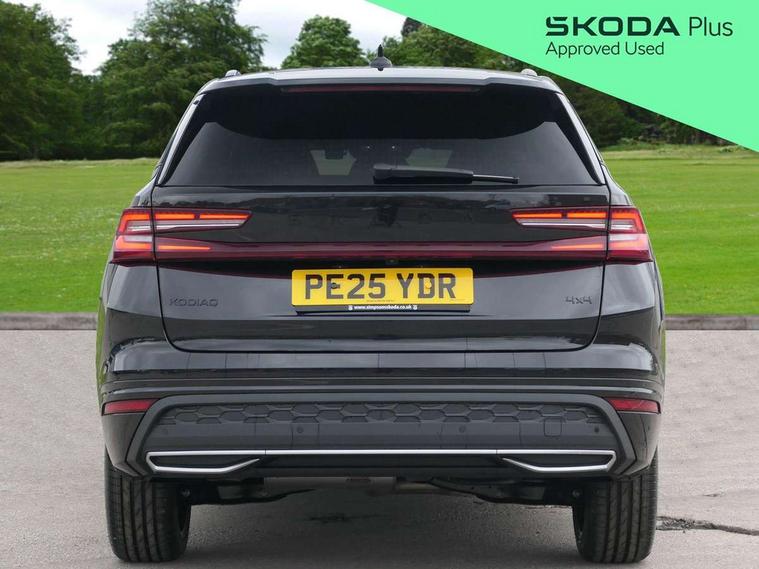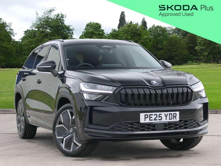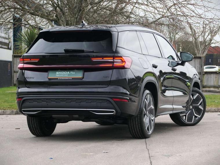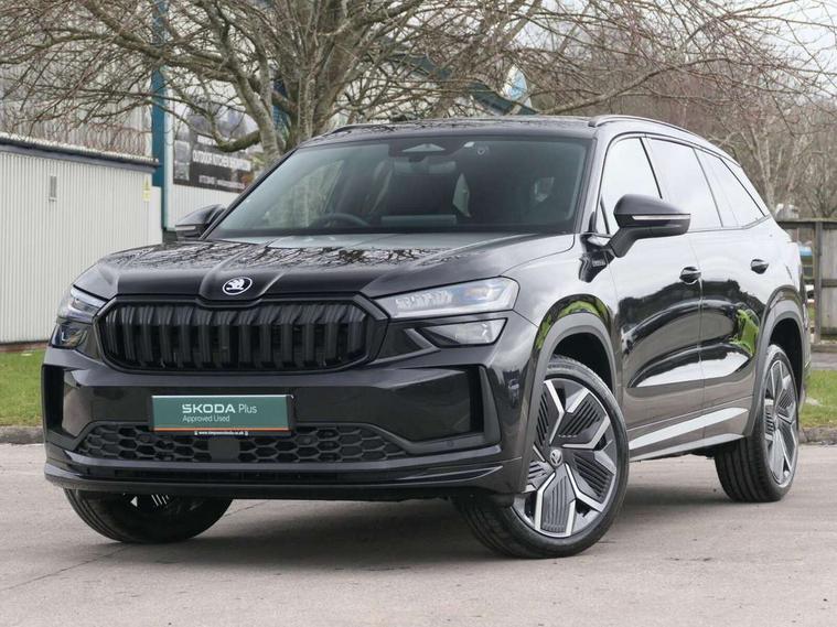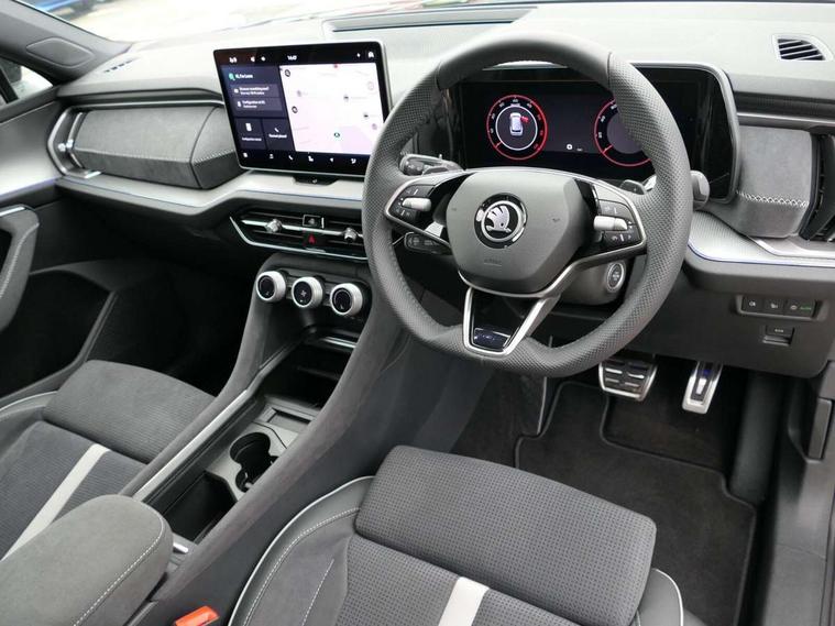 13" satellite navigation touchscreen display, Blind spot detection with door exit warning, Bluetooth system, ChatGPT functionality, Driver alert - Fatigue and drowsiness monitor, Dry display cleaner, Emergency call, Front and rear parking sensors, Front cross traffic assist, Lane assist, Off road modes, PAS, Rear traffic assist, Tailgate unlocking from outside, Traffic sign recognition, USB C Port x 2 in front centre console, Virtual Cockpit - 10.25" digital display, Voice control system, Wireless charging for two smartphones (15W) with cooling function, Wireless SmartLink for Apple CarPlay and Android Auto, Stop/start function, 2x USB-C in the rear, DAB Digital radio, Aero front windscreen wipers with intermittent function, Auto dimming rear view mirror, AWL (all weather lighting) and all weather light with cornering function, Black diffuser and decorative tailpipe with a unique dark chrome finish, Black roof rails, Black sports styling including front grille and window surrounds, Black wheel arch surrounds, Body colour door handles, Cornering light and poor weather light, Electric folding /adjustable/separted heated/folding door mirrors, auto dimming with boarding sports and memory function, Electric front and rear windows, Exterior black decorative trims, Front and rear sports bumpers including lower rear chrome strip, Gloss black door mirrors, Gloss black window frame and D pillar, Heat insulating glass in windshield, Heated rear window, Ice scraper in fuel tank cap, LED daytime running lights, LED third brake light in rear spoiler, Light assistant with automatic headlight control and coming home feature, Logo projection in door mirrors, Privacy glass, Rear roof spoiler, Rear side wing doors, Rear window wiper, Red decorative strip between rear LED lights, Safety reflectors on front and rear doors, Sportline badge on front fenders, Tailgate lettering in Black, Unique dark chrome design logo on alloy wheels, Window control switches with black trim, Windscreen wipers with rain sensor, Without engine designation, 1.5l bottle holder points in all door, 1x centre rear reading light, 2 seat bench in 3rd row, 3 configurable smart dials with 32mm coloured display, 3 seat bench in 2nd row, 4 foldable roof handles with rear coat hooks, Aluminium pedals, Ambient interior lighting - Dashboard, front-door stowage compartments, front and rear door panels and footwell lighting, Automatic gear selector on steering column, Chrome interior door handles, Driver/front passenger reading lights, Fabric headlining, Fixed bench 40:60:40 split folding backrests, Front and rear floor mats, Front centre armrest with jumbo box storage compartment, cup holder and 12V socket, Front sport seats, Height adjustable front headrests, Interior black decorative trims, Isofix child seat fittings in outer middle row rear seats and front passenger with top tether, Manually adjustable steering column, Pollen filter, Rear centre armrest with cupholders, Rear seat boot backrest release, Single front passenger seat, Skoda lettering on steering wheel, Storage pocket including mobile phone pockets on the backs of the front seats, Sunvisors with illuminated vanity mirrors, Three rear height adjustable headrests, Ticket holder on A Pillar, Tri zone climate control, Umbrella in door panel x1 made from sustainable materials, Upper and lower glovebox with card holder and coin compartment, USB C port by rear view mirror for charging only (15W), Acoustic package - Kodiaq, Performance package - Kodiaq, Sportline design selection pack - Kodiaq, Auto door release and activation of warning lights in the event of an accident, Driver and front passenger airbag with knee airbag and front passenger airbag deactivation, Electric child locks, Electronic parking brake, ESC (incl. ABS+EMD+MSR+ASR+EDL+HBA+DSR+RBS+ESBS+MCB+TSA+XDS), Front assist with braking reaction to vehicles, pedestrians and cyclists, Front disc brakes, Fuel cut off safety device, Height adjustable front 3 point seatbelts + pretensioners, Hill hold assist, Junction assist with automatic emergency braking, Rear disc brakes, Safety vest holder in door, Seat belt reminder for all seats, Three point rear seat belts, Two tone horn, Tyre pressure monitor, Alarm with interior monitoring and tilt sensor with safe function, Anti-theft wheel bolts, Immobiliser, Remote central locking with 2 keys, 20" Rila anthacite polished alloy wheel with black matte aero covers,