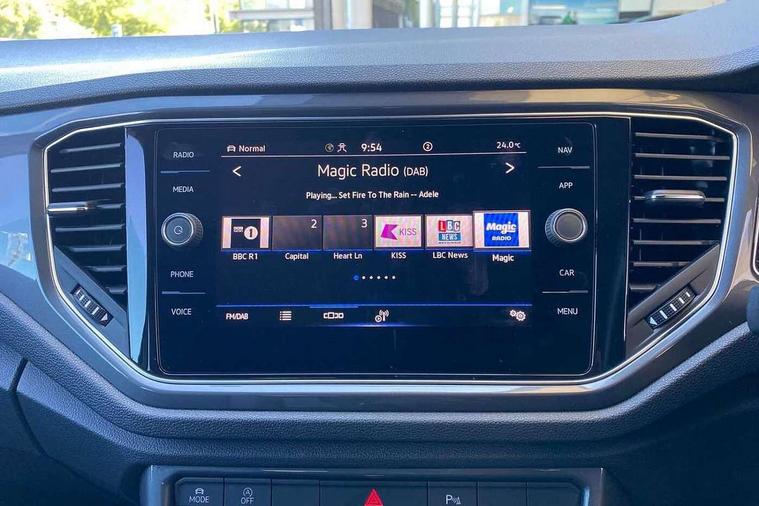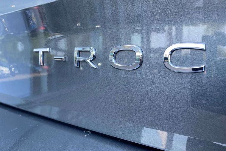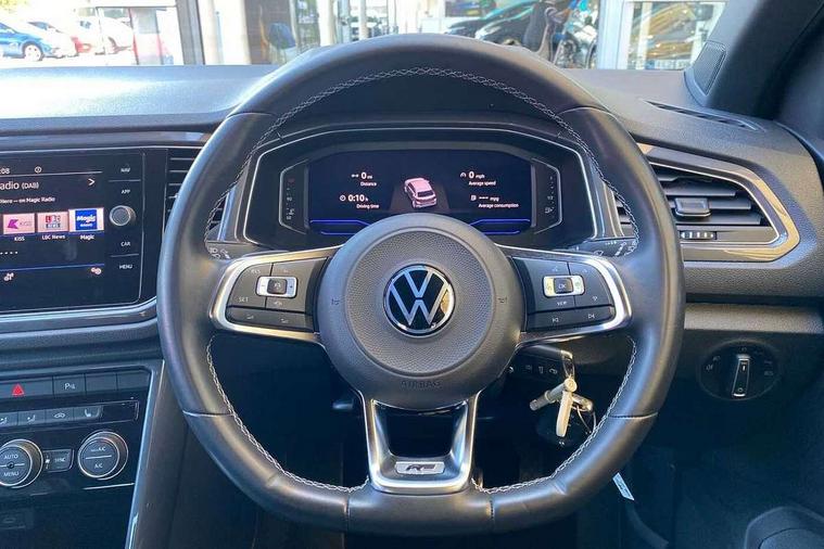 'Lights On' Reminder warning buzzer, Adaptive cruise control, Bluetooth telephone and audio connection for compatible devices, Car information display, Digital Cockpit Pro - Active info display, Driver alert system with audible and visual fatigue detection system, Driver tips and journey analysis, Emergency call service, Lane assist with warning text instrument cluster, Modified key software - reduce switch off time for key status change to Long no motion, Multifunction camera, Multifunction computer with visual gear change recommendation for fuel consumption, Navigation system discover media including streaming and internet, Service interval indicator, Think blue trainer driver tips and journey analysis, Traffic sign recognition, Voice activation, Warning sound and light for front seatbelts unfastened, Wireless app connect for apple carPlay, Battery regeneration during braking, Rear shock absorption for sports version, Start/stop function with battery regeneration, DAB Digital radio, Disk brakes in front, Diversity antenna for FM reception, Music playback - MP3, WMA and AAC files, Premium USB cable in choice of either Apple or Android smartphone compatibility, SD card slot, Simultaneous pairing of 2 compatible mobile devices, SMS functionality - read, compose and send SMS messages using touch-screen display, Storage compartment with longitudinal and height adjustable in armrest and two rear air vents, Three route options - Fast, Short, Eco, Title and cover art display, USB-C Interface and USB charging socket, Auto dimming interior rear view mirror, Automatic coming/leaving home lighting function and daytime running lights, Automatic hazard lights activation under emergency braking, Black grained lower door protectors, Body colored door lower parts, Body colour door handles, Body colour rear roof spoiler, Chrome effect left and right trapezoid exhaust tailpipe fascia surround, Chrome plated moldings, Chrome trim on upper and lower radiator grille, Dusk sensor, Dynamic headlight range control with self adjusting whilst driving, Electrically foldable, adjustable and heated door mirrors with puddle lights and reverse activated kerb-view adjustment on passenger's door mirror, External USB type C socket and charging sockets, Front and rear electric windows, Front fog lights with static cornering function, Front windscreen wiper with intermittent wipe and 4 position delay, Fully galvanised body, Heated rear window, Heated windscreen washer jets, High level 3rd brake light, LED darkened rear light clusters, LED headlamps with automatic range adjustment and unique signature LED separate daytime running lights, LED rear number plate lights, LED tail lamp rear comination lamps, Privacy glass, R-Line design body coloured bumpers, Rain sensor, Rear tinted glass from B-pillar backwards approx 65% tinted, Rear wash/wipe with intermittent wipe setting, Silver anodised roof rails, Volkswagen roundel, 12V socket in centre console storage area, 3 rear head restraints, 4 load lashing points in luggage compartment, Aluminium pedals, Black roof lining and sun visors, Branded points of interest, Carbon flag cloth upholstery, Chrome plated radiator grille inserts, air vent surrounds and light switch surrounds, Climate control - 2 zone electronic air conditioning with automatic air recirculation and allergy filter, Door and side trim panel, Door and side trim panel in foam film, insert in leatherette, Drawer under drivers seat, Front + rear carpet mats, Front centre armrest, Front cupholders x 2, Front seat back storage pockets, Front sports seats with R-Line logo on seat backrest, Glovebox, Heated front seats, Height adjustable front seats, Height/reach adjust steering wheel, Instrument lighting, white adjustable panel illumination, Interior light delay, Interior light in footwell, Isofix easy fit child seat preparation for 2 outer rear seats, Leather gearshift knob, Leather multi function sport steering wheel with gear change selection via paddle shift on steering wheel, LED interior light with switch off delay/dimmer and 2 front/rear LED reading lights, Load through provision with single cup holder when folded down, Luggage compartment cover, removable, Luggage compartment lighting, R Line badge, Scuff plates in door apertures, Split folding rear seat backrests with centre armrest, Stainless steel pedals, Storage compartment in left and right luggage area, Storage compartment in rear doors, Storage compartments in driver and front passenger doors, Sunvisors with illuminated vanity mirrors, Unique R Line door sill protectors, White ambient lighting, R line styling pack - T-Roc, Winter pack - T-Roc, 3 rear three point seatbelts, ABS, Curtain airbags, Driver and front passenger safety-optimised head restraints, Drivers and front passengers airbags with passengers deactivation switch, Drivers seatbelt reminder, Electronic parking brake with auto hold, Electronic stability control (ESC) includes ASR, EDL, EDTC and trailer stabilisation function, Front assist with city emergency braking and pedestrian monitoring, Front seat side impact airbags, Hill start assist, Predictive pedestrian protection, Rigid safety cell with front and rear crumple zones, Single tone horn, Three point height adjust front seatbelts + pretensioners, Tyre pressure loss indicator, Ventilated front and rear disc brakes, Volkswagen roadside assistance, Alarm with remote central locking and interior protection, Electronic engine immobiliser, Remote central locking with SAFELOCK, radio remote control with 2 remote control folding keys, Shadow grey decorative inserts in dash, centre console and door panel, 19" Suzuka alloy wheels with low rolling resistance tyres and anti wheel bolts,