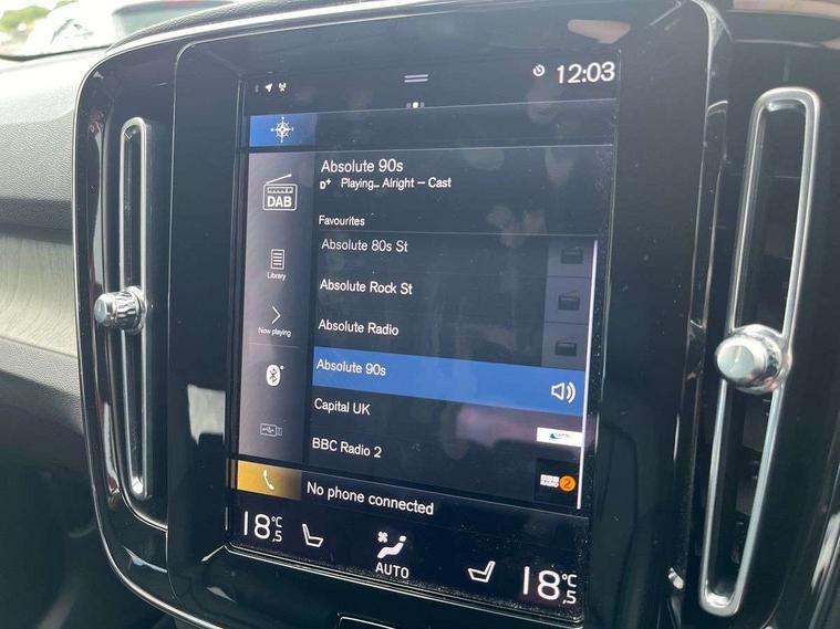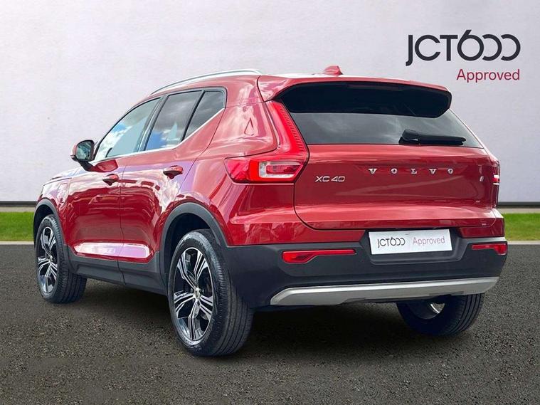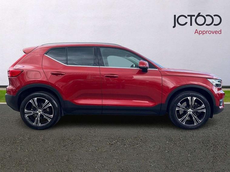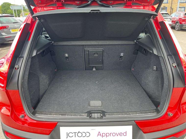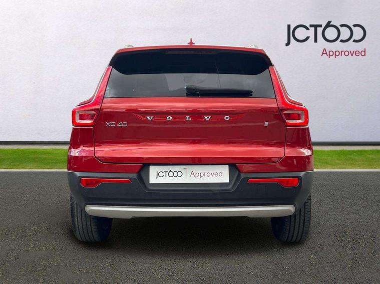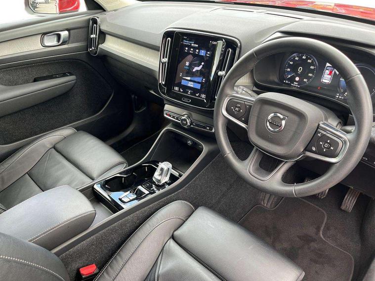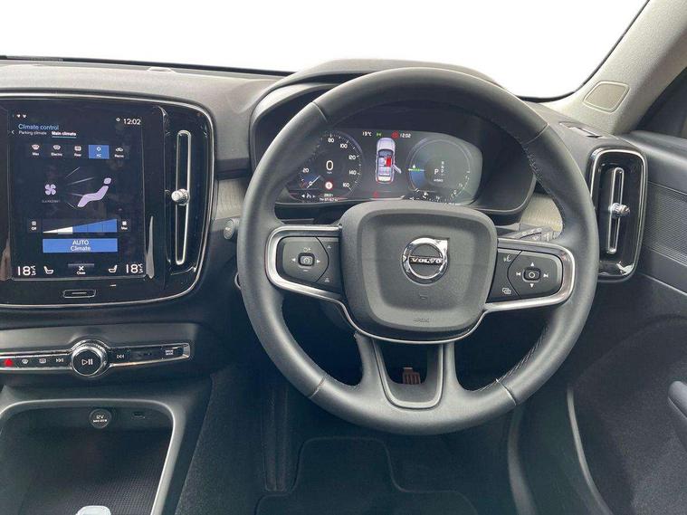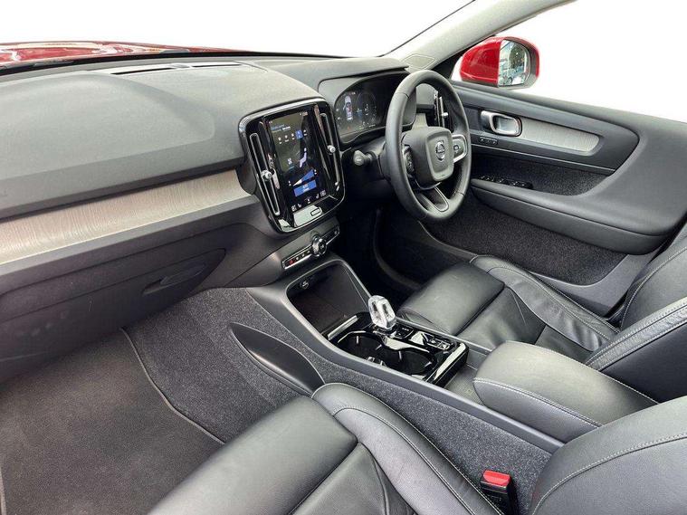 12.3" Active TFT crystal driver's instrument display, 9" centre console portrait touch screen, Adjustable steering wheel force, Bluetooth hands free telephone kit, Drive mode selector, E-call, Lane keep assist with driver alert control, Oncoming Lane Mitigation, Power operated tailgate, Sensus navigation with European mapping and traffic information, Speed limiter, Speed sensitive steering, Voice activated control for key functions, Volvo on call, 7m 10amp charge cable with 3 pin plug and 7m 1 phase 16amp type 2/mode 3 charge cable, Dynamic chassis, Electric front axle drive, Recharging port located in nearside front wing, DAB Digital radio, Low speed exterior sound speaker, Steering wheel mounted remote controls, Adaptive brake lights with high level LED brake lights, Auto dimming interior mirror, Automatic headlamp levelling, Automatic LED Headlights + Active high beam incorporating daytime running lights, Chrome window surround, Colour coordinated auto folding and heated power door mirrors, Front aluminium tread plates, Front and rear electric windows, Heated front windscreen, High gloss black front grille with chrome inserts, High gloss black sensus surround deco, High Gloss silver front and rear skid plate, Home safe and approach lighting, Integrated roof rails in silver, Rain sensor with automatic windscreen wiper activation, Rear side wing doors, Rear wiper, Roof antenna, Roof spoiler, Visible VIN plate, 12V socket in front tunnel console and luggage compartment, 2 zone electronic climate control and rear air vent, 3 seat bench in 2nd row, 3 Spoke tailored steering wheel with chrome trim, 60/40 versatile split folding rear seat, A-pillar parking ticket holder, Blond headlining, Bright metal luggage threshold, Centre console cupholders and storage, Floor mats, Front footwell illumination, Front headrests, Front reading light and theatre lighting, Front seat cushion extensions, Glovebox bag hook, Heated front seats, Height/reach adjustable steering column, Height/tilt adjustable driver's seat, High gloss centre tunnel deco, Illuminated glovebox, Illuminated luggage compartment, Illuminated vanity mirrors, Isofix attachments on outer rear seats, Leather faced upholstery, Load protection net, Multi directional lumbar support, Orrefors Crystal gear lever knob, Power driver seat with memory + exterior mirrors memory, Power passenger seat, Rear armrest / integral cup holders / storage tray, Rear coat hook, Single front passenger seat, Underfloor cargo storage, Vanity mirror with ticket holder, Lighting pack - XC40, Park assist pack - XC40, 3x3 point rear seatbelts, City safety includes pedestrian, cyclist and large animal detection and front collision warning with full auto brake, Drivers knee airbag, Dual stage driver/passenger airbags, Electronic parking brake with auto hold, First aid kit, Front and outer rear seatbelt reminder and pretensioners, Front seats SIPS airbags, Hill descent control, Hill start assist, Inflatable curtain, Passenger airbag cut-off device, Road sign information display, Run off Road Mitigation, Run off Road Protection, SIPS (Side Impact Protection System), Slippery road and hazard light alert, Stability and Traction Control with Spin control, Engine Drag Control and Corner Traction Control, Tyre pressure monitoring system, Vehicle deceleration control with Anti-lock Brake System, Electronic Brake Distribution and Emergency Brake Assist, Warning triangle, WHIPS whiplash protection system - front, Anti-theft alarm including immobiliser/volume sensor + level sensor, Care key with user defined top speed, Key integrated remote control central locking + fuel flap with deadlocking system and auto open/close power windows, Locking wheel nuts, Private locking for tailgate, Driftwood inlays,