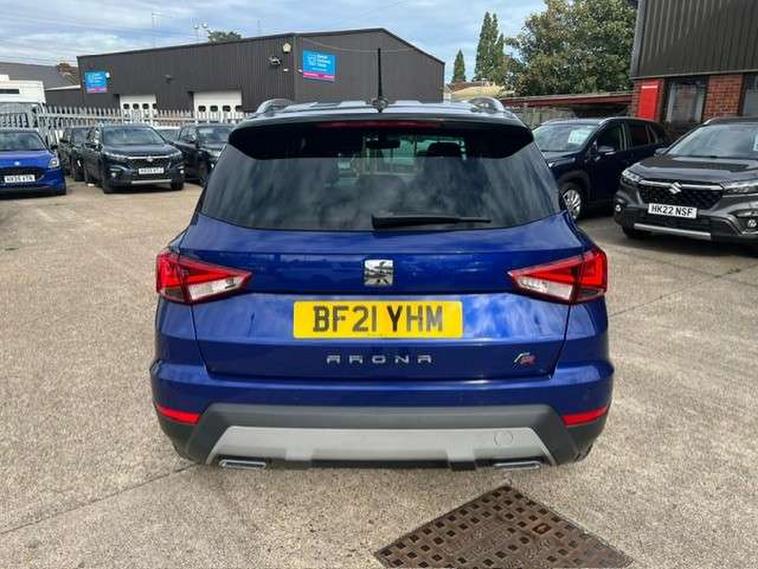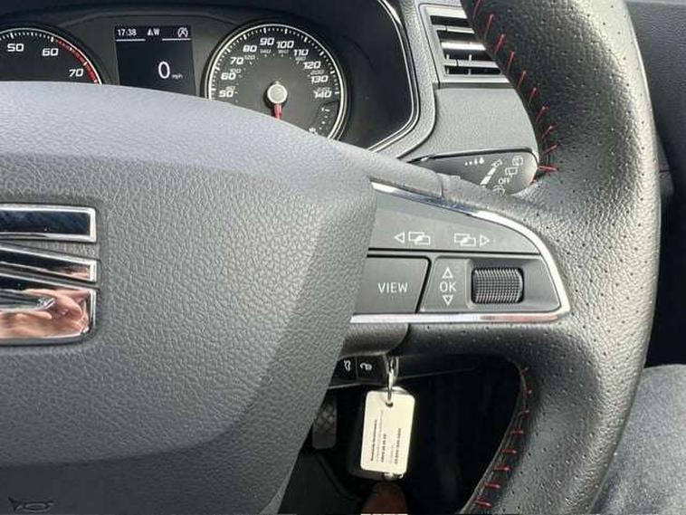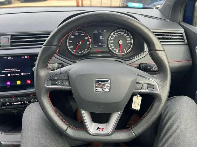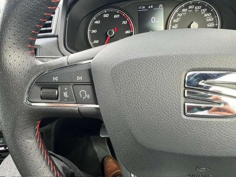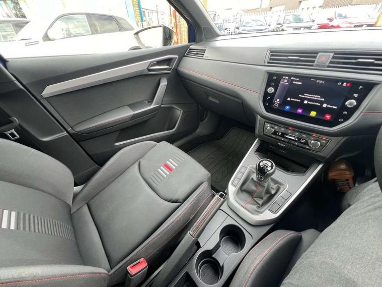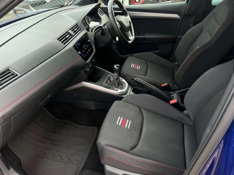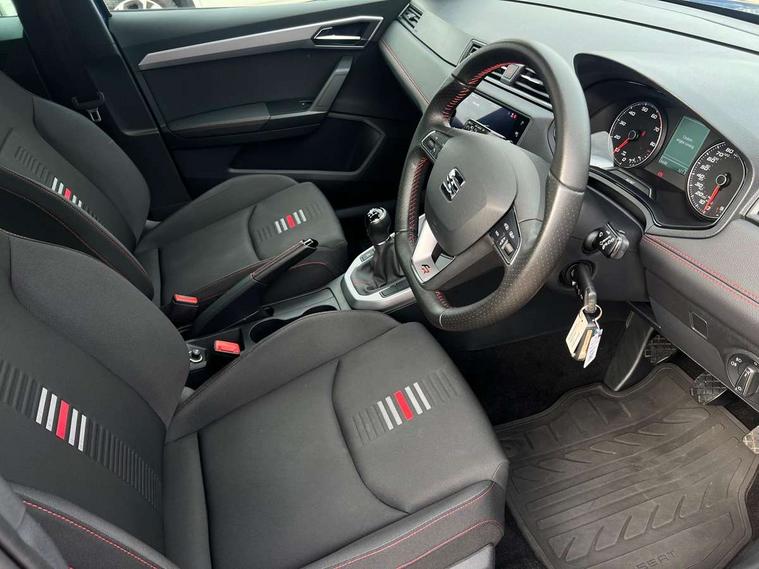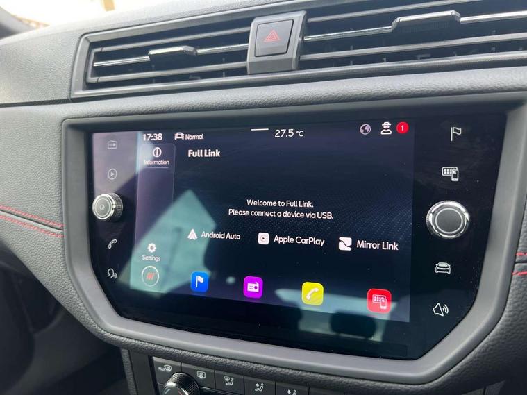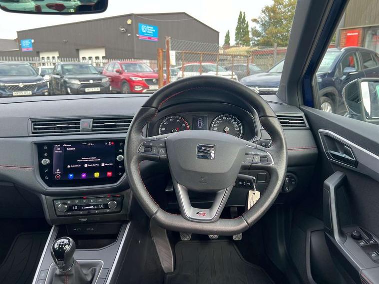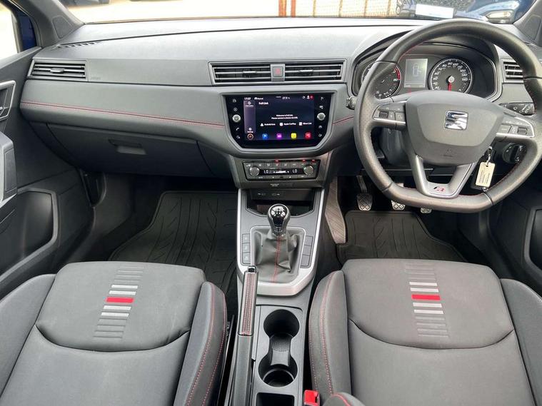 'Lights On' Reminder warning buzzer, Cruise control and speed limiter, Digital clock, Electric speed sensitive power steering, Full Link Smartphone Integration with Mirror Link, Apple Car Play, Google Android Auto with USB Type C cable for Apple and Android compatibility, Low fuel warning light, Outside temperature display, Rear parking sensor, RPM counter, Seat connect with safety, service, remote and online, SEAT Drive profile - Four different models normal-sport-eco-individual, steering response, throttle response, Trip computer, Sports suspension, 6 speakers, Bluetooth interface for hands free and audio streaming, DAB digital radio and AM/FM radio, Steering wheel mounted audio controls, Anti theft roof antenna, Auto dimming interior rear view mirror, Automatic activation of hazard warning lights, Automatic headlights, Body coloured bumpers, Body coloured door handle inserts, Chrome front grille frame, Chrome roof rails, Chrome window trim, Coming/leaving home lighting function, Dark tinted rear windows, Electric front/rear windows with one touch/auto up/down, Electrically adjustable, heated and folding door mirrors, Full LED headlights dipped and mainbeam + front and rear fog lights, LED daytime running lights, LED rear tail lights and licence plate lights, Protective side mouldings, Rain sensing wipers, Rear window wash/wipe, Roof colour door mirrors, Twin exhaust pipe styling hidden exhaust pipe, Visible VIN plate, Windshield wiper with intermittent control and potentiometer, 2 cupholders, 60/40 split folding rear seat, Aircare filter, Black interior roof, Double boot floor, Driver sunvisor with covered mirror + card holder, Dual zone climate control, Front courtesy light with front reading lights, Front sport seats, Gear shift indicator, Height adjustable front seats, Height/reach adjustable steering column, Illuminated boot, Instrument lighting with brightness control, Interior light in footwell, central console and door panel, ISOFIX points in outer rear seats with top tether anchorage points, Multi-colour ambient interior lighting, Nora cloth upholstery, Passenger sunvisor with vanity mirror, Perforated flat bottomed leather steering wheel/gear knob/handbrake with red stitching and FR logo, Two front and three rear height adjustable headrests, Connectivity pack plus - Arona, Interior chrome pack - Arona, 3 point seatbelts on all rear seats, ABS, Active front headrests, Child locks on rear doors, Driver and front passenger airbags with front passenger airbag de activation, front side and curtain airbags, Electronic stability control, Emergency Brake Assist (EBA) and front assist, Front and rear seatbelt reminder, Hill hold control, Multi-Collision braking, Tiredness recognition system, Traction control, Tyre pressure monitoring system, 2 folding remote keys with window open/close function, Alarm with back-up horn, Electronic engine immobiliser, Locking wheel bolts, Remote central locking + deadlocks, Tow away protection, Interior chrome line trim, Leatherette dashboard, 17" Dynamic alloy wheels,