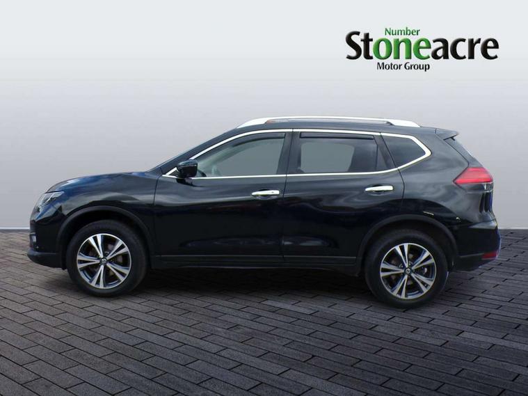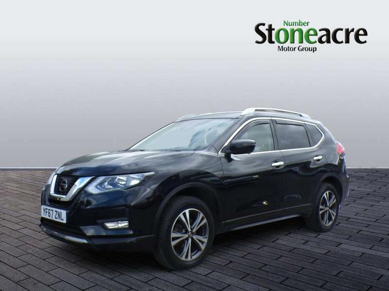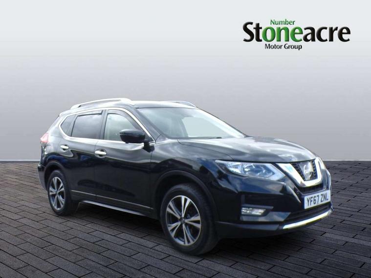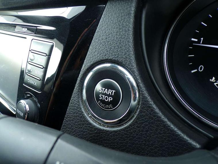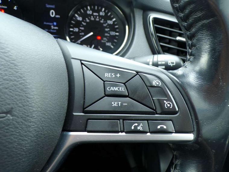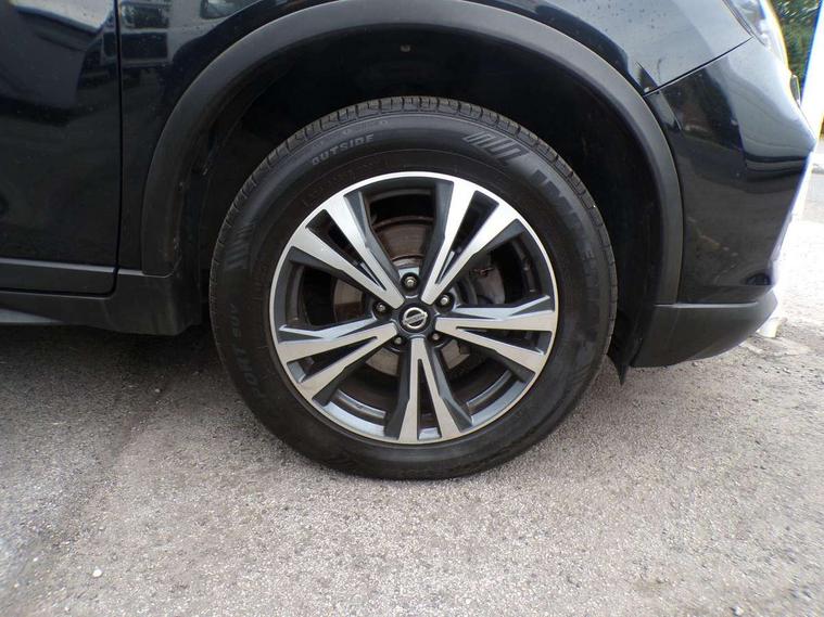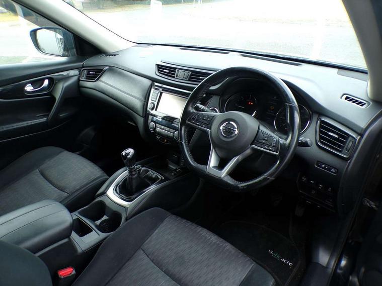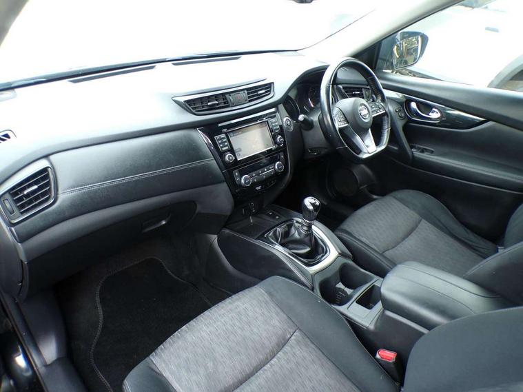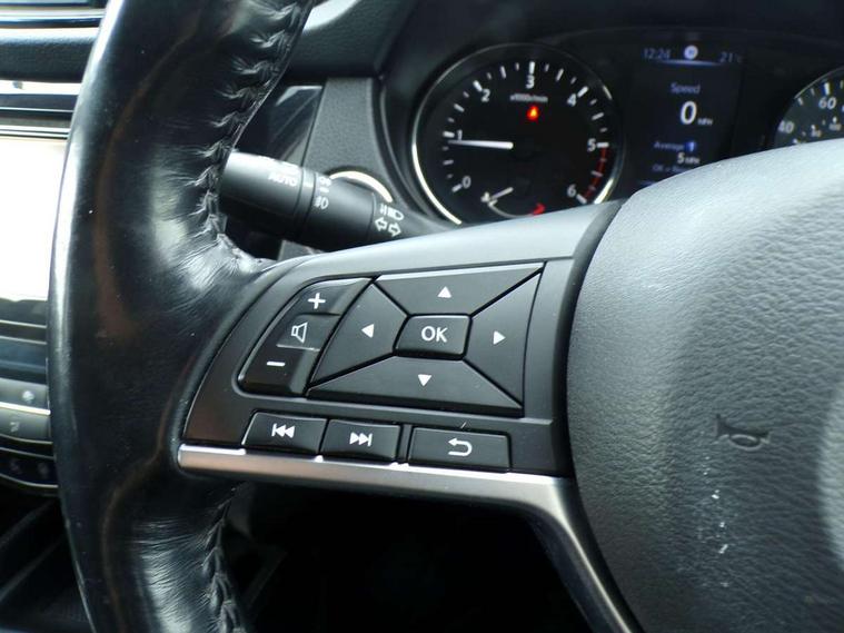 5" TFT driver information centre, Around View Monitor, Attention assist, Automatic tailgate opening, Bluetooth phone integration system, Cruise control + speed limiter, Engine start button, Front and rear parking sensors, Lane departure warning system, Nissan connect sat nav system, PAS, Traffic sign recognition, Trip computer, 6 speakers, Audio remote control in steering wheel, DAB Digital radio, Radio/CD, Smartphone apps, USB/aux input socket, Auto dimming rear view mirror, Automatic headlights, Automatic rain sensing wipers, Black honeycomb front grille, Body colour door mirrors, Chrome door handles, Chrome window surround, Electric folding door mirrors, Electric heated door mirrors, Front and rear power windows, Front fog lights, LED daytime running lights, Panoramic sunroof, Rear privacy glass, Satin silver roof rails, Shark fin roof aerial, 3 rear headrests, 60/40 split rear bench seat, Centre console storage box/armrest, Cloth upholstery, Configurable luggage board system, Dual zone climate control, Front and rear door pockets with bottle holders, Front cupholders, Height adjustable driver/front passenger seats, Height adjustable front headrests, Individual rear reading lights, Isofix child seat attachment, Leather steering wheel and gear knob, Lumbar support, Pollen filter, Rake/reach adjustable steering wheel, Rear armrest, Synthetic leather instrumental panel inserts, Synthetic leather knee pad, 3 point seatbelts on all seats, ABS, Child locks on rear doors, Driver and passenger airbags, EBD + Brake Assist, Electronic parking brake, ESP + traction control, First aid kit, Front and rear curtain airbags, Hill hold assist, Intelligent emergency braking with pedestrian recognition, Seatbelt warning, Tyre pressure monitoring system, Warning triangle, Alarm, Immobiliser, Intelligent Key, Remote central locking, Full size spare wheel,
