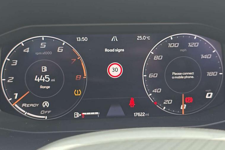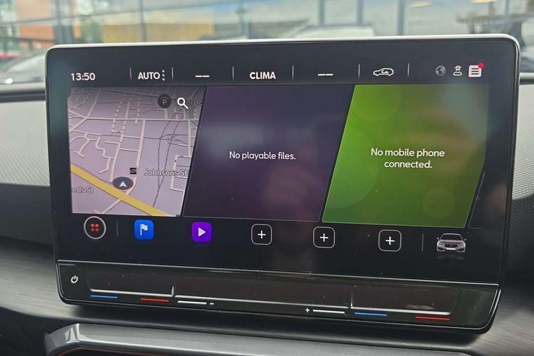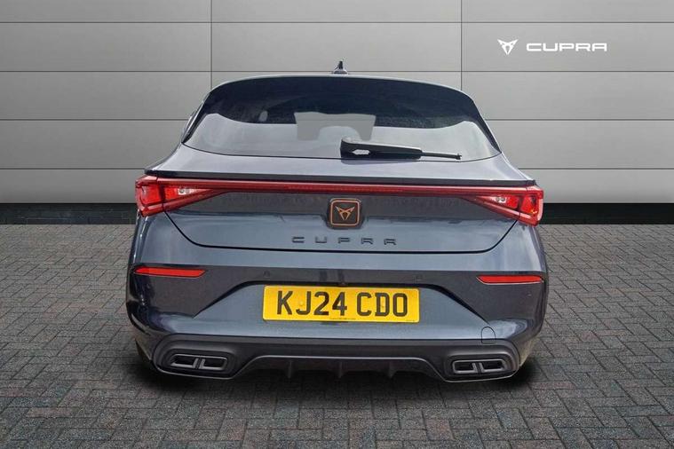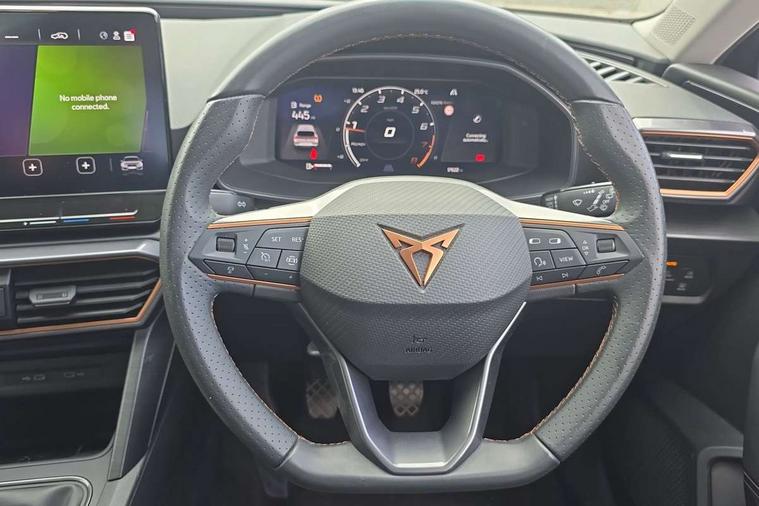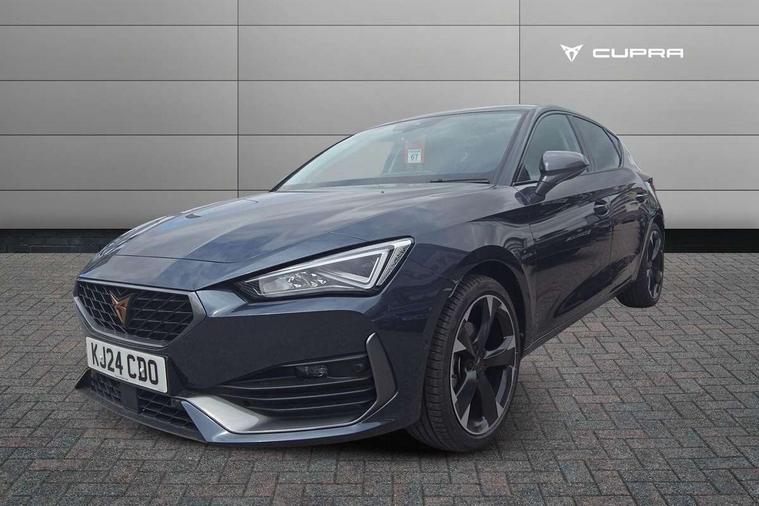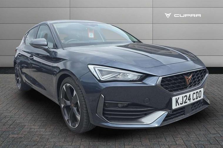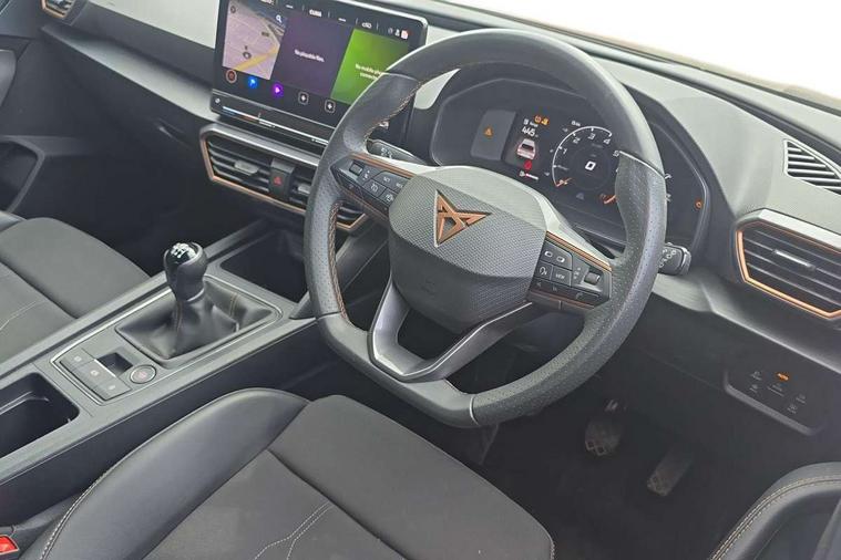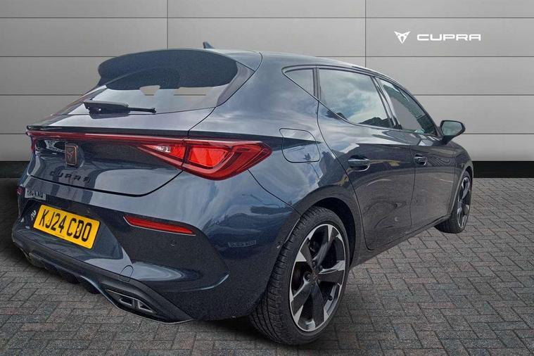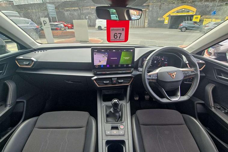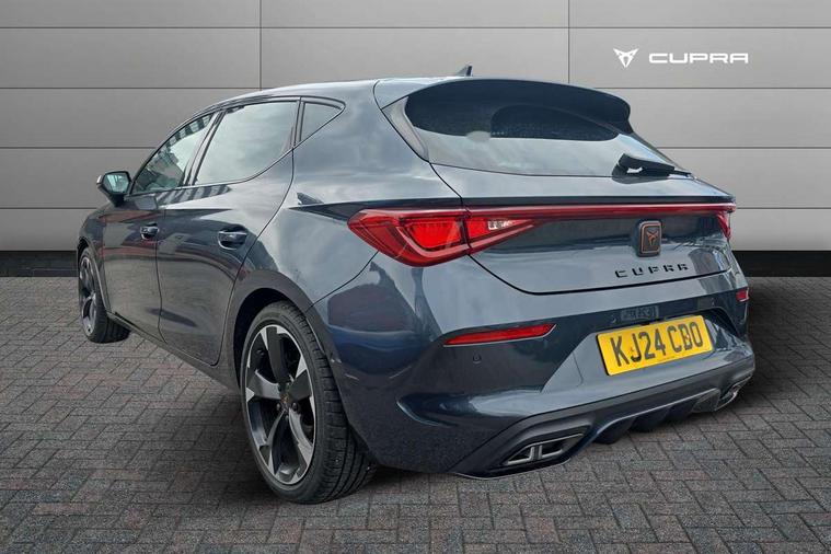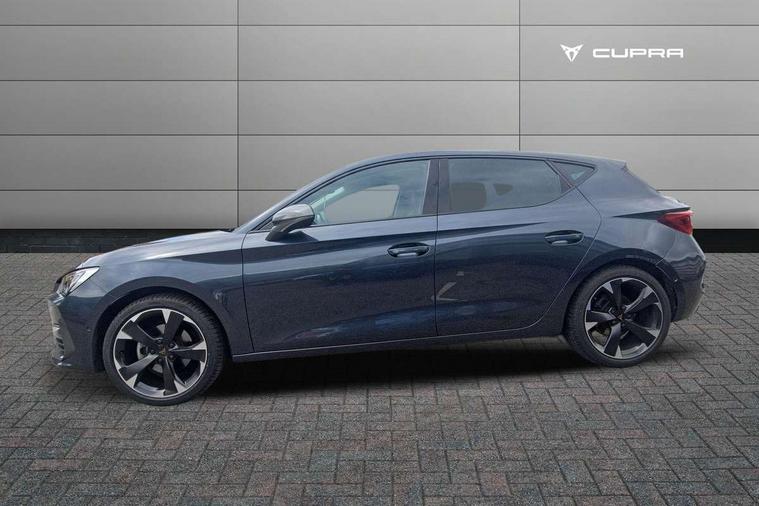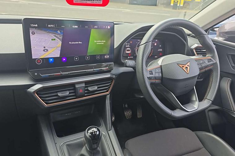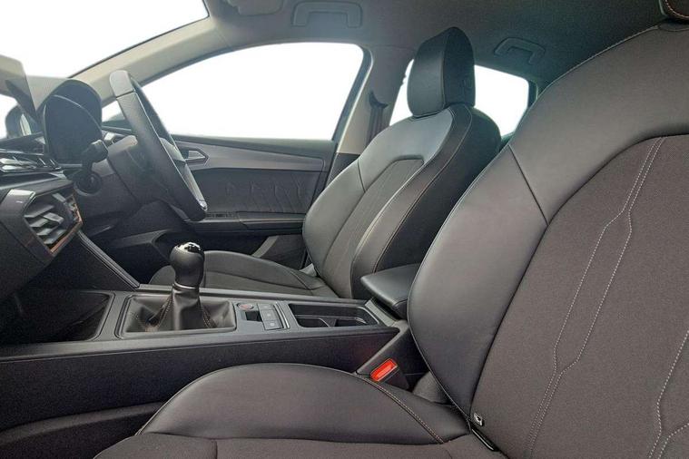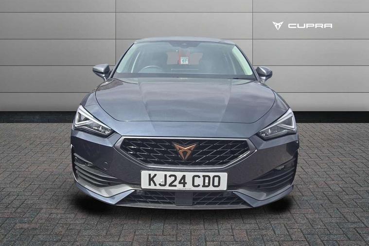 CUPRA drive profile selection with (Comfort/Sport/Individual), throttle response and gearshift mode, Digital cockpit, E-call, Electro mechanical speed sensitive power steering, Four x USB Type C ports (2 in front and 2 in rear), Front assist with forward collision warning braking reaction to vehicles, pedestrians and cyclists, Full link smartphone integration with Mirror Link, wireless Apple CarPlay and wired Google Android Auto, Lane assist, Lockable tailgate, Park assist (inc front/rear parking sensors), Rear view camera, RPM, trip computer, outside temp gauge, instrument light brightness, low fuel warning light, lights on reminder, gearshift indicator, Service interval indicator, Start/stop system with regenerative braking, Wireless phone charger, Sports suspension, Auxiliary input socket, Auto dimming rear view mirror, Body colour door handles, Body coloured bumpers, Cupra sports bumpers, Dark tinted rear windows, Electric front/rear windows, Electrically adjustable, heated and folding door mirrors, LED front fog lamps with cornering function, LED headlights with dynamic turn signals, tail lights, rear fog lights with rear coast to coast lighting, Rain sensing wipers, Rear diffuser with twin exhaust pipe on each side, Rear side wing doors, Rear wash/wipe, Separate daytime running light with automatic headlight control and coming home feature, Third brake light, 12v power supply in centre console, 3 seat bench in 2nd row, 5 headrests, 60/40 split rear bench seat with armrest, Ambient lighting with glovebox, footwell and single monocolour, Cupra Leather flat bottomed, perforated steering wheel, Driver/passenger manual seat height adjustment, Folding boot cover, Front and rear reading lights X 4, Front centre armrest, Front seats manual lumbar adjustment, Grey headlining, Height/reach adjust steering wheel, Illuminated interior front door sills, ISOFIX points in outer rear seats with top tether anchorage points, Jack and tool kit, PVC/Cloth upholstery with copper stitching, Single front passenger seat, Sports seats, Sunvisors with illuminated mirror, Three zone climate control, Media system plus with navigation pack - Leon Cupra, Safety and driving pack (M) - Cupra leon, 3 point seatbelts on all rear seats, ABS, Brake control system - ESC and brake booster, Child proof door locks, Cupra black brake calipers, Driver and front passenger airbags with front passenger airbag de-activation, front side and curtain airbags, Electronic parking brake, Extended safety system - seat belt tensioner, window closure and hazard lights, Hill hold control, Rear disc brakes, Seat belt reminder for front and rear seats, Tiredness recognition system, Tyre pressure monitoring system, Anti theft alarm system with interior monitoring in cab, backup horn and towing protection, KESSY Advanced - Keyless start, keyless entry, Locking wheel bolts, Chrome and copper interior detailing, 18" Machined sport black and silver alloy wheels with 92Y tyres,