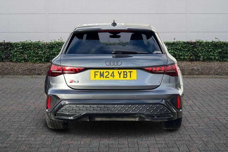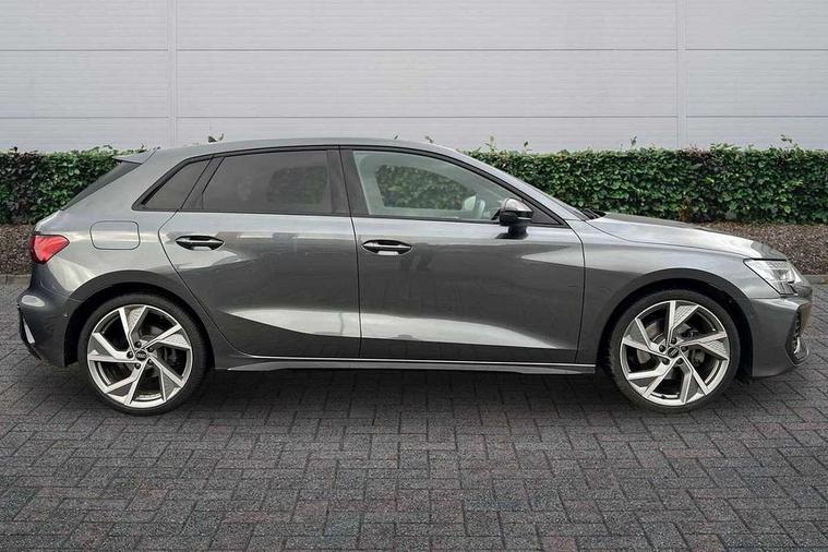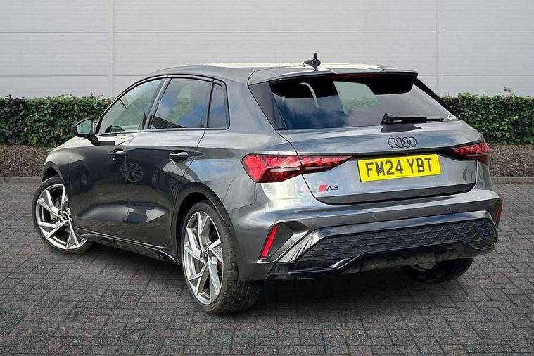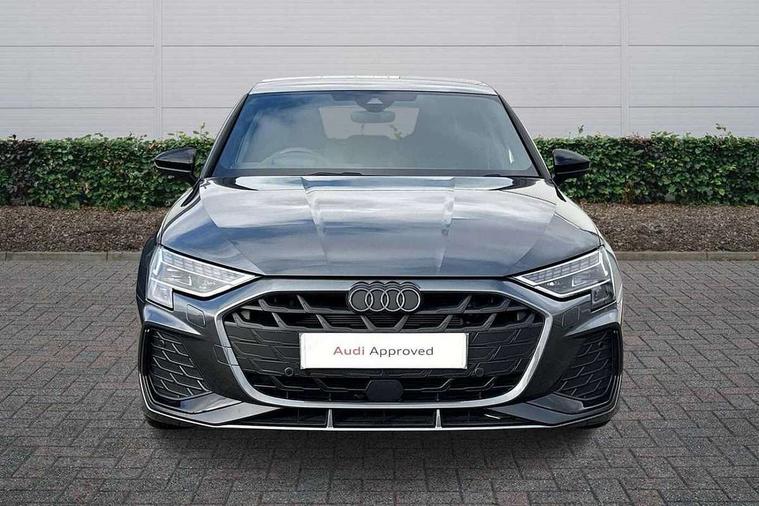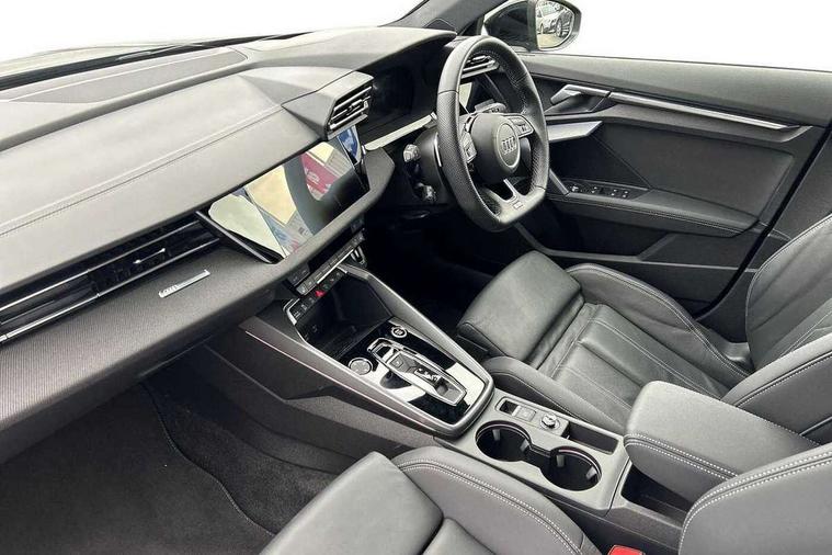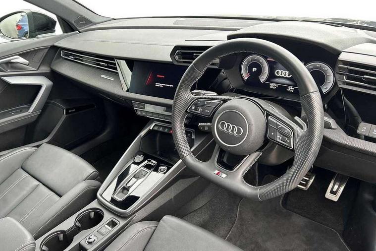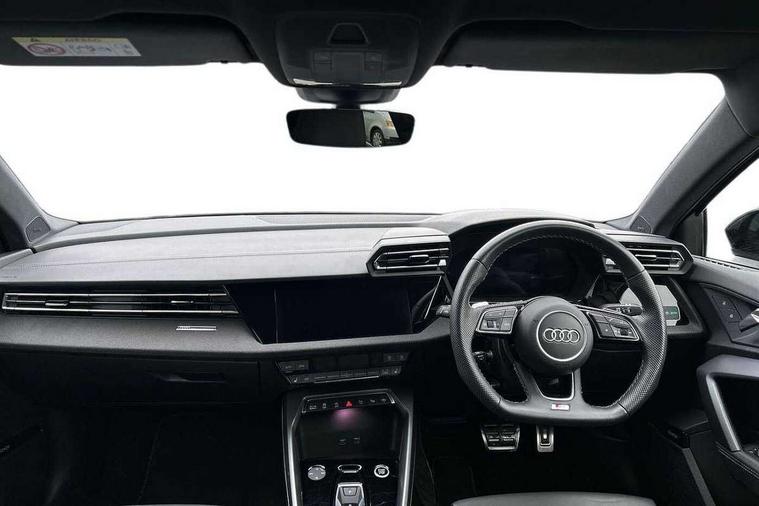 Adjustable speed limiter, Audi drive select, Audi smartphone interface with app store includes wireless Apple carplay, Android auto and Amazon alexa integration, Audi virtual cockpit plus - 12.3" full HD resolution dynamic digital instrument cluster, Automatic start/stop system with recuperation, Bluetooth interface, Camera based traffic sign recognition, Collision avoidance assistant, Cruise control, Distraction and Fatigue warning, e-Call (emergency call), Electromechanical power speed sensitive steering, Lane departure warning system, MMI Navigation Plus with high resolution 10.1" colour touch screen display, Park Assist with parking system Plus, Service indicator, Tailgate, Trip computer, Voice control system with natural language interaction, Sports suspension, Audi Phonebox light with wireless charging, Audi sound system - 10 loudspeakers including centre loudspeaker and subwoofer, DAB Digital radio, USB ports with charging function in the rear, Acoustic glass windscreen, Anthracite grey Audi rings (front and rear), Audi beam uses LEDs to project the Audi logo onto the ground as you exit your A3, Auto dimming frameless rear view mirror, Black accents front and rear bumpers, Black accents in the area of the Audi single frame grille, Black accents window trims strips, Electrically adjustable/heated/folding/auto dimming door mirrors with integrated LED indications + kerb view function for passenger side, Exterior model badging, Front electric windows, Heat insulating glass windscreen, Illuminated door sills with aluminium inserts at the front with S logo, LED 3rd brake light, LED daytime running lights, LED headlights with LED rear lights and dynamic rear indicators, Light and rain sensors, Privacy glass - dark tinted rear window, rear door and side windows, Rear electric windows, Rear side wing doors, Rear wiper, S roof spoiler, 12V socket and storage compartment in front centre console, 3 seat bench in 2nd row, 3 spoke flat bottomed leather multifunction sport steering wheel with gear shift paddles, 3-zone deluxe automatic air conditioning, 4 way electrically adjustable lumbar support for driver and front passenger, 40/20/40 split folding rear seat bench, Black cloth headlining, Front and rear centre armrest in artificial leather, Front and rear headrests, Front/rear floor mats, Heated front seats, Height and reach adjustable steering wheel, Manual boot compartment lid, Manually adjustable front seats, S badging on the steering wheel, Seat side bolsters, Single front passenger seat, Stainless steel pedals and front footrest in black, Twin leather upholstery with front sports seats S embossed logo, Aluminium interior elements pack - A3 Sportback, Multi-coloured LED interior lighting package - A3 Black Edition, 3x3 point rear seat belts, Driver and front passenger airbag with passenger airbag deactivation, Electronic Stabilisation Control (ESC) including ABS, ASR and EDL, First aid kit with warning triangle and 2 safety vests, Front side airbags with head airbags and interaction airbag, Hill hold assist, Pre-sense front with pedestrian and cyclist detection, Seatbelt monitoring, Tyre pressure loss indicator, Anti theft alarm, Anti-theft wheel bolts, Electronically operated child locks, Immobiliser, Remote control central locking, Inlays in black Impressum woven textile,