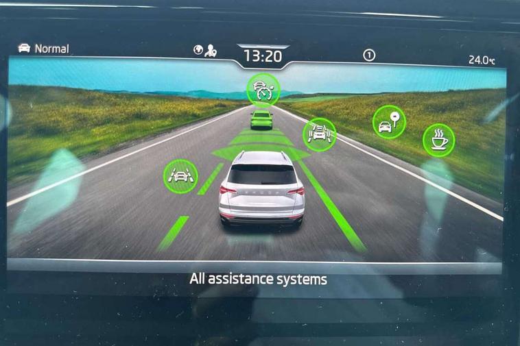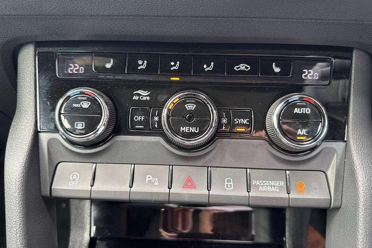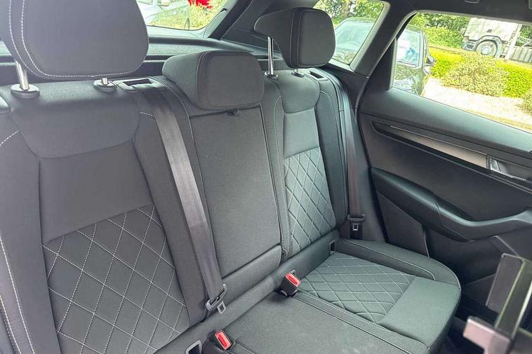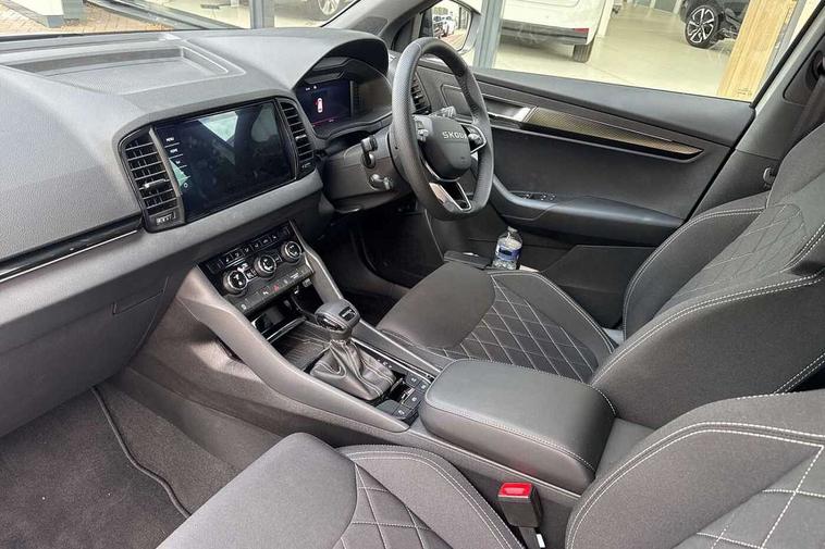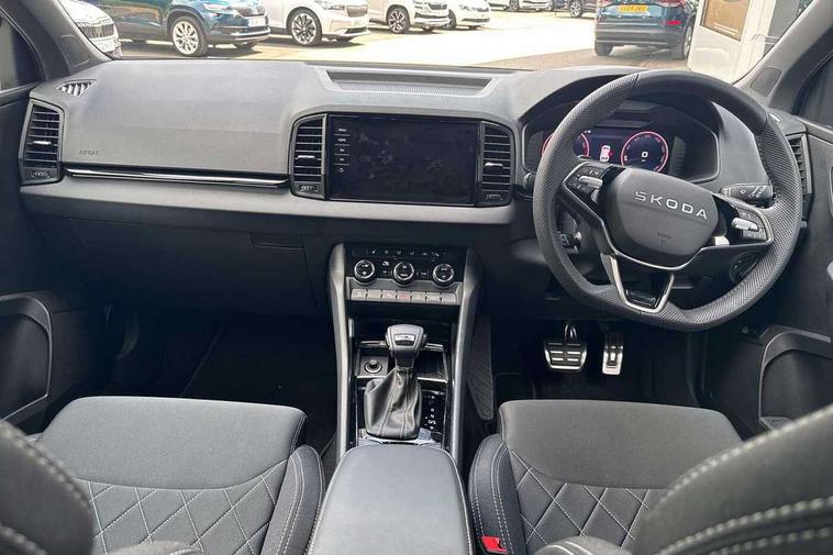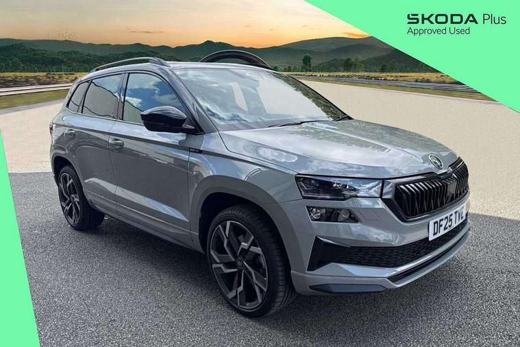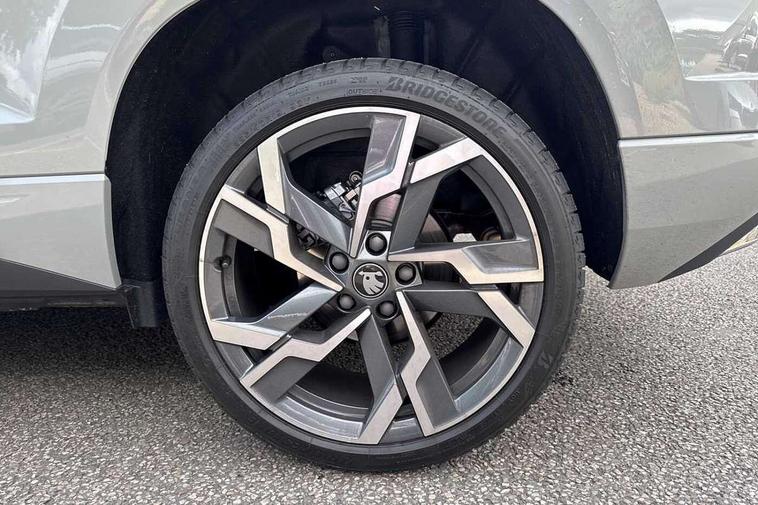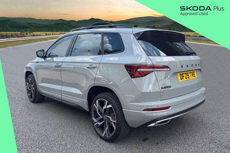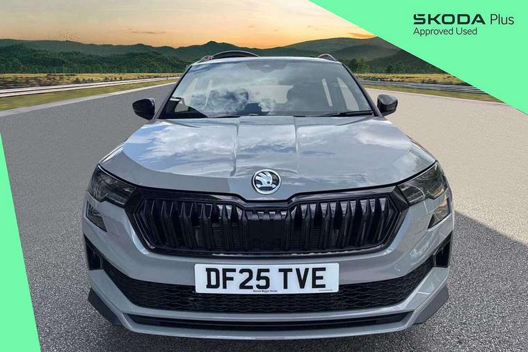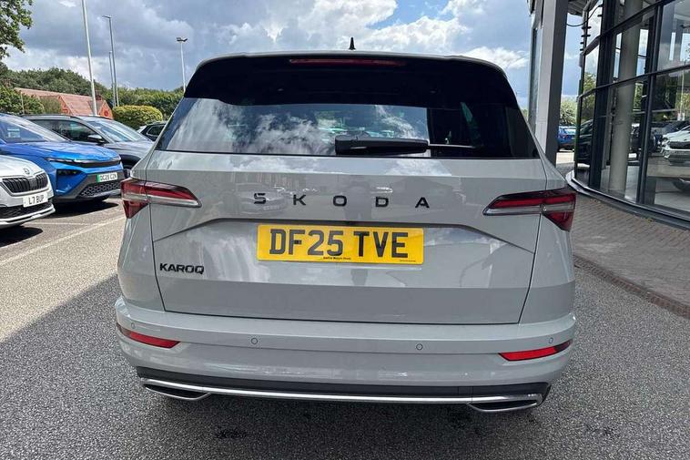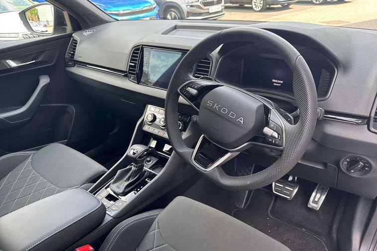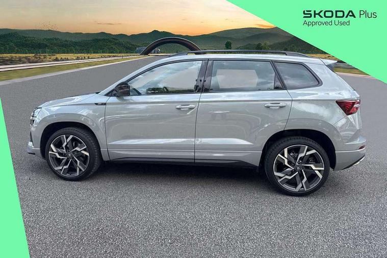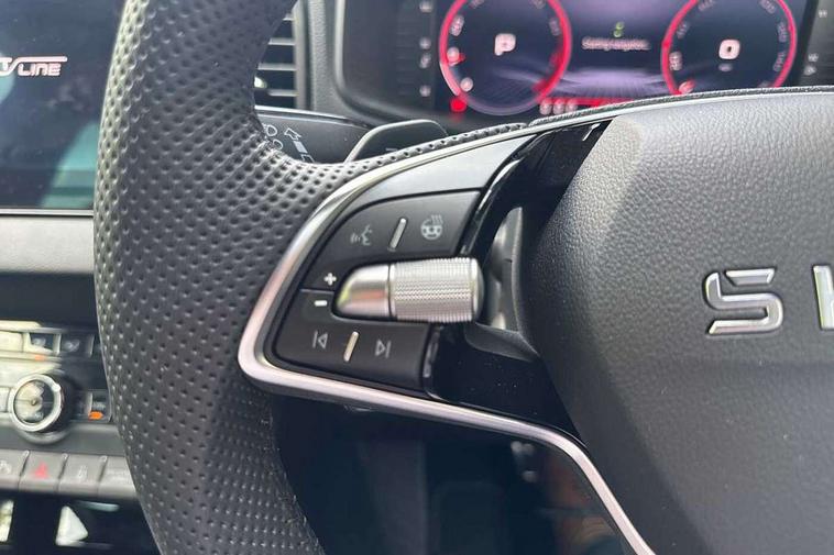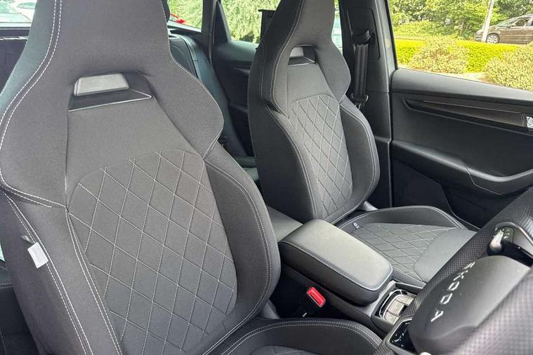 Advanced driver attention and drowsiness monitor, Emergency services call system, Outside temperature gauge, Sensor for driver assistance systems, Service interval indicator, SmartLink wireless for Apple and wired for Android, Start/stop system with regenerative braking, Traffic sign recognition, USB C Port x 2 in front centre console, Virtual Cockpit - 10.25" digital display, Virtual pedal with electrically operated boot door, Wireless smartphone charging, DAB radio with Bluetooth, USB connection, Acoustic glass, Aero front windscreen wipers with intermittent function, Auto dimming rear view mirror with light and rain sensors, Black door mirrors, Black electric window control buttons, Black radiator grille, Black roof rails, Body colour door handles, Electric front and rear windows with child proof lock, Extended rear roof spoiler, Front door steps with SportLine logo, Heated rear windscreen, LED daytime running lights, LED rear lights with high functionality welcome effect and dynamic indicators, Light assistant (coming/leaving home/tunnel light), Panoramic sliding sunroof, Plastic scuff plates in door apertures, Privacy glass, Protective door side sills in body colour, Rear diffuser, Rear side wing doors, Rear window wiper with washer system and intermittent control, Safety reflectors on front doors, Skoda lettering on tailgate in black, Sportline badge on front fender, Sports front and rear bumpers, Third brake light, Unique dark chrome design logo on alloy wheels, 1.5 litre bottle holders in driver and front passenger door panels, 12V socket in boot, 12v socket in front centre armrest with storage compartment and rear air vents, 2 x Tablet holder, 3 rear height adjustable headrests, 3 seat bench in 2nd row, 3 spoke sports leather heated multifunction steering wheel with DSG paddles, 4 foldable roof handles with rear coat hooks, Black floor carpet, Cargo elements in boot, Chrome inner door handles, Foldable hooks in the boot, Front head restraints, Height adjustable front three point seats belts with tensioners, Height/reach adjust steering wheel, Ice scraper, Illuminated glovebox, Illuminated luggage compartment, Isofix child seat preparation for front passenger seat, Isofix child seat preparation outer rear, Manual lumbar support for front seats, Pen holder, Pollen filter, Rear backrest release from boot, Rear boot cover, Rear package tray, Rear reading lights, Rear seats fixed folding and divided 60:40, Rubbish bin door, Safety vest holder, Single front passenger seat, Skoda lettering on steering wheel, Sportline decorative inserts, Storage box in upper central dashboard closed, Sunvisors with illuminated vanity mirrors, Textile floor mats, Ticket holder, Titan black interior ceiling, Umbrella under passenger seat, Under passenger seat storage compartment, Columbus pack - Karoq, LED Interior lighting pack with Skoda welcome logo - Karoq, Light Pack - Karoq, Non Smokers pack, Performance pack - Karoq, Winter plus pack with heated front and rear seats - Karoq, Automatic door unlocking in case of crash, Automatic fuel cut off in case of crash, Driver airbag, Electronic parking brake with auto hold function, Emergency rear braking signal, ESC (incl. ABS+MSR+ASR+EDS+HBA+DSR+RBS+MKB), Front side airbags, Head airbags, Hill hold control, Knee airbags, Passenger airbag with switch-off function, Pedestrian monitor, Seatbelt reminder signalisation and pretensioner for all seats, Three point seatbelts rear, Two tone horn, Tyre pressure monitor, Alarm with interior monitoring, back up horn and tilt sensor with safe function, Electronic engine immobiliser, Keyless entry and start/stop, Remote central locking with 2 remote folding keys, Black air vent surround, Black centre console, carbon door decor, Satin black dashboard, Satin black door trim, 19" Sagittarius anthracite alloy wheels, Anti-theft wheel bolts protection, Breakdown and tool kit,