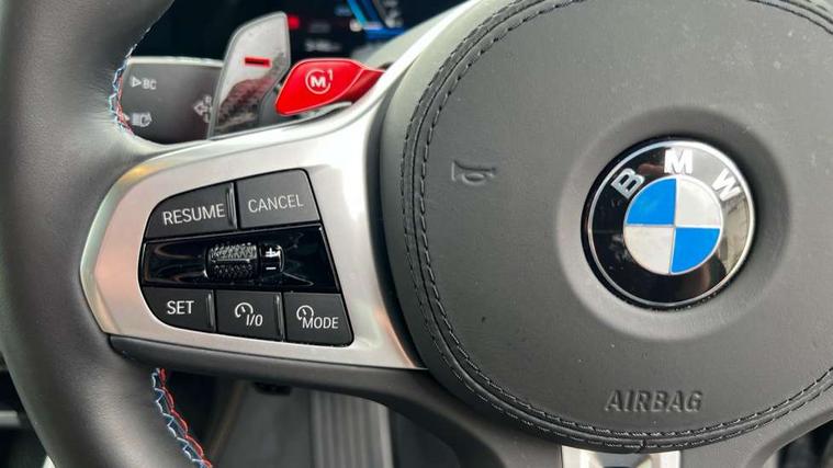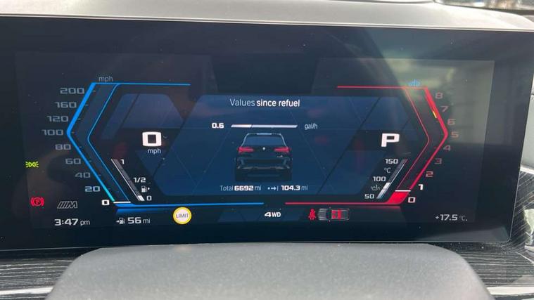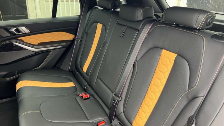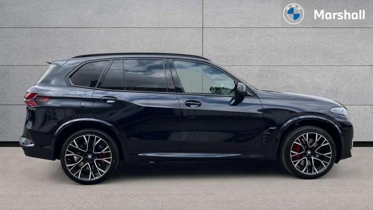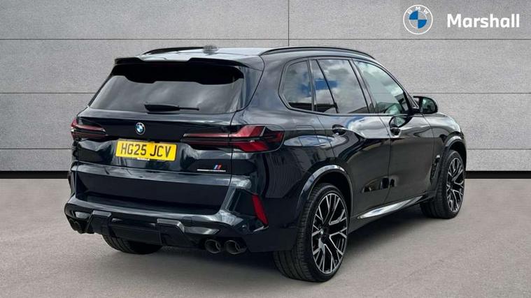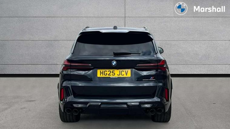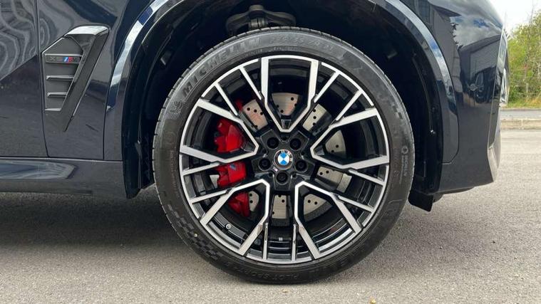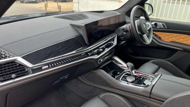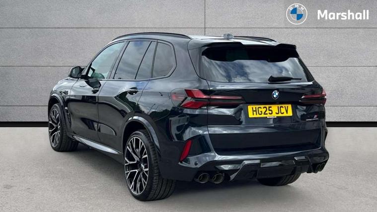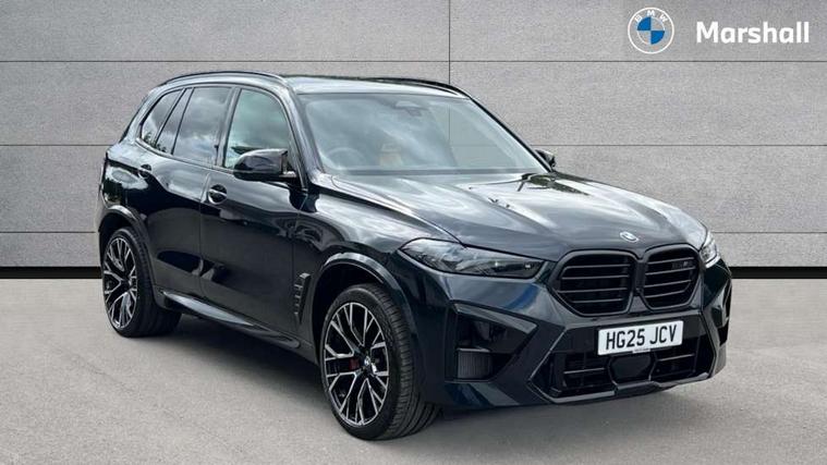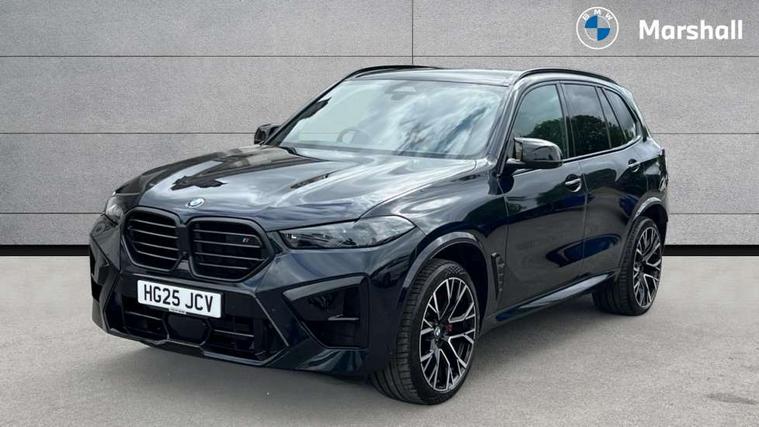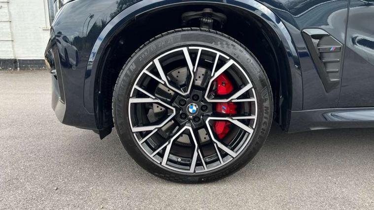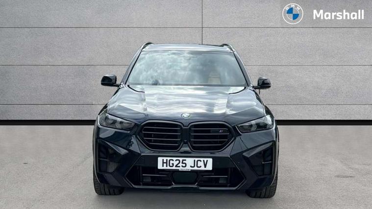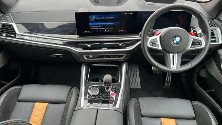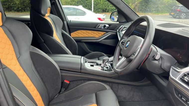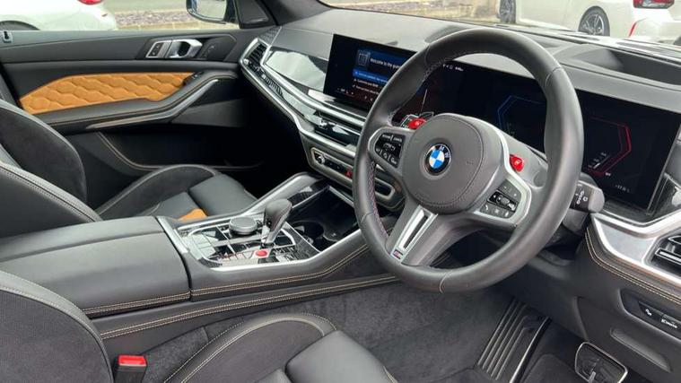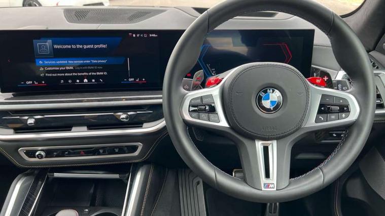 32GB hard disc drive (HDD) memory, Attentiveness assist, Automatic tailgate with seperately opening top hinged section, BMW ConnectedDrive online services, BMW Drive recorder, BMW gesture control, BMW legal emergency call, BMW Live Cockpit Pro with Head up display including 12.3" instrument display and 14.9" high resolution control display with navigation function, BMW Recovery system, BMW Teleservices, Brake force display, Brake pad wear indicator warning light, Condition based service - BMW service history, electronic service booklet, integrated owner's handbook, Electric power steering, Enhanced bluetooth hands free facility with Telephony wireless charging, Front/rear park distance control (PDC), iDrive controller with shortcut buttons, Infinity symbol with line graphic on reset of average consumption, Language version English, M drive buttons, M servotronic, Oil sensor for level and grade, On board computer inc. average speed, fuel consumption, liquid crystal Info display, journey computer, outside temperature display, personal profile, Recovery braking system, Run flat indicator, Service interval indicator, Stop/start button, Storage for wireless charging, Wi-Fi hotspot, 8 speed automatic with steptronic transmission including launch control and gearshift paddles on the steering wheel, Active M differential, BMW M TwinPowerTurbo 8 cylinder petrol engine, Double VANOS, High precision injection, M Adaptive suspension pro, M Sport differential, M xDrive system, Petrol Particulate Filter, Safety battery terminal clamp, Turbocharger with Valvetronic, BMW Personal eSim, DAB Tuner enables digital radio reception, Favourite buttons, USB connection, USB type A 1.5A in cupholder, USB Type C 3A in centre armrest, Adaptive LED Headlights, Automatically dimming rear view mirror, BMW Individual high gloss shadow line exterior trim, BMW Individual high gloss shadow line with extended contents, BMW individual lights shadow line, Body color M rear spoiler, Body colour bumpers, Body colour door handles, Body colour roof spoiler, Brake lights illuminate under normal braking, Door locking - after driving off to secure vehicle, Dynamic brake lights with LED technology, Exterior mirror base in black matt, Follow me home headlight function, Front and rear bumper system, Front and rear door sill strips, Front and rear electric windows with open and close fingertip control, anti trap facility and comfort closing, Heated windscreen washer jets, High beam assistant, High gloss black shadow line roof rails, Integrated direction indicators, LED daytime running lights, LED fog lights, LED Rear light with tail light, brake light and turn indicators, LED Reflectors, left and right, integrated in tailgate, M Sport exhaust system, M strake element with model designation, integrated in the Air Breather, M-specific Exterior mirrors, Rain sensor with automatic headlight activation and windscreen wiper control, Rear side wing doors, Rear wiper, Roller shutter, Sun protection glazing, Third brake light in rear spoiler, Trailer stabilisation logic, Under severe vehicle deceleration, Variable intermittent rear wash/wipe, Welcome light carpet, X5 M competition badging on tailgate high gloss black right finished, 12V - Power sockets with 2x centre console and 1x luggage compartment, 3 rear headrests, 3 seat bench in 2nd row, 4 Lashing eyes in boot, 4 zone control automatic air conditioning, 40:20:40 split folding rear seats, BMW ID, Child seat ISOFIX attachment with rear outer seats includes top tether, Compartment in front of cupholder, Driver + front passenger lumbar support, Electric adjustment of the upper section of the backrest with Illuminated M logo on the head restraint, Electrical steering column with adjustable height and length with activation and control on the steering column, Front and rear cupholders x 2, Front and rear door pockets, Front and rear side armrest integrated into door trim, Front footwell lights, Front reading lights, Gear selector lever and operation, Left and right bag hooks in luggage compartment, Light inside glove compartment, Lockable glove compartment, Luggage compartment floor panel with integral storage tray, Luggage compartment lighting, Luggage net, Lumbar support with height and depth adjustment in backrest, M Electric front sport seats with memory function, M sport leather steering wheel, M steering wheel with gearshift paddle switches made of CFC, Multifunction controls for leather steering wheel, Multifunctional hooks, Seat back with flap pocket, Securing rings in luggage compartment, Single front passenger seat, Storage bins on all doors, Storage space underneath the floor insert in luggage compartment, Storage tray and compartment with cover in centre console, Sunvisors with illuminated vanity mirrors, Toolkit located in luggage compartment, Vanity mirror lights, Velour floormats, Ambient light interior pack - X5 M/ X6M, Connected Package Professional - X5 M, Driving Assistant Professional Pack - X5 M, Expanded exterior mirror pack - X5 M/X6 M, Parking Assistant Professional Pack - X5M&X6M, Airbags - driver/front passenger, rear and side, first and second row seats head airbags, front passenger seat airbag deactivation + knee airbag, Anti-lock braking system (ABS), Automatic Stability Control (ASC), Black M sports seatbelts with coloured M seam for all seats, Brake drying, Brake energy regeneration, Brake fade compensation, Braking pre-tensioning, Child proof locking system in rear door, Cornering brake control (CBC), Crash sensor activating central locking release, hazard warning lights, fuel cut off, interior lighting + activation of safety battery terminal clamp, Deformation zones - front and rear with door reinforcements and bumpers up to 2.5 mph, DSC - Dynamic Stability Control, Dynamic brake control, Dynamic Traction Control - DTC, Electromechanical parking brake with automatic drive away release and auto hold function, Electronic brake force distribution, Front and rear 