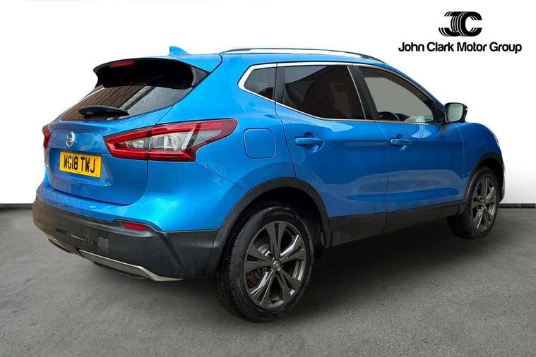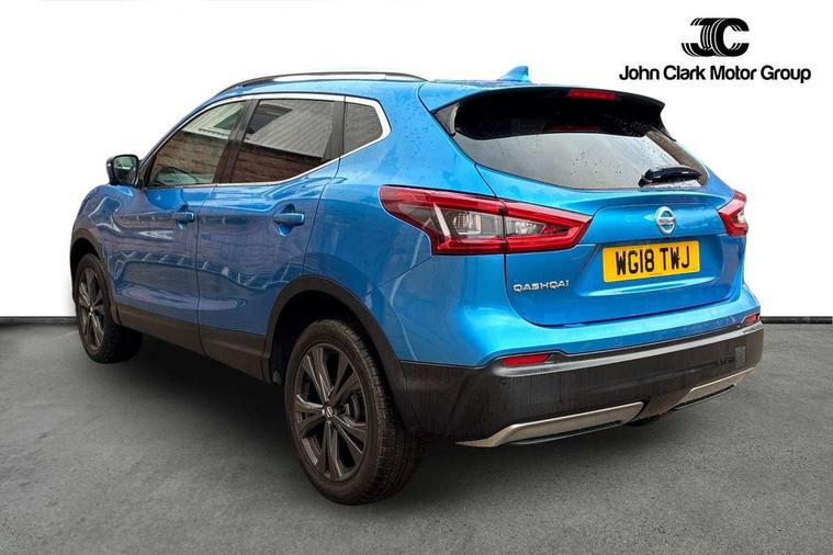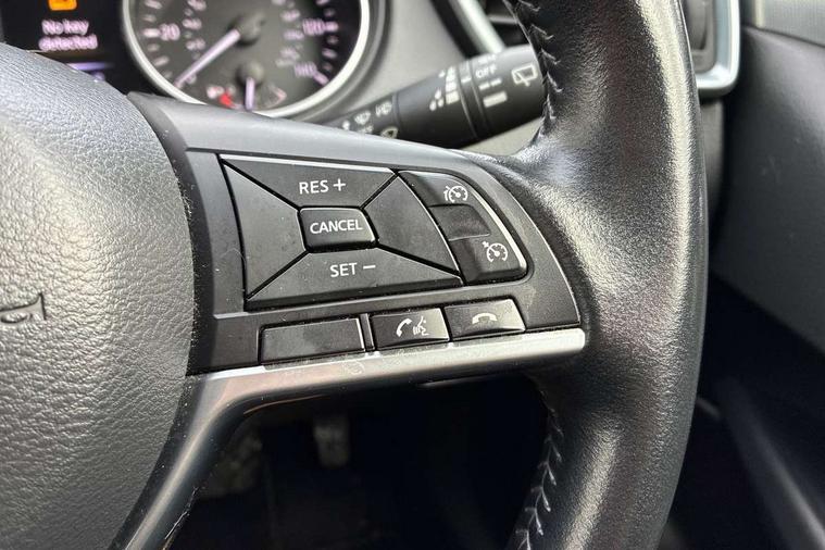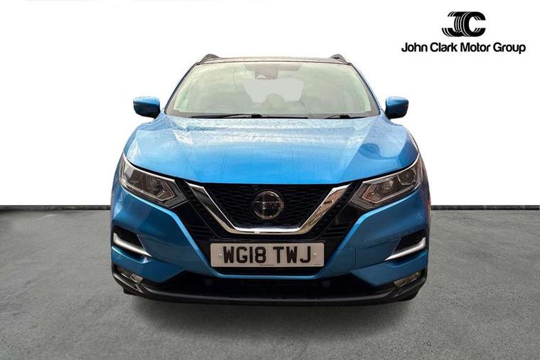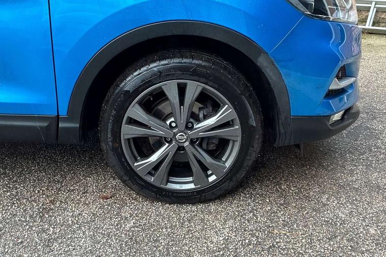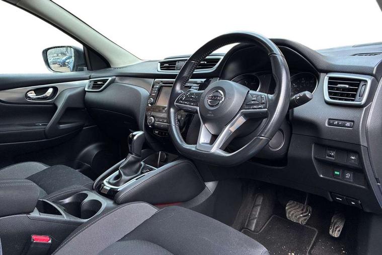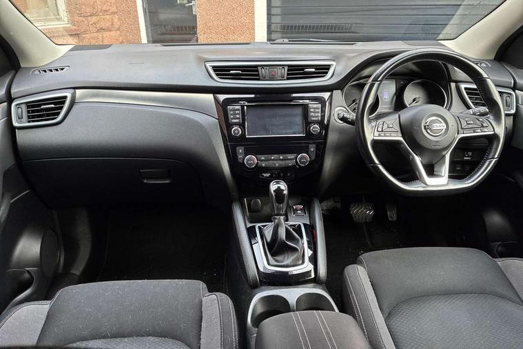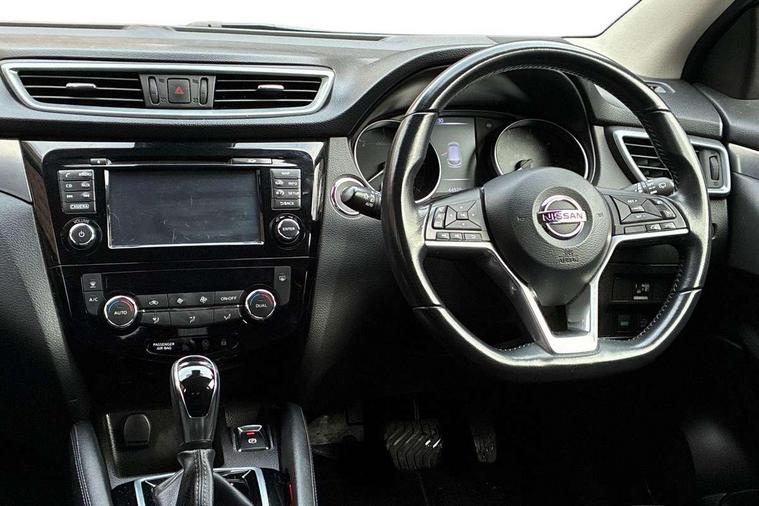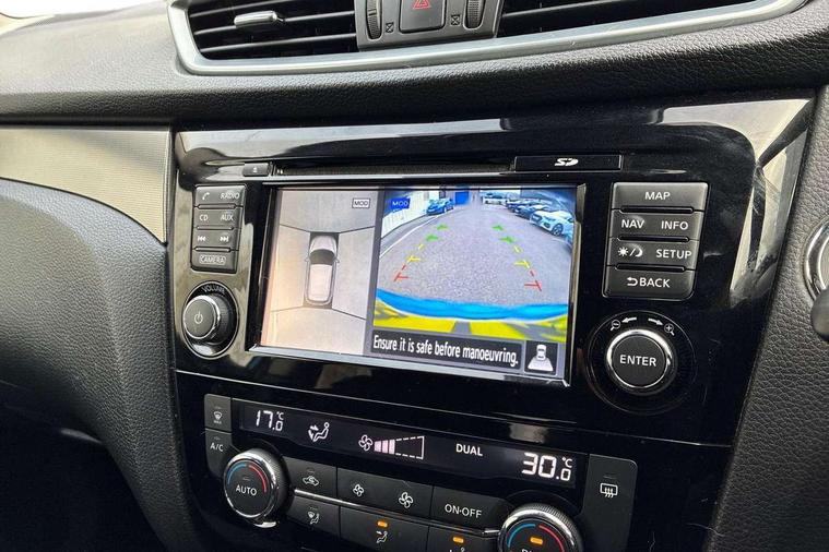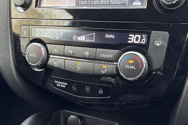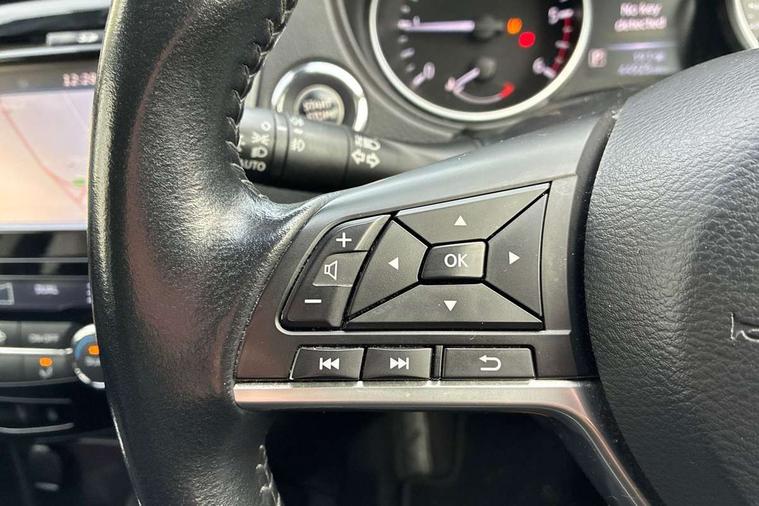 5" TFT driver information centre, Around View Monitor, Bluetooth phone integration system, Cruise control, Electric speed sensitive power steering, Front and rear parking sensors, Lane departure warning system, Nissan connect sat nav system, Outside temperature display, Push button starter, Rear view camera, Service interval indicator, Speed limiter, Traffic sign recognition, Trip computer, Diesel particulate filter, 'Shark fin' mobile antenna, 6 speakers, DAB Digital radio, Radio/CD, Smartphone apps, Steering wheel mounted audio controls, USB/aux input socket, Automatic headlamp activation, Body colour bumpers, Body colour door handles, Body colour door mirrors, Chrome window surround, Electric folding and heated door mirrors, Front fog lights, High beam assist, Interior mirror with auto anti dazzle, LED indicators in door mirrors, Matt silver roof rails, One touch electric front/rear windows, Privacy glass, Rain sensor windscreen wipers, Rear roof spoiler, Rear wiper, 2 X front 12v power sockets, 60/40 split folding rear seat, Ambient interior lighting, Centre console with armrest, Chrome interior door handles, Cloth upholstery, Configurable luggage board system, Driver + front passenger lumbar support, Dual zone climate control, Front and rear door pockets with bottle holders, Front headrests, Front seat belt pre-tensioners with load limiters, Height adjustable driver's seat, Height adjustable passenger seat, Illuminated electric window switch, Isofix child seat preparation, Leather gearknob, Leather interior door handles, Leather knee rest, Leather steering wheel, Luggage compartment lighting, Parcel shelf, Pollen filter, Rake/reach adjustable steering wheel, Rear armrest with 2 cupholders, Rear headrests, ABS, brake assist and EBD, Child locks on rear doors, Curtain airbags, Driver/front passenger airbag, Electronic parking brake, ESP + traction control, Forward emergency braking, Front passenger airbag deactivation, Height adjustable front seatbelts, Hill start assist, Seatbelt warning, Side airbags, Three 3 point rear seatbelts, Tyre pressure monitoring system, Alarm, Immobiliser, Intelligent Key, Remote central locking, Graphite interior trim, 18" Bi-colour alloy wheels, Tyre puncture repair kit,