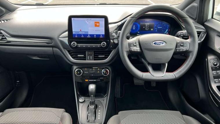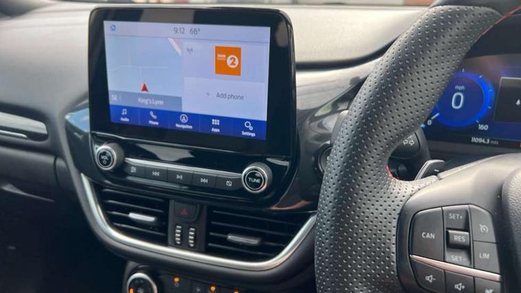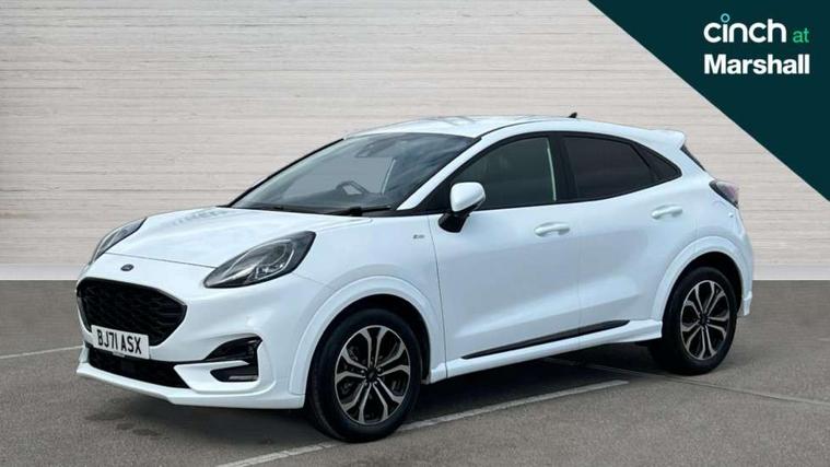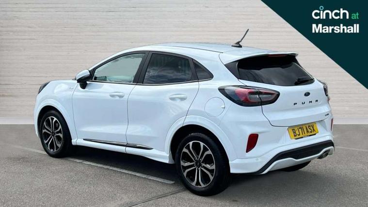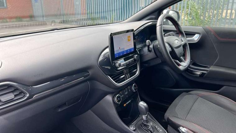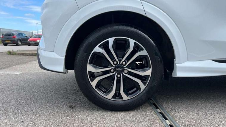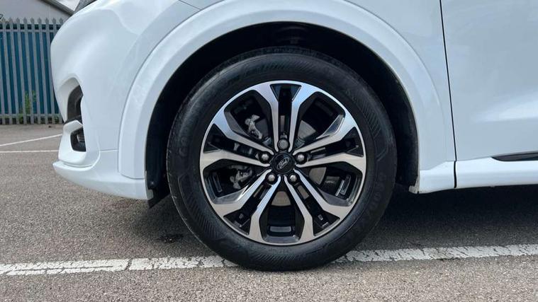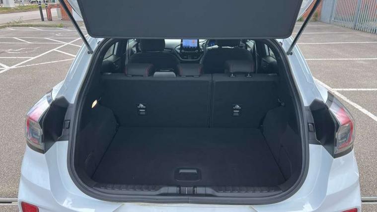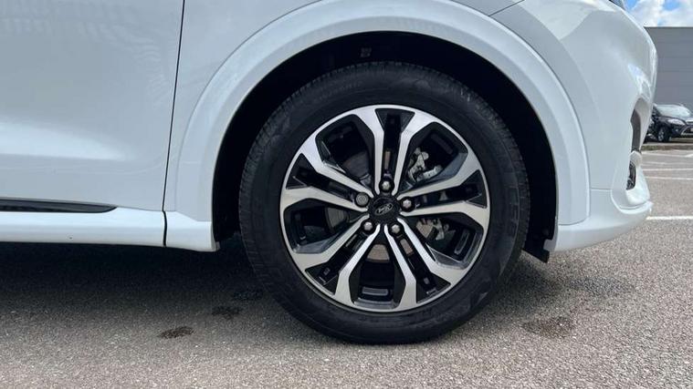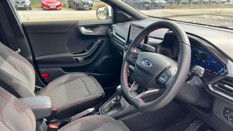 Cruise control, Ford easy fuel, Full digital 12.3" instrument cluster, Power assist steering, Power start button, Selectable drive modes(Normal, sport, Eco, trail, slippery), Automatic rain sensing wipers, Body coloured door mirrors, Front fog lights with cornering lights and LED rear lamps, Power foldable heated door mirrors with puddle lamps, Projector headlamps with LED day time running lights, Quickclear heated windscreen, Rear wiper, ST-Line body kit with large rear spoiler wth sports suspension, Centre console with armrest and stowage, Cloth upholstery, Driver seat height/lumbar adjust, Ford megabox extended bootspace, Front and rear floor mats, Front and rear head restraints, Manual air conditioning, Ford SYNC 3 navigation pack - Puma, 3 rear seatbelts, Electronic stability control (ESC) and hill start assist, Pedestrian/cyclist detection & post-collision braking, Tyre pressure monitoring system (TPMS), Thatcham alarm,