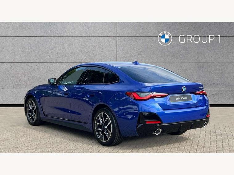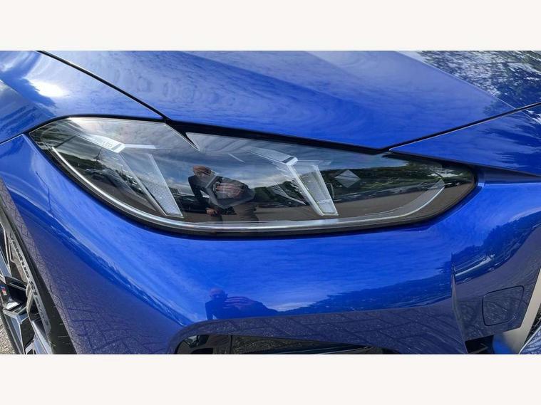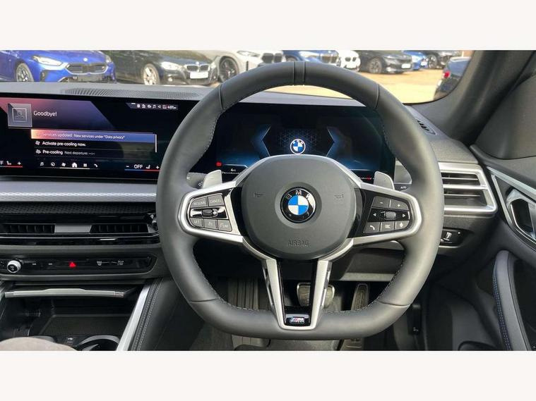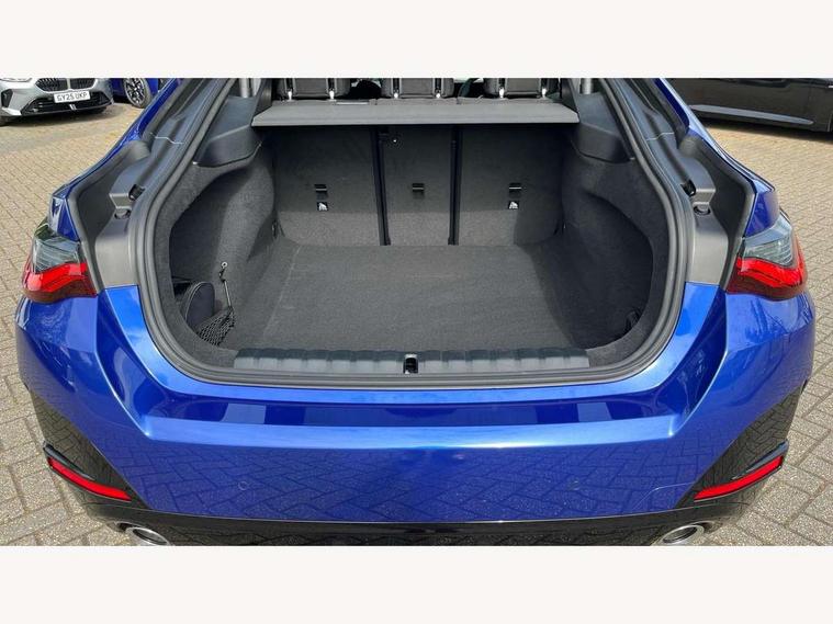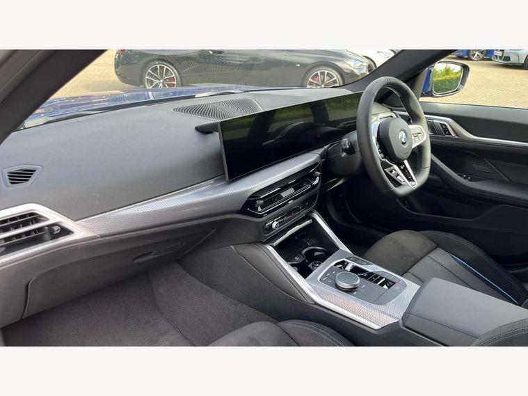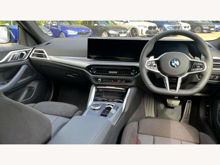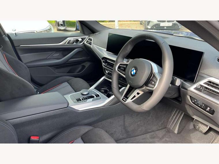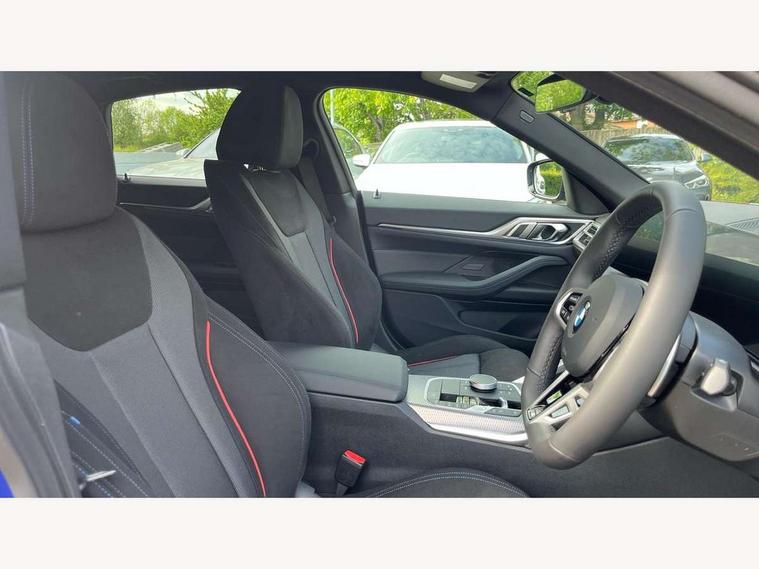 Active guard plus, Attentiveness assist, Auto start-stop, Bluetooth hands free facility with USB audio interface with audio streaming, BMW ConnectedDrive online services, BMW iDrive controller on centre console, BMW Live Cockpit Plus Nav-12.3" instrument&14.9" control Widescreen curved display/Intelligent Voice Assist/iDrive touch/Access 3rd party app/4G LTE, BMW service history, BMW Teleservices, Brake pad wear indicator in front and rear, Check Control warning system for monitoring of lights and door/luggage compartment open warning, Condition based service, Electric bootlid, Electric power steering with Servotronic steering optimised at all speed ranges, Gearshift time display in manual mode, Instrument cluster with speedometer with mph readout, tachometer, fuel gauge and oil temperature gauge, Integrated owners handbook, Language version English, Oil sensor for level and grade, warning by check control system, On board computer - average speed, fuel consumption, outside temp display with acoustic warning, clock/date, service interval, odometer/trip meter, Optimum shift indicator, Run flat indicator, Shifting point display, Variable sport steering, 8 speed automatic steptronic transmission with gearshift paddles, Balanced 50/50 weight distribution, Double joint spring strut front axle, Double VANOS, Drive performance control - ECO PRO, comfort and sport modes, High precision injection, Low centre of gravity, Petrol Particulate Filter, Stroke dependent dampers, VALVETRONIC engine management, 1x USB type A with data transfer and 1.5 Amp charging function in the centre console, 1x USB type C with 3 Amp charging function in the front centre armrest, DAB tuner, Electronic service booklet, Personal eSim, Acoustic glazing, Automatic headlight beam throw control with load dependent regulating reaction, dynamic compensation of braking dive and acceleration squat, Automatic windscreen wipers and automatic headlight, Automatically dimming electrochromatic rear view mirror, BMW emblem on engine compartment lid and tailgate, BMW radiator grille with mesh grille, end face of the nuggets in aluminium matt and frame in chrome matt, Body colour fuel filler flap, Body colour roof fin, Bonnet and tailgate badge, Brushed aluminium inserts in the front door sill finishers with BMW designation, Door sill strips, Dynamic brake lights, Electric windows - front and rear, with open/close fingertip control, anti trap facility and comfort closing function all round, Exterior mirrors - electrically folding with anti-dazzle, Fading support, Follow me home headlights, Front and rear bumper system, Front apron plastic in body colour, Green tinted heat protection glazing, High gloss shadow line exterior trim, Illuminated bow type door handles in body colour drivers side with door lock, Interior rear view electrochromatic mirror with automatic anti dazzle function, LED 3rd brake light, LED daytime running lights, LED front fog lights, LED front indicators, Licence plate panel integrated into front bumper and tailgate, Lightweight engineering, Low and high beam headlights in Bi-LED, M designation on front side panels, left and right, M rear boot spoiler, One piece front bumper cover including towing eye cover in body colour, Preparation for high beam assistant, Rear side wing doors, Rear wiper, Reversing light, Side frame trim strip black matt, Two part LED tailights in L-shape with components in smoked glass, brake light, LED turn indicator and rear fog light, Visible exhaust tailpipe finisher, Visible VIN plate, Welcome lights in interior and door handle area, Widened track and increased camber values for max transverse dynamics, agility and steering precision, Window recess finisher strip in matt black, Windscreen wipers with integrated heated washing jets, 12V power socket in front centre console, 2 front cupholder in centre console with clamping elements and matt black inlay, 3 rear headrests, 3 seat bench in 2nd row, 3 spoke flat bottom M sport leather multifunction steering wheel, 3 zone automatic air conditioning, 4 pieces lashing eyelets in luggage compartment, 40:20:40 split folding rear seat and rear centre armrest with two cupholders, Anthracite headlining, Armrest integrated in front and rear door trim + front centre console armrest, Battery in luggage compartment, BMW ID, Four grab handles integrated in roof lining, Front and rear door pockets, Front and rear reading lights, Front footwell lights, Heated driver and front passenger seats, Height adjustable front headrests, Height adjustable mechanically and infinitely variable steering column, Illuminated armrest storage compartment, Illuminated glove compartment with separate small compartment, Luggage compartment light, Luggage compartment seprating net on side trim left/right, Bag hook, 12V socket, TTH button, USB C charging in rear, Folding compartment on driver side, Make-up mirror lights, Single front passenger seat, Storage compartment in rear centre console, Sunvisors with illuminated vanity mirrors and ticket pocket, Through load system, Toolkit located in luggage compartment, Velour front floor mats, Ambient lighting pack - 4 Series, Connected professional package - 4 Series, M sport exterior styling pack - 4 Series, Park assist pack - 4 Series, 3 point seatbelts on all seats, Battery safety cut-off, BMW emergency call, Brake energy regeneration, Braking pre-tensioning, Child locks, Child seat ISOFIX attachment for the two outer rear seats, Coasting in idle in ECO PRO mode, Cornering brake control (CBC), Crash sensor activating of airbags, Unlocking doors, hazard warning lights, fuel cut off, interior lighting+activation of safety battery terminal clamp, Driver and front passenger side airbags, integrated in the door side seat backrest bolsters for all seat variants, Driver/Front Passenger airbags, Dry braking, Dynamic brake control, Dynamic stability control + (DSC+) - Anti-lock Braking System (ABS) with brake assist and cornering brake control 