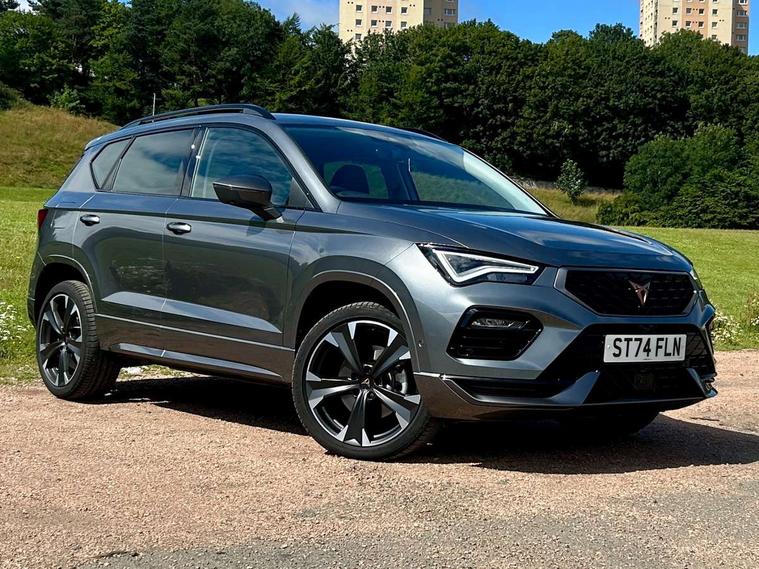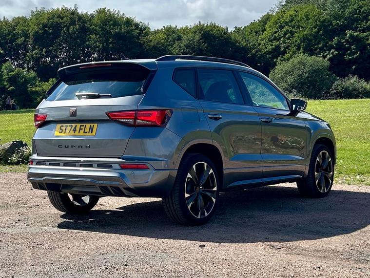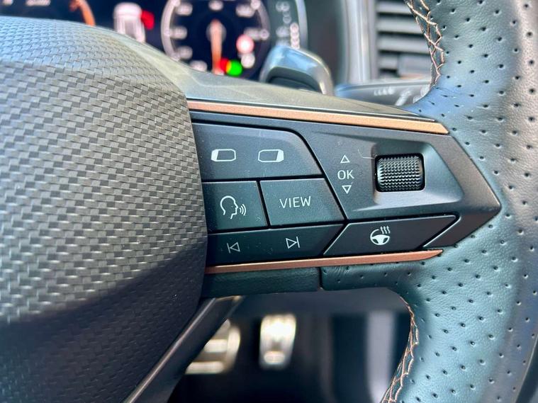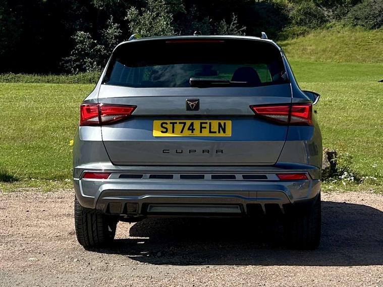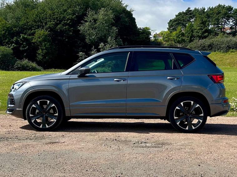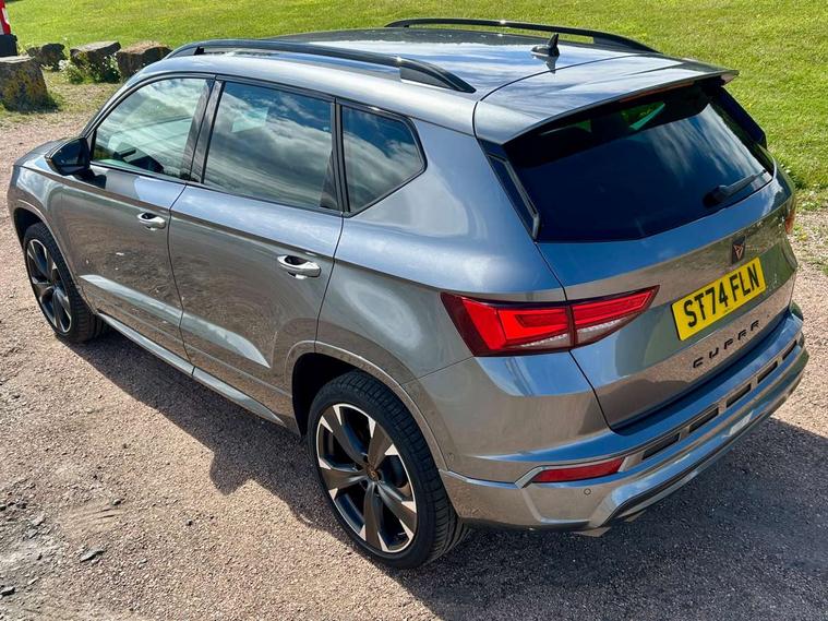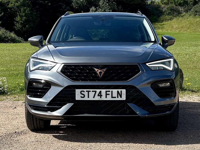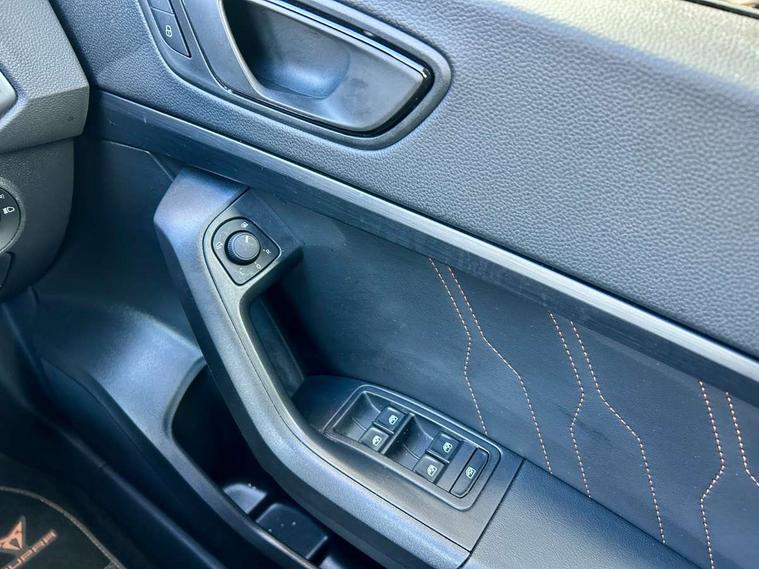 Cruise control system with speed limiter, Digital cockpit, Driving profile selection and conventional shock absorber, E-call, Electric tailgate with virtual pedal, Outside temperature gauge, Progressive power assisted steering, Rear view camera, Self parking functionality (includes front and rear parking sensors), Trip computer, wired and wireless full link smartphone integration, Wireless phone charger, Front and rear shock absorption, chassis with increased ride height, Steering wheel mounted audio/phone controls, Body colour bumpers with dark aluminium diffusor, Body coloured wheel arch surrounds, Dark tinted rear windows, Daytime running lights, Door mirrors with welcome CUPRA light silhouette, Dynamic headlight range control with self adjusting whilst driving, Electric adjustable/heated/folding door mirrors, Front and rear electric windows, Front grille frame in chrome, Full LED headlamps with lens and LED front fog lamps with cornering function, Gloss black door mirrors, Gloss black roof rails, Gloss black side mouldings, Gloss black side window trim, Illuminated aluminium front door sill, LED rear tail lights with dynamic indicators, Rear fog lights, Rear side wing doors, Rear spoiler, Rear wash/wipe, Specific CUPRA design front bumper, Standard rear exhaust tailpipes, Third brake light, 12v socket in front, 3 seat bench in 2nd row, 60/40 split folding rear seat, Aluminium pedals, Cupra steering wheel emblem, Dual zone climate control, Electric driver seat with memory function, Front and rear head restraints, Front centre armrest, Front seat back storage pockets, Grey roof lining, Heated front seats, Heated steering wheel, Height adjustable driver and passenger seat with lumbar adjustment, ISOFIX points in outer rear seats with top tether anchorage points, Leather sport bucket seats, Leather steering wheel and gear knob, Multicoloured ambient lighting with LED interior illumination, Pedal cluster, Rear armrest and easy back seat release mechanism from boot, Single front passenger seat, Sports steering wheel, Steering wheel mounted gearshift paddles, Storage compartment in roof console for sunglass, Storage compartment under driver's seat, Convenience pack - Ateca, Interior lighting pack - Ateca, Navigation system plus pack with DAB - Ateca, Safety and driving pack - Ateca, 3x3 point rear seatbelts, ABS, Traction control system (TCS), Electronic stability control (ESC) and Electronic differential lock system (XDS), Airbags - Driver and front passenger airbag with deactivation, front side, two curtain and driver's knee airbags, Black brake callipers with CUPRA logo, Electric parking brake with auto hold function, Front and rear seatbelt reminder, Front assist with autonomous emergency braking, Hill hold control, Manual rear child locks, Single tone horn, Tiredness recognition system, Tyre pressure monitoring system, Alarm, Keyless entry, Locking wheel bolts, 19" Sport machined alloy wheels 36/3 in black/silver,