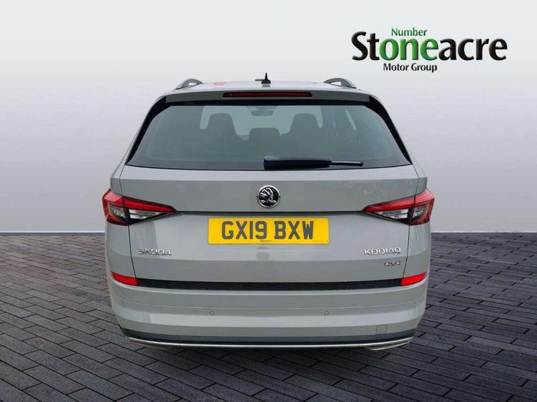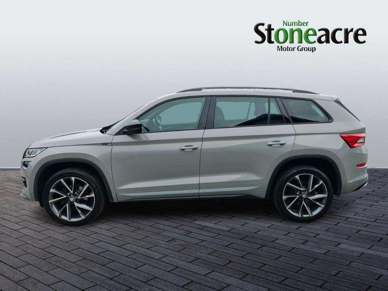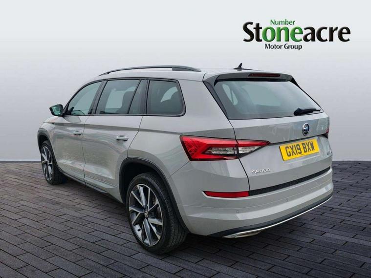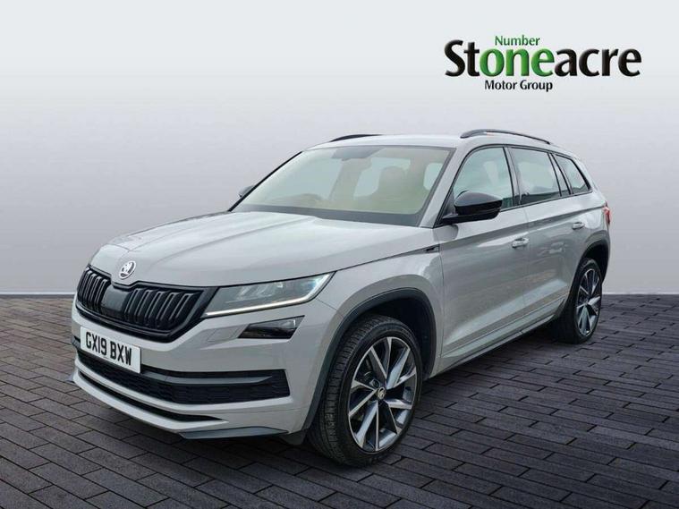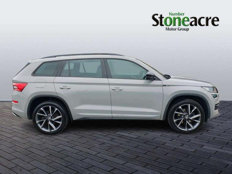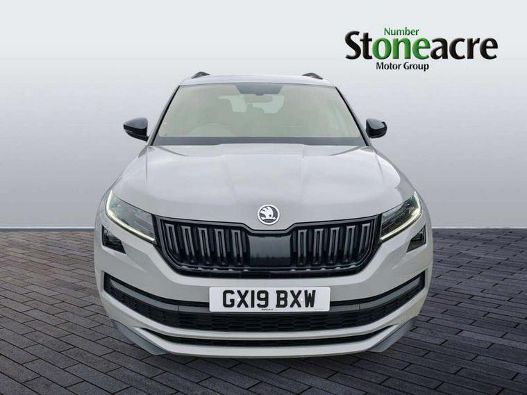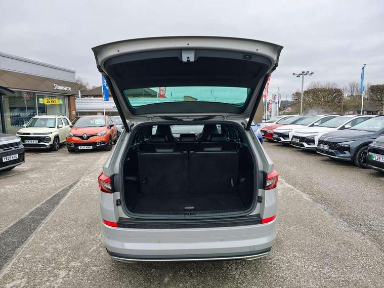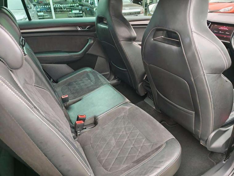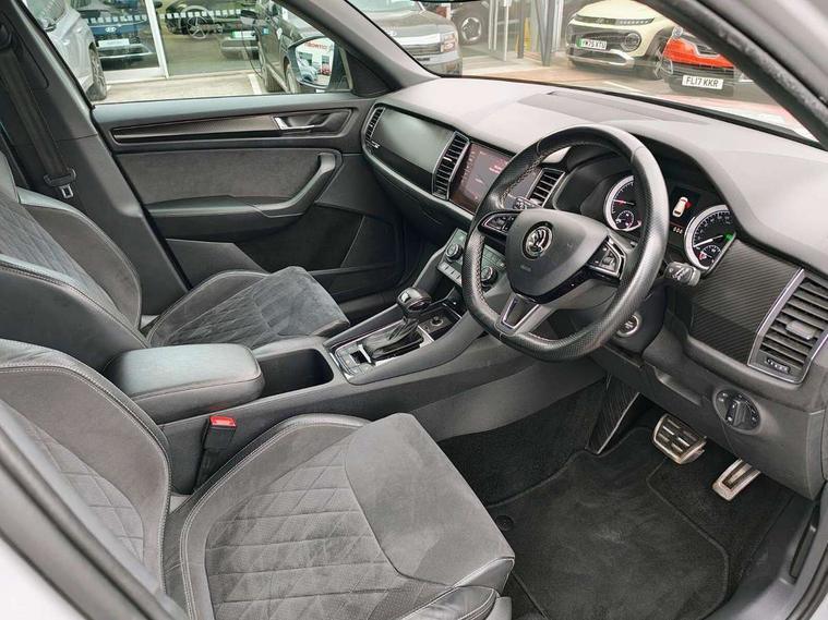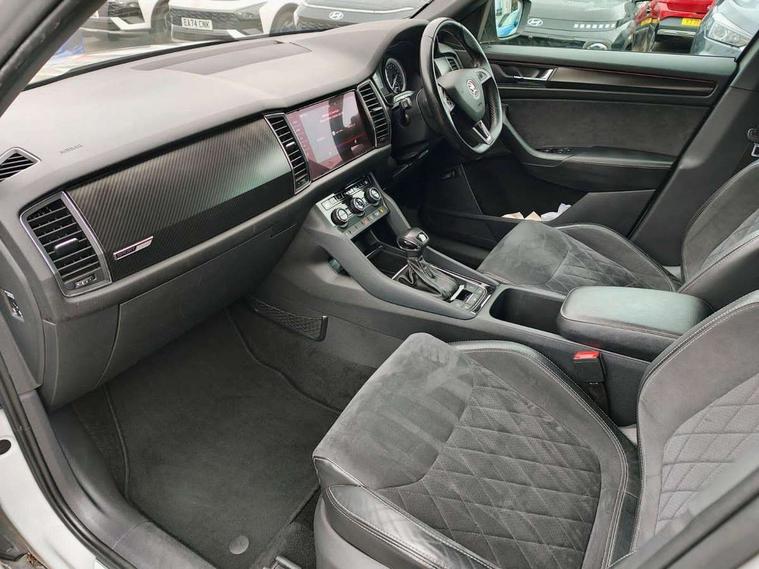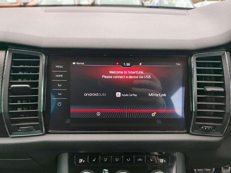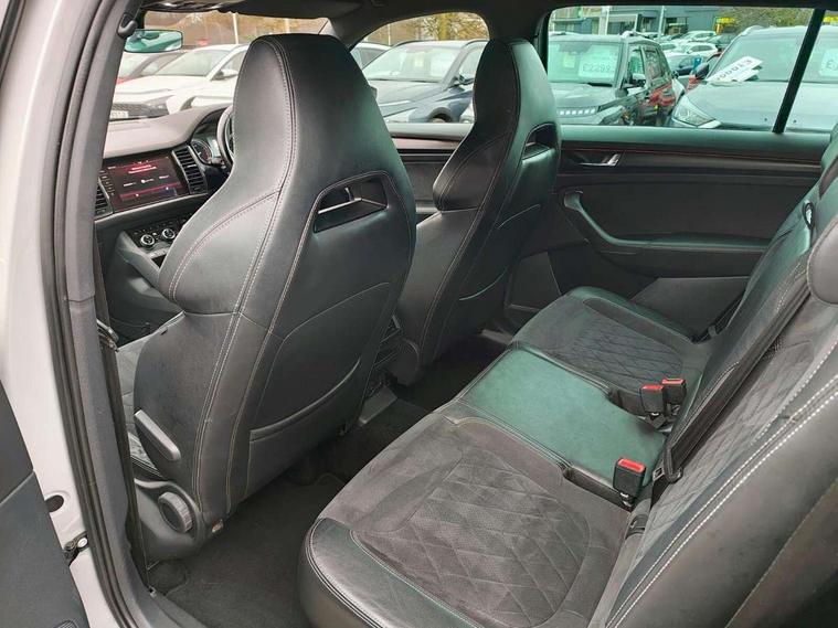 Bluetooth system, Colour multifunction trip computer, Columbus satellite navigation with 9.2" touch screen and integrated Wi-Fi + WLAN, Digital voice enhancement, ECO Stop/start function, Exterior temperature indicator, Progressive power assisted steering, SmartLink plus, Speed limiter, Sports dials, Tailgate unlocking from outside, Bolero Radio, DAB Digital radio, DVD System, USB and SD card connectivity, Aero front windscreen wipers with intermittent function, Aero rear window wiper, Auto dimming rear view mirror, Automatic activation of hazard warning lights, Black roof rails and door mirrors with radiator grille and window surrounds, Black wheel arch surrounds, Body colour door handles, Chrome exhaust tailpipe, Electric front and rear windows, Electrically adjustable/heated/foldable and auto dimming door mirrors with memory function, Front door steps with SportLine logo, Full LED Headlights with adaptive front light system and LED daytime running lights, Headlight washers, Heated rear window, Invisible tailpipe, LED front fog lights with static cornering light function, LED rear fog light, LED third brake light in rear spoiler, Light assistant (coming home/tunnel light), Rain and light sensors, Rear diffuser, Safety reflectors on front and rear doors, Sportline badge on front fender, Sports front and rear bumpers, Sunset privacy glass, Tinted windows, 12V socket in boot, 2 rails with 2 hooks including 4 hooks for net programme, 4 foldable roof handles with rear coat hooks, 4 lashing points on luggage floor, 60:40 foldable rear seat with sliding adjustment and backrest angle adjustment, Alcantara door panels, Alcantara upholstery with Sports seats, Aluminium pedals, Black roof headlining, Bottle holders in door panel in the 1.5 litre front and 1 litre rear, Cargo storage compartments, Centre console with open storage box, cup holder and 12V socket, Chrome headlight control button, Chrome interior door handles, Coat hooks on B pillar, Covered storage compartment on driver side, Front centre armrest with storage compartment, Front/rear courtesy lights, Gear shift lever with chrome frame and black gloss insert, Height adjustable front headrests, Illuminated and cooled glovebox, Illuminated luggage compartment, Isofix system on outer rear seats, LED ambient lighting, Manually adjustable steering column, Net programme in boot (1x horizontal Net, 2x vertical Nets), Overhead glasses storage compartment, Passenger side net compartment on centre console, Pollen filter, Rear centre armrest with cupholders, Removable lamp in luggage compartment, Roll up luggage compartment cover with intermediate position, Small Bags on the inner sides of the front backrests, Small pockets on the inner side of the front backrests, Storage compartment in lower middle Instrument panel, illuminated with closing, Sunvisors with illuminated vanity mirrors, Textile floor mats, Three rear height adjustable headrests, Ticket holder on A Pillar, Umbrella in door panel, LED Interior Light pack - Kodiaq Scout/Sport Line/VRS/Laurin + Klement, Auto door release and activation of warning lights in the event of an accident, Driver and passenger airbags, Electronic parking brake with hill hold control, Emergency rear braking signal, ESC (incl. ABS+MSR+ASR+EDS+HBA+DSR+RBS+MKB), Front and rear three point safety belt on all seats, Front assist includes AEB city/urban, Front side airbags, Fuel cut off safety device, Head and knee airbags, Passenger airbag deactivate switch, Rear disc brakes, Safety vest holder in door, Seat belt reminder for all seats, Two tone horn, Tyre pressure monitor, Warning lights in front doors, Alarm with interior monitoring and tilt sensor with safe function, Immobiliser, Keyless entry and start system (KESSY), Remote central locking, Carbon finish dashboard and door inserts, Sportline plaque on the dashboard, 20" Vega Anthracite alloy wheels with anti-theft wheel bolts,