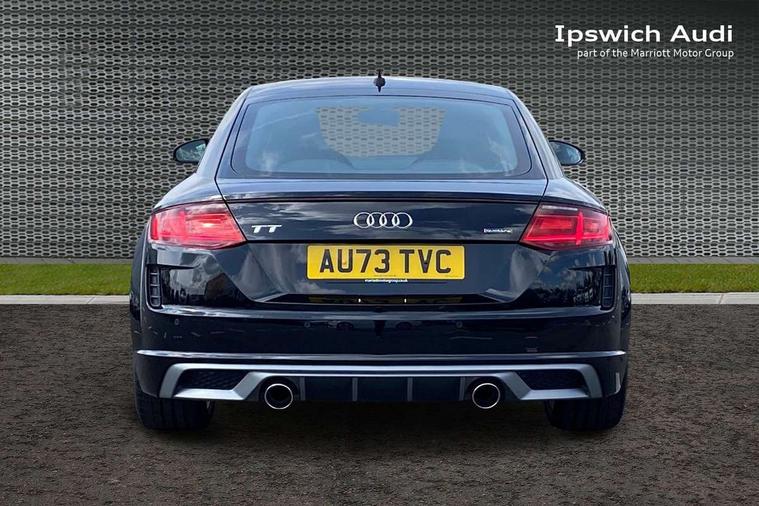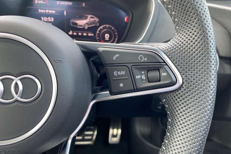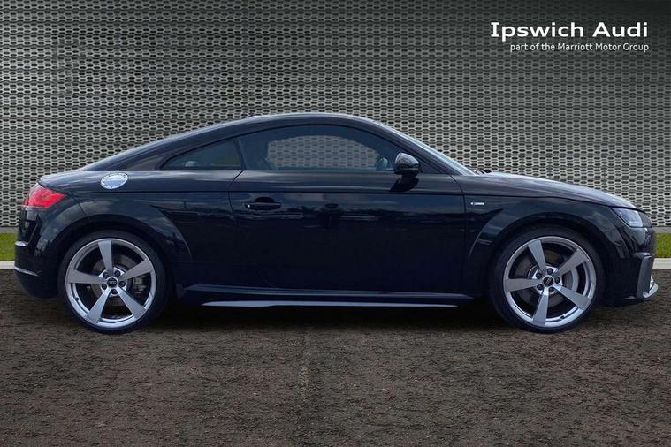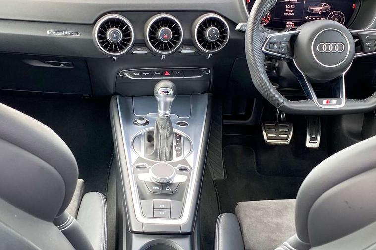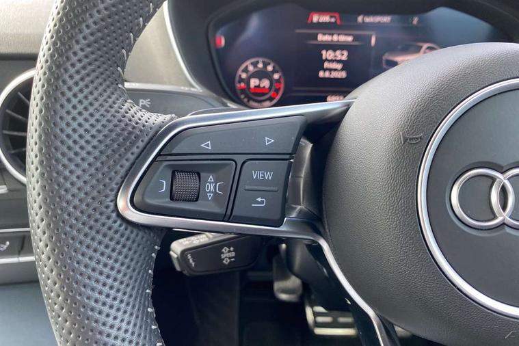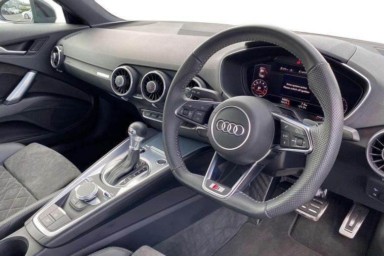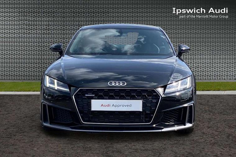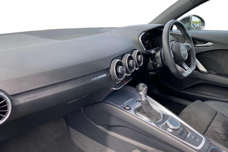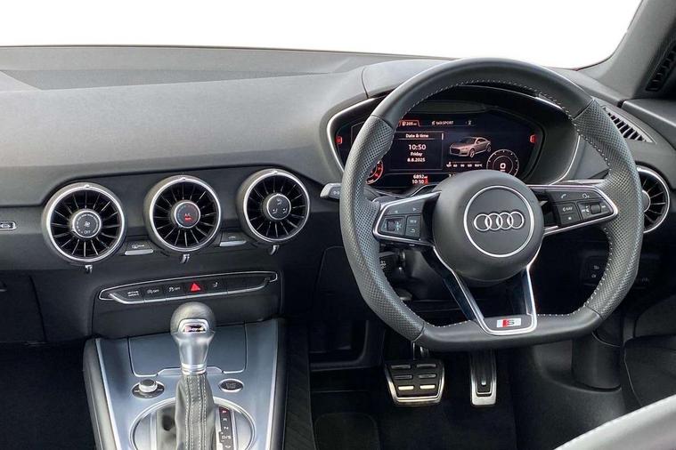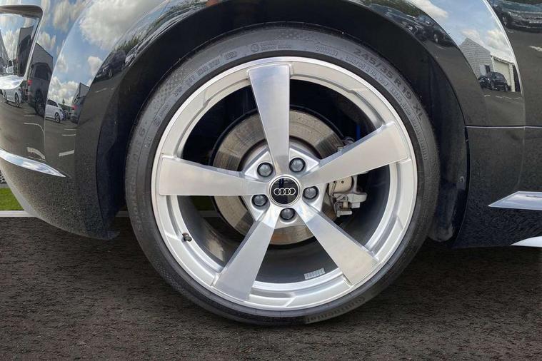 Audi drive select with 4 Pre configured modes, Audi smartphone interface, Cruise control + speed limiter, Emergency call service, MMI touch panel, Mobile phone preparation with bluetooth interface, Progressive power assisted steering, Service interval indicator, Start/Stop system with energy recuperation, TP memo, S line sports suspension, AM/FM radio, Bluetooth audio streaming, DAB Digital radio, MMI Radio with CD player and SD/XC card slot, Auto dimming rear view mirror, Auto headlight range control, Black door mirrors, Body colour bumpers, Electric folding door mirrors, Electric front windows, Electrically adjustable and heated door mirrors with integrated LED side indicators, Front fog lights, Green tinted heat insulating glass, High gloss black radiator grille, LED 3rd brake light, LED daytime running lights, LED headlights with LED rear lights + dynamic rear indicators, Light and rain sensors, Rear boot, Retractable rear spoiler, S line badges on front wings, Sunband for windscreen, 12V socket, 2 rear seats, 3 spoke flat bottomed high multi-function leather sport steering wheel with gearshift paddles, 4 way electric lumbar support for driver and front passenger, Black headlining, Contrasting silver stitching in steering wheel, Door sill trims with S line logo, Extended aluminium look with stainless steel pedals, Front centre armrest, Front passenger seat, Front super sports seats, Heated front seats, Height/reach adjust steering wheel, Integrated head restraints, ISOFIX child seat mounting for front passenger seat with airbag deactivation, Manual adjustment of seat height, fore/aft position, seat angle, seat depth and backrest angle, Perforated leather gearknob in black, Rear head restraints, Rear top tether child seat ISOFIX attachment, S Line badge on steering wheel, Split folding rear seat, Tool kit, Non smoking pack - TT/TT RS, S Line design styling pack - TT, 3 point front seat belts, ABS, ASR traction control, Curtain airbags, Driver and front passenger airbag with front passenger airbag deactivation, EDL traction control, Electromechanical parking brake, ESP, First aid kit, Front side airbags, Head airbags, Hill hold assist, Seatbelt warning, Tyre pressure loss indicator, Warning triangle, Anti theft alarm, Anti theft wheel bolts, Immobiliser, Keyless Go, Remote central locking, Matt brushed aluminium inlays, Tyre repair kit,