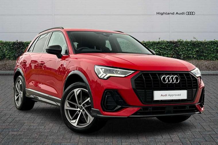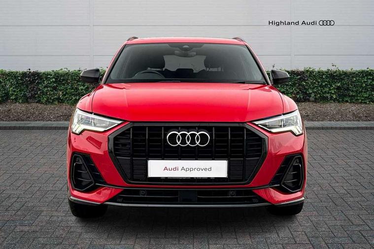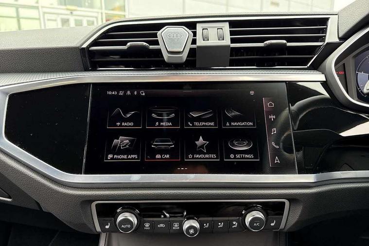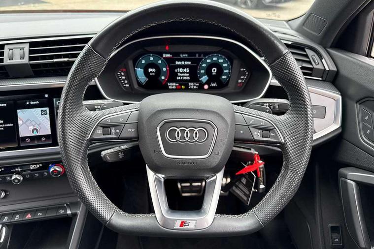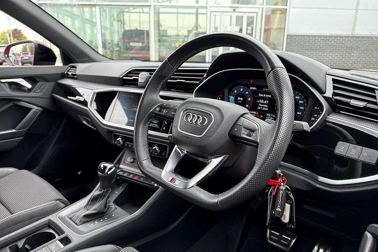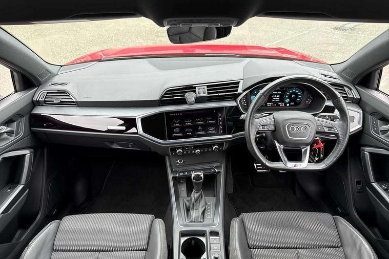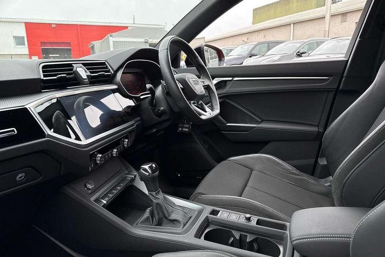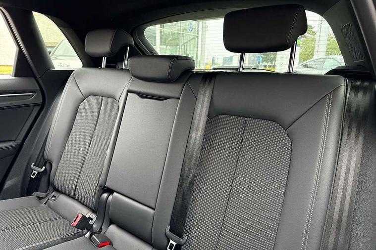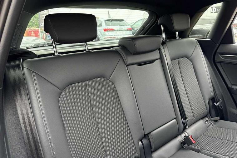 Amazon alexa Integration, Audi drive select, Audi lane departure warning, Audi smartphone interface includes wireless Apple carplay/Android Auto, Audi Virtual Cockpit - 10.25" display, Bluetooth interface, Camera based traffic sign recognition, Legal emergency call, MMI Navigation Plus with high resolution 10.1 inch touchscreen colour display, Power operated tailgate, Progressive steering, Service interval indicator, Start stop system with recuperation, Voice control system with natural language interaction, Diesel particulate filter, Sports suspension, 2 USB-C ports with charge and data functions, 6 passive loudspeakers, DAB digital radio module, Acoustic windscreen, Auto dimming frameless rear view mirror, Black roof rails, Electrically folding, adjustable and heated door mirrors with integrated LED side indicators and kerb view function for passenger side, Front and rear electric windows, Front fog lights, Grille vertical bars in aluminium silver/Matt, High gloss black finish B and C pillars, LED headlights with LED daytime running lights, LED rear lights, LED third brake light, Privacy glass dark tinted rear and rear-side windows (from B-pillar backwards), Rain and light sensors, Rear diffuser grille in grained matt black, Rear diffuser strip in matt titanium black, Rear side wing doors, Rear wiper, S line bumpers in contrasting Manhattan grey, Variable front intermittent wipers, 12V socket in rear centre console, 3 seat bench in 2nd row, 40:20:40 folding with manual adjustment for 60:40 forwards/backwards position and backrest angle, Adjustable rear seat bench/backrest with centre armrest and cupholder, Black cloth headlining, Dual zone electronic climate control, Front and rear black floor mats with contrast stitching in rock grey, Front and rear headrests, Front and rear roof module including reading lights, Front centre armrest, Glove compartment lighting, Height and reach adjustable steering wheel, Illuminated door sill trims with S logo, ISOFIX child seat mounting for front passenger with airbag deactivation and outer rear seat including top tether attachment point for outer rear seats, Luggage compartment light, Manual front seats with height adjustment, Perforated leather gearknob, Single front passenger seat, Stainless steel luggage compartment sill finisher, Stainless steel pedals, Black styling pack - Q3, Non smoking pack - Q3, 3x3 point rear seatbelts, 6 airbags - Driver, front passenger, curtain and side windows, Audi pre-sense front with pedestrain and cyclist recognition, Electromechanical parking brake, Electronic stabilisation control including ABS, ASR and EDL, Front seatbelt reminder, Hill descent control, Hill hold assist, Manual child lock in rear doors, Pre sense basic, Seatbelt monitoring, Tyre pressure warning, Warning triangle and first aid kit, Anti theft alarm, Anti theft wheel bolts, Immobiliser, Remote central locking, Detail dashboard around MMI touch colour display in glass look, black with surround in aluminium look, Leatherette door armrest, Piano black inlay,