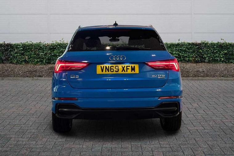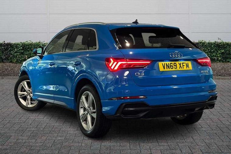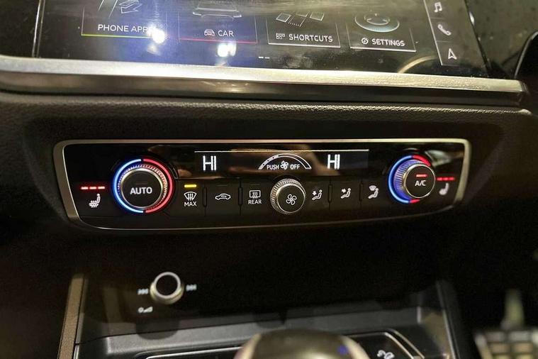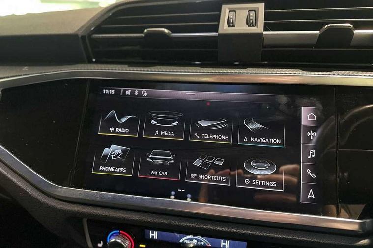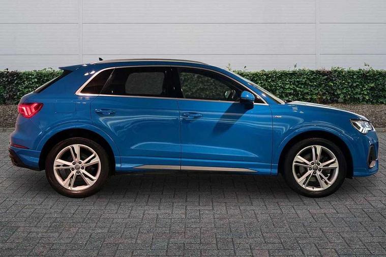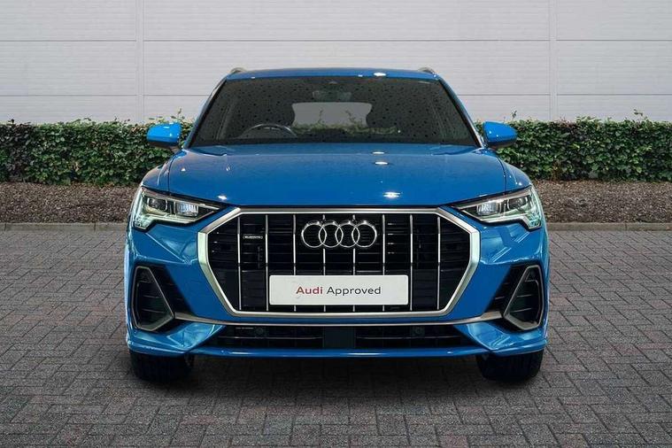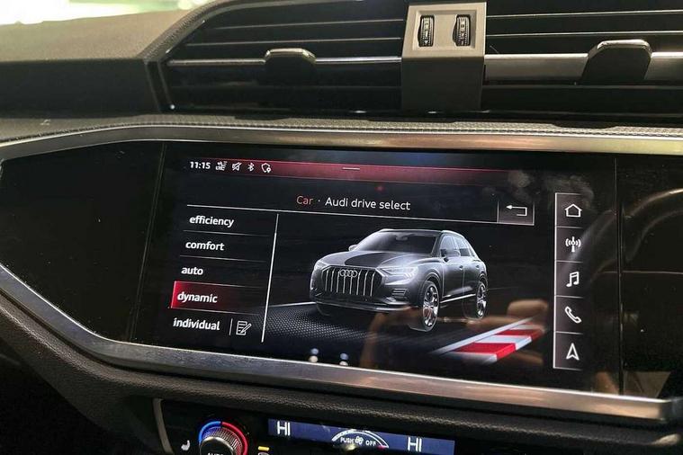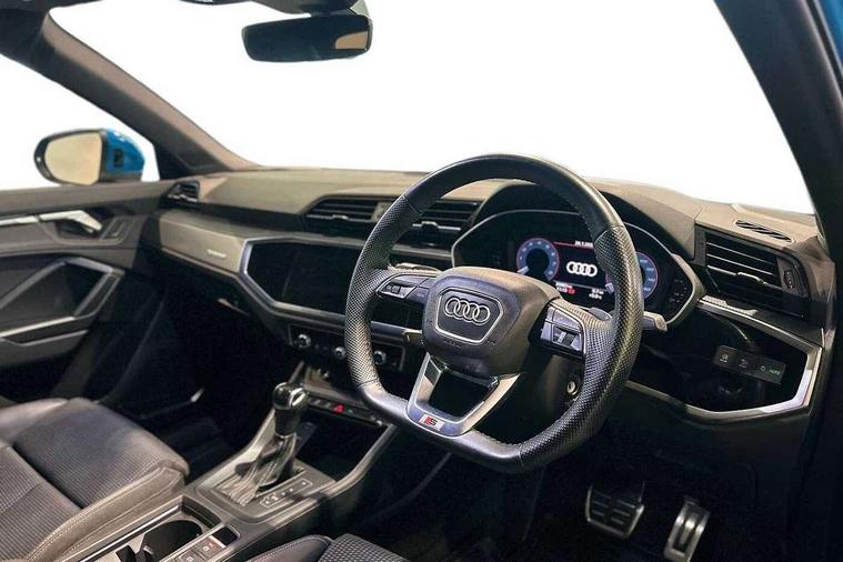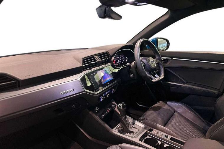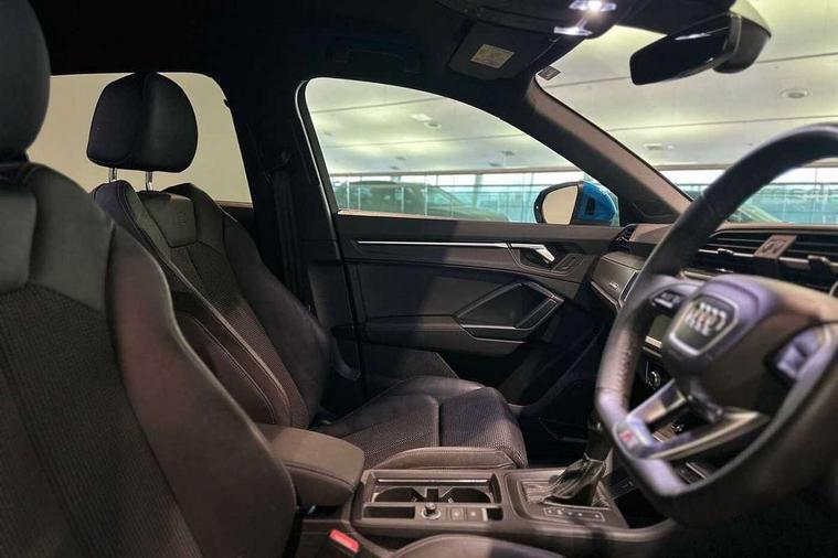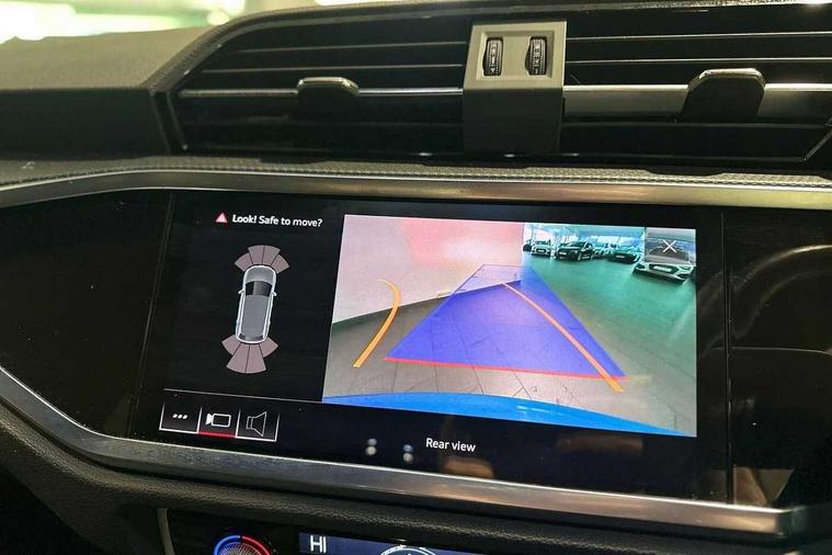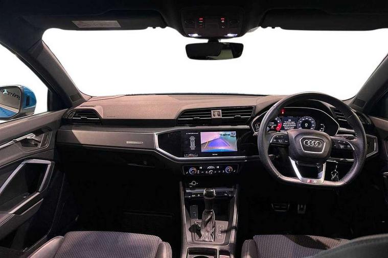 Audi connect safety and service (e-call), Audi drive select, Audi lane departure warning, Audi side assist, Audi smartphone interface, Audi Virtual Cockpit - 10.25" display, Bluetooth interface, Camera based traffic sign recognition, MMI navigation plus with MMI touch, Power opening/closing tailgate, Progressive steering, Service interval indicator, Stop/start system, Voice control system, Sports suspension, 1 x USB type C and 1 USB type A charging points, 6 speakers, DAB digital radio module, Acoustic windscreen, Aluminium roof rails, Aluminium window trim, Auto dimming rear view mirror, Body coloured bumpers, Diffuser in matt Platinum grey, Electrically adjustable and heated door mirrors with integrated LED side indicators, Front and rear electric windows, Front fog lights, Front side air inlets in matt platinum grey, Front spoiler blade in matt platinum grey, Grille vertical bars in aluminium silver/Matt, High gloss black finish B and C pillars, LED headlights with LED daytime running lights and dynamic rear indicator, LED rear lights, Privacy glass, Rain and light sensors, Rear diffuser strip in matt titanium black, S Line badge on wings, S Line front and rear bumpers, Side skirt insert in matt Platinium grey, Titanium black radiator grille, 12V socket in rear centre console, 40:20:40 split folding rear seat, Adjustable rear seat bench/backrest with centre armrest and cupholder, Aluminium door sill trims, Black cloth headlining, Dual zone climate control, Front and rear black floor mats with contrast stitching in rock grey, Front and rear headrests, Front and rear roof module including reading lights, Front centre armrest with storage compartment and angle adjustment, Glove compartment lighting, Height and reach adjustable steering wheel, Illuminated door sill trims with S logo, ISOFIX child seat mounting and Top Tether with front passenger airbag deactivation, Luggage compartment light, Manual front seats with height adjustment, Perforated leather gearknob, Stainless steel luggage compartment sill finisher, Stainless steel pedals, Non smoking pack - Q3, 3x3 point rear seatbelts, 6 airbags - Driver, front passenger, curtain and side windows, Electrically operated child locks on rear doors, Electromechanical parking brake, Electronic stabilisation control including ABS, ASR and EDL, Hill descent control, Hill hold assist, Pre sense basic, Seatbelt monitoring, Tyre pressure warning, Warning triangle and first aid kit, Anti theft alarm, Anti theft wheel bolts, Audi pre-sense front with pedestrain and cyclist recognition, Remote central locking, Dark matt brushed aluminium inlay, MMI touch colour display in gloss black with aluminium surround,
