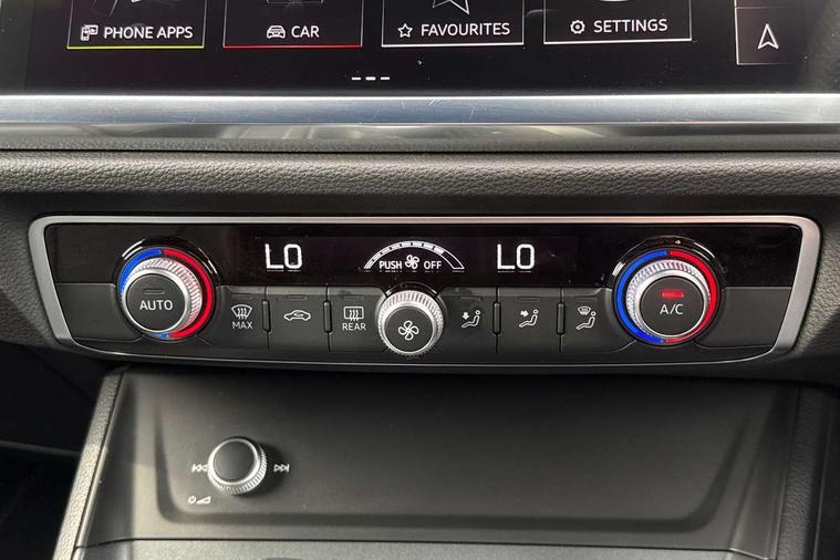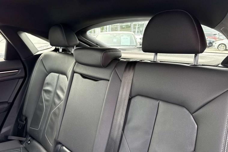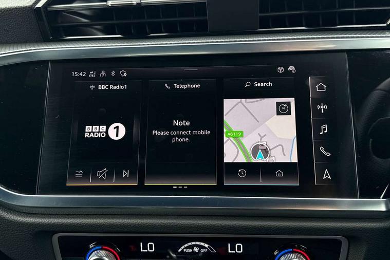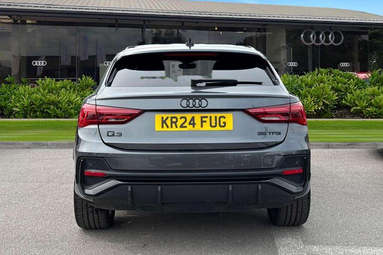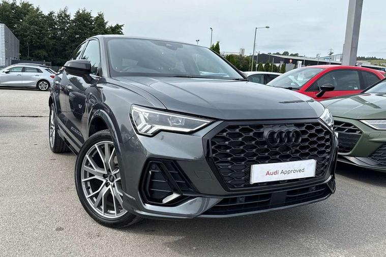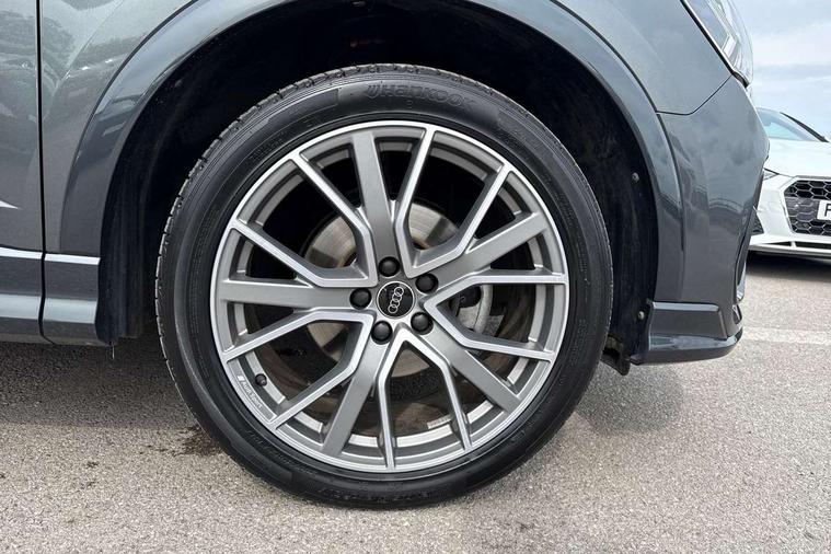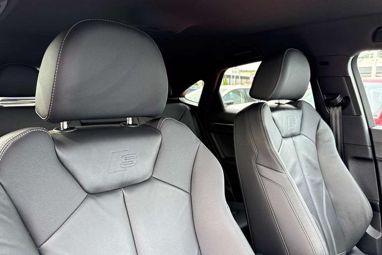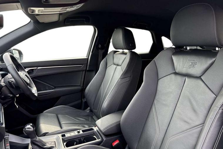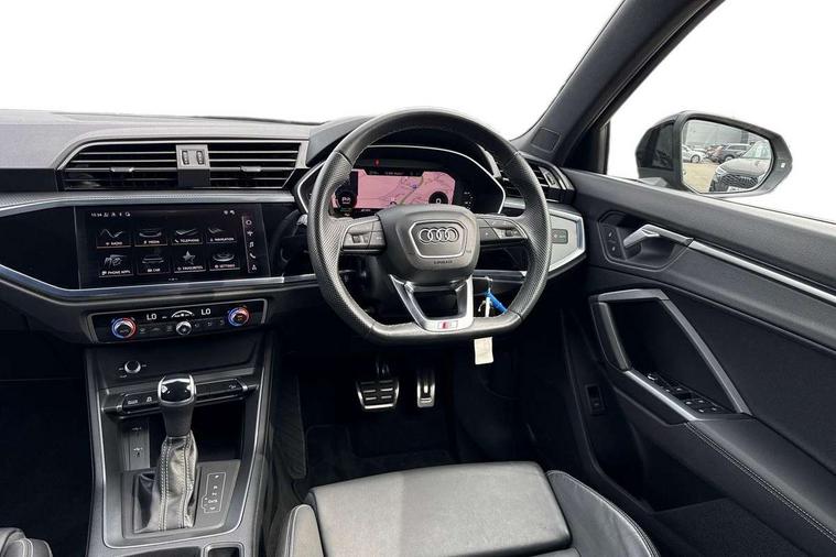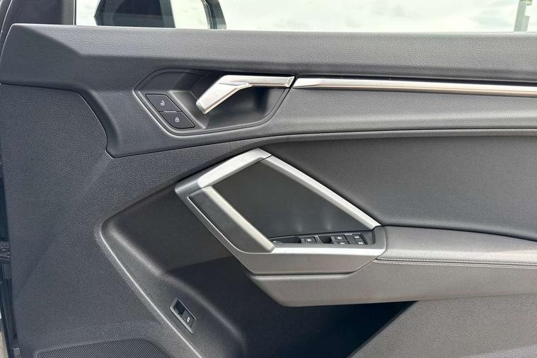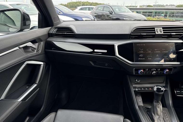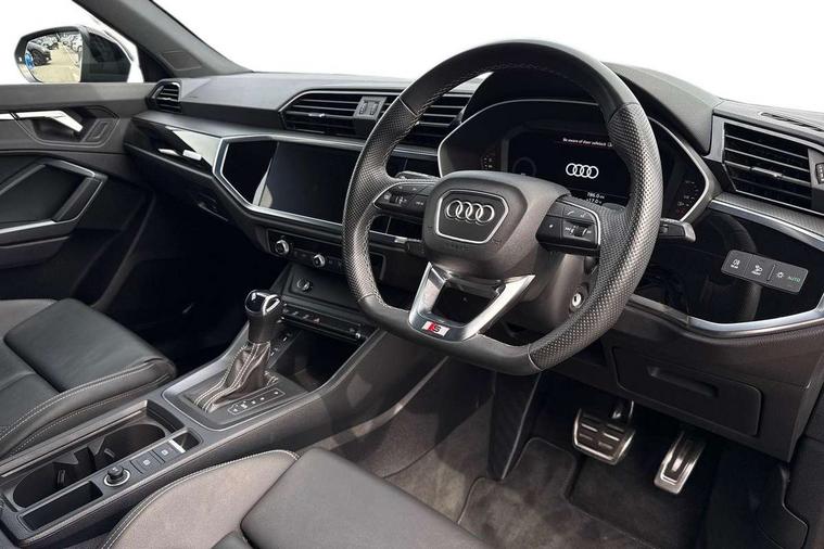 Audi connect safety and service, Audi drive select, Audi lane departure warning, Audi smartphone interface includes wireless Apple carplay/Android Auto, Audi Virtual Cockpit - 10.25" display, Bluetooth interface, Camera based traffic sign recognition, Distraction and Fatigue warning, Legal emergency call, MMI Navigation Plus with high resolution 10.1 inch touchscreen colour display, Power operated tailgate, Progressive steering, Service interval indicator, Start stop system with recuperation, Voice control system with natural language interaction, Sports suspension, 2 USB-C ports with charge and data functions, 6 passive loudspeakers, DAB digital radio module, Acoustic windscreen, Audi Beam uses LEDs to project the Audi logo onto the ground as you exit your Q3, Auto dimming door mirrors, Auto dimming frameless rear view mirror, Diffuser grille in grained matt black, Diffuser trim in selenite silver, Electrically folding, adjustable and heated door mirrors with integrated LED side indicators and kerb view function for passenger side, Front and rear electric windows, Front fog lights, Front underbody protection in manhattan grey paint finish, High gloss black finish B and C pillars, LED Dynamic rear indicators, LED headlights with LED daytime running lights, LED rear lights, LED third brake light, Privacy glass dark tinted rear and rear-side windows (from B-pillar backwards), Rain and light sensors, Rear side wing doors, Rear underbody protection in matt black, Rear wiper, S line front and rear bumpers and side skirts in contrasting Manhattan grey paint finish, Variable front intermittent wipers, 12V socket in rear centre console, 3 seat bench in 2nd row, 40:20:40 folding with manual adjustment for 60:40 forwards/backwards position and backrest angle, Adjustable rear seat bench/backrest with centre armrest and cupholder, Black cloth headlining, Dual zone electronic climate control, Electric lumbar support, Front and rear black floor mats with contrast stitching, Front and rear headrests, Front centre armrest, Height and reach adjustable steering wheel, Illuminated door sill trims with S logo, ISOFIX child seat mounting for front passenger with airbag deactivation and outer rear seat including top tether attachment point for outer rear seats, Luggage compartment sill protection in stainless steel, Manual front seats with height adjustment, Perforated leather gearknob, Single front passenger seat, Stainless steel pedals, Twin leather upholstery with front sport seats + S embossing, Black styling pack - Q3, Non smoking pack - Q3, 3x3 point rear seatbelts, 6 airbags - Driver, front passenger, curtain and side windows, Audi pre-sense front with pedestrain and cyclist recognition, Electrically operated child locks on rear doors, Electromechanical parking brake, Electronic stabilisation control including ABS, ASR and EDL, Front seatbelt reminder, Hill descent control, Hill hold assist, Pre sense basic, Seatbelt monitoring, Tyre pressure warning, Warning triangle and first aid kit, Anti theft alarm, Anti theft wheel bolts, Immobiliser, Remote central locking, Aluminium look interior elements, Detail dashboard around MMI touch colour display in glass look, black with surround in aluminium look, Leatherette door armrest, Piano black inlay,