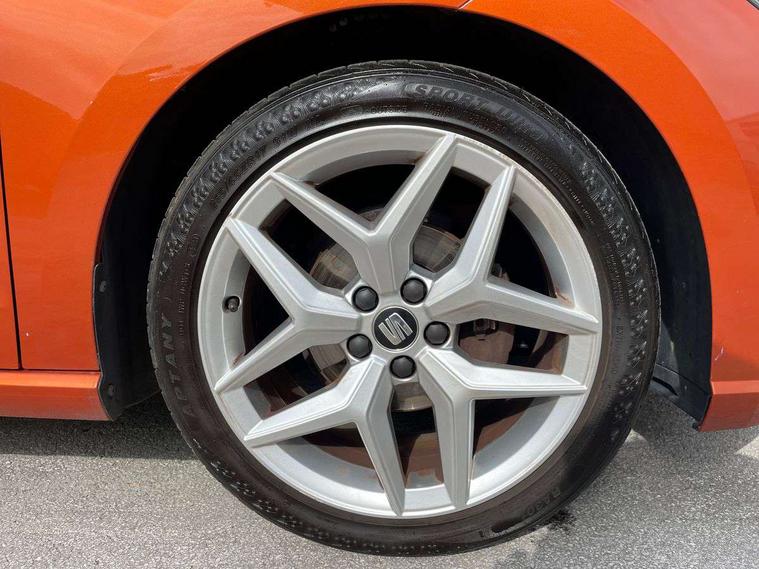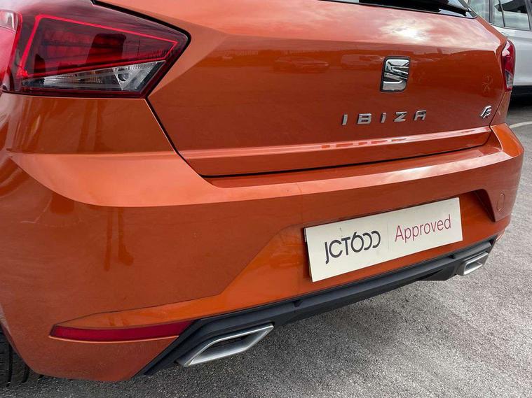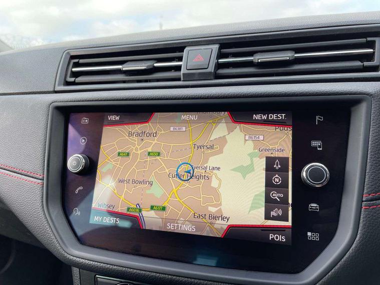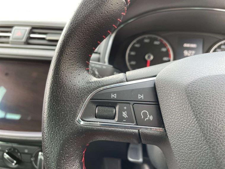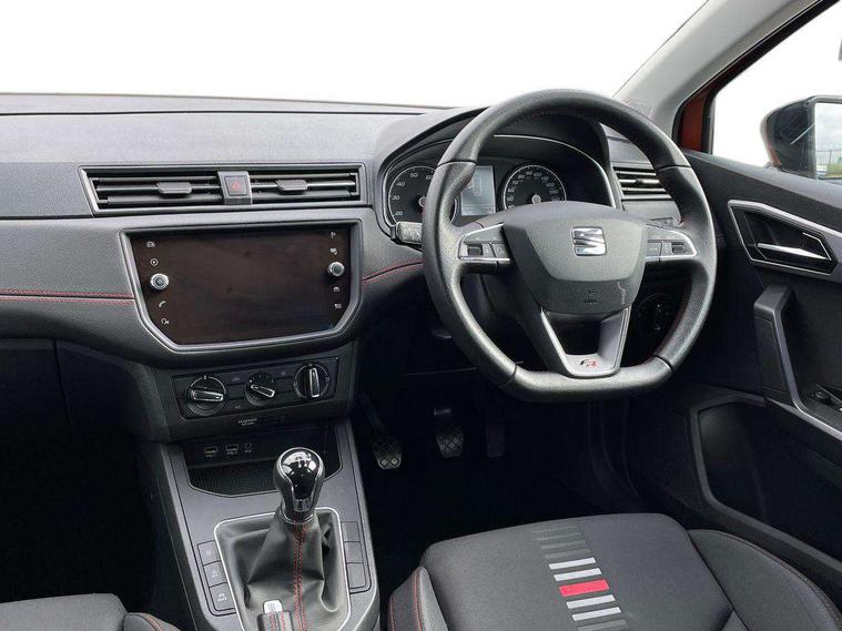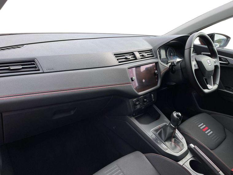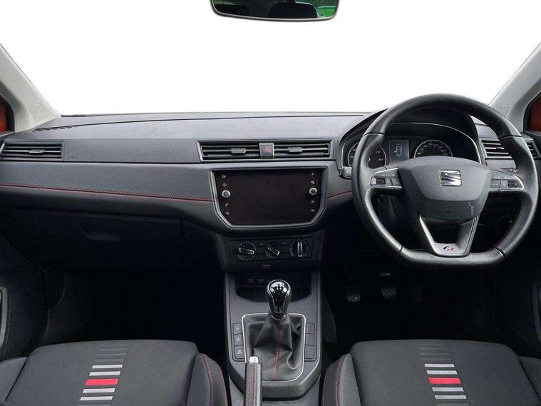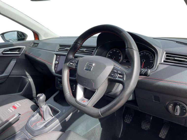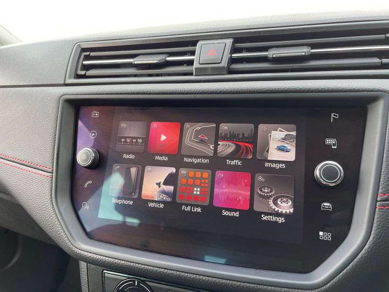 'Lights On' Reminder warning buzzer, Bluetooth Handsfree Phone Connection, Cruise control, Digital clock, Full Link Smartphone Integration with Mirror Link, Apple Car Play, Google Android Auto, Low fuel warning light, Outside temperature gauge, Satellite navigation system with 3D mapping, 8" touch screen, voice control and additional USB port, SEAT Drive profile, SEAT logo boot release, Speed sensitive power steering, Trip computer, Sports suspension, 6 speakers, Auxiliary input socket, CD player, Digital Audio Broadcast (DAB) Tuner, Radio/MP3 player, SD card slot, SEAT USB media cable, Steering wheel mounted controls, USB port, Anti theft roof antenna, Auto dimming rear view mirror, Automatic headlights, Automatic rain sensing wipers, Body colour bumpers, Body colour door handles, Brilliant black door mirrors, Chrome front grille frame, Chrome grille, Coming/leaving home lighting function, Cornering front fog lights, Dark tinted rear windows, Electric folding door mirrors, Electric front windows, Electric headlight adjustment, Electrically adjustable and heated door mirrors, Exclusive FR rear bumper, Full LED headlights, LED daytime running lights, LED tail lights, Rear fog lights, Twin exhaust pipes, 3 rear headrests, 60/40 split folding rear seat, Air conditioning, Door and steering wheel ice metal decorative inserts, Driver's sunvisor with ticket holder/vanity mirror, Dust/pollen filter, Flat bottomed perforated leather steering wheel with red stitching and FR logo, Front courtesy lights, Front cupholders x 2, Front reading lights, Gear shift indicator, Glovebox, Height adjustable driver's seat, Height adjustable front/rear head restraints, Height adjustable passenger seat, Height/reach adjust steering wheel, Illuminated boot, Instrument lighting with brightness control, Leather handbrake, Leather steering wheel and gear knob, Multi-colour ambient interior lighting, Nora cloth upholstery, Passenger sunvisor, Rear top tether child seat ISOFIX attachment, Sports seats, Full LED headlight pack - Ibiza, 3 point seatbelts on all 3 rear seats, ABS, Active front headrests, Child locks on rear doors, Curtain airbags, Driver/Front Passenger airbags, ESP+EBA, Front assist (AEB), Front passenger airbag deactivation, Front side airbags, Hill hold control, Multi-Collision braking, Seatbelt warning, Tiredness recognition system, Tyre pressure monitoring system, 2 folding remote keys with window open/close function, Electronic engine immobiliser, Locking wheel bolts, Remote central locking + deadlocks, Volumetric alarm with back up horn, Black dash trim, Leather dashboard, 17" Dynamic alloy wheels,