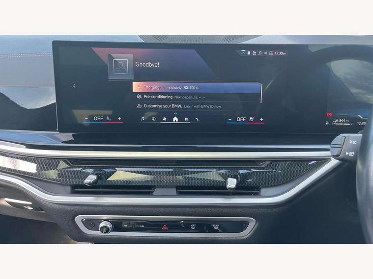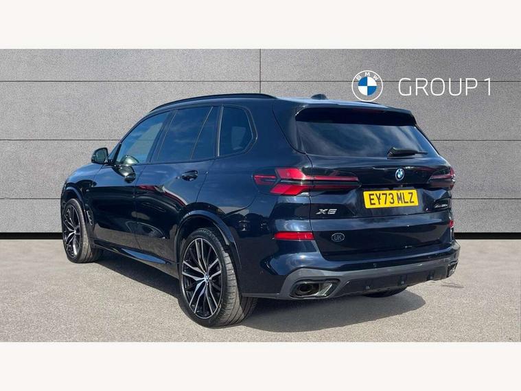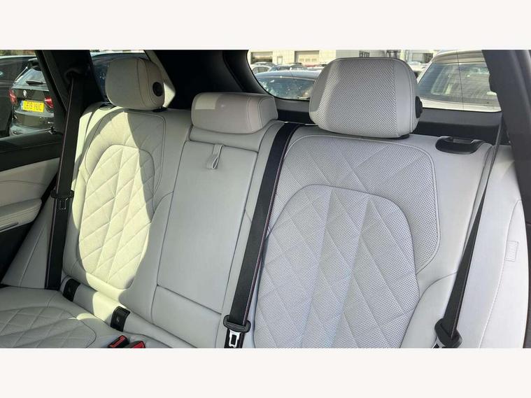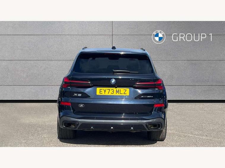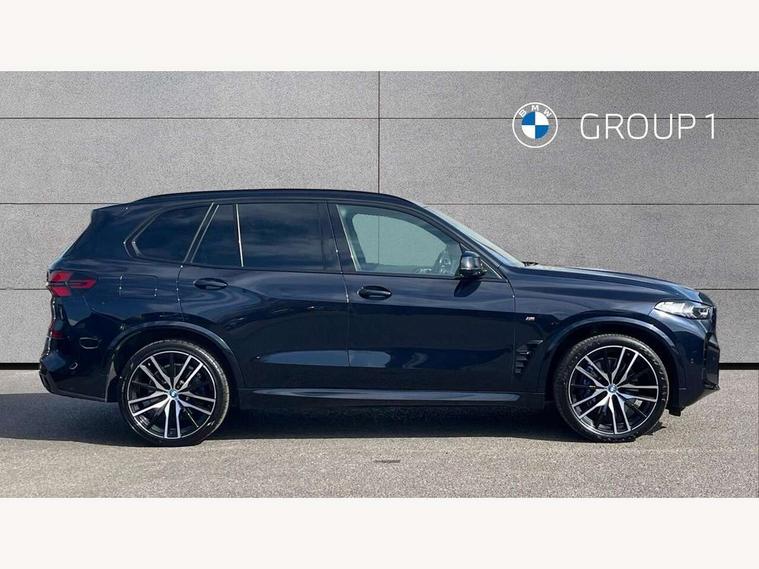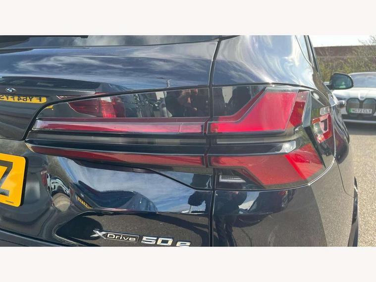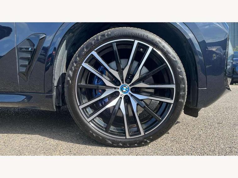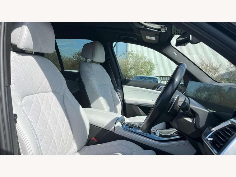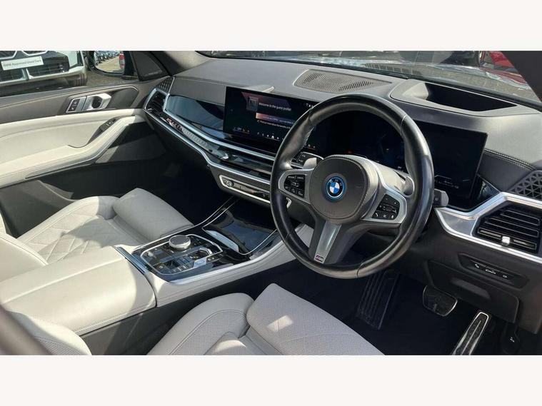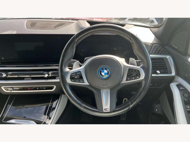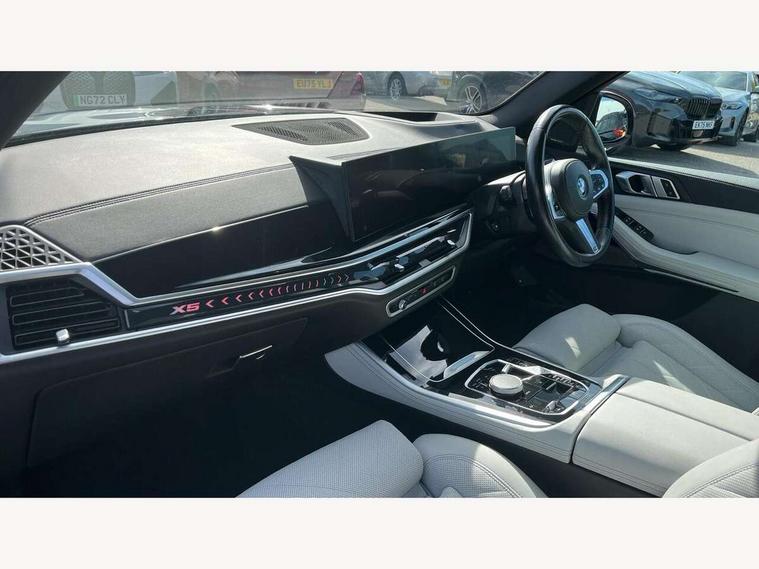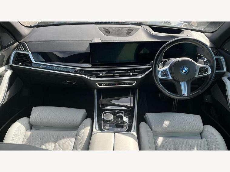 Attentiveness assist, Automatic tailgate operation, BMW ConnectedDrive online services, BMW live cockpit + with curved 12.3 instrument cluster/14.9 central display, nav/Tuner with diversity reception, RDS/4GLTE/remote software upgrade, BMW Teleservices, Condition based service, Cruise control with brake assist, eCall emergency call system, Enhanced bluetooth with wireless charging, Integrated owner's handbook, PAS, Speed limiter, Wi-Fi hotspot, Adaptive 2-axle Front and rear air suspension, Drive performance control with ECO PRO comfort + sport mode, Eight speed steptronic sport automatic transmission and gearshift paddles on the steering wheel, Flexible charger (Mode 2), Hi-Fi loudspeaker system, Adaptive LED Headlights, Front and rear electric windows, High beam assistant, High gloss black shadow line roof rails, LED daytime running lights, Rear side wing doors, Third brake light in rear spoiler, Variable intermittent rear wash/wipe, 12V - Power sockets with 2x centre console and 1x luggage compartment, 3 seat bench in 2nd row, Foldable rear centre armrest with 2 cupholders and storage compartment, Front and rear side armrest integrated into door trim, Headrests for all seats, Luggage compartment separating net, Single front passenger seat, Three spoke sport M leather steering wheel, Velour floormats, Ambient light interior pack - X5, Driving assistant pack with radar based driver assistance system - X5, Expanded exterior mirror pack - X5/X5 M, M aerodynamics pack - X5, 3 rear seatbelts, Acoustic protection for pedestrians, Active protection, Airbags - driver/front passenger, rear and side, first and second row seats head airbags, front passenger seat airbag deactivation + knee airbag, Anti-lock braking system (ABS), Automatic Stability Control (ASC), Brake energy regeneration, Cornering brake control (CBC), Crash sensor activating central locking release, hazard warning lights, fuel cut off, interior lighting + activation of safety battery terminal clamp, DSC - Dynamic Stability Control, Dynamic Traction Control - DTC, Electromechanical parking brake with automatic drive away release and auto hold function, Electronic brake force distribution, Hill start assistant, M Sport blue painted brake calipers with 'M' designation, Mechanical child proof lock on rear doors, Tyre pressure monitoring system, Tyre pressure sensors, Ventilated front and rear disc brakes, Warning triangle and first aid kit, Closing system with central locking, Comfort access system, Locking wheel bolts, Sensatec instrument panel,