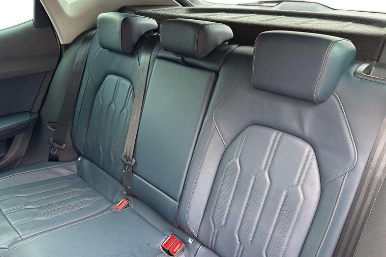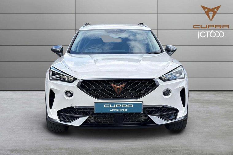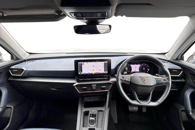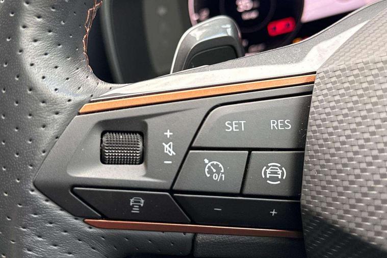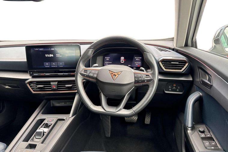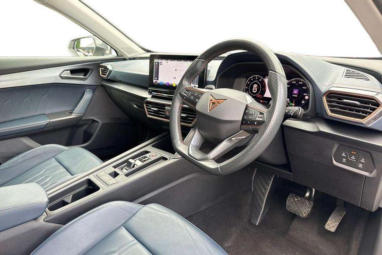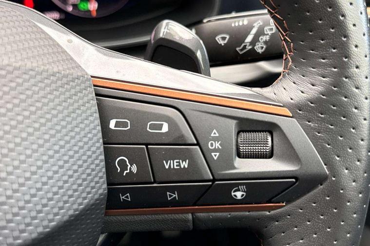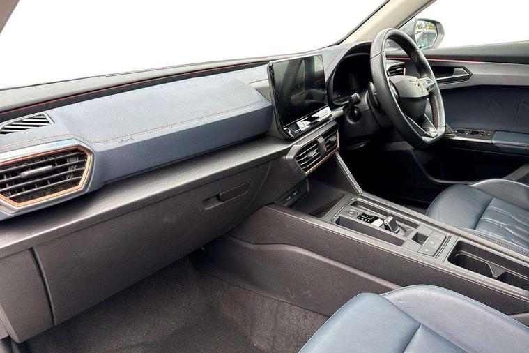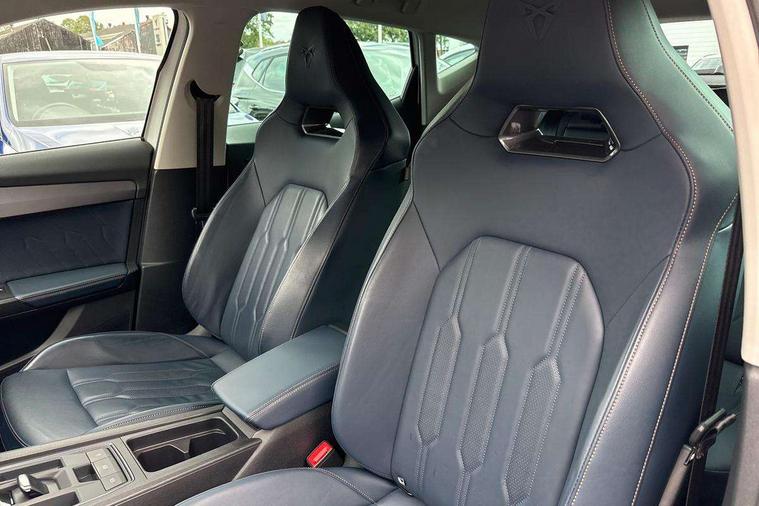 Digital cockpit and configurable dashboard, Driver alert system, Driving profile selection, E-call, Forward collision warning with automatic braking, Lane assist, Navigation system with 12'' Touchscreen Display, Park assist (inc front/rear parking sensors), PAS, Predictive adaptive cruise control with speed limiter, Rear view camera, RPM, trip computer, outside temp gauge, instrument light brightness, low fuel warning light, lights on reminder, gearshift indicator, Service interval indicator, Start/stop system with regenerative braking, Voice control system, Wireless apple carplay, Wireless phone charger, Electronic locking differential and dynamic traction support, Standard suspension, 2 front and 2 rear USB type C sockets, Auxiliary input socket, DAB radio, Auto dimming rear view mirror, Body colour door handles, Body coloured bumpers, Dark grey wing mirror, Daytime running light with automatic headlight control and coming home feature, Dynamic headlight range control, Electric front/rear windows, Electrically adjustable heated and folding door mirrors with memory function, Front fog lamps with cornering function, Gloss black roof rails and window surrounds, LED Headlights, LED Taillights with dynamic indicator, Rain sensing wipers, Rear diffuser with black simulated exhaust pipes, Rear side wing doors, Rear wash/wipe, Third brake light, Tinted rear windows, Welcome lights, 12v power supply in centre console, 12V socket, 12v socket in loadspace, 2 front and 2 rear reading lights, 230V socket, 3 seat bench in 2nd row, 60/40 split rear bench seat with armrest and mechanical seat release, Dust/pollen filter, Front and rear head restraints, Front centre armrest, Height/reach adjust steering wheel, Illuminated interior front door sills, Illuminated sunvisor with mirror, Isofix, Leather multi function heated steering wheel with gear shift paddles, Luggage tie-down hooks, Single front passenger seat, Three zone climate control with control panel in rear, Variable luggage/load compartment floor, Wraparound lighting, Genuine Nappa leather Pack - Cupra, 3 point seatbelts on all rear seats, ABS, Brake control system - ESC and brake booster, Child proof door locks, Driver and front passenger airbags with front passenger airbag de-activation, Electronic parking brake, Front and rear disc brakes, Front side curtain airbags, Hill hold control, Seat belt reminder for front and rear seats, Tyre pressure monitoring system, Anti theft alarm system, Keyless entry and start system (KESSY), Locking wheel bolts, Copper and aluminium interior detailing, 19" 'Exclusive' machined sport matte black and silver alloy wheels,
