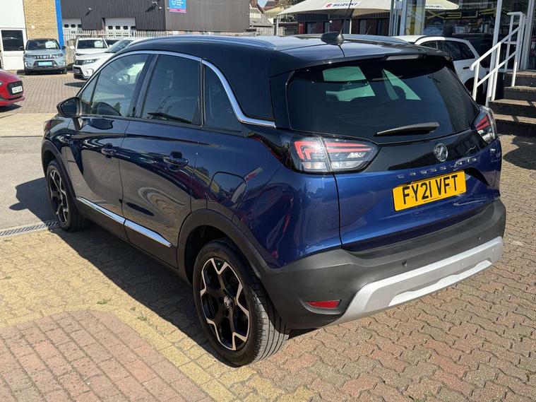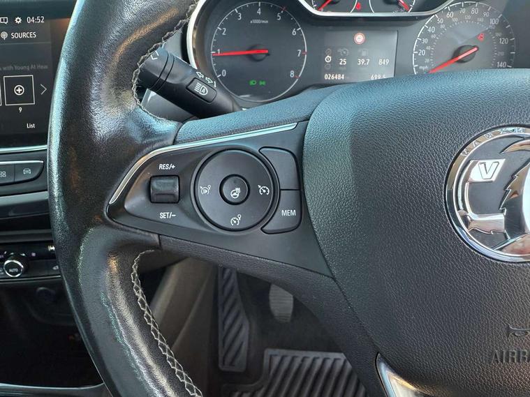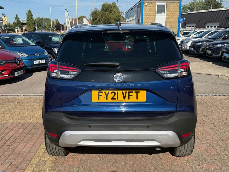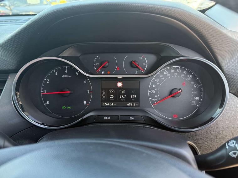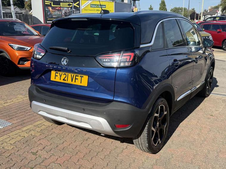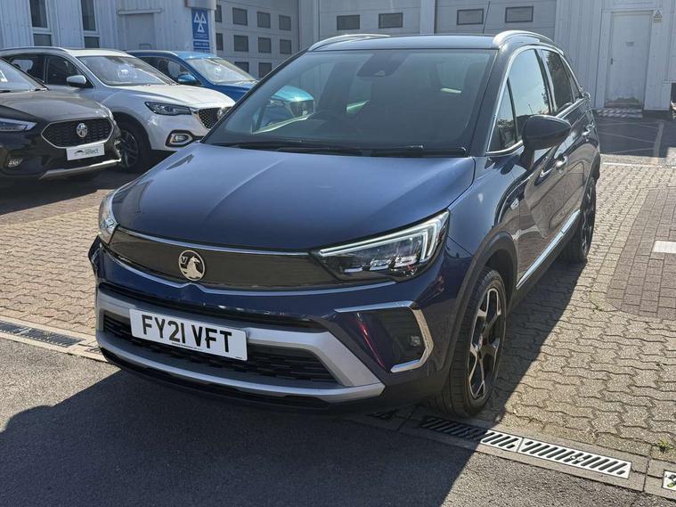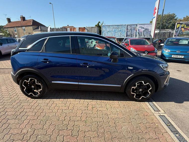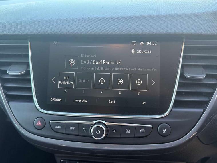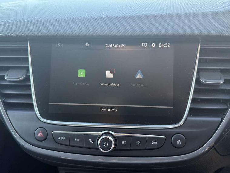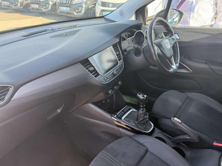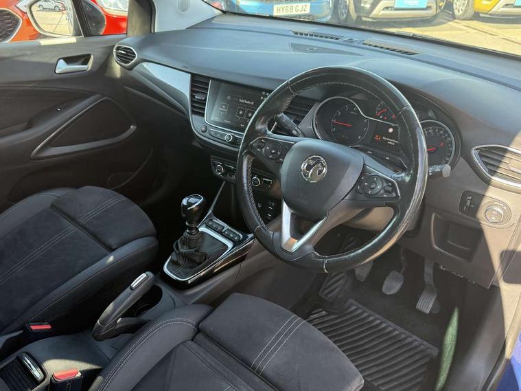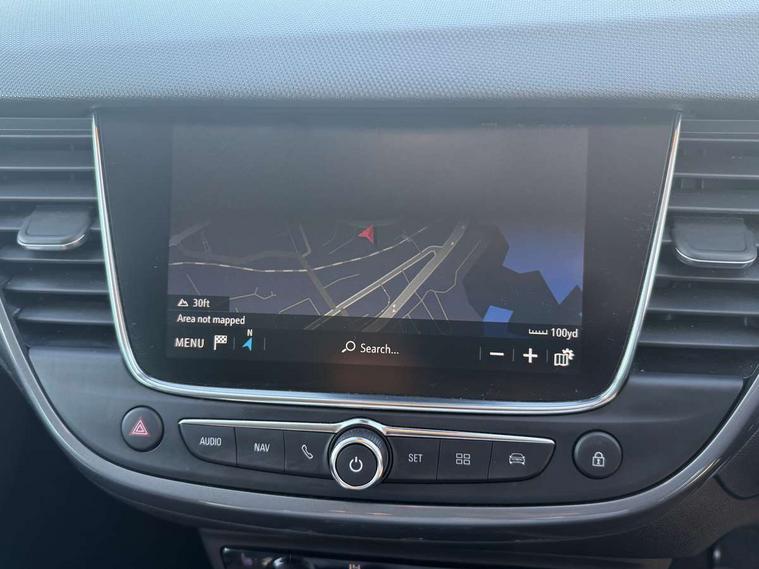 3.5" monochrome instrument colour display, Audible lights on warning, Bluetooth connectivity, Cruise control + speed limiter, Digital clock with automatic RDS time adjustment, Instrumentation - Speedometer, rev counter, low fuel gauge warning light + water temperature gauge warning light, shift up/down indicate light, Lane departure warning system, Multi function trip computer, Multimedia sat nav pro with 8" colour touchscreen, AM/FM, Bluetooth streaming, Bluetooth mobile phone portal, apple CarPlay/Android Auto + 6 speakers, Outside temperature display with ice warning, Refridgerant low indicator, Service interval indicator, Speed sensitive power steering, Speed sign recognition, Vauxhall connect, Wireless charger, Front wheel drive, 2 x USB connections, DAB Digital radio, Steering wheel mounted audio/phone/cruise controls, 2 speed wipers/wash wipe/intermittent wipe, Alloy effect front and rear skid plates, Automatic anti dazzle rear view mirror, Automatic headlamp levelling system, Automatic high beam control with cornering light, Automatic lighting control, Black radiator grille with chrome bar, Body colour door handles, Body colour front and rear bumpers, Chrome effect upper window moulding, Dark tinted rear side windows + tailgate window, Electrically adjustable and heated door mirrors, Front power windows with express up/down and anti-pinch function, Hazard warning lights, Headlamps for left side traffic, Heated rear window, Integrated tailgate spoiler, Intermittent rear wash/wipe, LED daytime running lights, LED front fog lights, LED Headlights, LED side repeat indicators, LED tail lights, Rain sensitive windscreen wipers, Rear fog lights, Rear power windows with express up/down and anti-pinch function, Reversing light, Side window demist vents, Silver effect side door mouldings, Silver roof rails, Silver skid plates - painted, Solar heat absorbing windscreen and windows, Two tone molding rocker with door side inserts in chroms, Welcome lighting, Windscreen demist vents, 12v power outlet - front, 12V power outlets on rear seat, 2 way front passive headrests, 3 spoke flat bottomed leather covered steering wheel with bezel decoration, 4 way electrically adjustable lumbar support for drivers seat, 4 way electrically adjustable lumbar support for front passenger seat, Adjustable rear seat backrest, Air recirculation facility, Alcantara suede/vinyl upholstery, Ambient lighting, Anti submarining ramps in front seats, Cabin particulate filter - removes dust, airborne particles and pollen, Driver and front passenger illuminated vanity mirrors with flip up covers, Dual zone electronic climate control, Ergonomic active front seats with 8 way manual adjustable driver and front passenger seats with height, reach, and backrest, Fade up/fade down on interior lighting, Four adjustable facia vents, Front door pockets with bottle holders, Front map reading lights, Fully carpeted luggage area, Glovebox with lid, Height adjustable front/rear head restraints, Illuminated load area, Interior courtesy light operated by all doors, Isofix system on outer rear seats, Jet black premium leather side bolsters, Luggage compartment cover, Multi-speed fan with Illuminated control, Open storage compartment in centre console, Passenger assist handles, Reach + rake adjustable steering column, Rear door pockets with bottle holders, Rear floor ventilation ducts, Rear reading lights, Satin chrome effect bezel on steering wheel, Seat cushion extension, Sliding 60/40 rear seat with centre rear seat armrest, Storage pockets on front seat backs, Two drinks holders in centre console, Uplevel centre console front centre armrest with storage, Rear view camera plus pack - Crossland, Versatility pack - Crossland, Winter pack - Crossland, 3x3 point rear seatbelts, 6 airbags - Driver and co-driver front, front side, head curtain roof airbags, front and rear row coverage airbags, ABS, Child locks on rear doors, CSC - Cornering stability control, Deactivate switch for side impact airbags, Deformation zones front and rear, Dual seatbelt pretensioners on front seats, EBD - Electronic brakeforce distribution, Energy absorbing steering column, Engine drag torque control, ESP + traction control, Front and rear seatbelt unfastened audible warning and warning light, Front side impact airbag, Hill start assist, Hydraulic Brake Assist (HBA), Hydraulic brake boost, Inertia reel lap and diagonal seatbelts for all seats, Passenger airbag deactivate switch, Rear seat belt pretensioners, Reinforced passenger safety cell, Seatbelt load limiter, Side impact protection beams, Smart seatbelt reminder for front and rear seats, Tyre pressure monitoring system, 2 remote folding keys, Electronically protected audio equipment, Engine immobiliser, Keyless entry and start, Locking wheel nuts, Remote central deadlocking, Remote control central locking activation switch on driver door, Remote control central locking operates on doors, tailgate and fuel filler flap, Remote security alarm system, Visible vehicle identification number, Black facia with silver trim insert, Black trim inserts on front doors, Cluster black with chrome rings, 17" five twin spoke diamond bi colour alloy wheels,