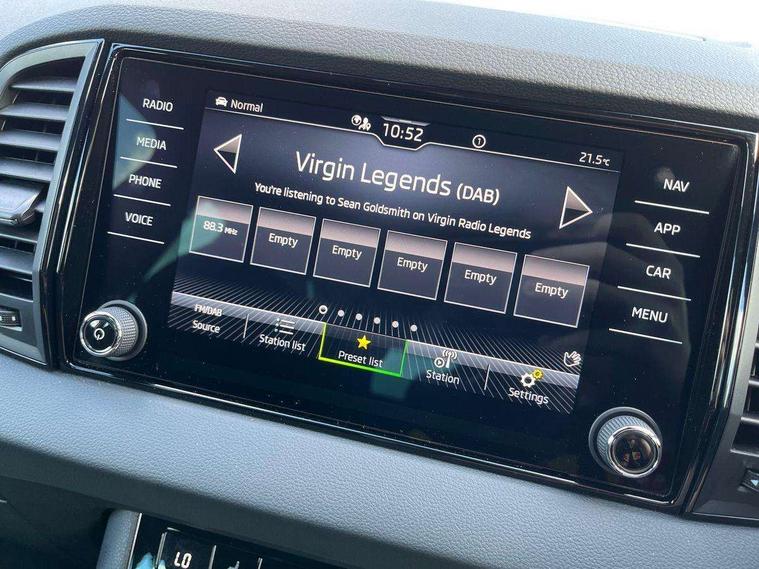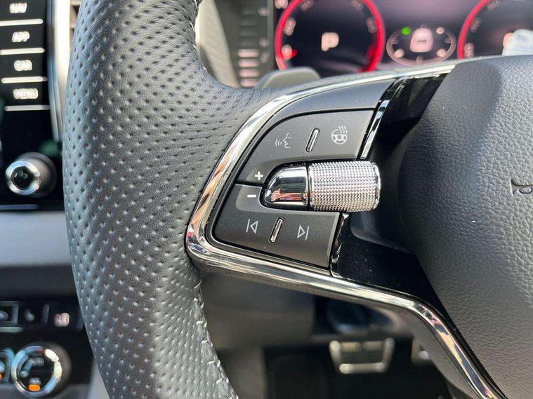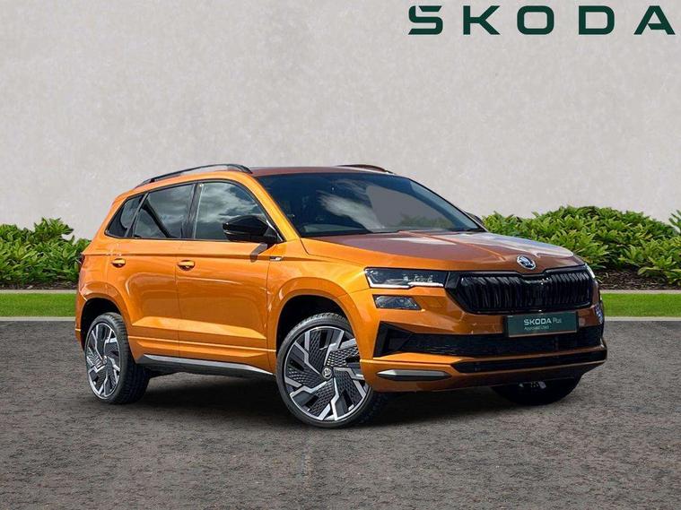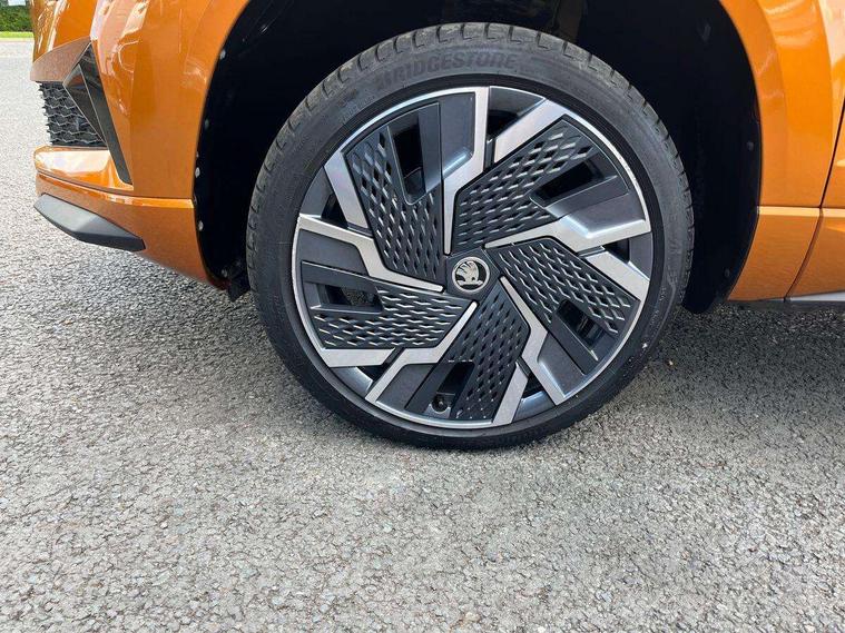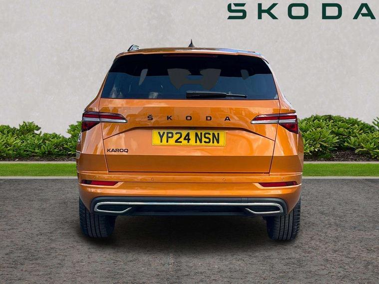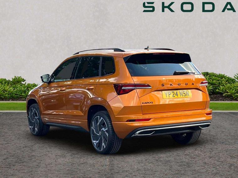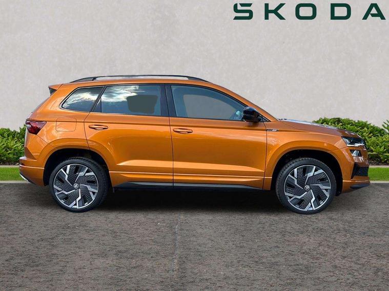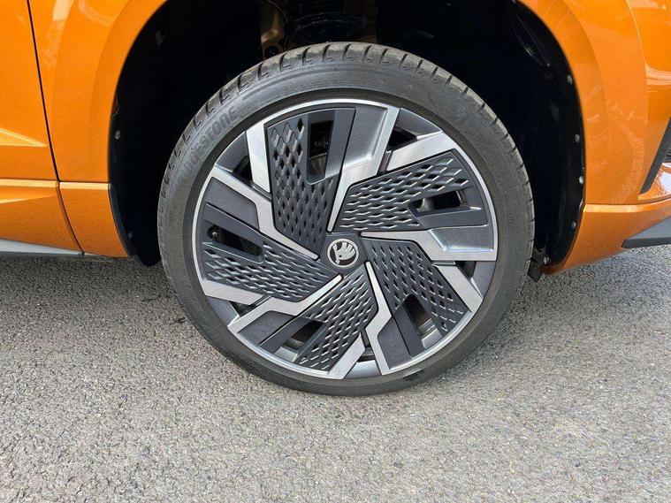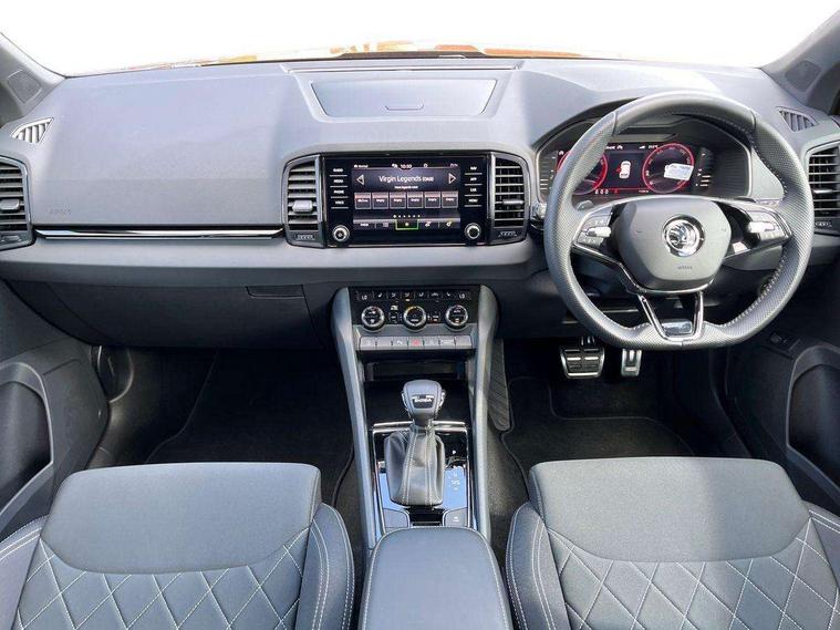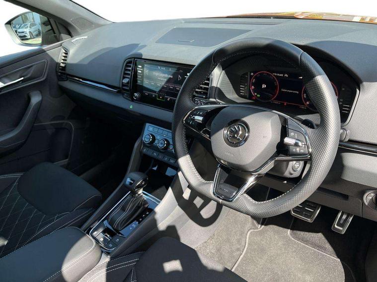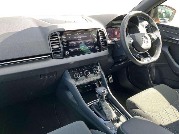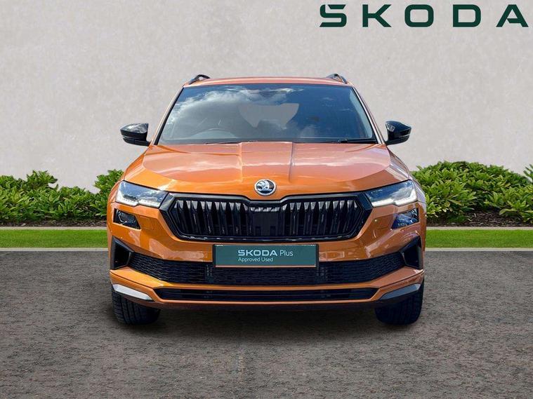 8" Digital display, Advanced driver attention and drowsiness monitor, Emergency services call system, Outside temperature gauge, Sensor for driver assistance systems, Service interval indicator, SmartLink wireless for Apple and wired for Android, Start/stop system with regenerative braking, USB C Port x 2 in front centre console, Virtual Cockpit - 10.25" digital display, Virtual pedal with electrically operated boot door, Wireless smartphone charging, Canton sound system, DAB radio with Bluetooth, USB connection, Acoustic glass, Aero front windscreen wipers with intermittent function, Auto dimming rear view mirror with light and rain sensors, Black door mirrors, Black electric window control buttons, Black radiator grille, Black roof rails, Body colour door handles, Electric front and rear windows with child proof lock, Front door steps with SportLine logo, Heated rear windscreen, LED 3rd brake light, LED daytime running lights, LED rear lights with high functionality welcome effect and dynamic indicators, Light assistant (coming/leaving home/tunnel light), Panoramic sliding sunroof, Plastic scuff plates in door apertures, Privacy glass, Protective door side sills in body colour, Rear diffuser, Rear side wing doors, Rear spoiler, Rear window wiper with washer system and intermittent control, Safety reflectors on front doors, Skoda lettering on tailgate in black, Sportline badge on front fender, Sportline decorative inserts with badging, Sports front and rear bumpers, 1.5 litre bottle holders in driver and front passenger door panels, 12V socket in boot, 12v socket in front centre armrest with storage compartment and rear air vents, 2 x Tablet holder, 3 rear height adjustable headrests, 3 seat bench in 2nd row, 3 spoke leather sports multifunction steering wheel and silver stitching with gear shift paddles, 4 foldable roof handles with rear coat hooks, Black floor carpet, Chrome inner door handles, Double sided boot floor, Foldable hooks in the boot, Front head restraints, Height adjustable front three point seats belts with tensioners, Height/reach adjust steering wheel, Ice scraper, Illuminated glovebox, Illuminated luggage compartment, Isofix child seat preparation for front passenger seat, Isofix child seat preparation outer rear, Manual lumbar support for front seats, Pen holder, Pollen filter, Rear boot cover, Rear reading lights, Rear seats fixed folding and divided 60:40, Rubbish bin door, Safety vest holder, Single front passenger seat, Storage box in upper central dashboard closed, Sunvisors with illuminated vanity mirrors, Textile floor mats, Ticket holder, Titan black interior ceiling, Umbrella under passenger seat, Under passenger seat storage compartment, Welcome animation with sportline logo, Light Pack - Karoq, Non Smokers pack, Automatic door unlocking in case of crash, Automatic fuel cut off in case of crash, Driver airbag, Electronic parking brake with auto hold function, Emergency rear braking signal, ESC including ABS, MSR, ASR, EDS, HBA, DSR, RBS, MKB and traction control, Front side airbags, Head airbags, Hill hold control, Knee airbags, Passenger airbag with switch-off function, Pedestrian monitor, Seatbelt reminder signalisation and pretensioner for all seats, Three point seatbelts rear, Two tone horn, Tyre pressure monitor, Alarm with interior monitoring, back up horn and tilt sensor with safe function, Electronic engine immobiliser, Keyless entry and start/stop, Remote central locking with 2 remote folding keys, Black air vent surround, Black centre console, carbon door decor, Satin black dashboard, Satin black door trim, 19" Sagittarius anthracite alloy wheels, Anti-theft wheel bolts protection, Breakdown and tool kit,