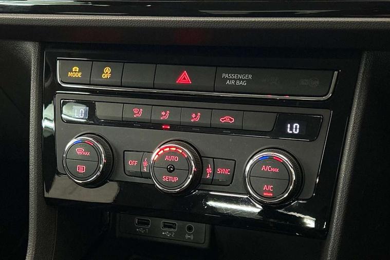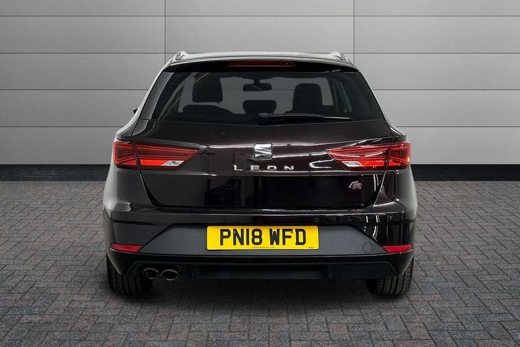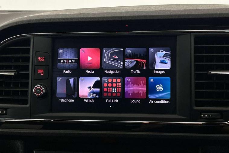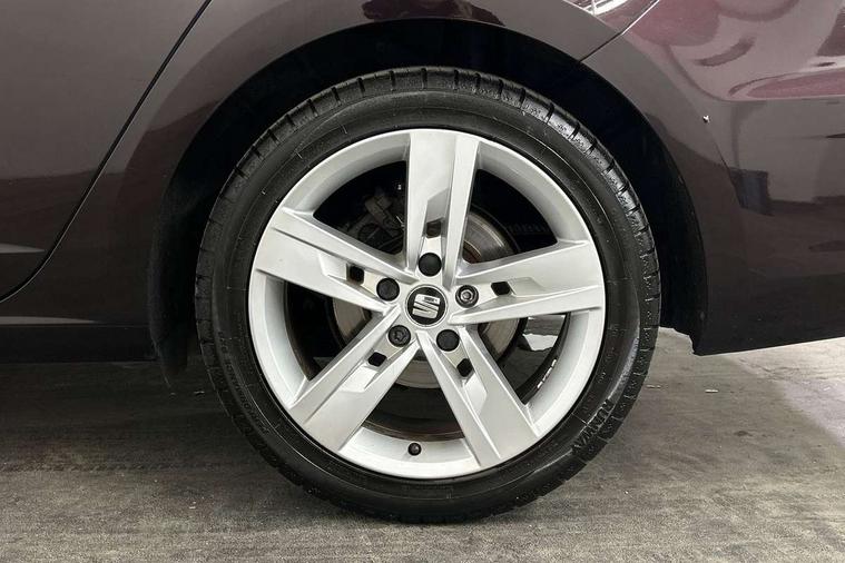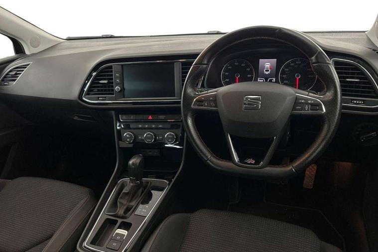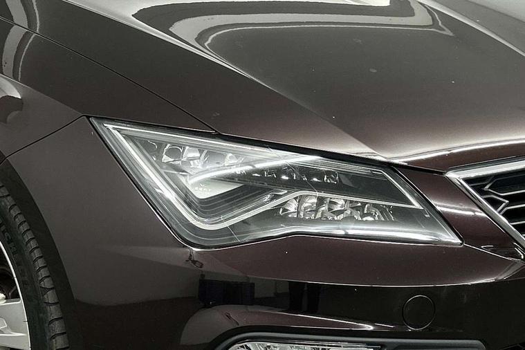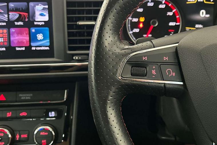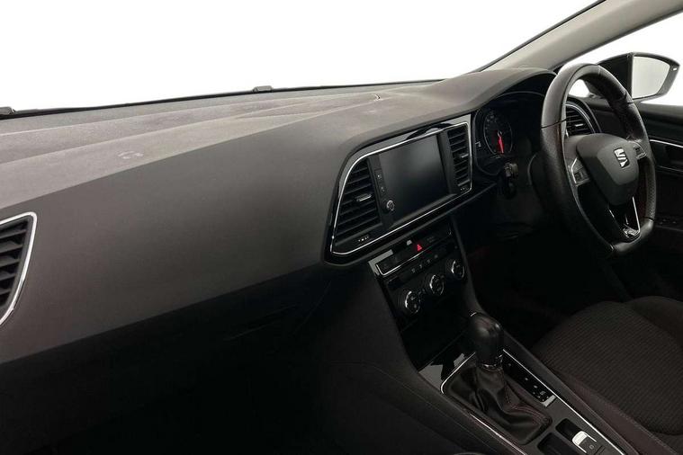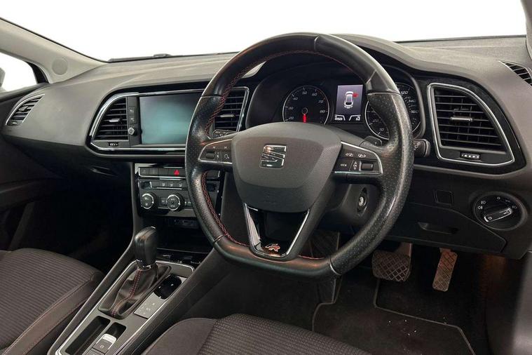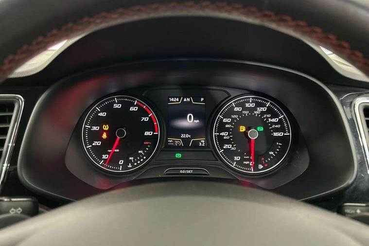 'Lights On' Reminder warning buzzer, 8" touch screen, Bluetooth Handsfree Phone Connection, Low fuel warning light, Outside temperature gauge, Rear parking sensors, Remote fuel flap release, SEAT Drive profile, SEAT logo boot release, Service interval indicator, Trip computer, Voice control system, XDS electronic differential lock, 2 USB ports, 2 USB sockets in rear, 2x SD card slot, Auxiliary input socket, Bluetooth audio streaming, DAB Digital radio, Radio/CD + MP3, Steering wheel mounted audio/phone controls, Aluminium front door sills, Black grille with chrome surround, Body colour door handles, Body coloured bumpers, Body coloured door mirrors, Dark tinted rear windows, Electric adjustable/heated/folding door mirrors, Electric front/rear windows with one touch/auto up/down, Electric headlamp adjustment, High gloss black finish B and C pillars, LED daytime running lights, LED front fog lights, LED Headlights, LED indicators in door mirrors, LED number plate light, LED tail lights, Rear wash/wipe, Reverse activated kerb-view adjustment on passenger's door mirror, Twin exhaust pipes, 12v power point in centre console, 3 height adjustable rear headrests, 60/40 split folding rear seat, Active head restraints, Additional heating and ventilation outlet in rear of centre console, Boot net, Chrome loading sill, Double boot floor, Driver seat height adjust, Driver seat lumbar adjustment, Driver/passenger sunvisors with illuminated vanity mirrors, Dual zone climate control, Dust/pollen filter, Front adjustable head restraints, Front armrest with storage box, Front cupholders x 2, Front map reading lights, Front seat and rear pockets, Front sports seats, Front/rear floor mats, Height/reach adjust steering wheel, Illuminated door sills, Illuminated glovebox, Instrument lighting with brightness control, Leather handbrake, Luggage compartment cover, Luggage tie-down hooks, Passenger seat height adjuster, Passenger seat lumbar adjust, Perforated leather steering wheel with red stitching + gear knob, Rear reading lights, Rear top tether child seat ISOFIX attachment, Rear window curtains, Steering wheel gearshift paddles, Storage boxes under front seats, 3 point seatbelts on all rear seats, ABS + traction control, Active pedestrian safety system, Child proof door locks, Collision mitigation braking system, Curtain airbags, Driver/Front Passenger airbags, Drivers knee airbag, Electronic parking brake with auto hold, ESP+EBA, Front assist including city emergency braking, Front seatbelt pretensioners, Front Seatbelt warning, Front side airbags, Hill hold control, Passenger airbag deactivation system, Tyre pressure monitoring system, 2 folding remote keys with window open/close function, Engine immobiliser, Locking wheel bolts, Remote central locking + deadlocks, Volumetric alarm with back up horn, Chrome interior trim,