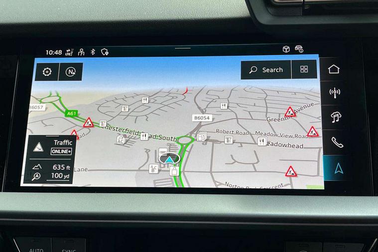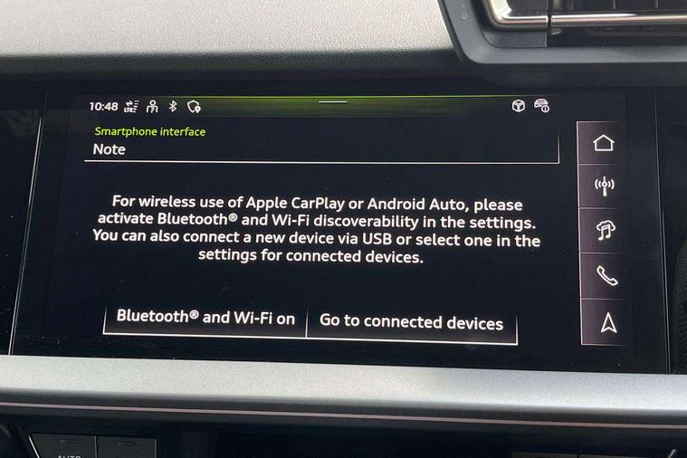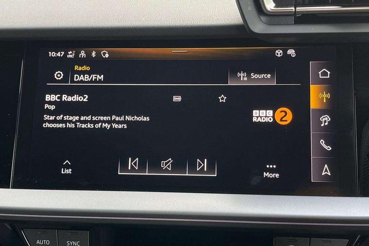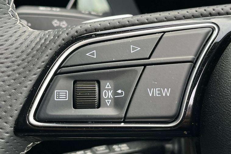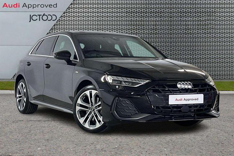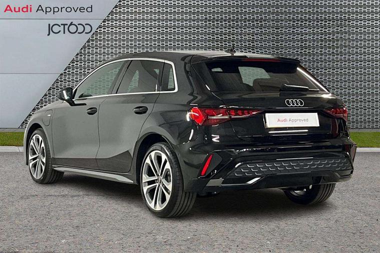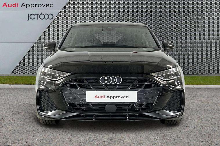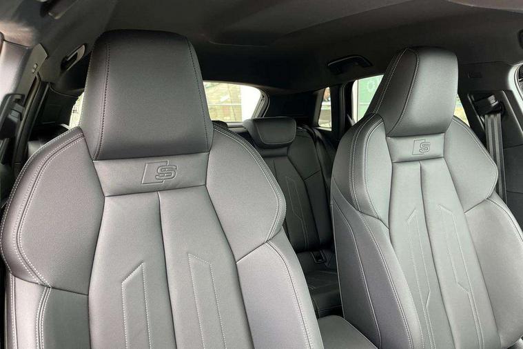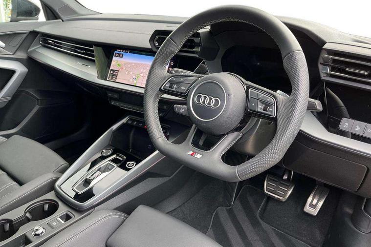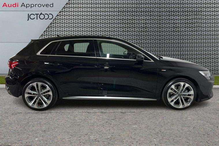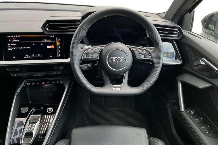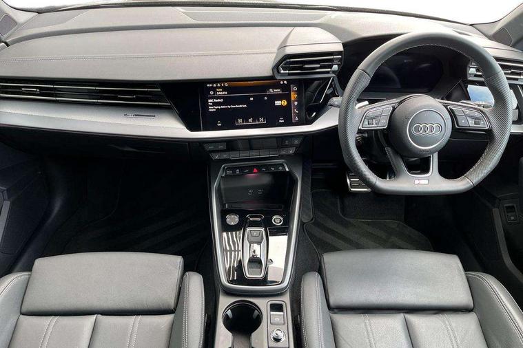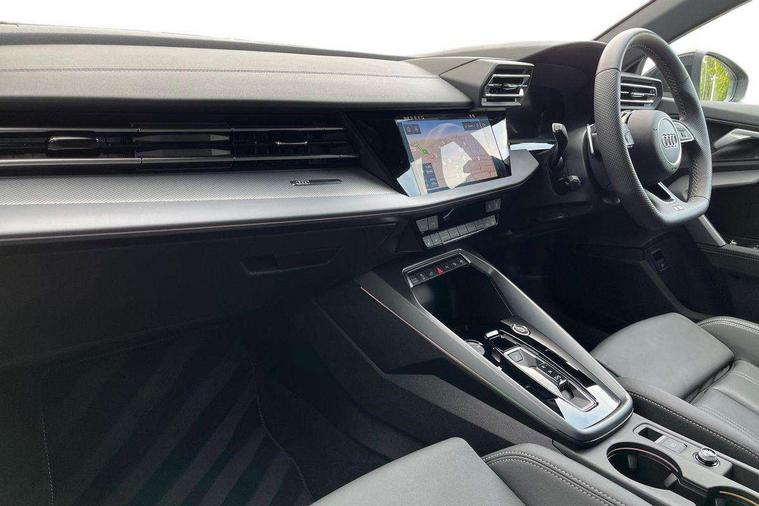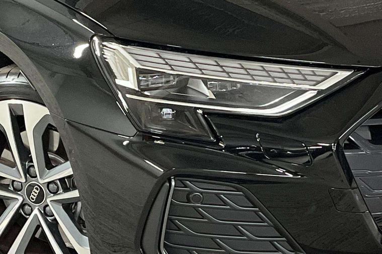 Adjustable speed limiter, Audi drive select, Audi smartphone interface with app store includes wireless Apple carplay, Android auto and Amazon alexa integration, Audi virtual cockpit plus - 12.3" full HD resolution dynamic digital instrument cluster, Automatic start/stop system with recuperation, Bluetooth interface, Camera based traffic sign recognition, Collision avoidance assistant, Cruise control, Distraction and Fatigue warning, e-Call (emergency call), Electromechanical power speed sensitive steering, Lane departure warning system, MMI Navigation Plus with high resolution 10.1" colour touch screen display, Park Assist with parking system Plus, Service indicator, Trip computer, Voice control system with natural language interaction, 3 pin 10 amp domestic charging cable, CCS socket for DC charging, Charging cable for public charging, mode 3 (type 2), up to 22 kW (AC), Compact charging system, Industrial connector CEE 32 A, 230 V, length 1.6 m, Standard suspension, Type 2 socket for AC charging, Audi Phonebox light with wireless charging, Audi sound system - 10 loudspeakers including centre loudspeaker and subwoofer, DAB Digital radio, USB ports with charging function in the rear, Acoustic glass windscreen, Aluminium window trim, Auto dimming frameless rear view mirror, Body colour exterior mirrors, Chrome exhaust tailpipes, Electrically adjustable/heated/folding/auto dimming door mirrors with integrated LED indications + kerb view function for passenger side, Exterior model badging, Front and rear side air inlets in grained matt black with dark liquid chrome frame, Front electric windows, Front radiator grill in high gloss dark chrome, Heat insulating glass windscreen, Illuminated door sills with aluminium inserts at the front with S logo, LED 3rd brake light, LED daytime running lights, LED headlights with LED rear lights and dynamic rear indicators, Light and rain sensors, Privacy glass - dark tinted rear window, rear door and side windows, Rear diffuser and grill in grained matt black with inlay in dark liquid chrome, Rear electric windows, Rear side wing doors, Rear wiper, S line bumpers, S roof spoiler, Side S line emblems on front wings, Side sill trim in dark liquid chrome, 12V socket and storage compartment in front centre console, 3 seat bench in 2nd row, 3 spoke flat bottomed leather multifunction sport steering wheel with gear shift paddles, 3-zone deluxe automatic air conditioning, 4 way electrically adjustable lumbar support for driver and front passenger, 40/20/40 split folding rear seat bench, Black cloth headlining, Convenience auxiliary air conditioning, Front and rear centre armrest in artificial leather, Front and rear centre armrest in artificial leather with contrasting stitching on armrests and instrument panel, Front and rear headrests, Front/rear floor mats, Heated front seats, Height and reach adjustable steering wheel, Manual boot compartment lid, Manually adjustable front seats, Rear cup holders, S badging on the steering wheel, Seat side bolsters, Single front passenger seat, Stainless steel pedals and front footrest in black, Twin leather upholstery with front sports seats S embossed logo, Aluminium interior elements pack - A3 Sportback, Multi-coloured LED interior lighting package - A3, 3x3 point rear seat belts, Acoustic vehicle alerting system, Driver and front passenger airbag with passenger airbag deactivation, Electronic Stabilisation Control (ESC) including ABS, ASR and EDL, First aid kit with warning triangle and 2 safety vests, Front side airbags with head airbags and interaction airbag, Hill hold assist, Pre-sense front with pedestrian and cyclist detection, Seatbelt monitoring, Tyre pressure loss indicator, Anti theft alarm, Anti-theft wheel bolts, Electronically operated child locks, Immobiliser, Remote central locking with safelock, Dash & door Inlay in dark aluminium Spectrum, Tyre repair kit,