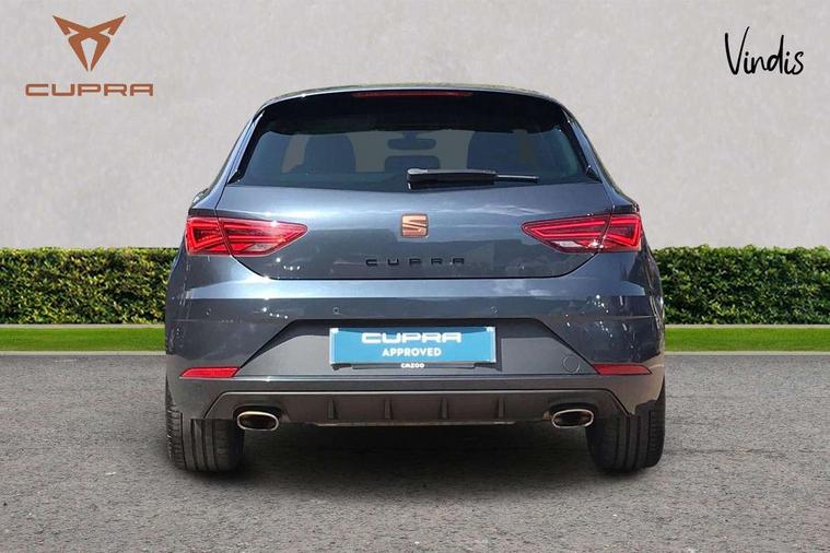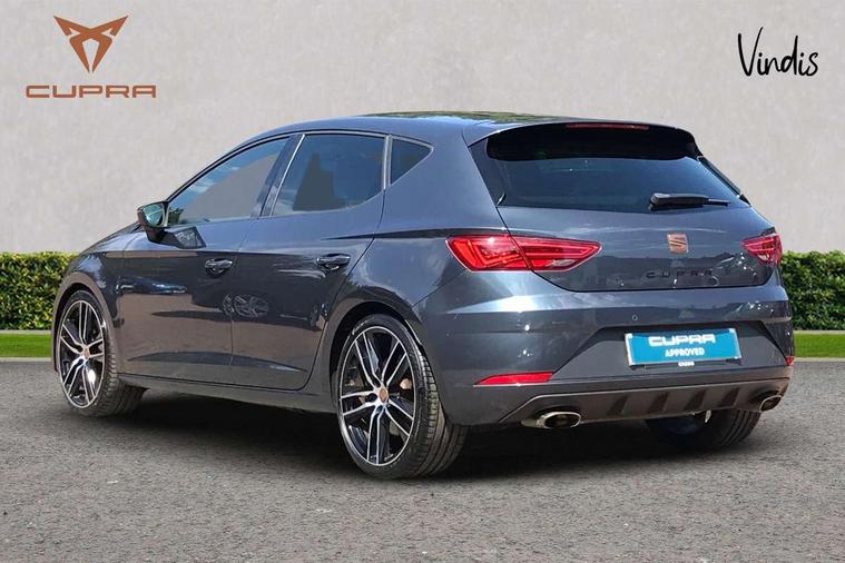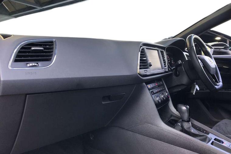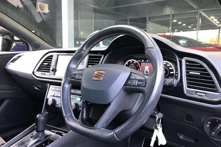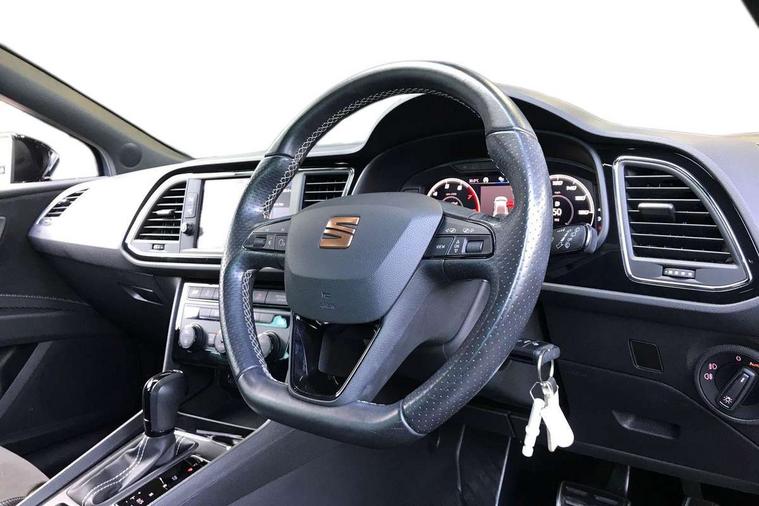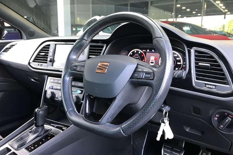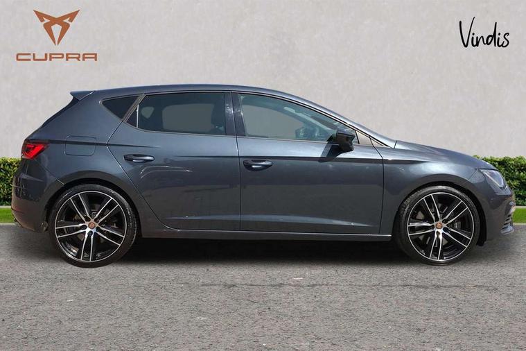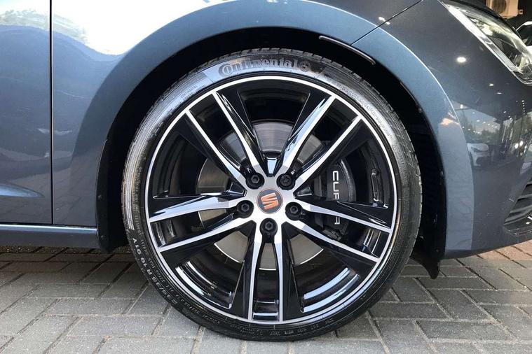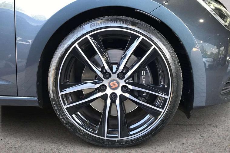 CUPRA performance interface, Digital cockpit, Electro-mechanical progressive power assisted steering, Front and rear parking sensors, Front assist with pedestrian protection, Full Link Smartphone Integration with Mirror Link, Apple Car Play, Google Android Auto with USB Type C cable for Apple and Android compatibility, Media system plus with 8" display, 4 USB, 8 speakers, CD, voice control, DAB, bluetooth and handsfree, steering wheel mounted audio and phone control, Navigation system 3D map display, high resolution colour driver display, two SD card slots, RPM, trip computer, outside temp gauge, instrument light brightness, low fuel warning light, lights on reminder, gearshift indicator, SEAT drive profile CUPRA with 4 mode (Cupra/Normal/Sport/Individual), throttle response, sound actuator and gearshift, SEAT logo boot release, Service interval indicator, Dynamic chassis control, Lowered sports suspension, Auxiliary input socket, SEAT USB media cable, Black front grille, Body colour door handles, Body coloured bumpers, Dark tinted rear windows, Electric folding door mirrors, Electric front/rear windows, Electrically adjustable and heated door mirrors, Exclusive Cupra front and rear bumpers, Full LED headlights with LED day time running lights + LED rear tail lights + LED licence plate lights and LED front and rear fog lights, Gloss black exterior mirrors with integrated LED indicators, Gloss black front grille frame, High gloss black finish B and C pillars, Illuminated aluminium front door sill with CUPRA logo, Rear wash/wipe, Visible dual exhaust pipes, 12v power point in centre console, 60/40 split folding rear seat with armrest, Additional heating and ventilation outlet in rear of centre console, Aluminium pedals, Black interior roof, Boot storage net, Cargo rings in boot, Driver and passenger seat height adjust, Driver and passenger sun visor, covered and illuminated mirror, driver sun visor with card holder, Driver seat lumbar adjustment, Dual zone climate control, Dust/pollen filter, Flat bottomed perforated leather steering wheel with white stitching and CUPRA logo and leather gear knob, Front and rear head restraints, Front centre armrest with storage compartment, Front cupholders x 2, Front passenger seat lumbar adjustment, Front seatback storage pockets, Front sport seats in microsuede, Front/rear floor mats, Height adjustable front and rear headrests and third rear headrest, Height/reach adjust steering wheel, High centre console with integrated box & cup holder, rear air outlet, with armrest in front seats, Interior copper and black detailing, ISOFIX points in outer rear seats with top tether anchorage points, Luggage tie-down hooks, Multi-colour ambient interior lighting, Steering wheel gearshift paddles, Storage box under drivers and passenger seat, Convenience pack+ - Leon, 3 point seatbelts on all rear seats, ABS, traction control system and front differential lock system, Child proof door locks, Driver and front passenger airbags with front passenger airbag de-activation, front side, curtain, driver knee airbags, EBA, Electric handbrake, Electronic parking brake with auto hold, ESC with switch off key, Front and rear black brake calipers with cupra logo, Front seatbelt pretensioners, Front seatbelt reminder, Hill hold control, Multi-Collision braking, Tyre pressure monitoring system, 2 folding remote keys with window open/close function and boot opening/door mirror folding function, Central locking fuel filler cap, Engine immobiliser, Locking wheel bolts, Remote central locking + deadlocks, Volumetric alarm with back up horn, Gloss black interior detailing, 19" Cupra Machined alloy wheels 30/2, Space saver spare wheel,