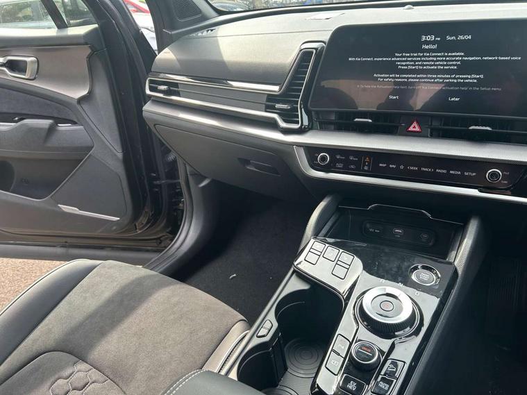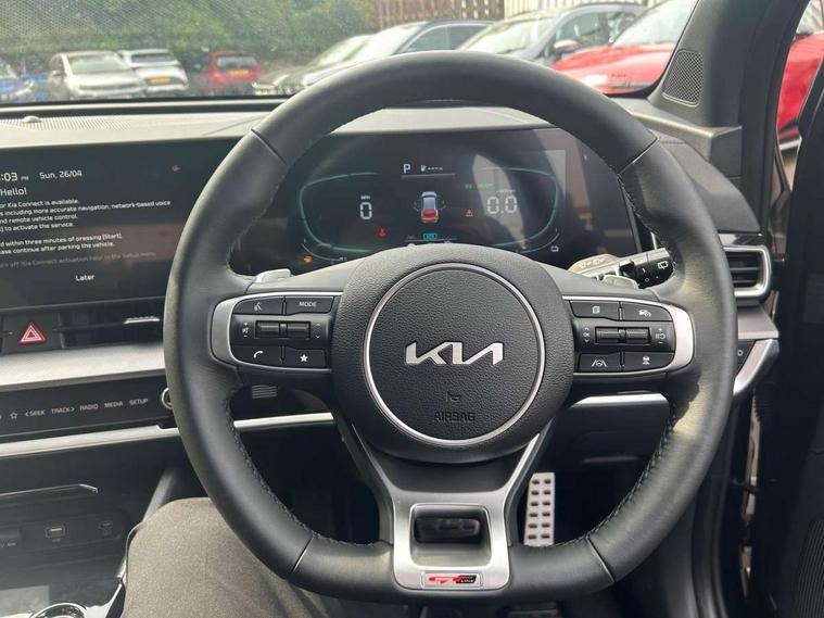 12.3" Touchscreen navigation system, 2 rear USB-C ports, 4.2" driver display screen, Apple car play/Android Auto, Drive mode selector, Driver attention warning, E-call, Emergency stop signalling system, Forward collision avoidance assist (FCA) - city/pedestrian/cyclist/junction covering, Front and rear parking sensors, Highway Driving Assist (HDA), Intelligent speed limit assist, Kia Connect (UVO), Lane Following Assist (LFA), Lane keep assist, Low washer fluid warning, Motor driven power steering, Rear view monitor, Reversing camera system integrated into centre fascia screen, Smart cruise control with stop and go functionality, Speed limiter, Tailgate, Trip computer, Windscreen washer level indicator, Terrain mode select (Mud, Snow, Sand), 1x USB-C port in front, 6 speaker audio system, Bluetooth audio streaming, DAB Radio with MP3, Steering wheel mounted audio controls, USB C type charging ports on centre console, USB port for connection of a media device, All round electric windows with drivers and front passenger auto up/down function, Auto dimming rear view mirror, Automatic headlight control system, Automatic window defogger, Black and body coloured bumpers, Body colour exterior door handles, Body colour radiator upper garnish and door garnish, Electrically adjustable/heated/folding door mirrors with LED indicators, Front and rear chrome skid plates, Gloss black door mirrors, Gloss black radiator grille, Gloss black side sill and wheel arch body mouldings, Glossy black roof rack, GT-Line exterior styling, Heated rear window, High beam assist, Interior electrochromic mirror, LED daytime running lights, LED front fog lamps, LED headlamps (low and high beam - MFR type), LED High mounted stop light, LED rear combination lamp, Rain sensing wipers with aero blades, Rear fog lamp, Rear privacy glass, Rear side wing doors, Rear spoiler, Rear wiper, Satin finished beltline, Silver window surround, Tinted rear glass, Trailer stability assist, 12V power socket in front centre fascia and luggage compartment, 2nd row personal lamps, 3 seat bench in 2nd row, 3 x passenger assist grips, 40/20/40 split folding rear seat, All-round height adjustable headrests, Alloy pedals, Automatic air conditioning, Black headlining, Centre console storage box, Cupholders in rear armrest, Door courtesy lamps, Drink holder at centre armrest, Driver and front passenger side sunvisors with illuminated vanity mirrors, Driver's seat manual height adjust, Drivers seat power lumbar support, Front and rear door storage, Front Cabin, Rear & Luggage Compartment Lights, Front passenger's seat manual height adjustment, Front seat and rear pockets, Gear shift indicator, Glovebox illumination, GT-Line Interior Styling, Heated front seats, Heated steering wheel, ISOFIX Child seat top tethers and anchor fixings outer rear seats, Leather steering wheel, Luggage area load cover, Luggage area parcel shelf, Luggage board, Luggage compartment under floor storage, Luggage net with hooks, Manual adjust steering wheel, Metal paint interior door handles, Overhead console lamp, Paddle shift controls, Rear air conditioning, Rear cabin light, Rear coat hooks, Single front passenger seat, Suede leather upholstery, Ventilation ducts to rear compartment, Active front headrests, All round 3-point seatbelts, Anti-lock braking system (ABS), Dual front side airbags, Dual horn, Dynamic brake control, Electronic parking brake with auto hold function, Electronic stability control with downhill brake control, Front passenger airbag cut-off switch, Front seatbelt pretensioners + load limiters, Height adjustable front seatbelts, Hill start assist control (HAC), Impact sensing auto door unlocking, Multi collision brake assist, Rear airbags, Rear door child safety locks, Rear seat alert system, Seatbelt reminder warning, Traction control, Twin curtain airbags, Twin front airbags, Tyre pressure monitoring system, Vehicle stability management, Customisable automatic door locking, Customisable automatic door unlocking, Door deadlocks, Engine Start/Stop Button with Smart Entry System, Locking wheel nuts, Smart key with motion sensor, Speed sensitive auto door locking, Thatcham category 2 security alarm and immobiliser, Visible vehicle identification number, Aluminium pattern finish centre fascia and door garnish, 19" GT-Line alloy wheels, Tyre mobility kit,