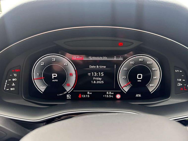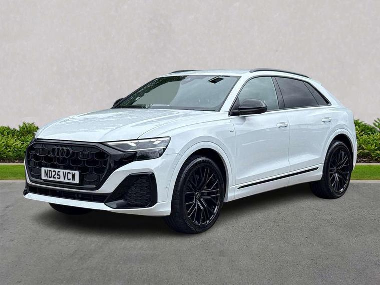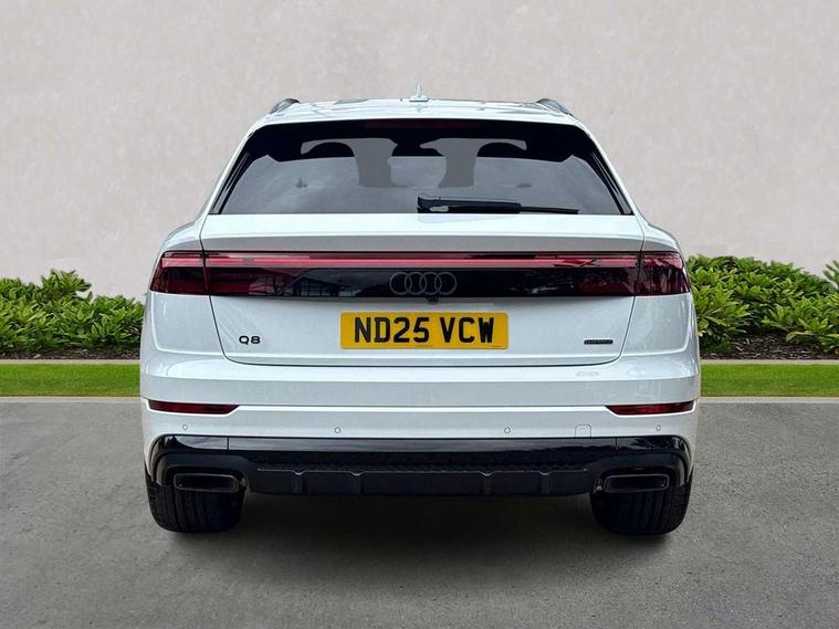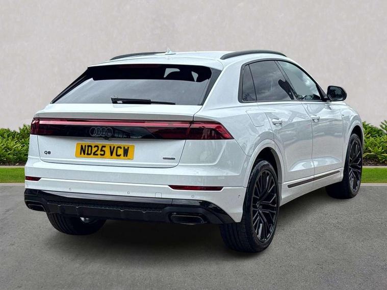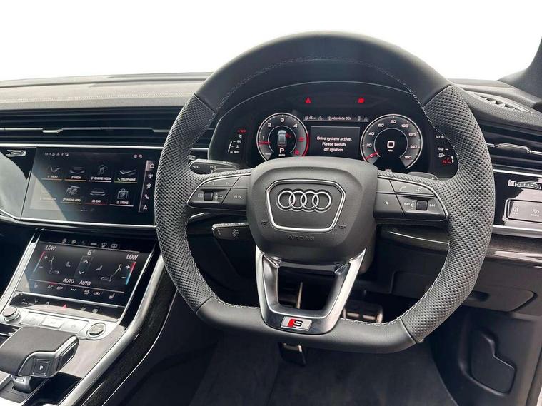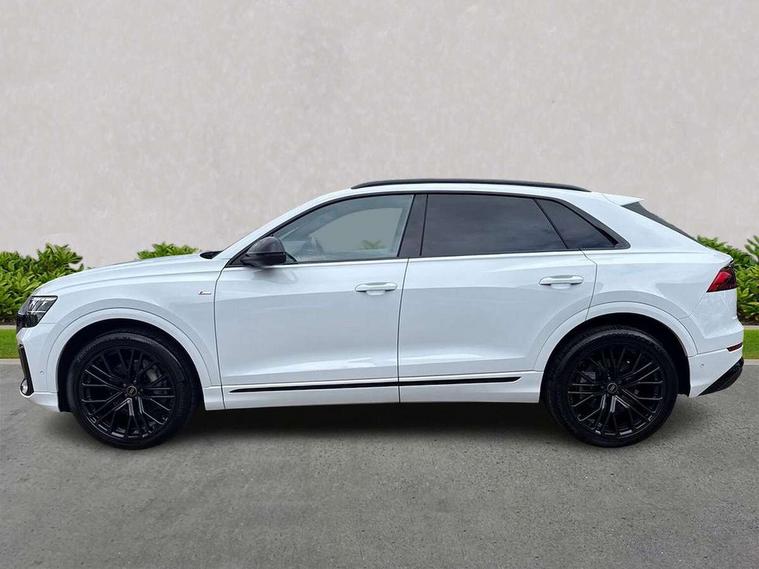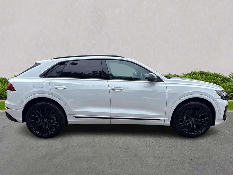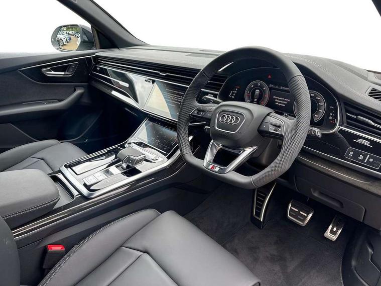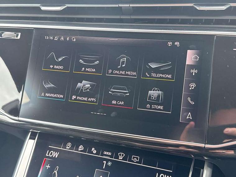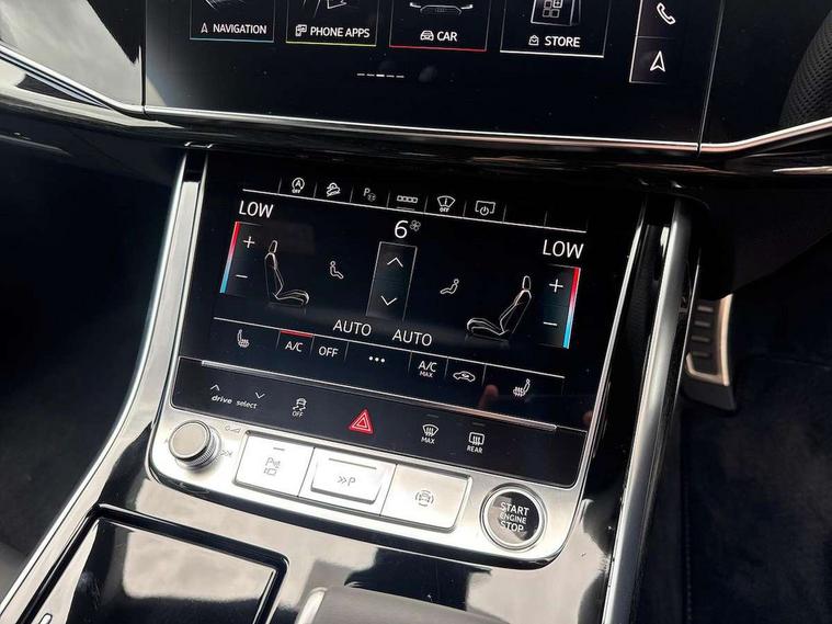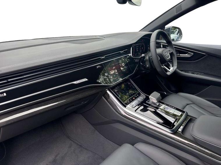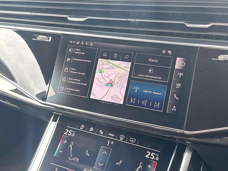 10.1" and 8.6" Dual colour touchscreens, 360 degree camera with top view, Audi application store, Audi connect safety and service (e-call), Audi connect with Amazon Alexa Integration, Audi drive select, Audi phone box light with wireless charging, Audi smartphone interface includes wireless Apple carplay/Android Auto, Audi virtual cockpit - 12.3" high resolution LCD display with fully customisable instrument cluster, Automatic start/stop system, Bluetooth, Electro-mechanical PAS, Head up Display, Low washer fluid indicator, MMI navigation plus with MMI touch, Natural voice recognition, On board computer, Operating buttons in black, glass look with haptic feedback, Park assist with parking aid plus, Power operated tailgate, Service interval indicator, 48V Mild hybrid technology, Adaptive sport air suspension, Diesel particulate filter, Quattro all wheel drive with self locking centre differential, Audi music interface with 2 USB ports with charge and data functions, Aux-in socket, Bang + Olufsen sound system, DAB Digital radio, 3rd brake light, Audi beam, Auto dimming frameless rear view mirror, Black exhaust tailpipes, Black single frame mask, Coming/leaving home lighting function, Electric front+rear windows, Electrically folding auto dimming/adjustable/heated door mirrors with memory function, LED side indicators and kerb view function for passenger side, Headlight washers, Heat insulating glass in windshield, LED rear light plus, LED signature daytime running lights, Matrix LED headlights with dynamic front and rear indicators, Platinum grey front spoiler lip and diffuser insert with honeycomb grille in black, Privacy glass - dark tinted rear and rear side windows from B-pillar backwards, Rain and light sensors, Rear side wing doors, Rear wiper, 2 zone automatic climate control, 3 bench rear seats in 2nd row, 4-way lumbar support for front seats, 40:20:40 split folding rear bench seat, Black cloth headlining, Comfort front centre armrest, Driver seat memory function, Electrically adjustable front seats, Front head restraints, Front/rear floor mats, Heated front seats, ISOFIX child seat mounting for front passenger seat and 2 outer rear seats with top tether child seat mounting for all 3 rear seats, Luggage compartment sill protection in stainless steel, Rear centre armrest with 2 cupholders, Rear headrests, Seat cushion displaceable by 100mm in the ratio 60:40, Single front passenger seat, Stainless steel pedals, Sunvisors with illuminated vanity mirrors, Tool kit, Ambient lighting package plus - Q8, Black styling pack plus - Q8, 3 point seatbelts on all seats, Audi pre sense front, Driver and front passenger, front side and curtain airbags, Electromechanical parking brake, Electronic Stability Control (ESC) including ABS, ASR and EDL, Front passenger airbag deactivation, Hill descent control, Hill hold assist, Predictive pedestrian protection, Seatbelt monitoring, Traction control, Tyre pressure loss indicator, Warning triangle and first aid kit, Anti theft alarm with tow away protection, Anti-theft wheel bolts and wheel loosening detection, Electronically operated child lock, Immobiliser, Keyless go with remote central locking, Polished oak trim with grey finished, Tyre repair kit,