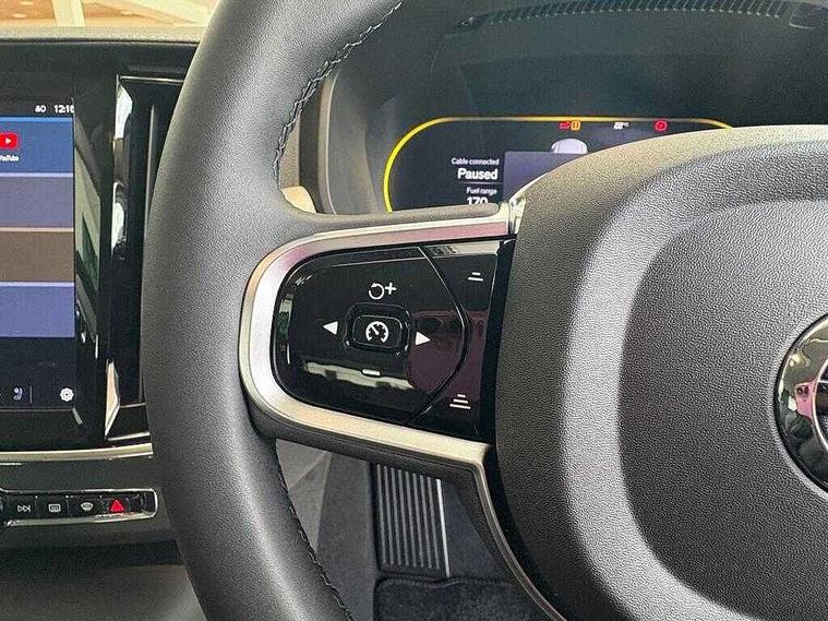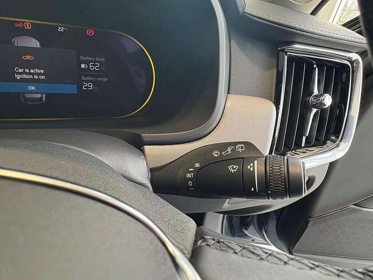 12.3" Progressive Driver Display, 360 degree surround view parking camera with side proximity sensors, 9" centre console touch screen, Adjustable steering wheel force, Apple CarPlay and Android Auto, Bluetooth handsfree system, Drive mode settings, Driver alert control with lane keeping aid, Driver assistance (pilot assist and adaptive cruise control), Driver awareness - Blind spot system + steer assist, cross traffic alert with autobrake, rear collision warning and mitigation, E-call, Emergency assist, Front and rear park assist, Google automotive services - Enabled entertainment apps, navigation with google maps, voice recognition with google assistant, Handsfree bootlid opening/closing, Intelligent speed assistance, Oncoming Lane Mitigation, Power operated tailgate/boot lid, Speed sensitive steering, Volvo on call app, 6m 3 phase 16amp Type 2 / mode 3 charge cable, 8 speed automatic transmission with start/stop + manual change functions, Dynamic chassis, Electric rear axle drive, Lithium-Ion Battery 18.8kWh, On board charger - 6.4 kW 2 phase/3.7kW single phase, Recharging port located in nearside front wing, DAB Radio (Digital Audio Broadcasting), Low speed exterior sound speaker, Premium Sound by Harman Kardon, dirac unison, dolby pro logic II surround sound, 13 speakers/600W output and fresh air subwoofer, Steering wheel remote infotainment controls, Adaptive brake lights with high level LED brake lights, Auto dimming interior + exterior mirrors, Automatic headlight levelling system, Automatic LED Headlights + Active high beam incorporating daytime running lights, Front and rear power windows, Heated windscreen, High gloss black door mirrors and window surround, High gloss black front and rear bumper decoratives, High gloss black mesh front grille and surround, Home safe and approach lighting, Integrated roof rails in high gloss black, Power heated autofolding door mirrors, Puddle lights, Rain sensor with automatic windscreen wiper activation, Rear LED lights with sequential indicators, Rear side wing doors, Rear wiper, Roof antenna, Roof spoiler, Variable front intermittent wipers, Visible VIN plate, 2 zone electronic climate control with Clean zone air quality system + pollen filter, 3 seat bench in 2nd row, 3 Spoke tailored steering wheel with chrome trim, Air purifier particulate matter (PM) 2.5 filter, Ambient door and instrument panel lighting, B Pillar ventilation, Boot lid/tailgate illumination, Bright metal luggage scuff plate, Cargo divider with grocery bag holder, Centre console cupholder and storage, Charcoal carpets and floor mats, Driver and front passenger seat power height adjustment, Extended front seat cushions, Front 12V socket tunnel console and cargo area, Front and rear cabin courtesy light, Front and rear door pocket lights, Front and rear footwell and side step illumination, Front and rear reading lights and centre armrest Storage Illumination, Front headrests, Glovebox compartment with illumination, Heated front seats, Heated rear seats outer positions, Heated steering wheel, Height/reach adjustable steering column, Illuminated luggage compartment, Illuminated recharge aluminium tread plates, Illuminated vanity mirrors + ticket holder, Illumination front tunnel storage, Inner door release handle illumination, Integrated sun curtains in rear doors, ISOFIX attachment on outer rear seats, Leather upholstery, Load cover, Load protection net, Luggage compartment load hooks, Memory function for drivers seat and exterior mirrors, Multi directional lumbar support, Power folding rear headrests, Rear armrest with cupholder, Single front passenger seat, Underfloor cargo storage, Versatile split folding rear seat - 60/40, 3x3 point rear seatbelts, Active bonnet, City safety with steering support with Pedestrian + cyclist + front collision warning with full auto brake and rear auto brake, Driver and front passenger airbags, Drivers knee airbag, Front seats SIPS airbags, Hill start assist, IC (Inflatable Curtains) - Full Length, Passenger airbag cut-off switch, Power child locks on rear doors, Power parking brake with auto hold function, Road sign information display, Run off Road Mitigation, Run off Road Protection, Seatbelt reminder and pretensioners for all seats, SIPS (Side Impact Protection System), Slippery road and hazard light alert, Stability and Traction Control with Spin control, Engine Drag Control and Corner Traction Control, Tyre pressure monitoring system, Vehicle deceleration control with Anti-lock Brake System, Electronic Brake Distribution and Emergency Brake Assist, Warning triangle and first aid kit, WHIPS whiplash protection system - front, 2x Key integrated remote control central locking + fuel flap with deadlocking system and auto open/close power windows, Anti-theft alarm including immobiliser/volume sensor + level sensor, Care key with user defined top speed, Keyless drive includes keyless entry and keyless start, Locking wheel nuts, Private locking for tailgate, Tailored Instrument Panel and Door Tops with Contrast Stitching, 19'' 8 spoke diamond cut black alloy wheels, Tyre sealant kit and compressor,