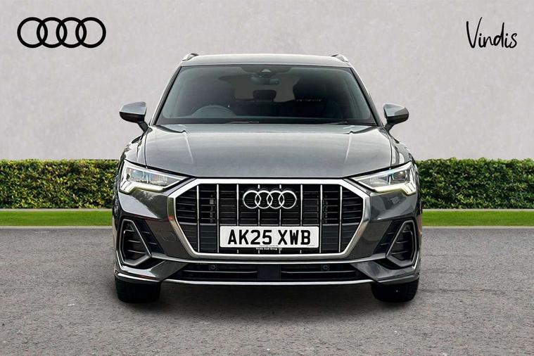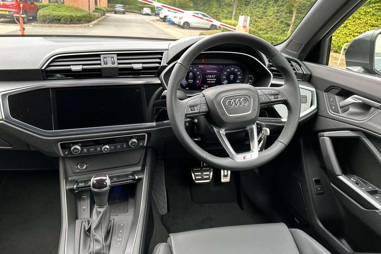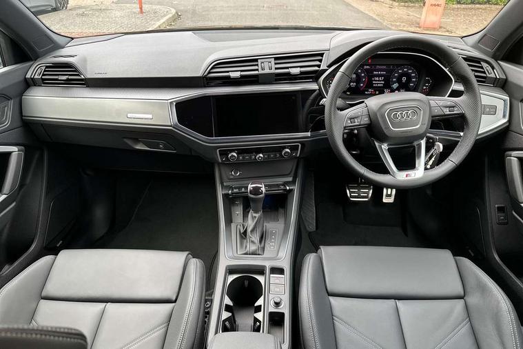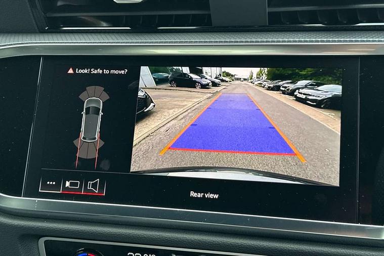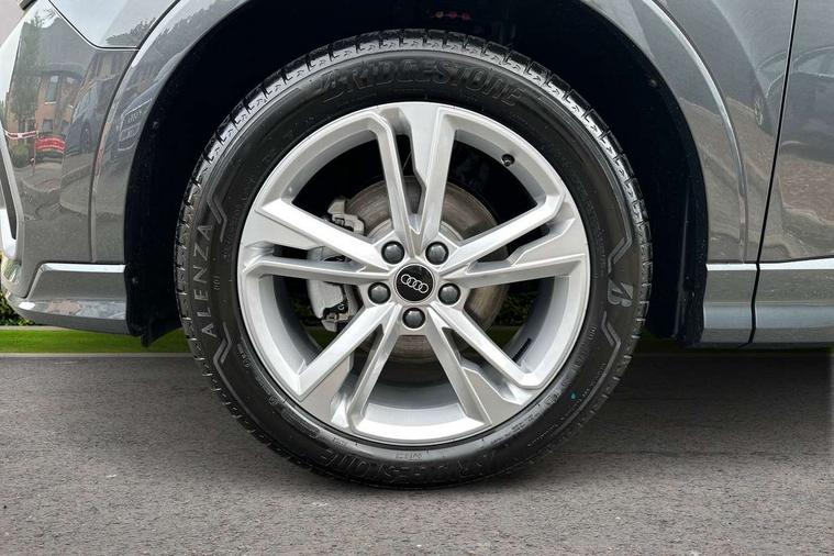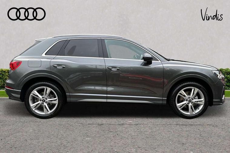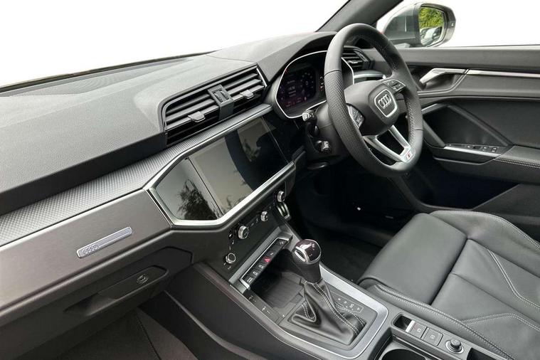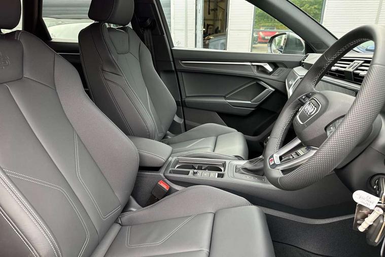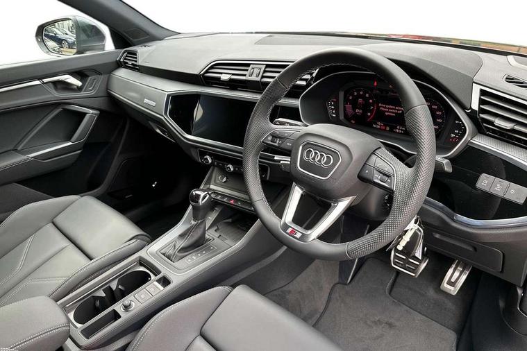 Amazon alexa Integration, Audi connect safety and service, Audi drive select, Audi lane departure warning, Audi Virtual Cockpit - 10.25" display, Bluetooth interface, Camera based traffic sign recognition, Distraction and Fatigue warning, Legal emergency call, MMI Navigation Plus with high resolution 10.1 inch touchscreen colour display, Power operated tailgate, Progressive steering, Service interval indicator, Smartphone interface includes wireless Apple carplay/Android Auto, Start stop system with recuperation, Voice control system with natural language interaction, Sports suspension, 2 USB-C ports with charge and data functions, 6 passive loudspeakers, DAB digital radio module, Acoustic windscreen, Aluminium roof rails, Aluminium window trim, Anthracite black radiator grille, Auto dimming door mirrors, Auto dimming frameless rear view mirror, Body colour front spoiler blade, Electrically folding, adjustable and heated door mirrors with integrated LED side indicators and kerb view function for passenger side, Front and rear electric windows, Front fog lights, Front side air inlets in matt platinum grey, Grille vertical bars in aluminium silver/Matt, High gloss black finish B and C pillars, LED Dynamic rear indicators, LED headlights with LED daytime running lights, LED rear lights, LED third brake light, Privacy glass dark tinted rear and rear-side windows (from B-pillar backwards), Rain and light sensors, Rear diffuser grille in grained matt black, Rear diffuser strip in matt anthracite black, Rear side wing doors, Rear wiper, S line badges on front wings, S Line front and rear bumpers and side skirts, Side skirt insert in matt Platinium grey, Variable front intermittent wipers, 12V socket in rear centre console, 3 seat bench in 2nd row, 3 spoke leather multifunction steering wheel features S badging and grips in perforated leather with contrast stitching, 40:20:40 folding with manual adjustment for 60:40 forwards/backwards position and backrest angle, Adjustable rear seat bench/backrest with centre armrest and cupholder, Black carpet mats, Black cloth headlining, Dual zone electronic climate control, Electric lumbar support, Front and rear black floor mats with contrast stitching in rock grey, Front and rear headrests, Front centre armrest, Height and reach adjustable steering wheel, Horizontal trim strip in matt platinum grey, Illuminated door sill trims with S logo, ISOFIX child seat mounting for front passenger with airbag deactivation and outer rear seat including top tether attachment point for outer rear seats, Luggage compartment sill protection in stainless steel, Manual front seats with height adjustment, Perforated leather gearknob, Single front passenger seat, Stainless steel pedals, Twin leather upholstery with front sport seats + S embossing, Non smoking pack - Q3, 3x3 point rear seatbelts, 6 airbags - Driver, front passenger, curtain and side windows, Audi pre-sense front with pedestrain and cyclist recognition, Electrically operated child locks on rear doors, Electromechanical parking brake, Electronic stabilisation control including ABS, ASR and EDL, Front seatbelt reminder, Hill descent control, Hill hold assist, Pre sense basic, Seatbelt monitoring, Tyre pressure warning, Warning triangle and first aid kit, Anti theft wheel bolts, Immobiliser, Remote central locking, Thatcham approved category 1 anti theft alarm, Aluminium look interior elements, Dark matt brushed aluminium inlay, Detail dashboard around MMI touch colour display in glass look, black with surround in aluminium look, Leatherette door armrest,