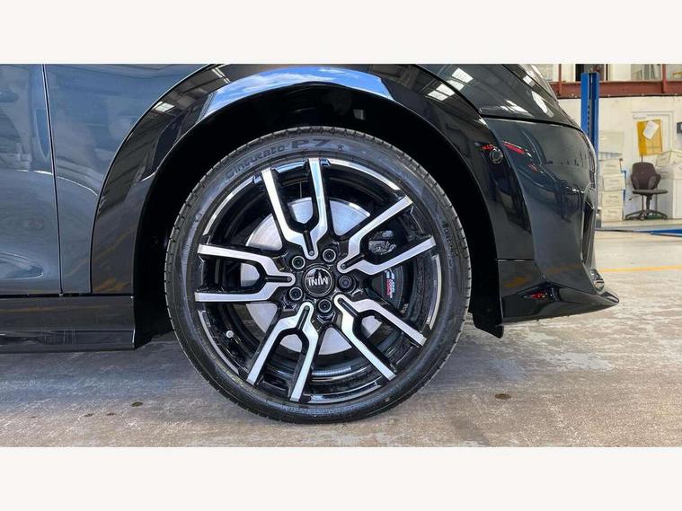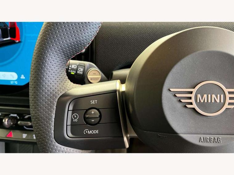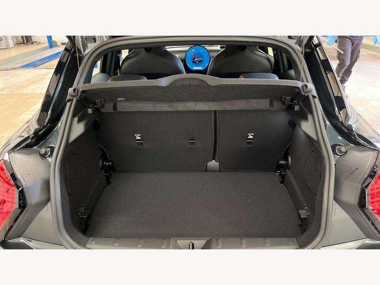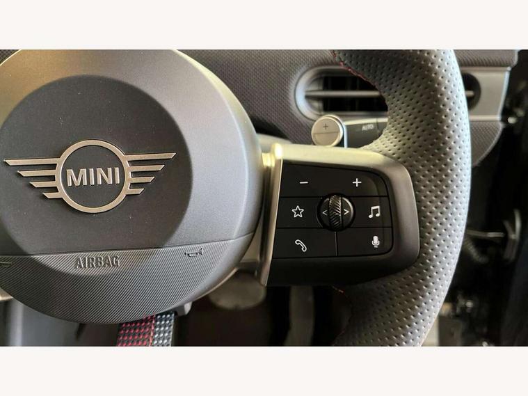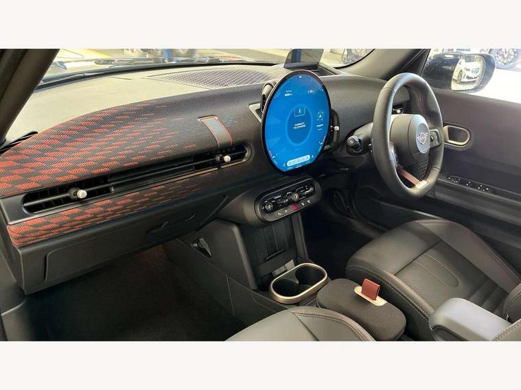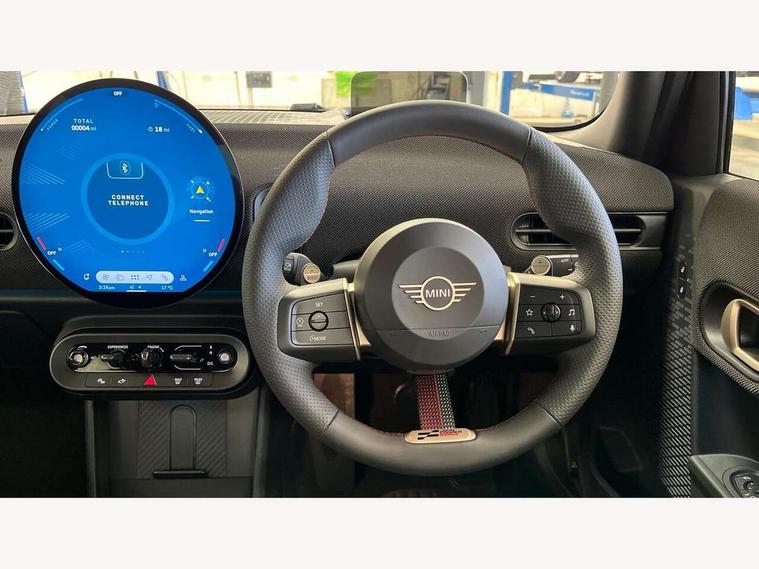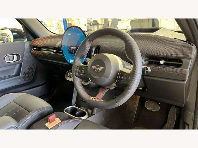 Central toggle bar, Circular OLED Screen, Compatible mobile phone bluetooth with audio streaming, Cruise control, Digital instrument cluster, Electro-mechanical speed dependant steering assistance, Emergency call service, Gaming controller with intelligent personal assistant voice update, MINI Experience Modes, Mini navigation system, On board computer, Service interval indicator, Tailgate, 7 speed sport transmission with double clutch, Adaptive suspension, DAB Digital radio, Personal eSim, Rear USB charger, Auto headlights, Electric adjustable heated door mirrors, Electric front+rear windows, Front and rear apron, Heated rear window, Heated windscreen washer jets, High gloss hexagonal patterned grill surround, Jet black mirror caps, LED 3rd brake light, LED daytime running lights, LED Headlights, LED indicator lights, LED rear lights, Rain sensor window wipers, Rear fog lights, Rear roof spoiler with airblades, Rear side wing doors, Rear window wiper, 2 zone automatic air conditioning, 3 seat bench in 2nd row, 60/40 rear seat bench, Ambient lighting, Black lower band in high gloss, Cupholders, Dark headliner, Floor mats, Front and rear head restraints, Front compact armrest, Heated steering wheel, Height adjustable passenger seat, Lidded storage box in Black/Red knit, Luggage compartment lighting, Partially perforated vescin steering wheel with red accent, black/red decorative strap, Single front passenger seat, Steering wheel paddle shift, Sunvisors with vanity mirrors, Vescin/Cord combination JCW upholstery includes dash knit in black with red accents, Driving assistant pack - Cooper Hatchback, Park assistant pack - Cooper Hatchback, 3 point seatbelts on all five seats, 6 Airbags - front, side, head and seat belt tensioners, Anti-lock braking system (ABS), Brake caliper in Black with JCW badge, Child locks on rear doors, DSC - Dynamic Stability Control, Electronic parking brake, Front and rear disc brakes, Front ISOFIX (iSize), Front passenger airbag deactivation, JCW Sport Brakes, Traction control, Tyre pressure monitoring system, Alarm, Immobiliser, Remote central locking, Black/Red decorative dash strap, Tyre repair kit,
