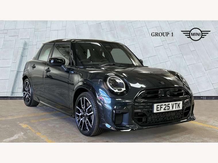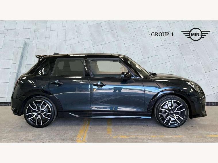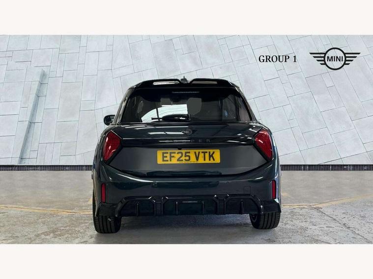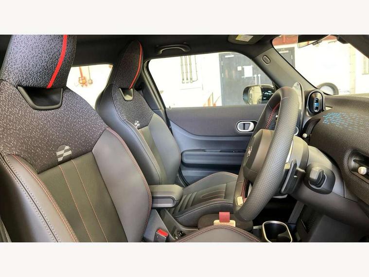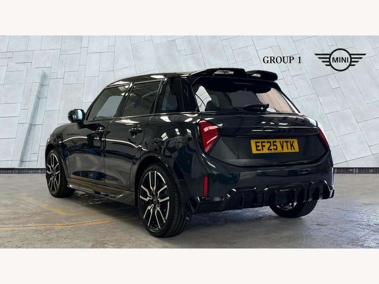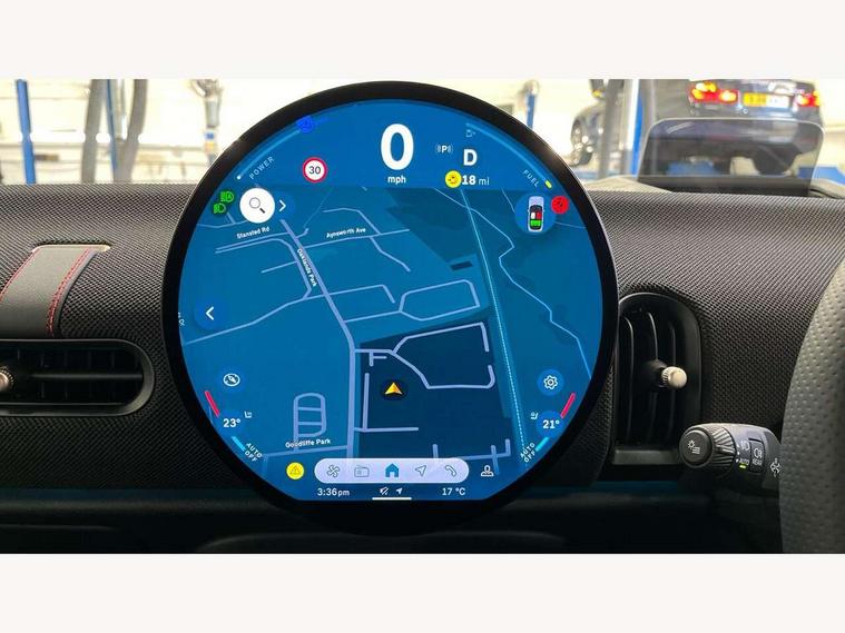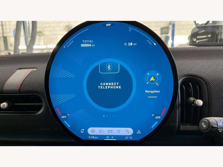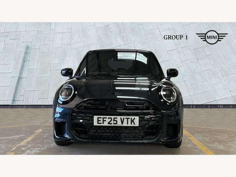 Central toggle bar, Circular OLED Screen, Compatible mobile phone bluetooth with audio streaming, Cruise control, Digital instrument cluster, Electro-mechanical speed dependant steering assistance, Emergency call service, Gaming controller with intelligent personal assistant voice update, MINI Experience Modes, Mini navigation system, On board computer, Service interval indicator, Tailgate, 7 speed sport transmission with double clutch, Adaptive suspension, DAB Digital radio, Personal eSim, Rear USB charger, Auto headlights, Electric adjustable heated door mirrors, Electric front+rear windows, Front and rear apron, Heated rear window, Heated windscreen washer jets, High gloss hexagonal patterned grill surround, Jet black mirror caps, LED 3rd brake light, LED daytime running lights, LED Headlights, LED indicator lights, LED rear lights, Rain sensor window wipers, Rear fog lights, Rear roof spoiler with airblades, Rear side wing doors, Rear window wiper, 2 zone automatic air conditioning, 3 seat bench in 2nd row, 60/40 rear seat bench, Ambient lighting, Black lower band in high gloss, Cupholders, Dark headliner, Floor mats, Front and rear head restraints, Front compact armrest, Heated steering wheel, Height adjustable passenger seat, Lidded storage box in Black/Red knit, Luggage compartment lighting, Partially perforated vescin steering wheel with red accent, black/red decorative strap, Single front passenger seat, Steering wheel paddle shift, Sunvisors with vanity mirrors, Vescin/Cord combination JCW upholstery includes dash knit in black with red accents, Driving assistant pack - Cooper Hatchback, Park assistant pack - Cooper Hatchback, 3 point seatbelts on all five seats, 6 Airbags - front, side, head and seat belt tensioners, Anti-lock braking system (ABS), Brake caliper in Black with JCW badge, Child locks on rear doors, DSC - Dynamic Stability Control, Electronic parking brake, Front and rear disc brakes, Front ISOFIX (iSize), Front passenger airbag deactivation, JCW Sport Brakes, Traction control, Tyre pressure monitoring system, Alarm, Immobiliser, Remote central locking, Black/Red decorative dash strap, Tyre repair kit,