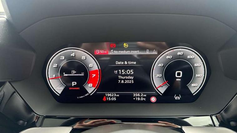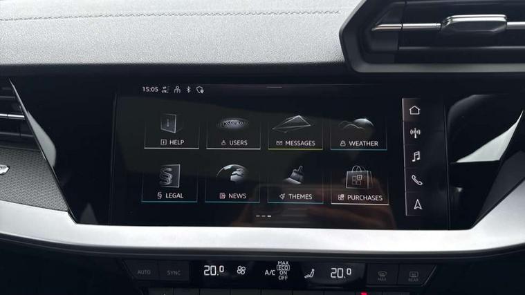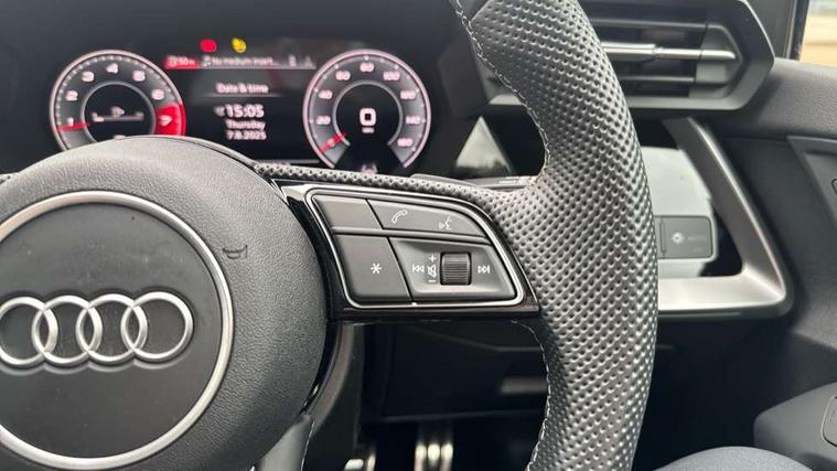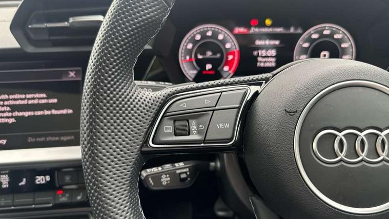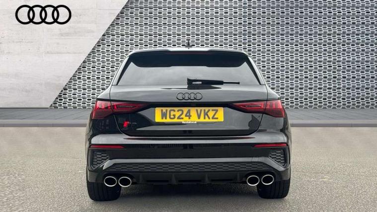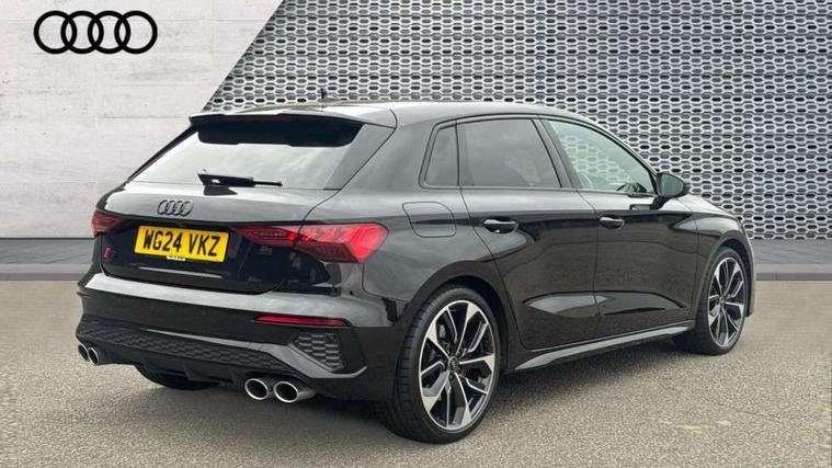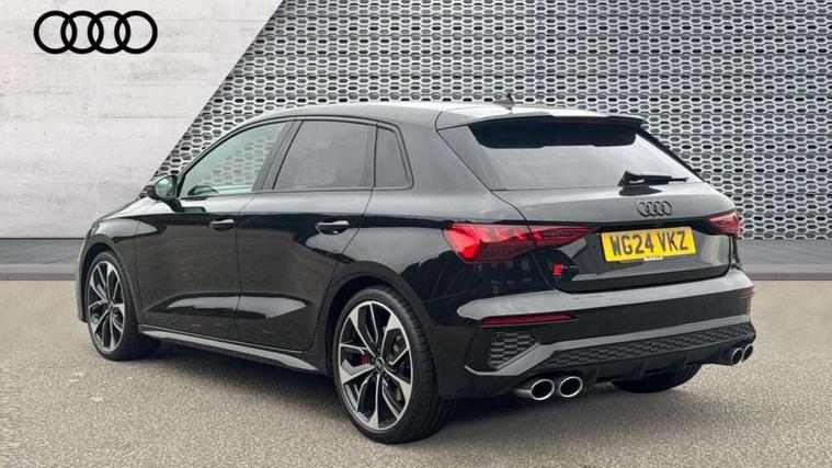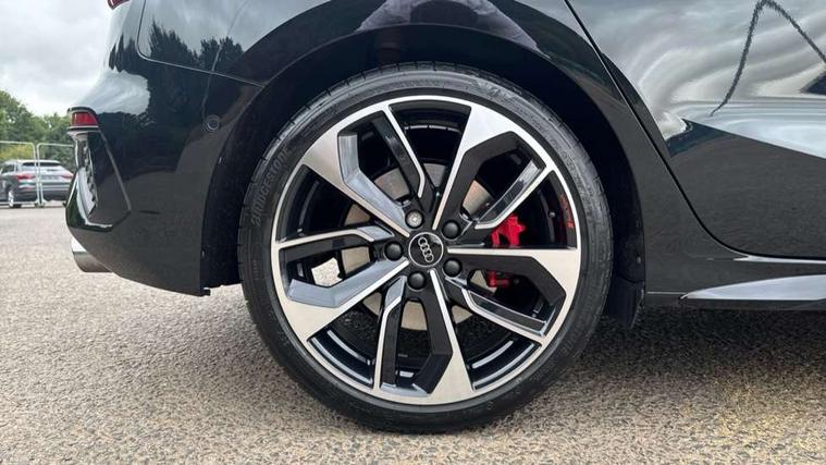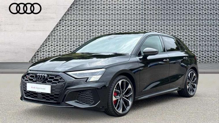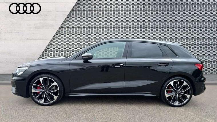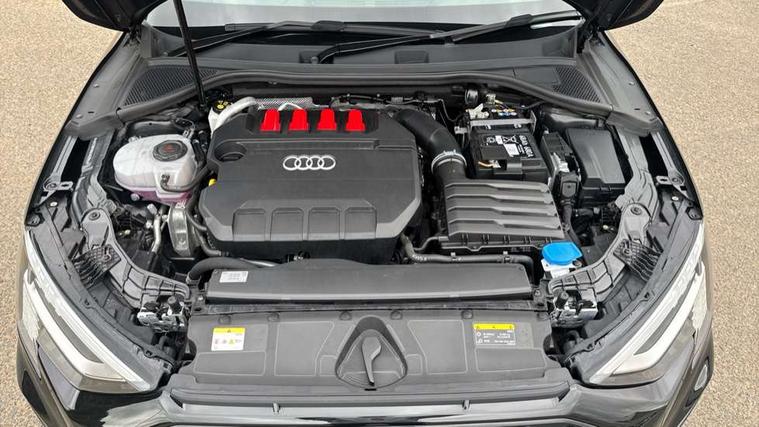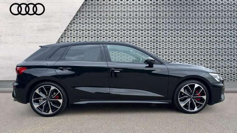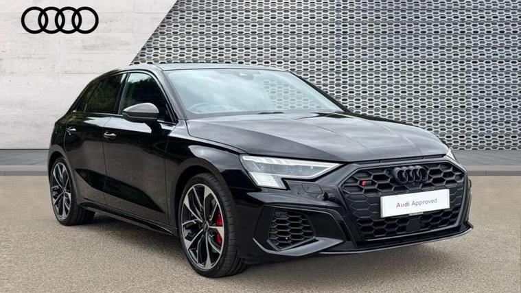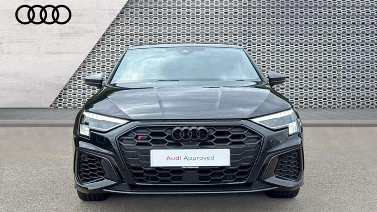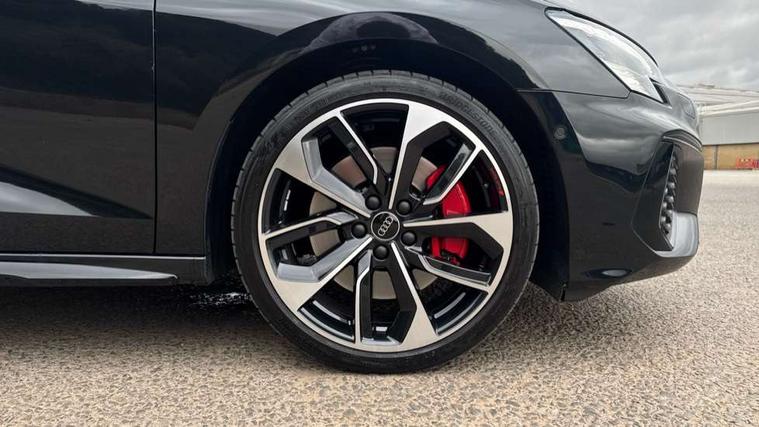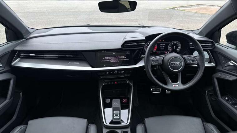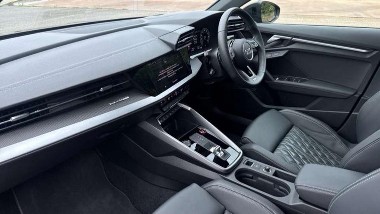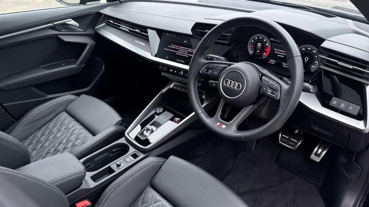 Adaptive cruise assist, Audi drive select (Auto, Comfort, Dynamic, Efficiency and Individual), Audi smartphone interface, Audi virtual cockpit plus - 12.3" full HD resolution dynamic digital instrument cluster, Automatic start/stop system with recuperation, Bluetooth interface, Collision avoidance assistant, e-Call (emergency call), Head up Display, Lane change assistant with exit warning system and rear cross traffic alert, Lane departure warning system, MMI Navigation Plus with high resolution 10.1" colour touch screen display, Power operated tailgate - Luggage compartment lid opens/closes electrically, Progressive steering, Service indicator, Trip computer, Voice control system with natural language interaction, Quattro permanent all wheel drive, S suspension with damper control, 2xUSB-C connection with data and charging functions, DAB Digital radio, 3rd brake light, Acoustic glass windscreen, Audi Beam uses LEDs to project Vorsprung onto the ground as you exit your S3, Auto dimming frameless rear view mirror, Carbon door mirror housings, Dual branch oval twin tailpipes in chrome plated finish, Electrically adj heated/folding + automatically dimming exterior mirrors with memory + automatic kerb side function for passenger side exterior mirror, Front electric windows, Headlight washers, Heat insulating glass windscreen, Illuminated door sills with aluminium inserts at the front with S logo, Integrated LED indicators in door mirrors, LED daytime running lights, Light and rain sensors, Privacy glass - dark tinted rear window, rear door and side windows, Rear electric windows, Rear side air outlets in grained matt black, Rear side wing doors, Rear wiper, 12V socket and storage compartment in front centre console, 3 seat bench in 2nd row, 3 spoke leather multifunction steering wheel with gear shift paddles, 4 way electrically adjustable lumbar support for driver and front passenger, 60/40 split folding rear seat bench, Black cloth headlining, Dual zone electronic climate control, Fine Nappa leather upholstery with front sports seats S embossed logo, Front and rear centre armrest in artificial leather, Front and rear headrests, Front/rear floor mats, Height and reach adjustable steering wheel, Interior lighting - glove compartment light and right hand side, Luggage compartment floor covering, Seat side bolsters, Single front passenger seat, Stainless steel pedals and front footrest in black, Aluminium interior elements pack - A3 Sportback, Black styling pack - A3 Sportback/S3, Body styling design pack - S3, Extended ambient lighting pack - A3 Sportback, Storage pack - A3 Sportback, Technology pack pro with 360 camera - A3 Sportback/Voursprung, 3x3 point rear seat belts, Driver and front passenger airbag with passenger airbag deactivation, Electronic Stabilisation Control (ESC) including ABS, ASR and EDL, First aid kit with warning triangle and 2 safety vests, Front side airbags with head airbags and interaction airbag, Pre-sense front with pedestrian and cyclist detection, Seatbelt monitoring, Tyre pressure loss indicator, Anti theft alarm, Anti-theft wheel bolts, Electronically operated child locks, Immobiliser, Remote control central locking, Carbon inlays, accent surfaces in the dashboard and centre console in platinum grey silk effect paint finish,