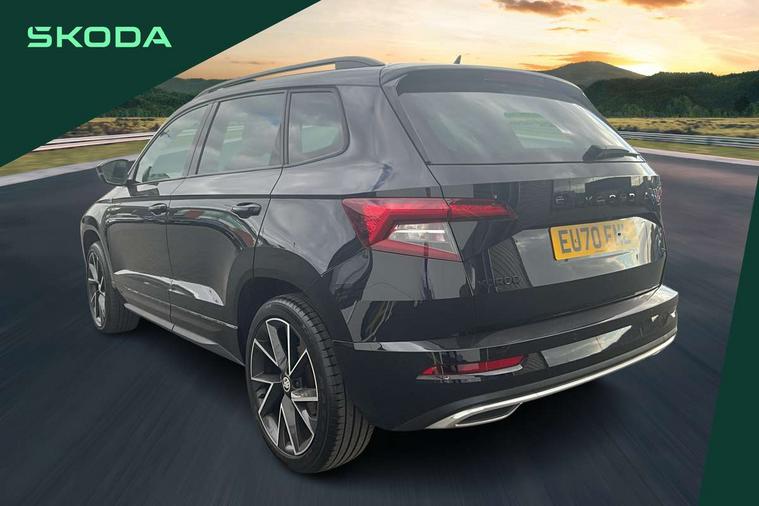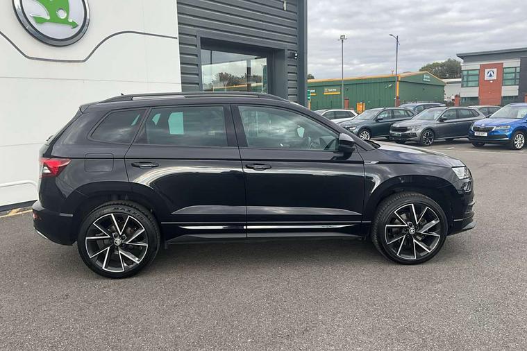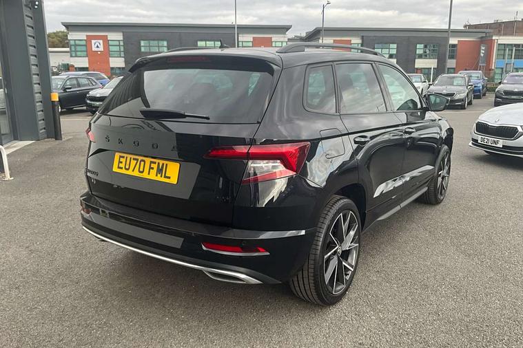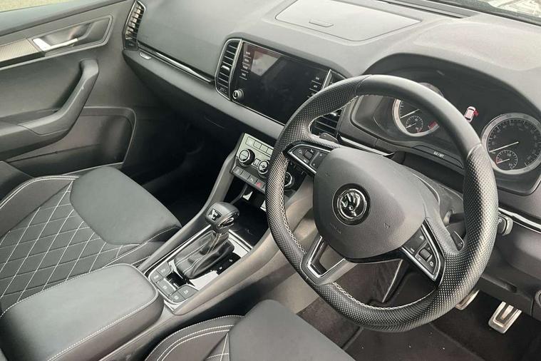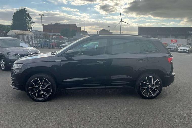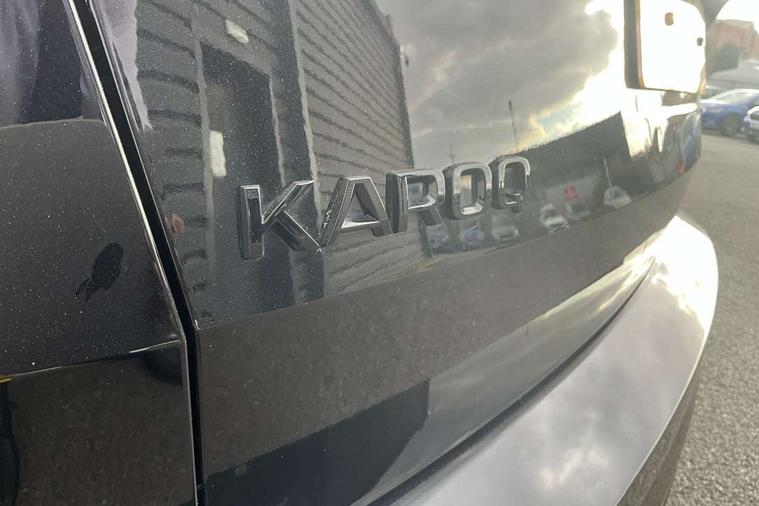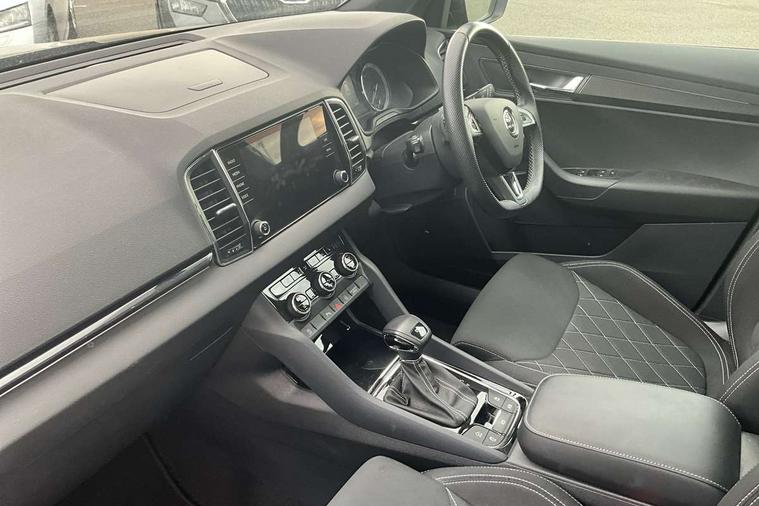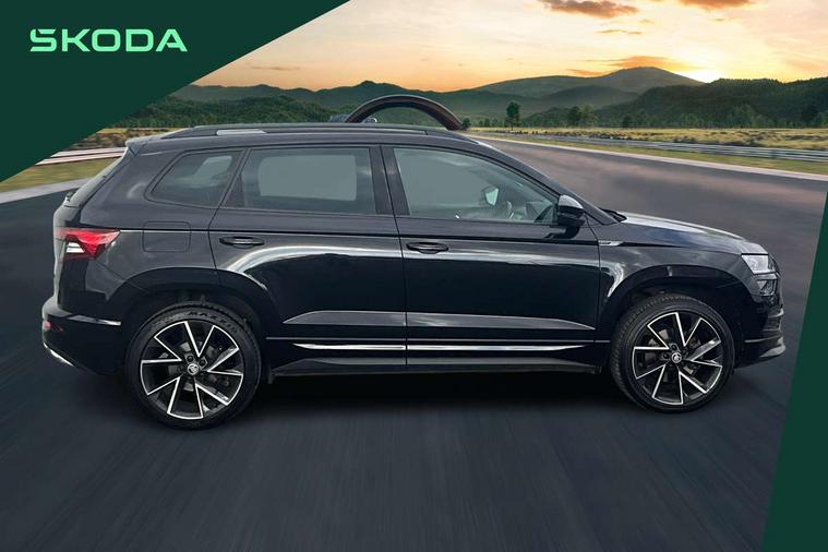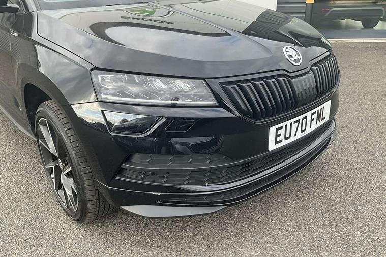 Care connect, Drive mode selection with off road, Driver alert system, Driver fatigue sensor, Driver profile selection, Multifunction colour trip computer, Outside temperature gauge, Rear view camera, Service interval indicator, SmartLink + wireless for Apple and wired for Android, Start/stop system with regenerative braking, USB C Port x 2 in front centre console, DAB radio with Bluetooth, SD card slot, USB connection, Wireless charging without wireless aerial connection, Acoustic glass, Aero front windscreen wipers with intermittent function, Automatic headlight control system, Black electric window control buttons, Black roof rails and door mirrors with radiator grille, Body colour door handles, Electric front and rear windows with child proof lock, Front door steps with SportLine logo, Full LED headlights + adaptive front light system + LED daytime running lights and front cornering fog lights, Headlight washers, Heated rear windscreen, LED rear lights with high functionality, Light assistant (coming/leaving home/tunnel light), Panoramic sliding sunroof, Privacy glass, Protective door side sills in body colour, Rear diffuser, Safety reflectors on front doors, Skoda lettering on tailgate in black, Sportline badge on front fender, Sportline decorative inserts with badging, Sports front and rear bumpers, Third brake light, 1.5 litre bottle holders in driver and front passenger door panels, 12V socket in boot, 12v socket in front centre armrest with storage compartment and rear air vents, 2 Folding hooks and nets in boot, 2 Front readings lights for driver and passenger, 3 rear height adjustable headrests, 3 spoke leather sports heated multifunction steering wheel with hands off detection and silver stitching with gear shift paddles, 4 foldable roof handles with rear coat hooks, 4 lashing points on luggage floor, Aluminium pedals, Backrest release, Black roof headlining, Cargo elements in boot, Chrome inner door handles, Door sill scuff plates, Driver and passenger seats height adjust, Front head restraints, Front seat and rear pockets, Height adjustable front three point seats belts with tensioners, Height/reach adjust steering wheel, Ice scraper, Illuminated and cooled glovebox, Illuminated luggage compartment, Isofix child seat preparation outer rear, Manual lumbar support for front seats, Net programme in boot, Pen holder, Pollen filter, Rear boot cover, Rear reading lights, Rear seats fixed folding and divided 60:40, Retractable parcel shelf attachable to tailgate, Safety vest holder, Storage box in upper central dashboard closed, Storage compartment below the passenger seat, Sunvisors with illuminated vanity mirrors, Textile floor mats, Umbrella under passenger seat, LED Interior lighting pack with Skoda welcome logo - Karoq, Airbags - Front side, head, knee and curtain, Automatic door unlocking in case of crash, Automatic fuel cut off in case of crash, Driver airbag, Electronic parking brake with auto hold function, Emergency rear braking signal, ESC including ABS, MSR, ASR, EDS, HBA, DSR, RBS, MKB and traction control, Front assist radar scanning of the space in front of the car with automatic braking, Hill hold control, Passenger airbag with switch-off function, Pedestrian monitor, Seatbelt reminder signalisation and pretensioner for all seats, Three point seatbelts rear, Two tone horn, Tyre pressure display, Tyre pressure monitor, Alarm with interior monitoring, back up horn and tilt sensor with safe function, Electronic engine immobiliser, Keyless entry and keyless start with safe system, Remote central locking with 2 remote folding keys, Black air vent surround, 19" Vega anthracite alloy wheels, Anti-theft wheel bolts protection, Storage on wheel cover,
